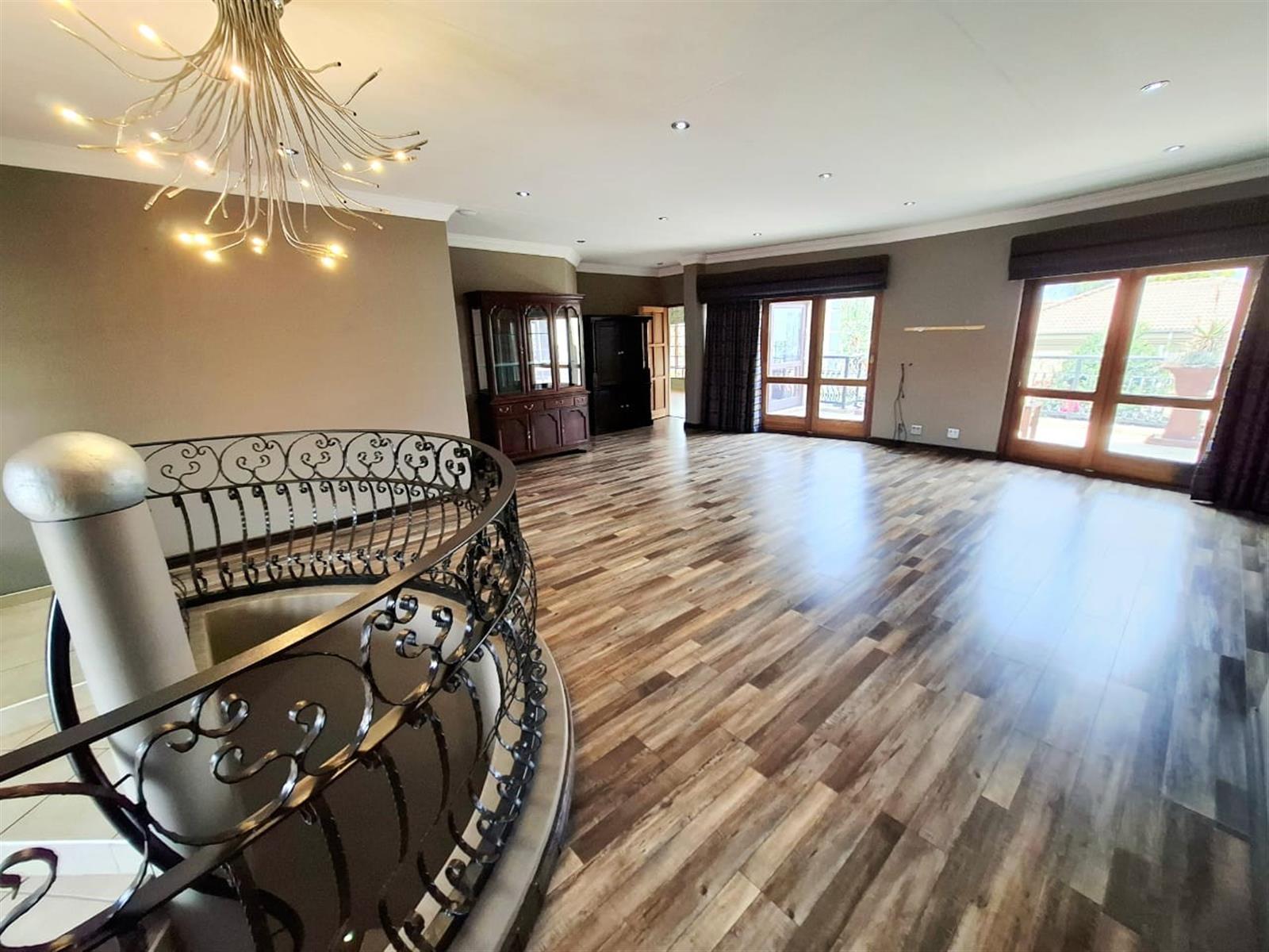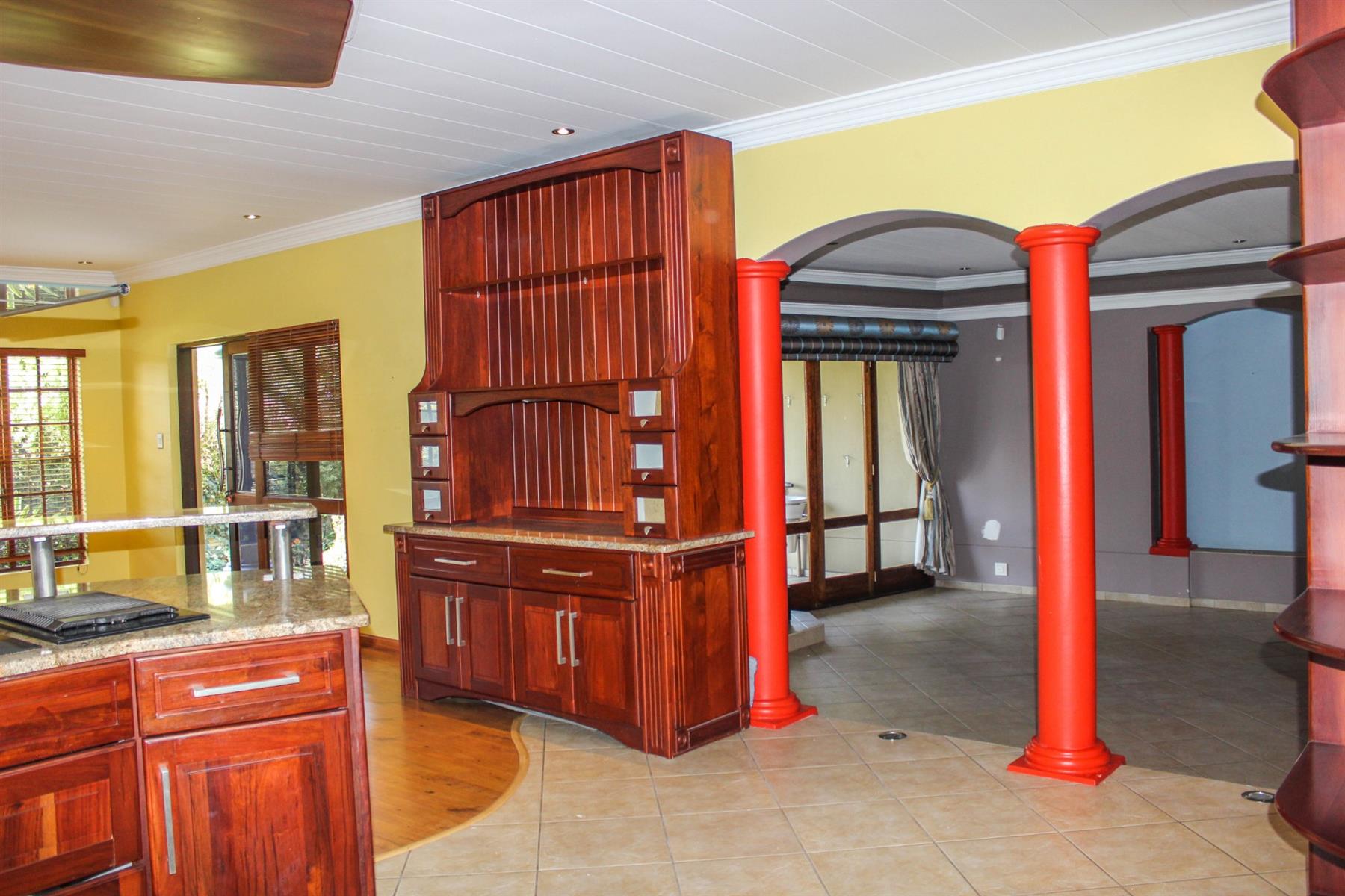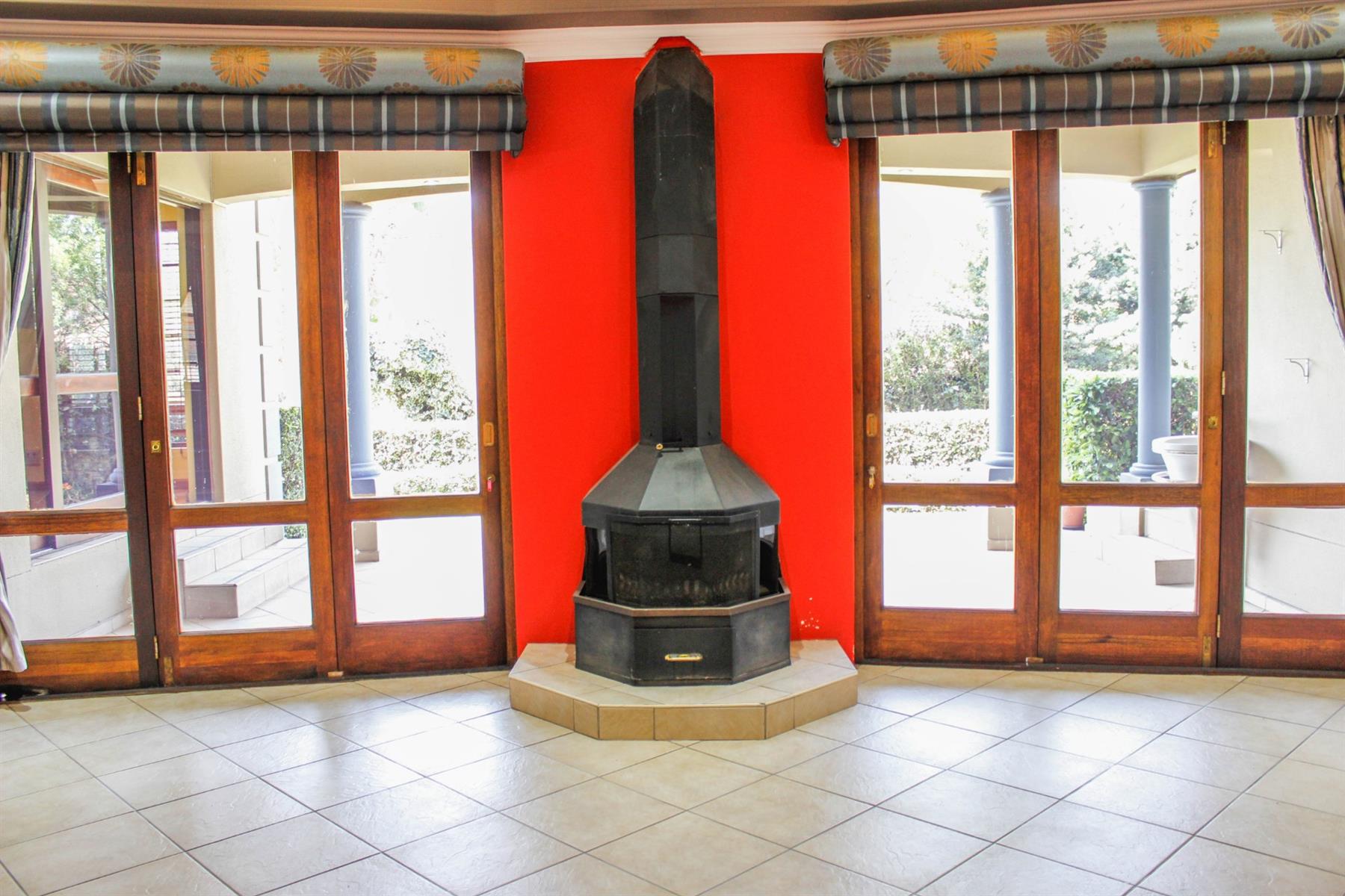Upon entering the spacious entrance hall, you’re immediately welcomed by an air of grandeur and warmth. From here, step down into the sunken lounge, where a cozy fireplace creates a focal point for intimate family evenings or entertaining guests. Large stacking doors open seamlessly onto a covered patio complete with a built-in braai, overlooking the manicured garden — the ideal space for alfresco dining, celebrations, or peaceful relaxation.