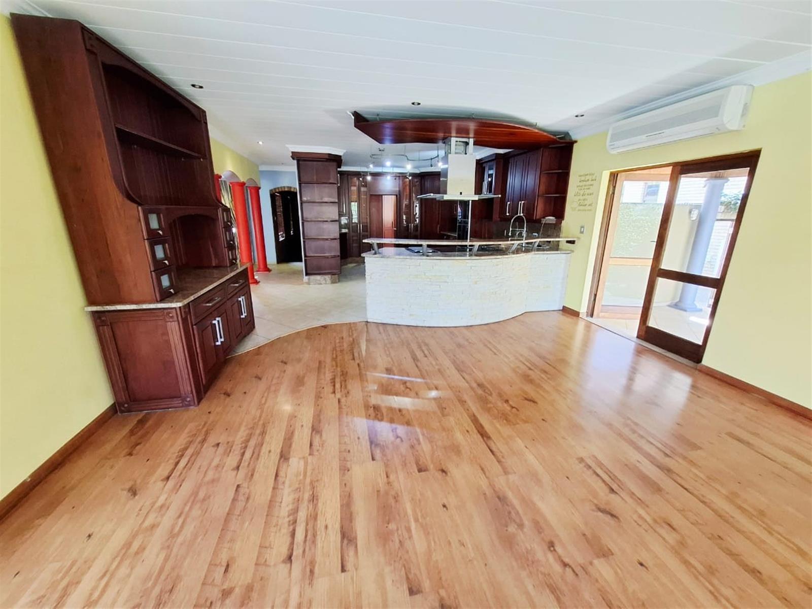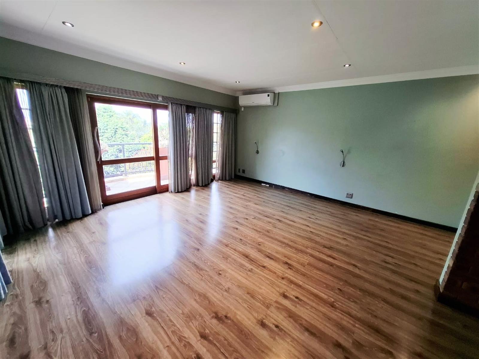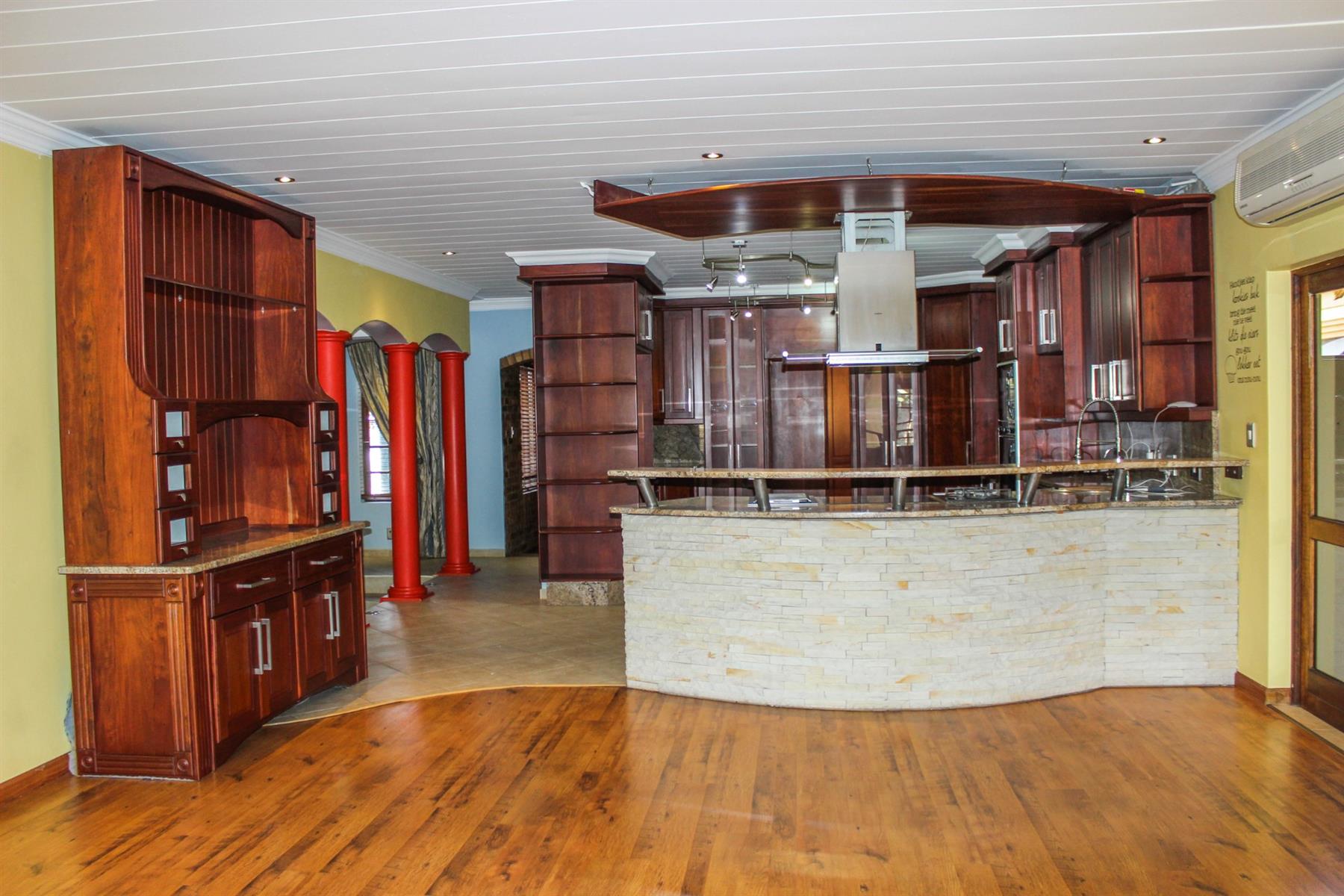 Upon entering the spacious entrance hall, you’re immediately welcomed by an air of grandeur and warmth. From here, step down into the sunken lounge, where a cozy fireplace creates a focal point for intimate family evenings or entertaining guests. Large stacking doors open seamlessly onto a covered patio complete with a built-in braai, overlooking the manicured garden — the ideal space for alfresco dining, celebrations, or peaceful relaxation.