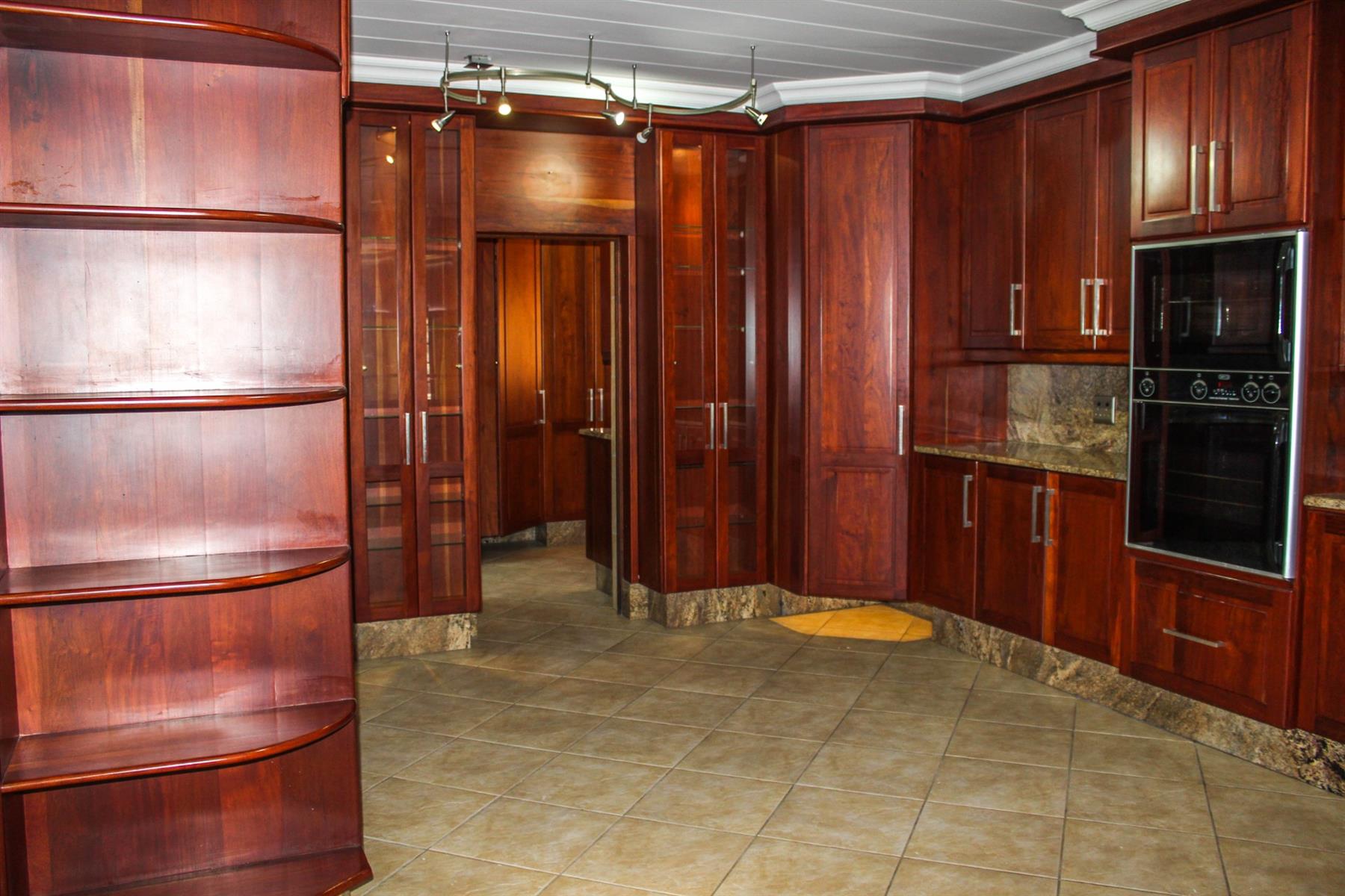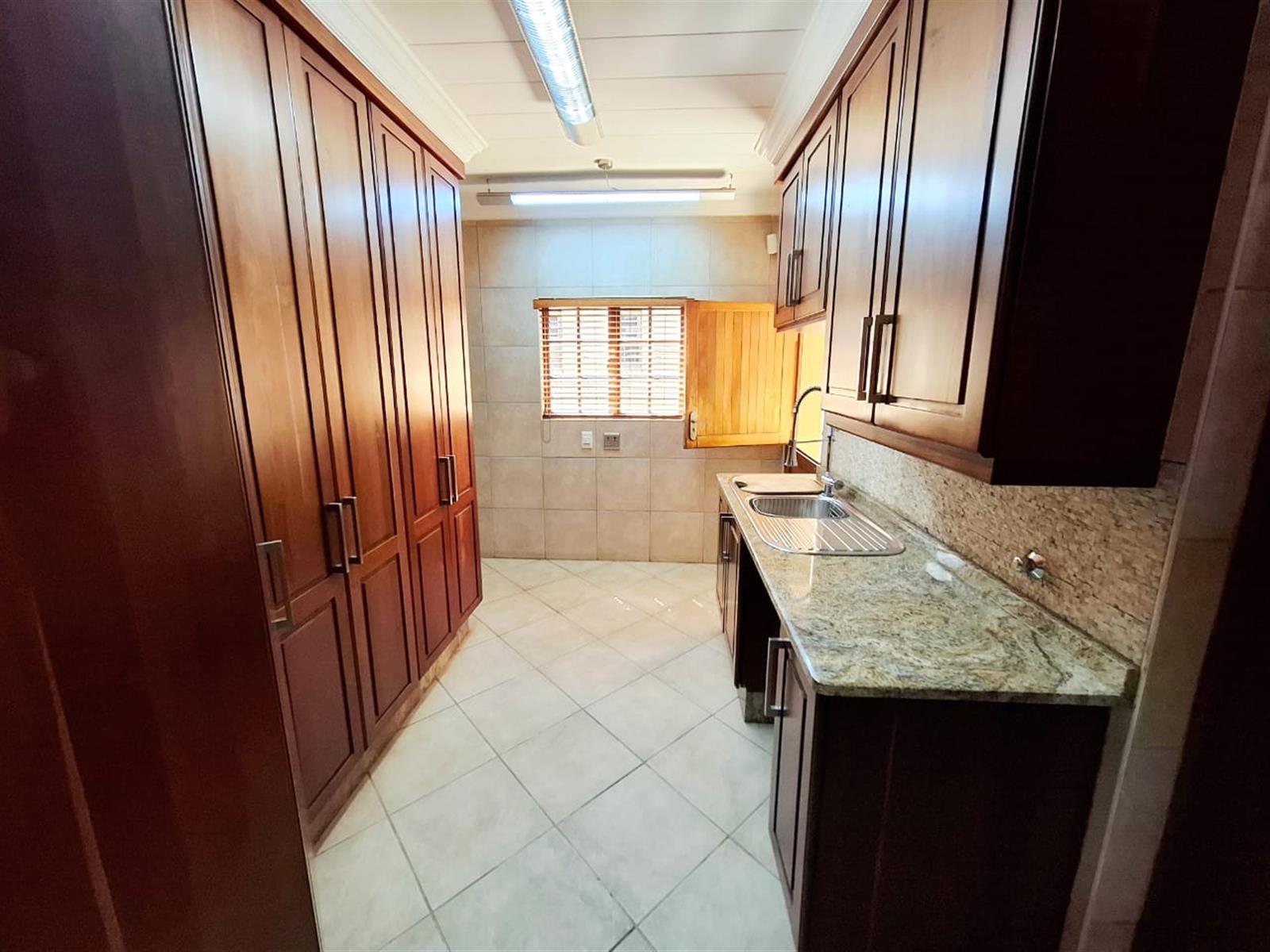 At the heart of the residence lies a gourmet kitchen, beautifully appointed with marble countertops, a glass-top hob, gas grill and hob, and a double eye-level oven. The kitchen’s spacious layout and premium finishes create an inviting environment for culinary creativity. A breakfast nook offers a cozy space for casual dining, while the adjacent separate scullery, walk-in pantry, and dedicated laundry room provide superior convenience and organization. Every detail has been carefully curated to combine style with efficiency.