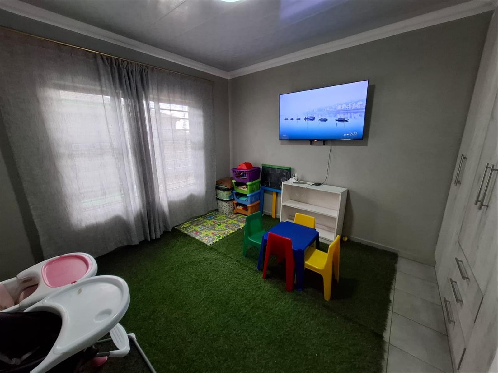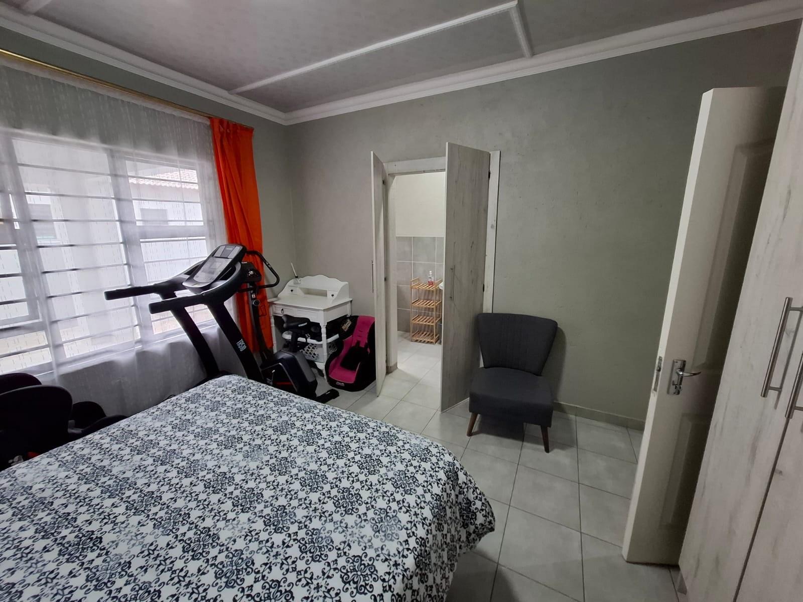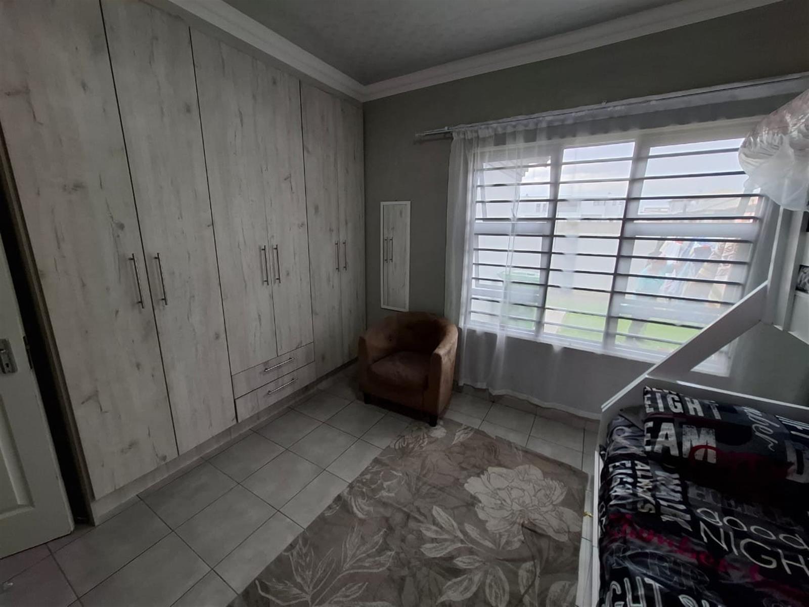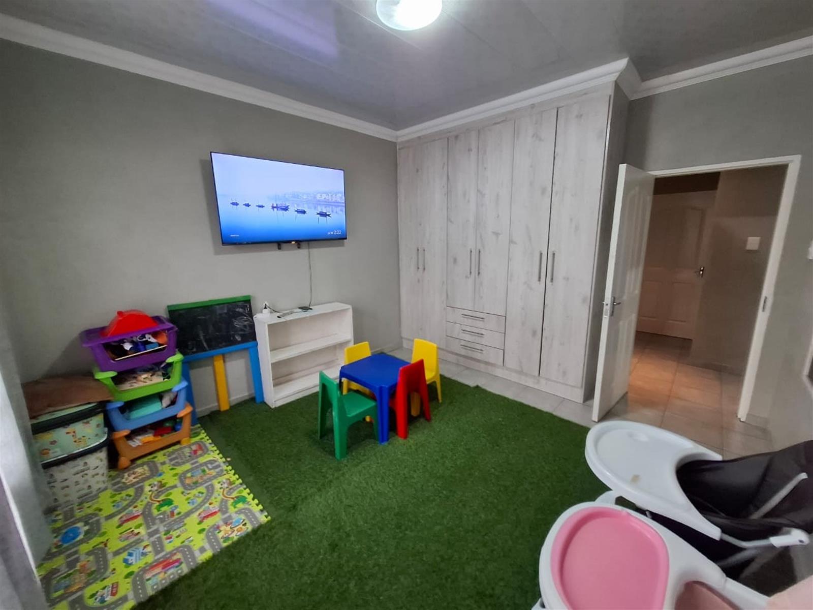 The home’s exterior boasts all-aluminium windows and a stylish aluminium front door, ensuring durability and a modern finish. Burglar bars add an extra layer of security, while a small leafy garden and a sandpit at the back make this space ideal for children to play or for quiet relaxation under the trees.