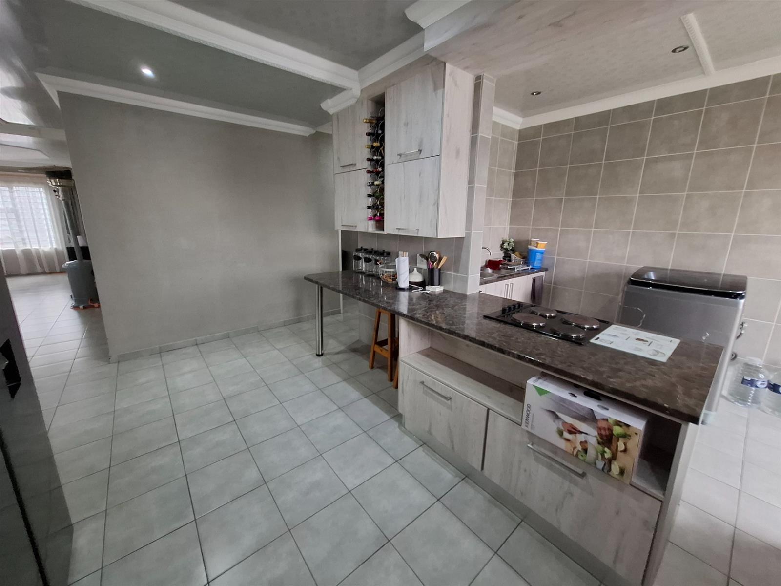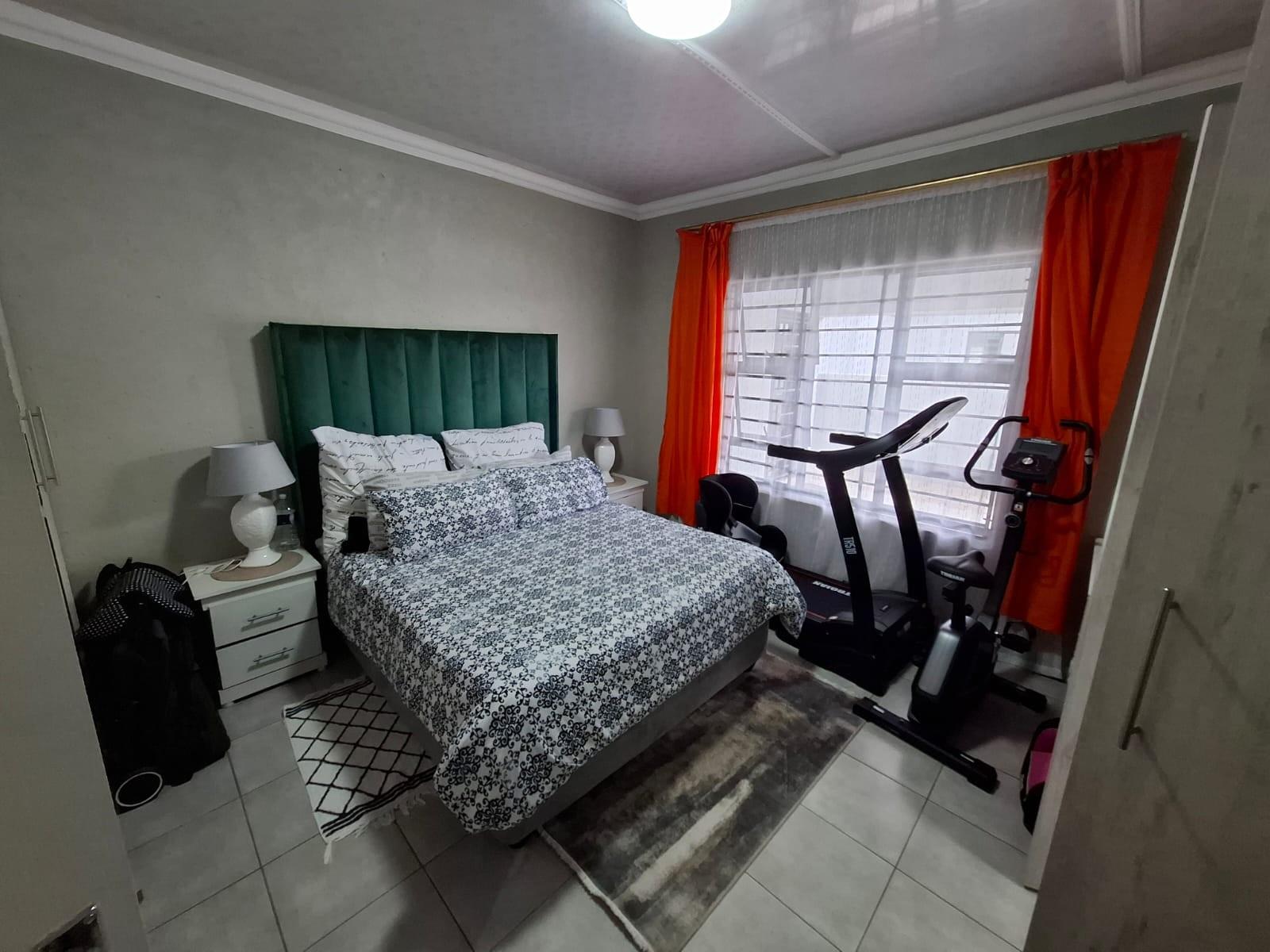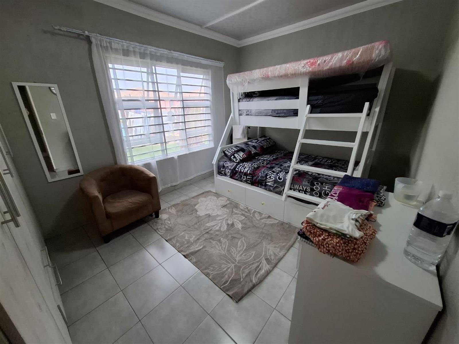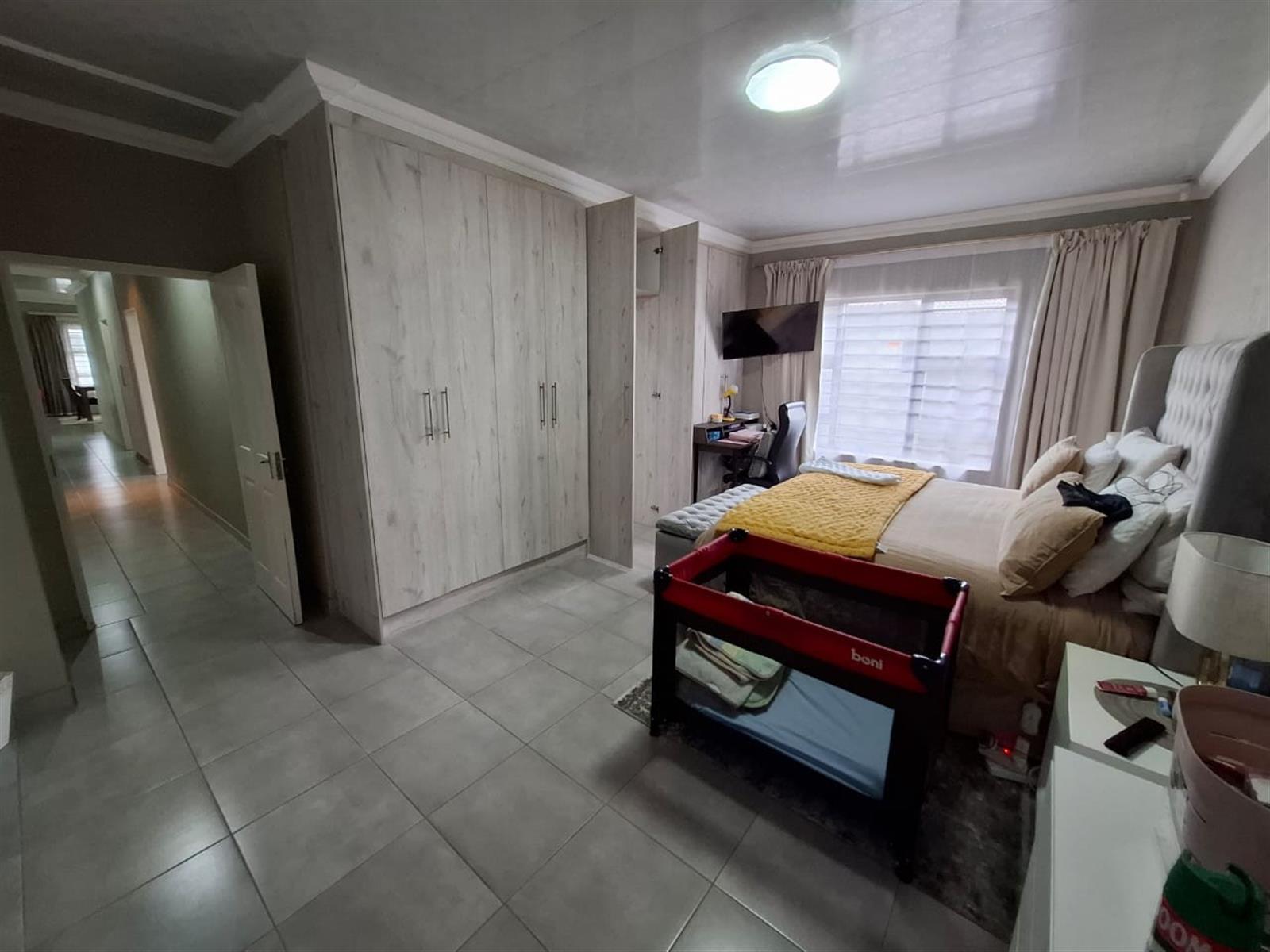 The home’s exterior boasts all-aluminium windows and a stylish aluminium front door, ensuring durability and a modern finish. Burglar bars add an extra layer of security, while a small leafy garden and a sandpit at the back make this space ideal for children to play or for quiet relaxation under the trees.