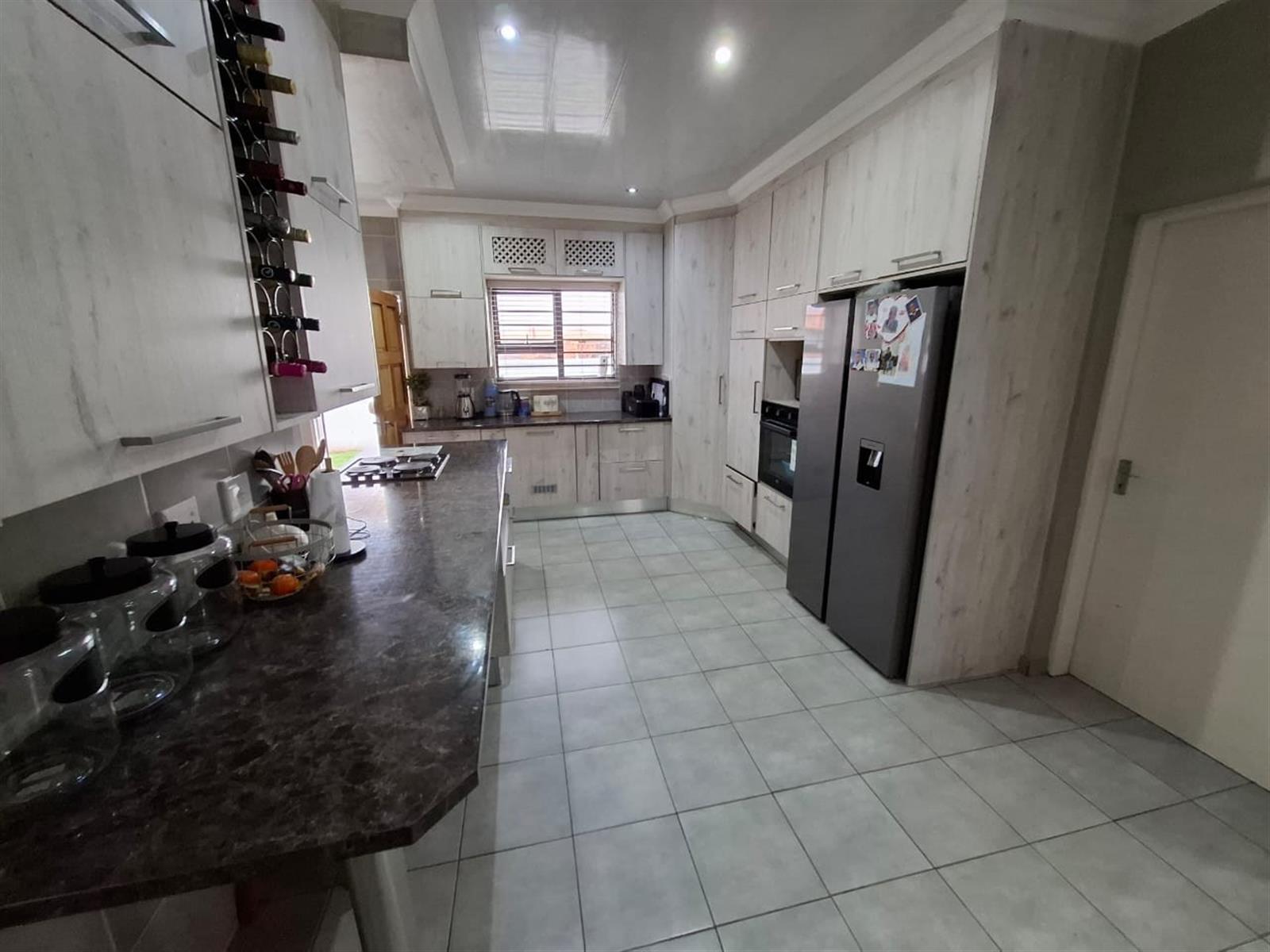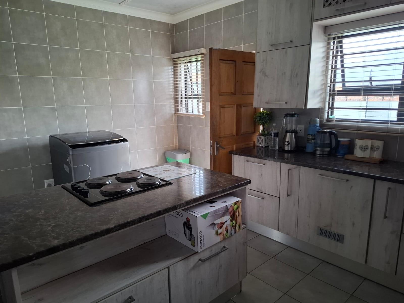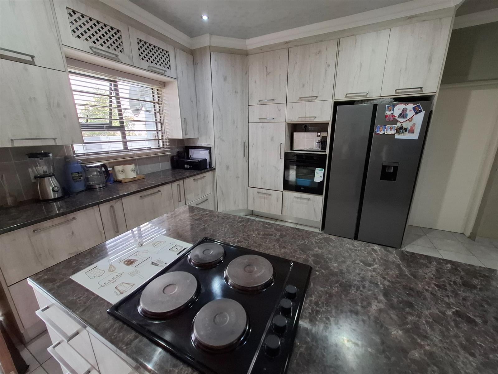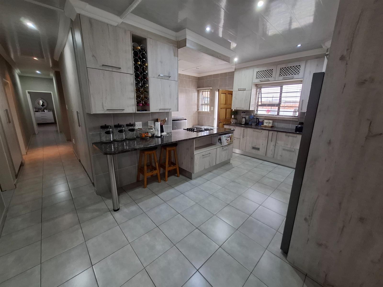 The modern kitchen is both beautiful and functional, featuring polyform countertops with a marble-look finish, light wooden cupboards, a four-plate hob, and an eye-level oven. The breakfast nook creates the perfect spot for casual meals or morning coffee. A separate scullery and laundry area with a double basin and outside door keeps the main kitchen space clutter-free.