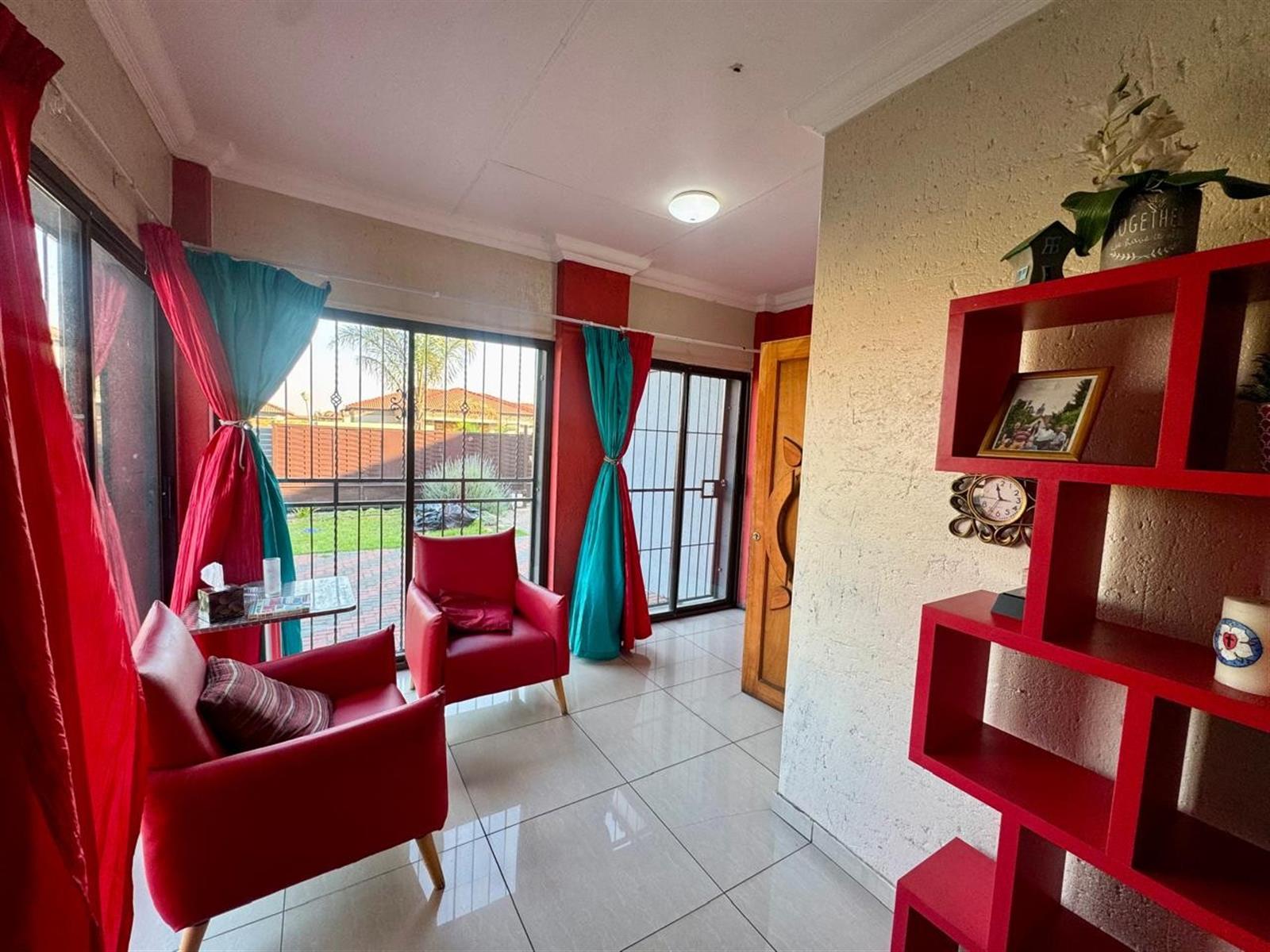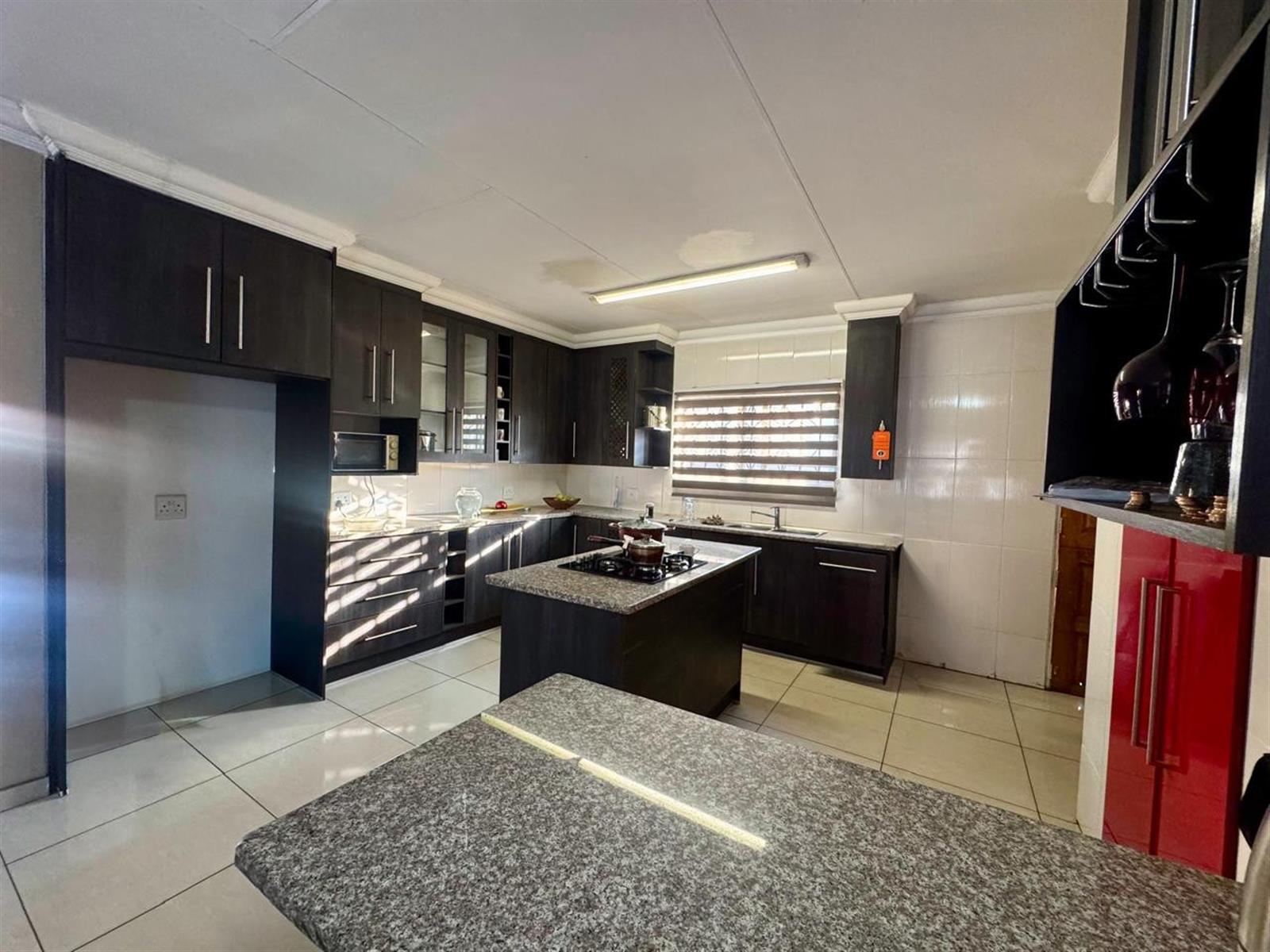 The home welcomes you through an open entrance area that flows into a cosy braai room with a built-in braai — ideal for family gatherings and entertaining guests. From here, a sliding door opens into a spacious open-plan living and dining area, seamlessly connected to a modern kitchen fitted with a gas hob, ample cupboard space, a well-sized pantry, and space for laundry appliances.