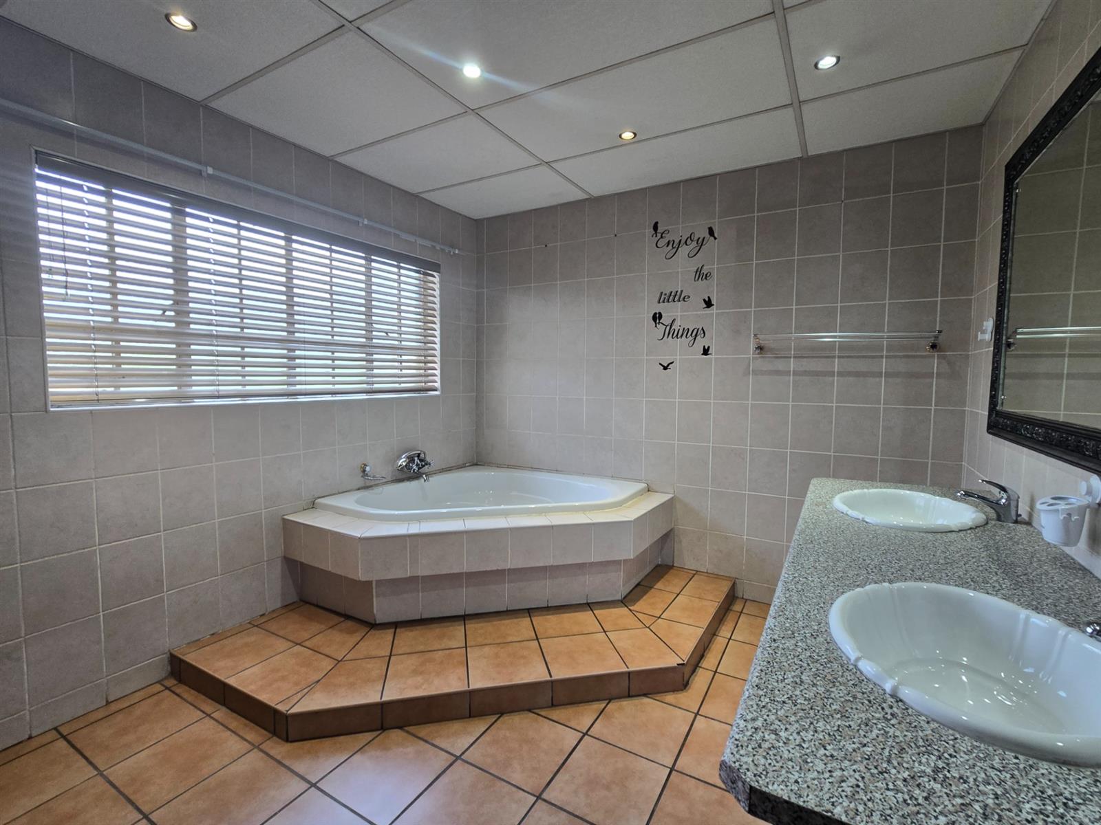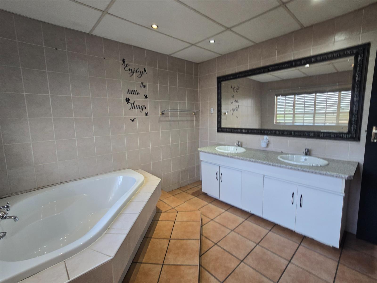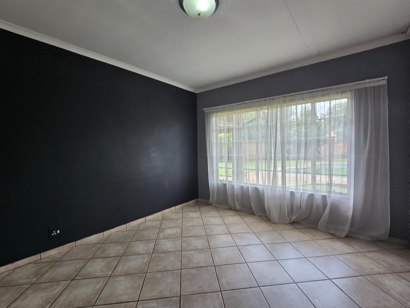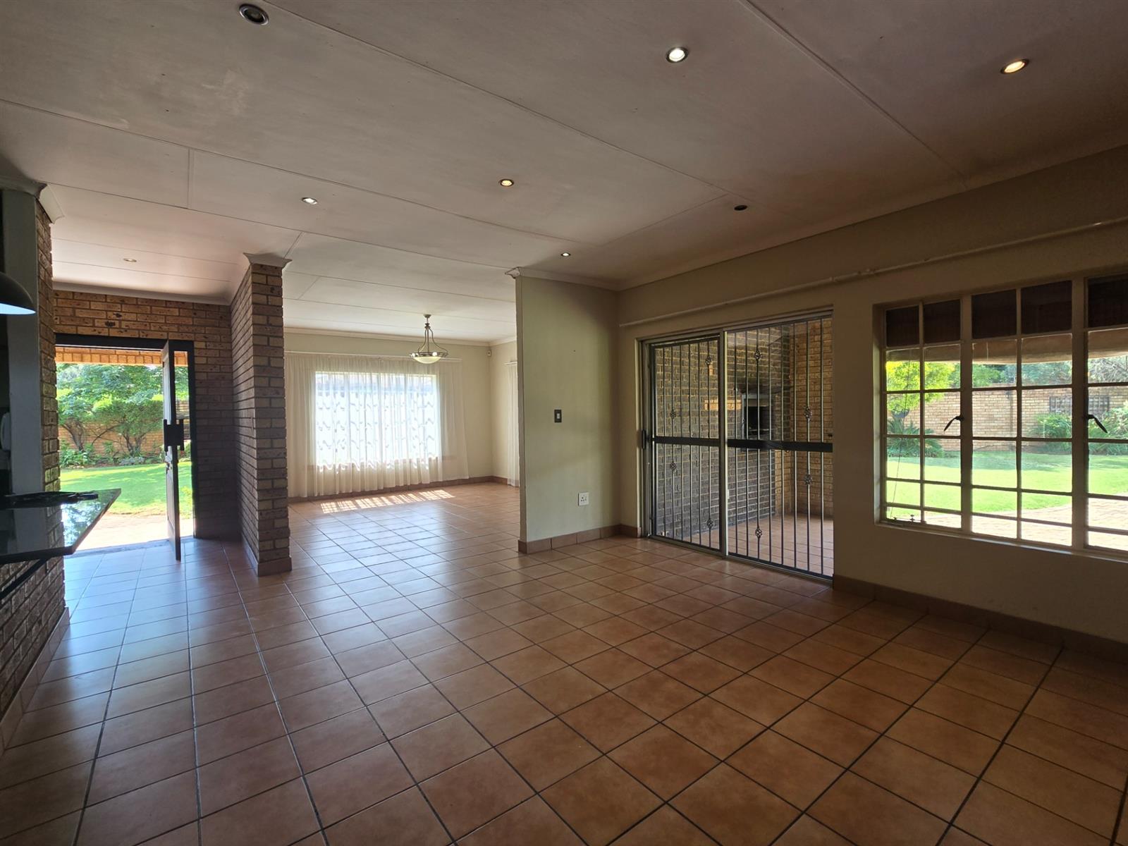 The dining room flows seamlessly from the living space and opens onto a covered patio — the ideal spot to enjoy your morning coffee, share family meals, or host weekend braais. From here, take in views of the sparkling swimming pool, which is solar heated for year-round enjoyment, and the beautifully landscaped garden that surrounds it.