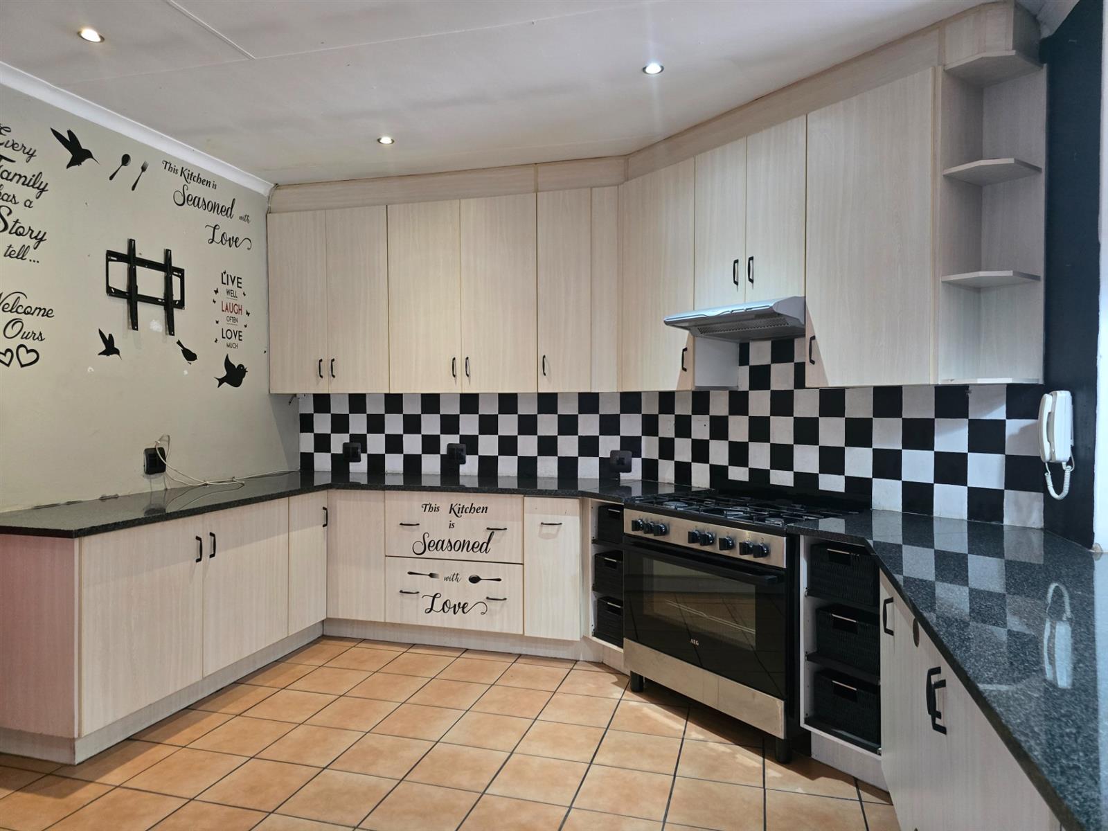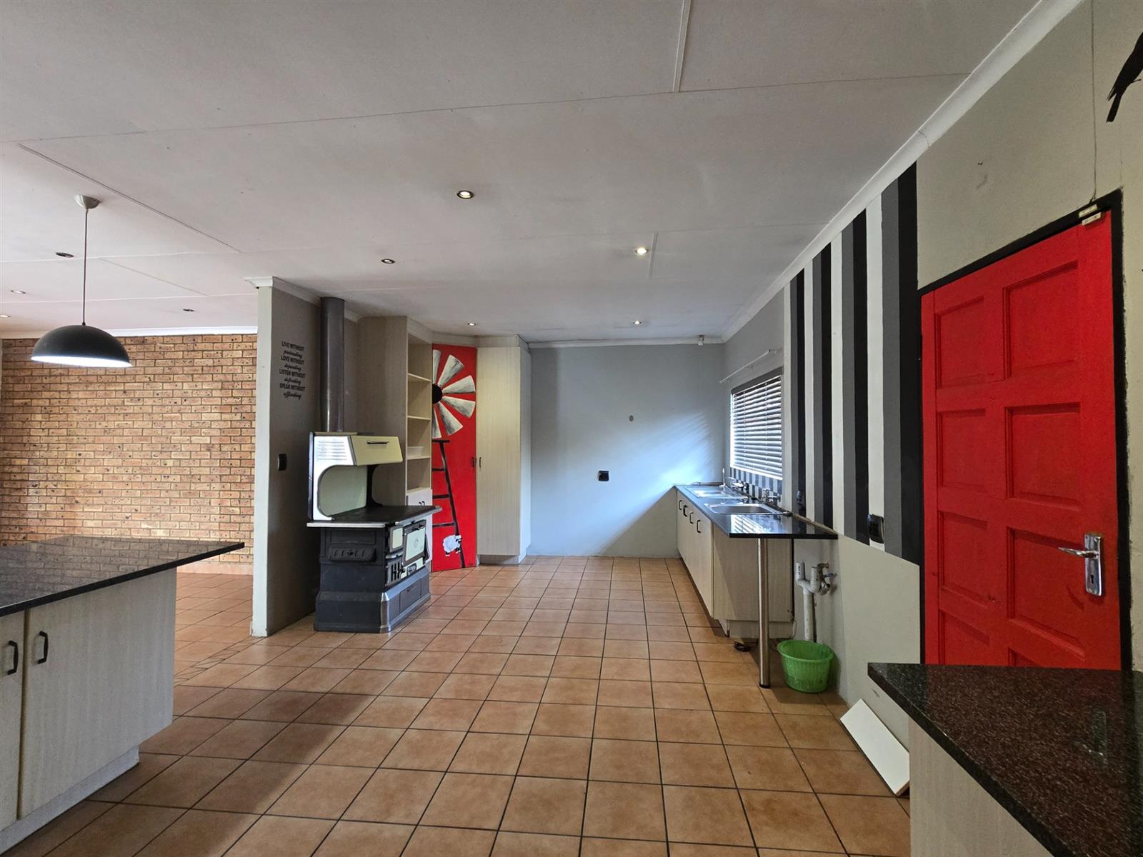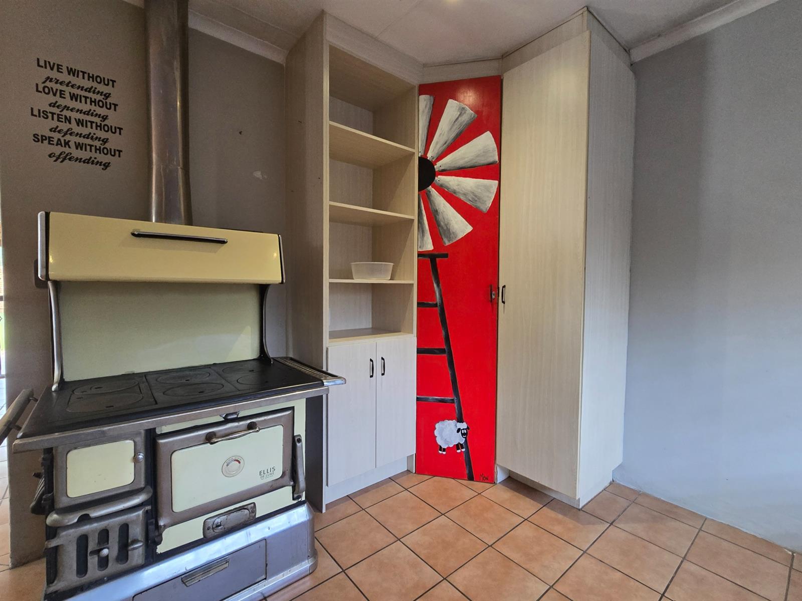 The kitchen is both stylish and functional, offering ample cupboard space, granite countertops, and a gas hob with electric oven for effortless cooking. A traditional coal stove adds a touch of nostalgic charm, while a double basin and door leading outdoors make it as practical as it is inviting.