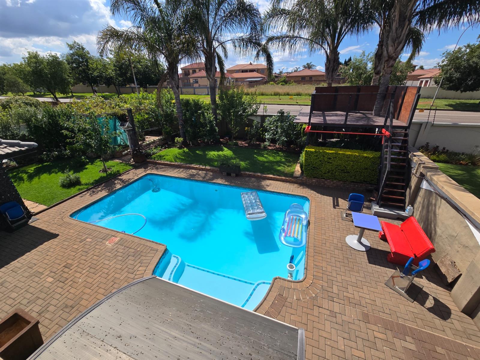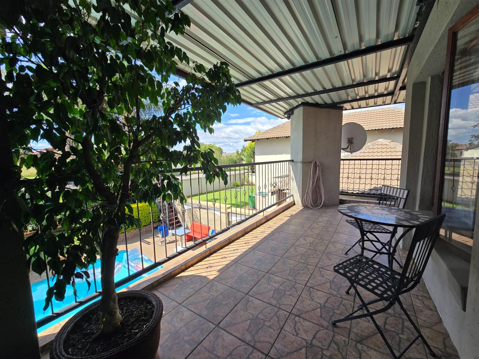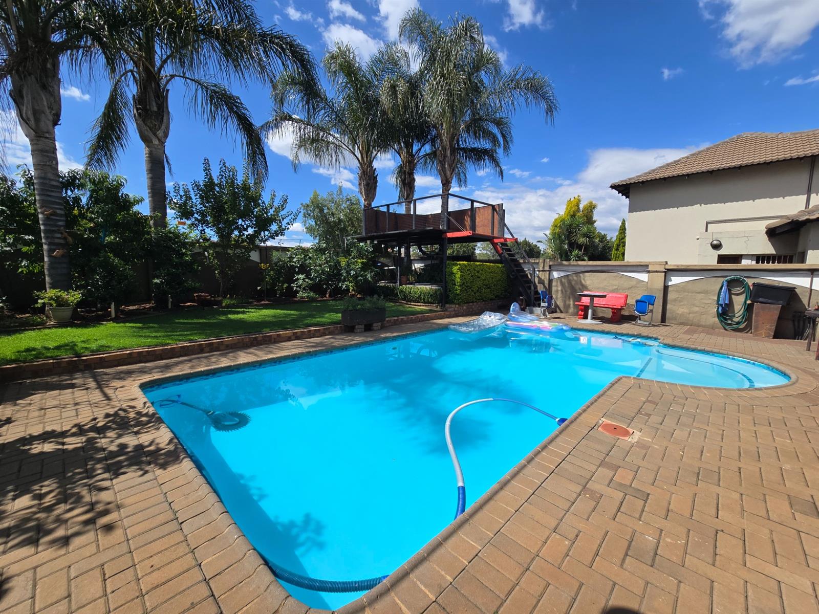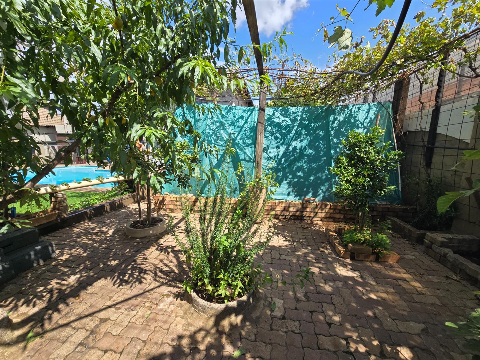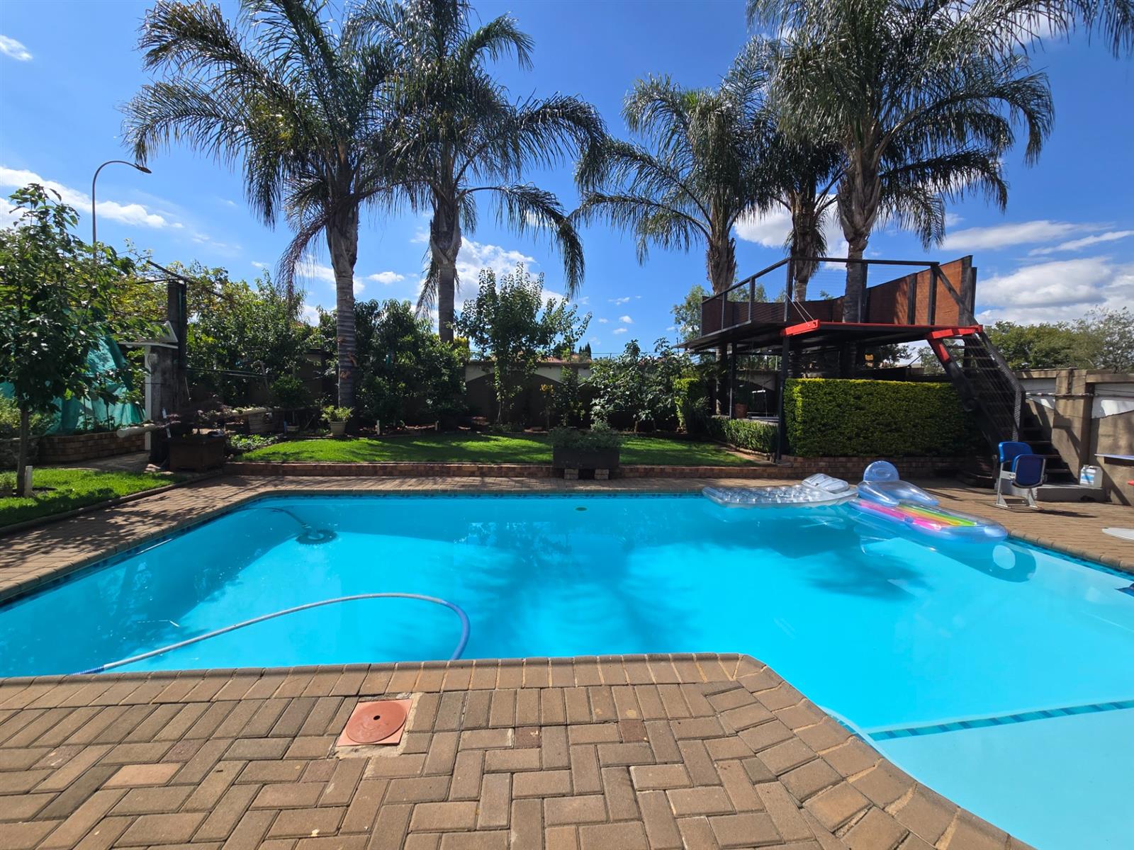 The garden is well established with generous lawn space and an impressive selection of fruit trees, including peaches, apples, blueberries, figs, pomegranates, pears, and naartjies. An outdoor shower and a guest toilet with basin add convenience for poolside living.