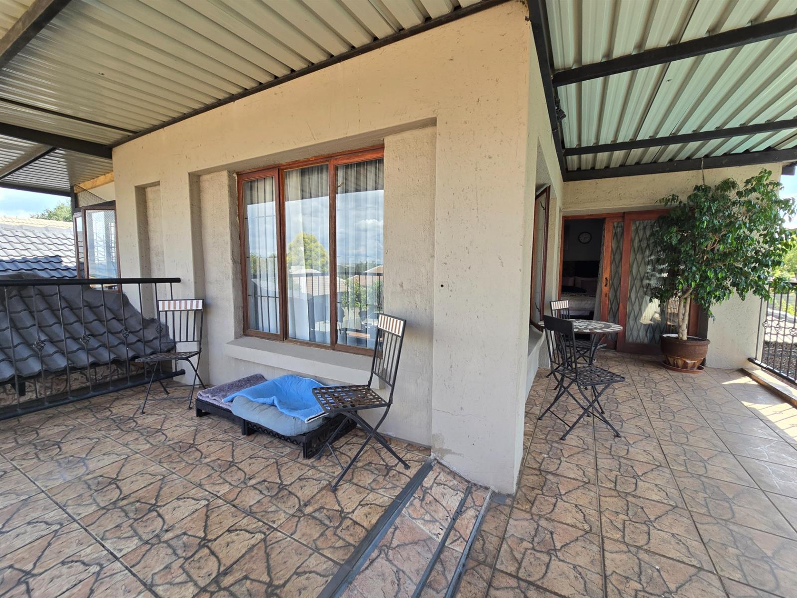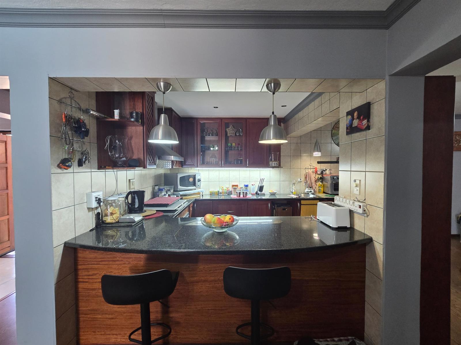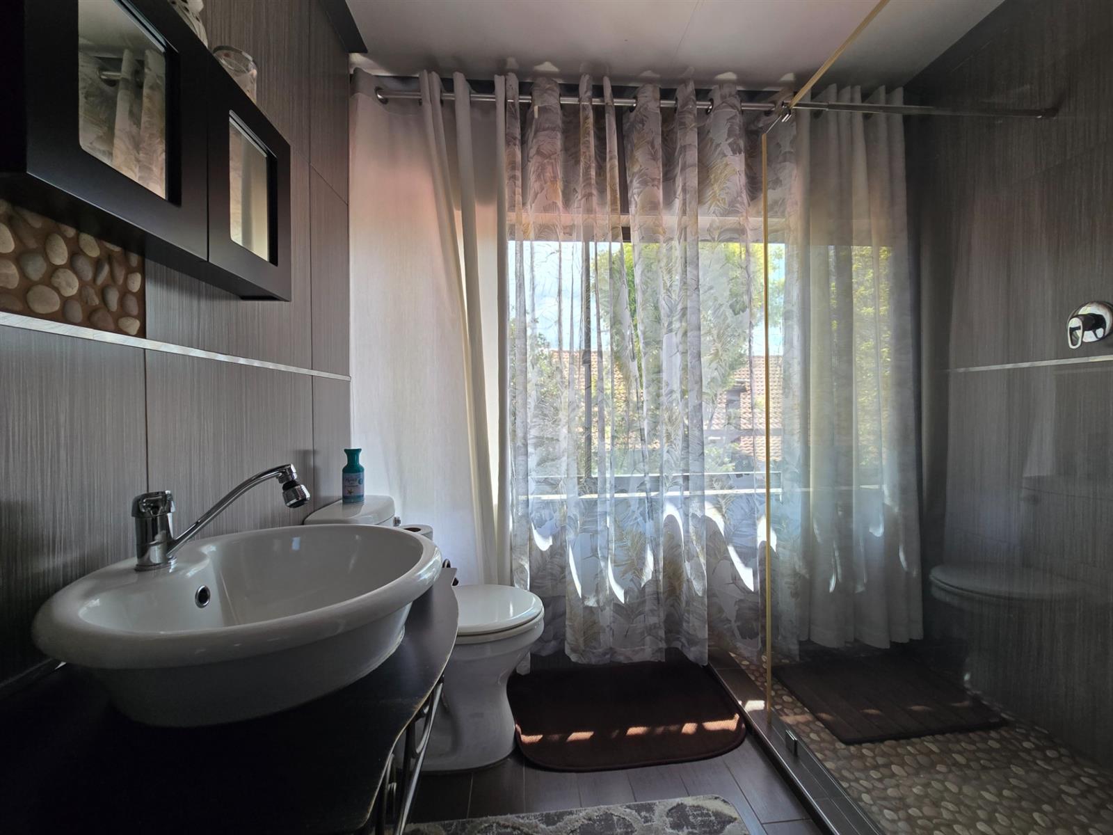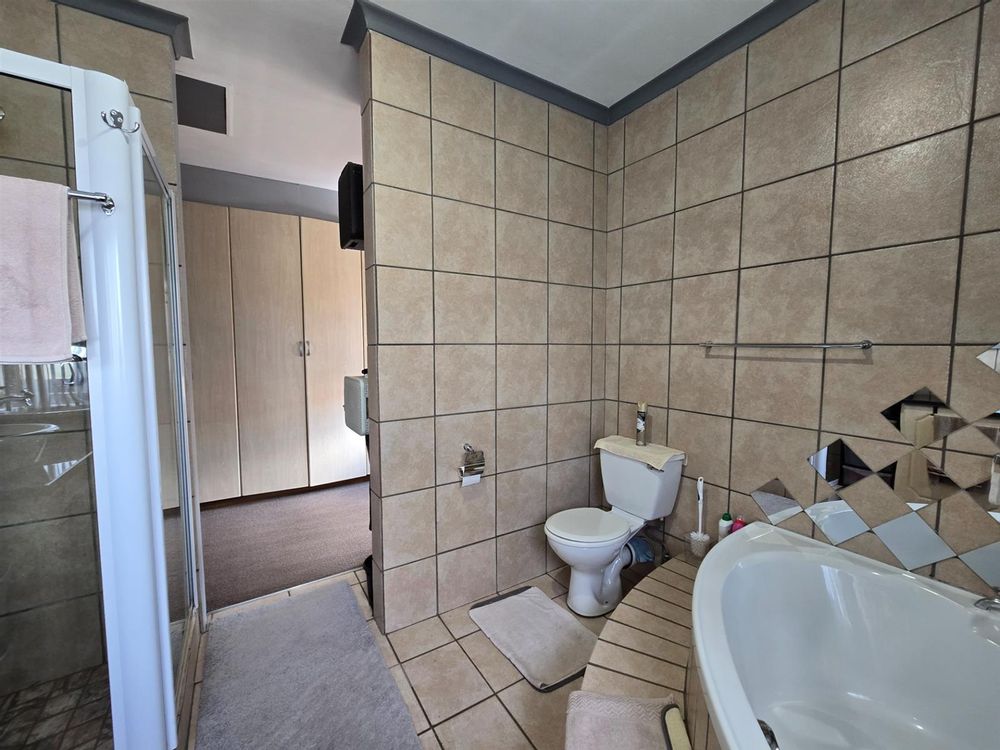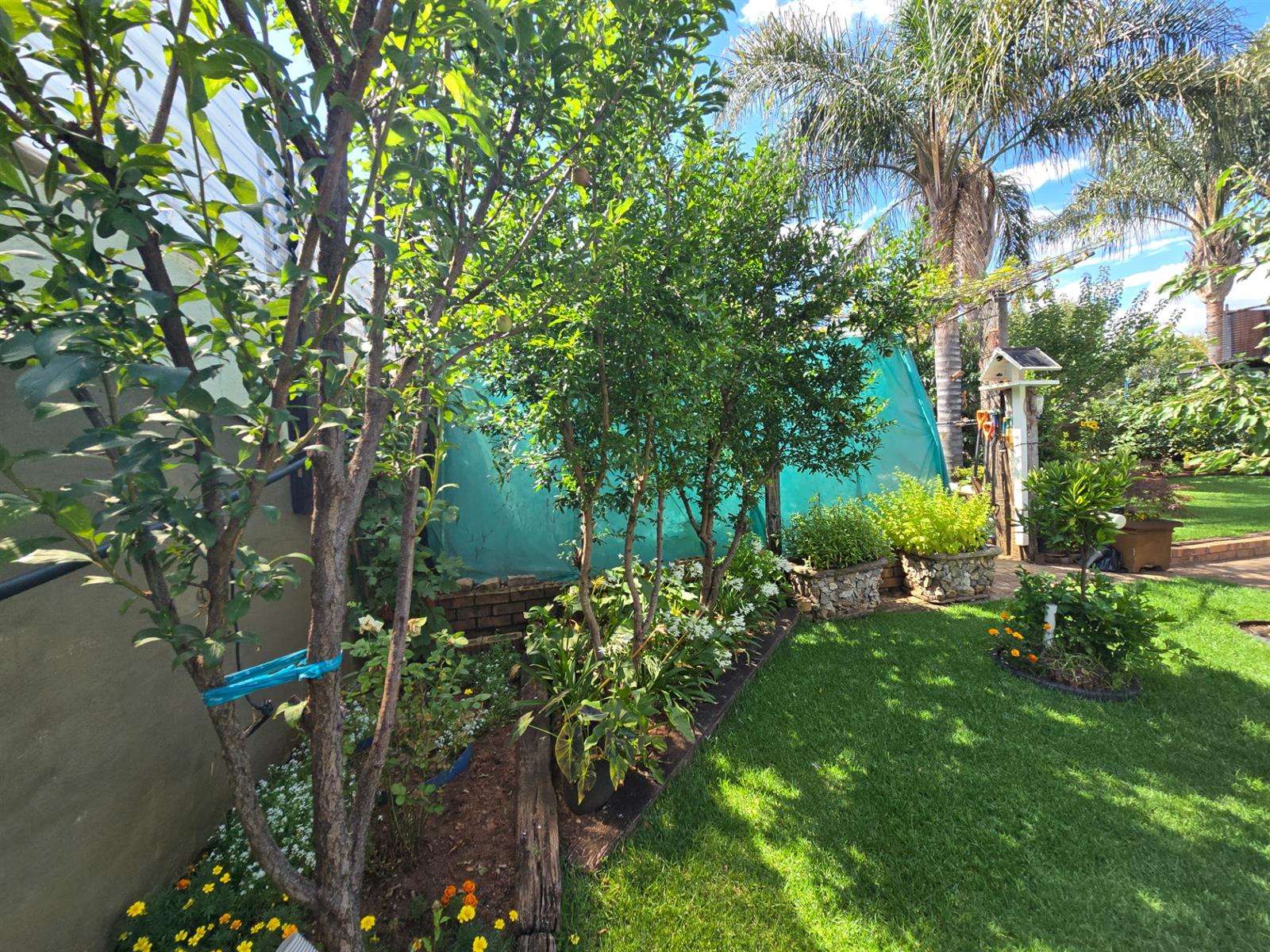 The garden is well established with generous lawn space and an impressive selection of fruit trees, including peaches, apples, blueberries, figs, pomegranates, pears, and naartjies. An outdoor shower and a guest toilet with basin add convenience for poolside living.