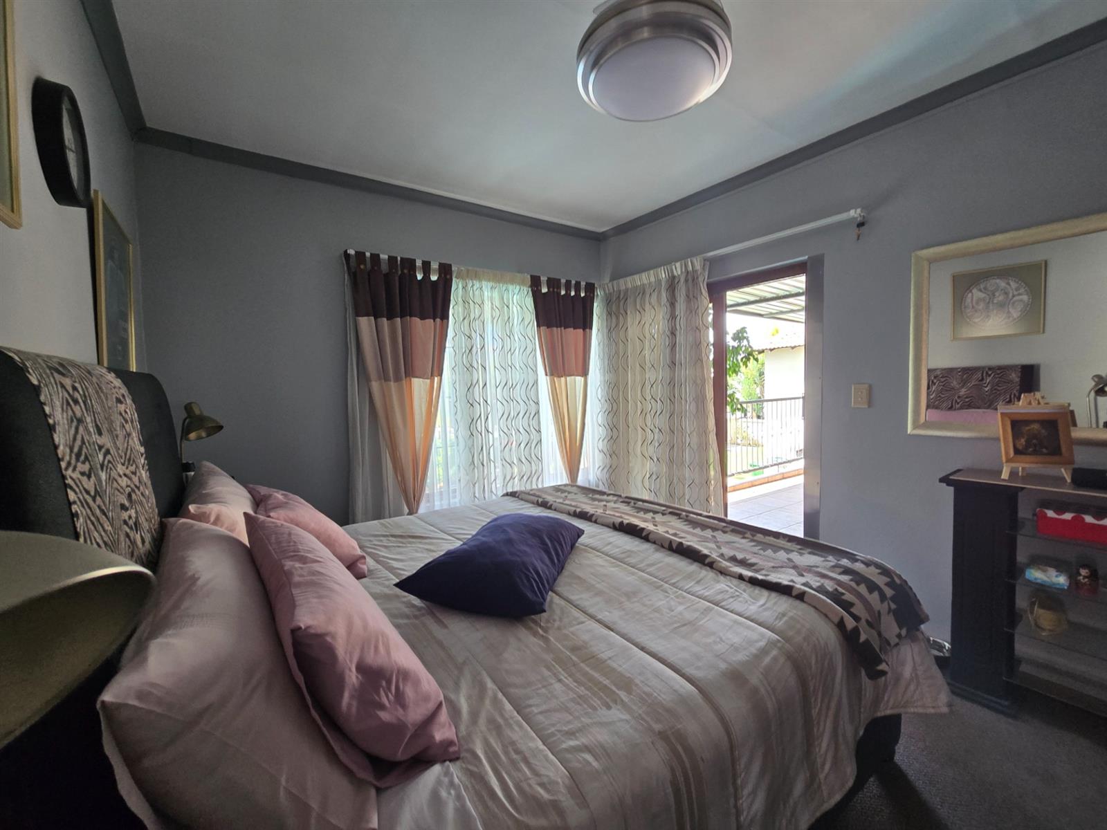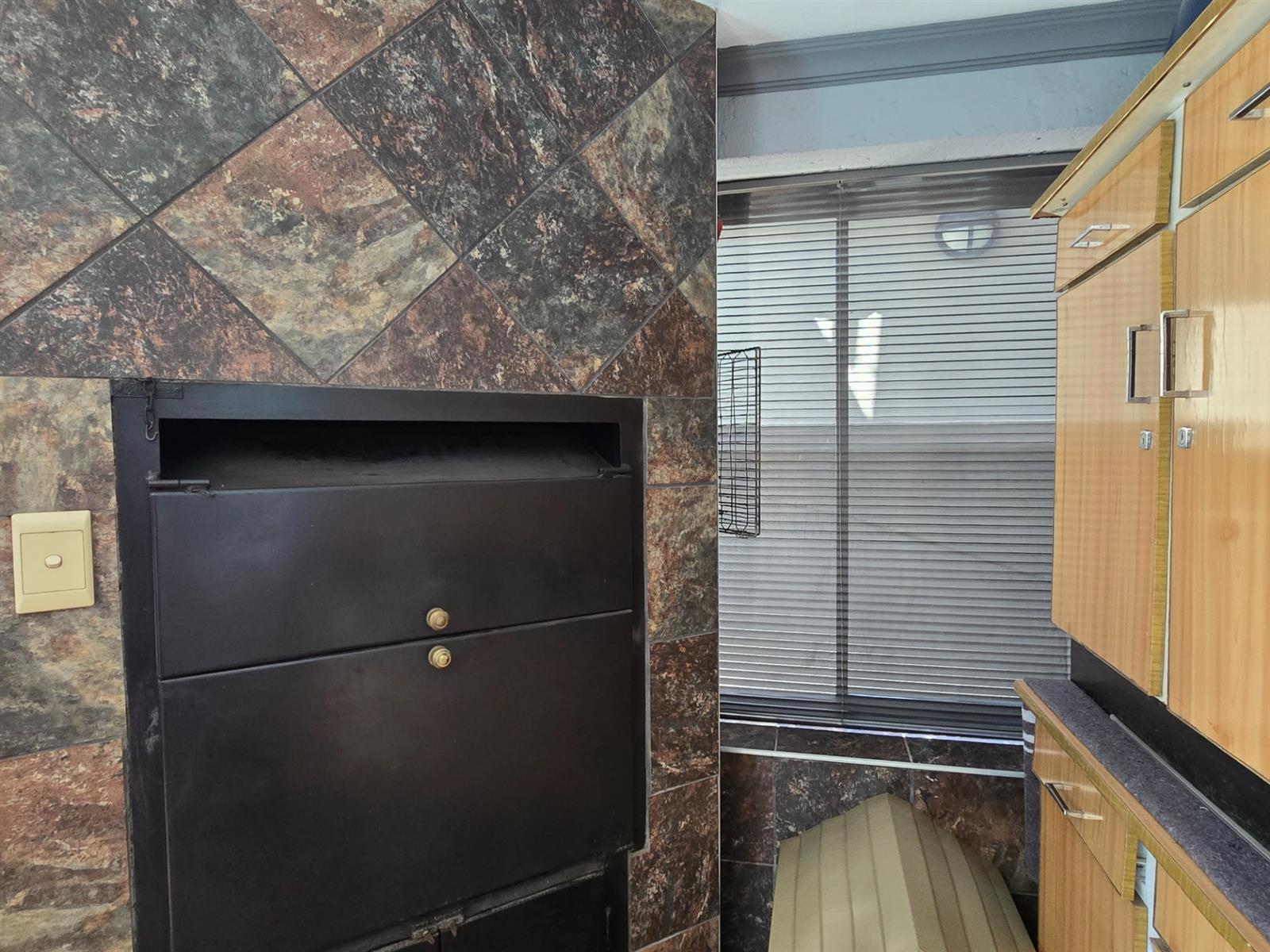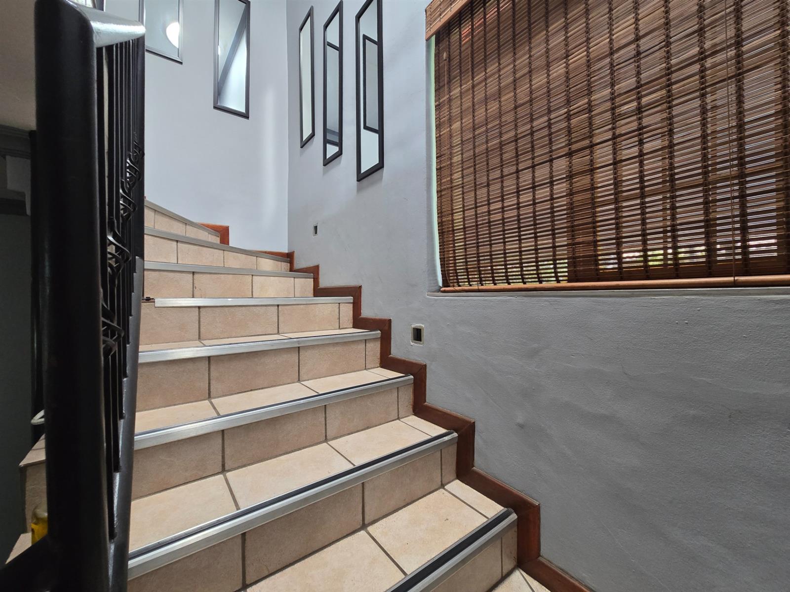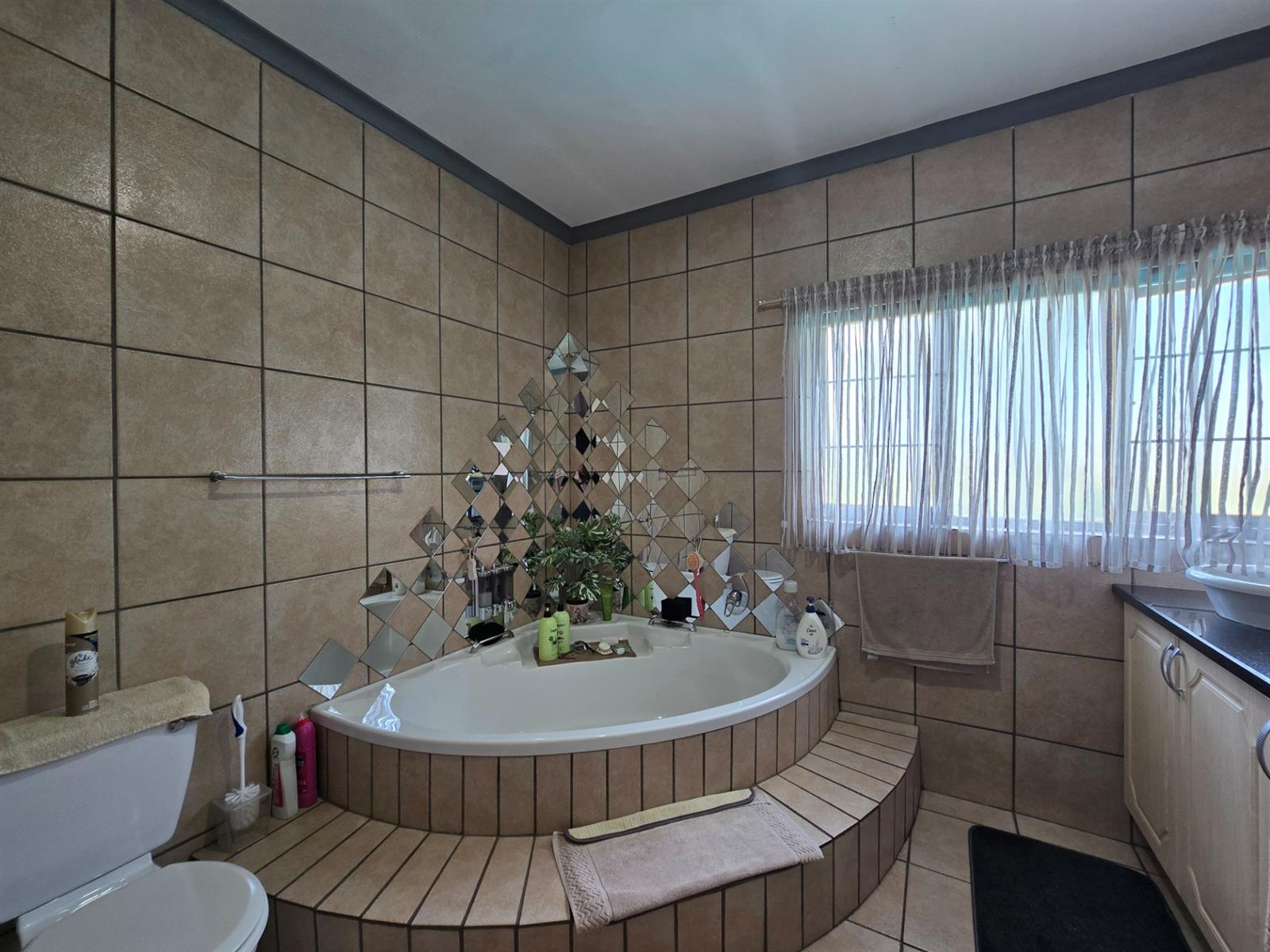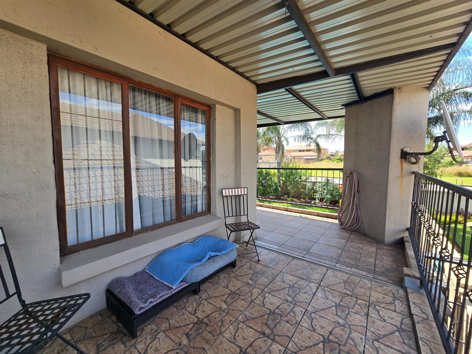 The garden is well established with generous lawn space and an impressive selection of fruit trees, including peaches, apples, blueberries, figs, pomegranates, pears, and naartjies. An outdoor shower and a guest toilet with basin add convenience for poolside living.