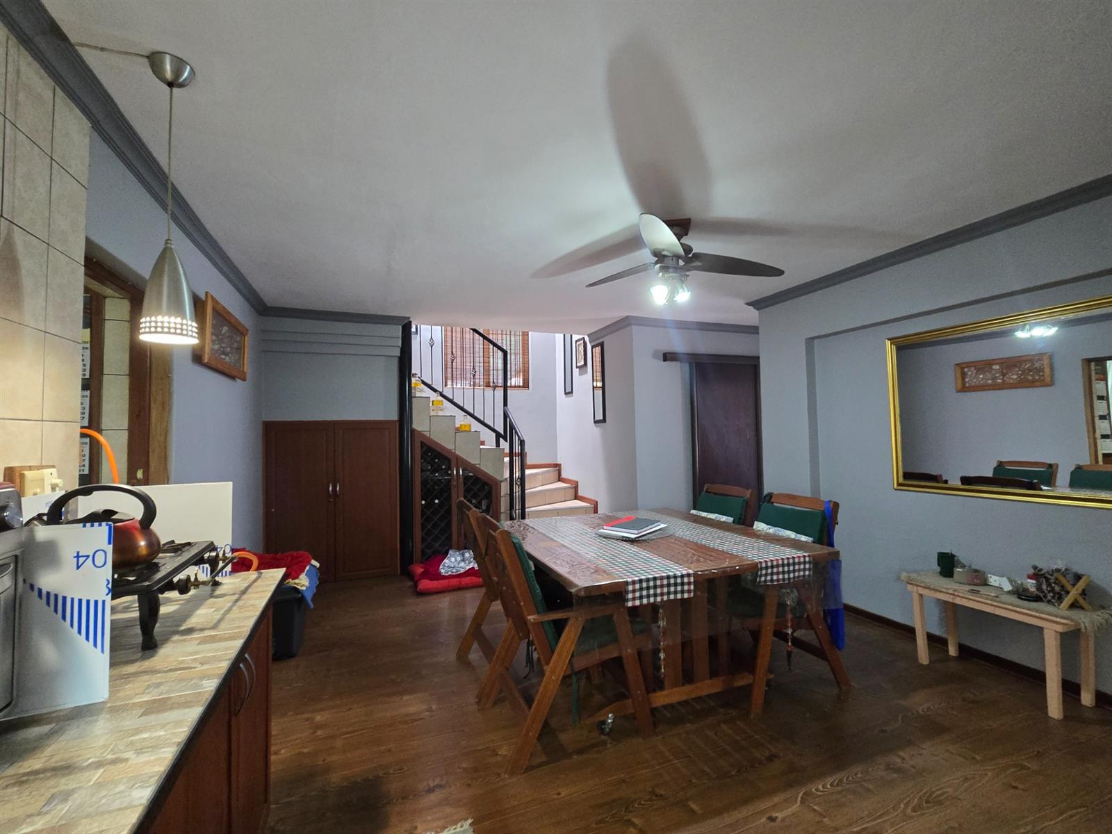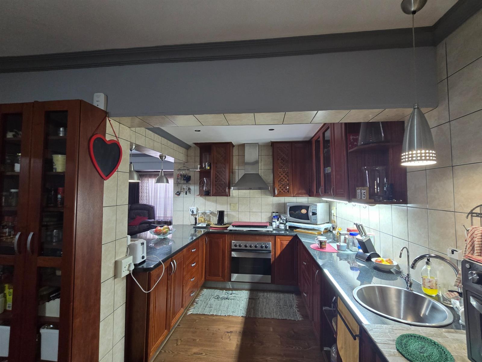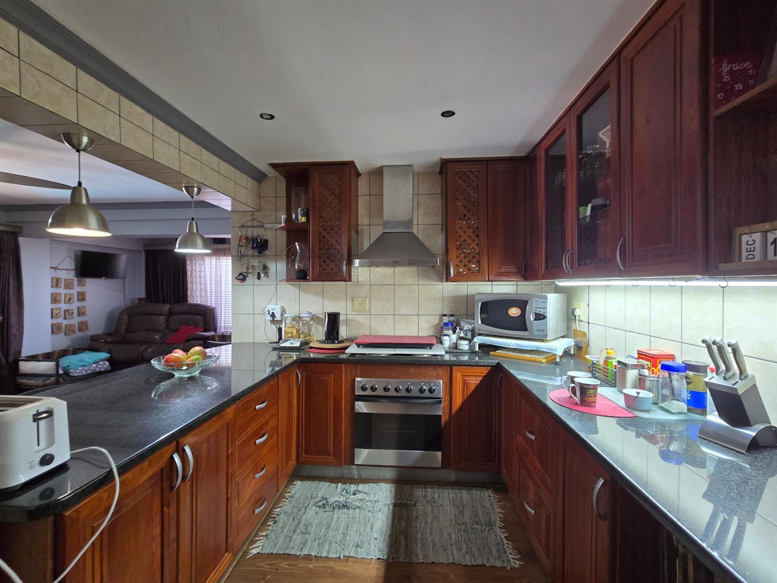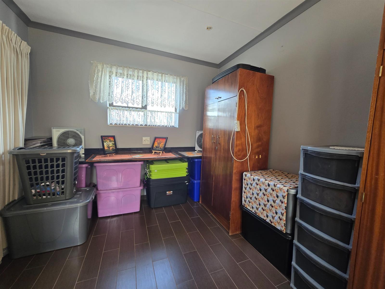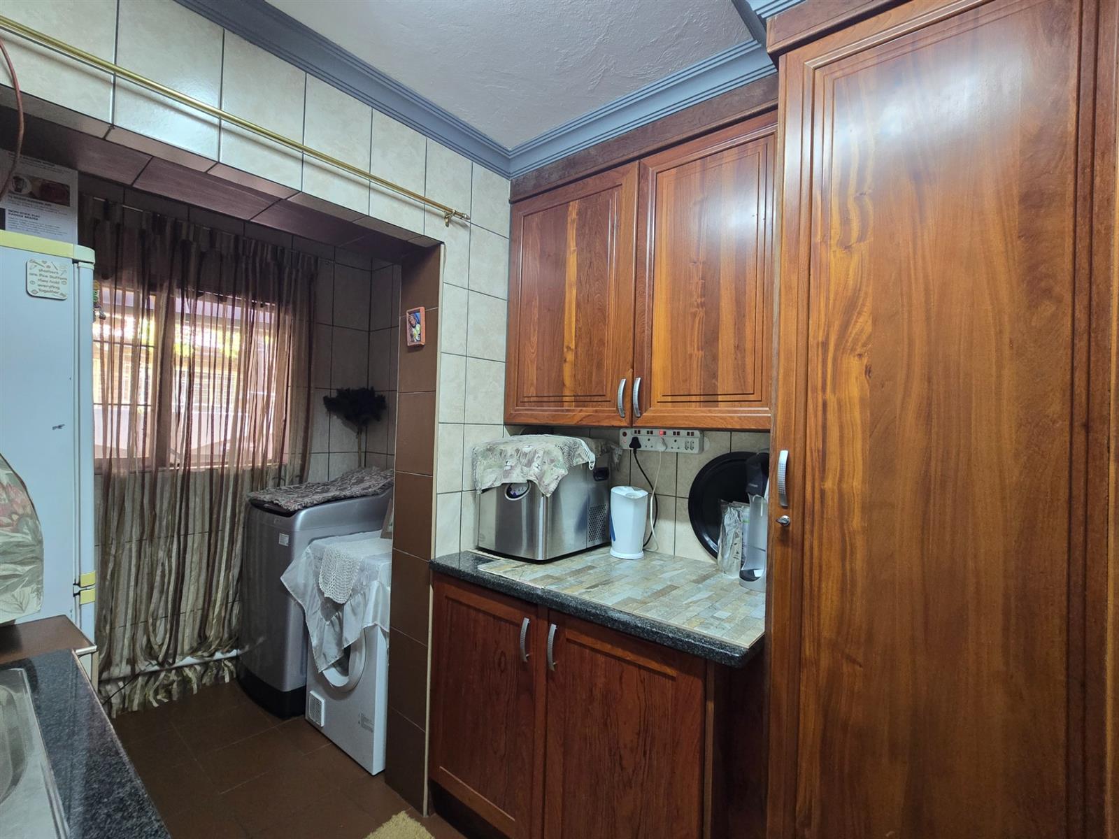 The kitchen is both functional and well-appointed, offering granite countertops, a four-plate electric hob, extractor fan, electric oven, prep bowl, and solid rosewood cupboards. The dining room is open plan to the kitchen, creating a natural flow for family meals and entertaining. A separate combined scullery and laundry room adds valuable practicality and keeps the main kitchen uncluttered. Laminated flooring throughout the living areas enhances continuity and warmth.