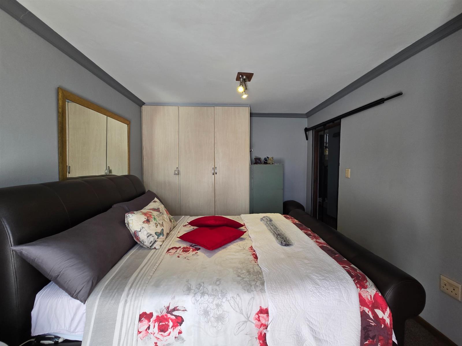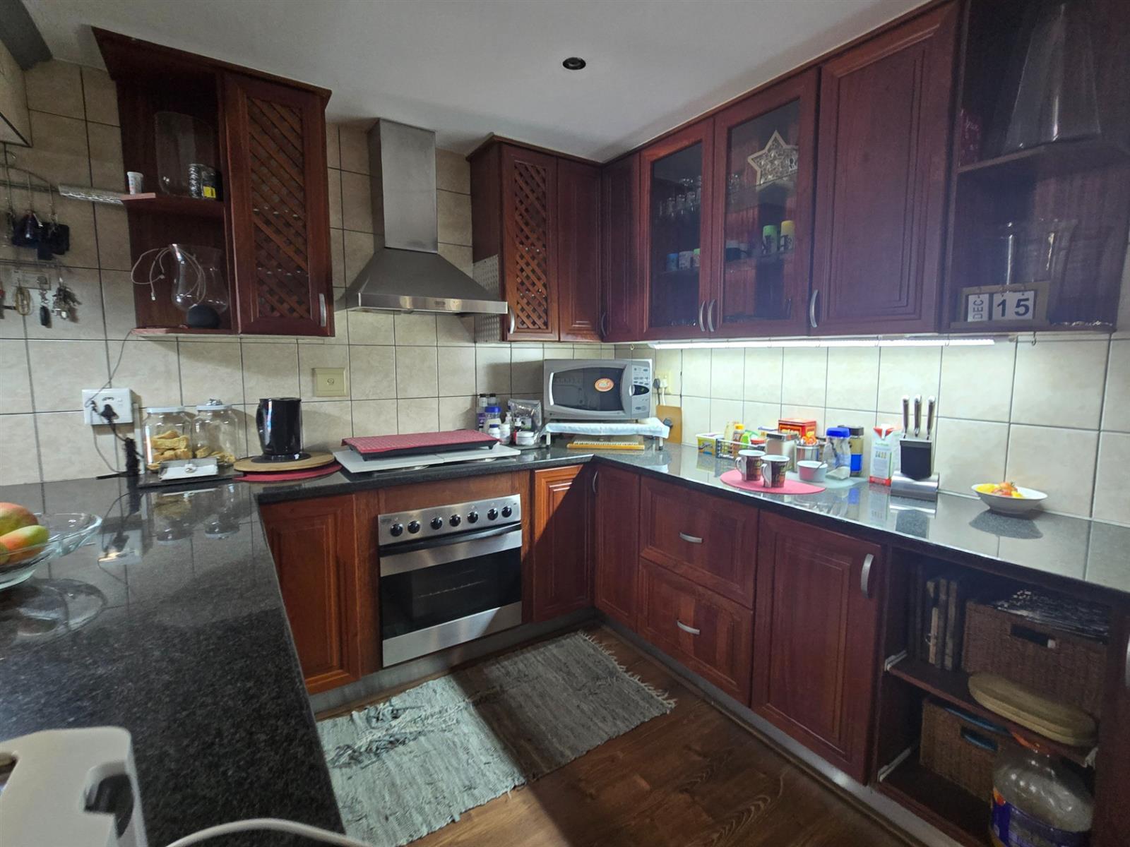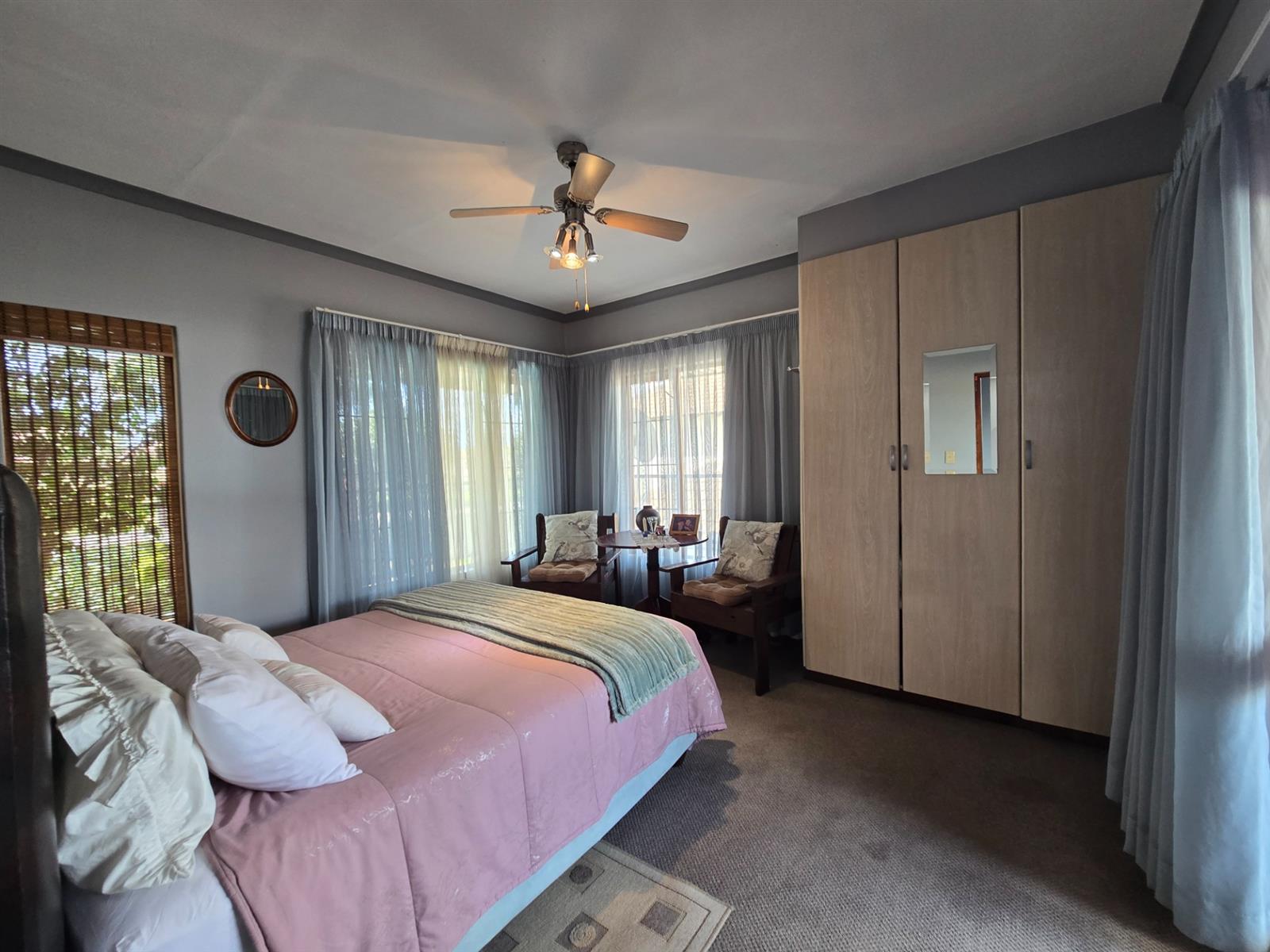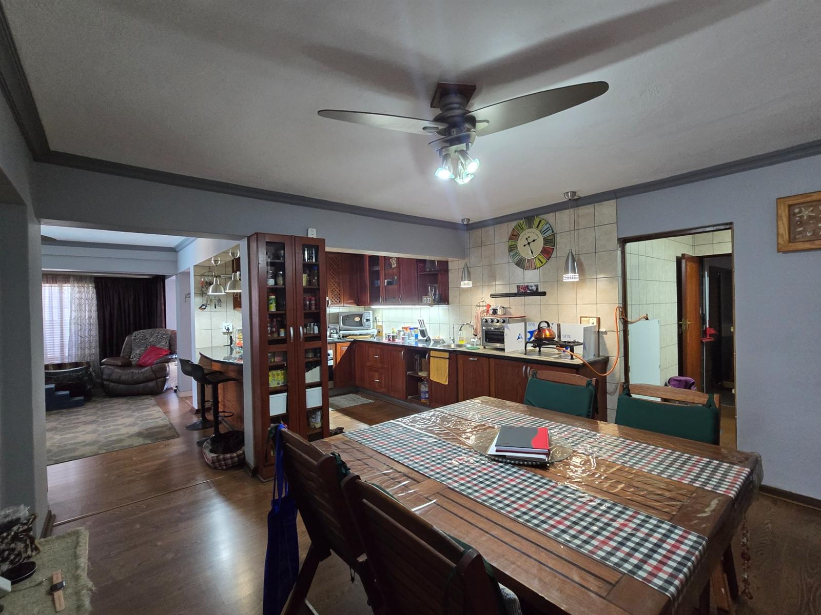 The kitchen is both functional and well-appointed, offering granite countertops, a four-plate electric hob, extractor fan, electric oven, prep bowl, and solid rosewood cupboards. The dining room is open plan to the kitchen, creating a natural flow for family meals and entertaining. A separate combined scullery and laundry room adds valuable practicality and keeps the main kitchen uncluttered. Laminated flooring throughout the living areas enhances continuity and warmth.