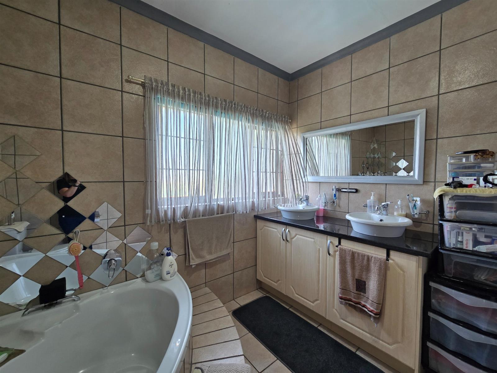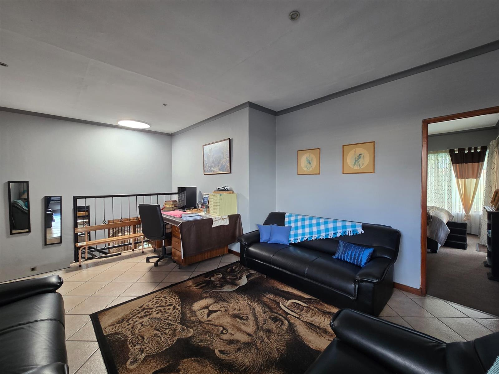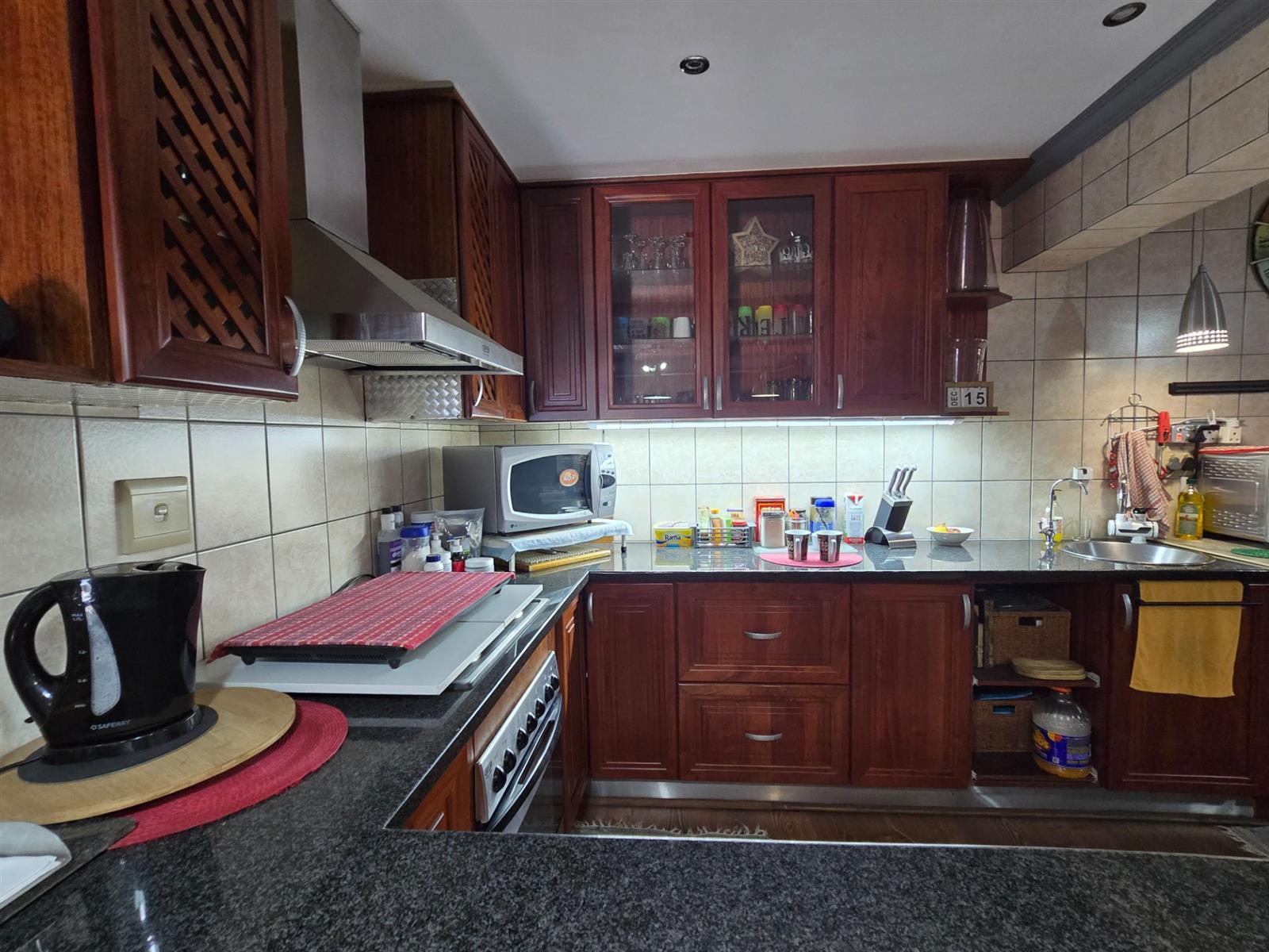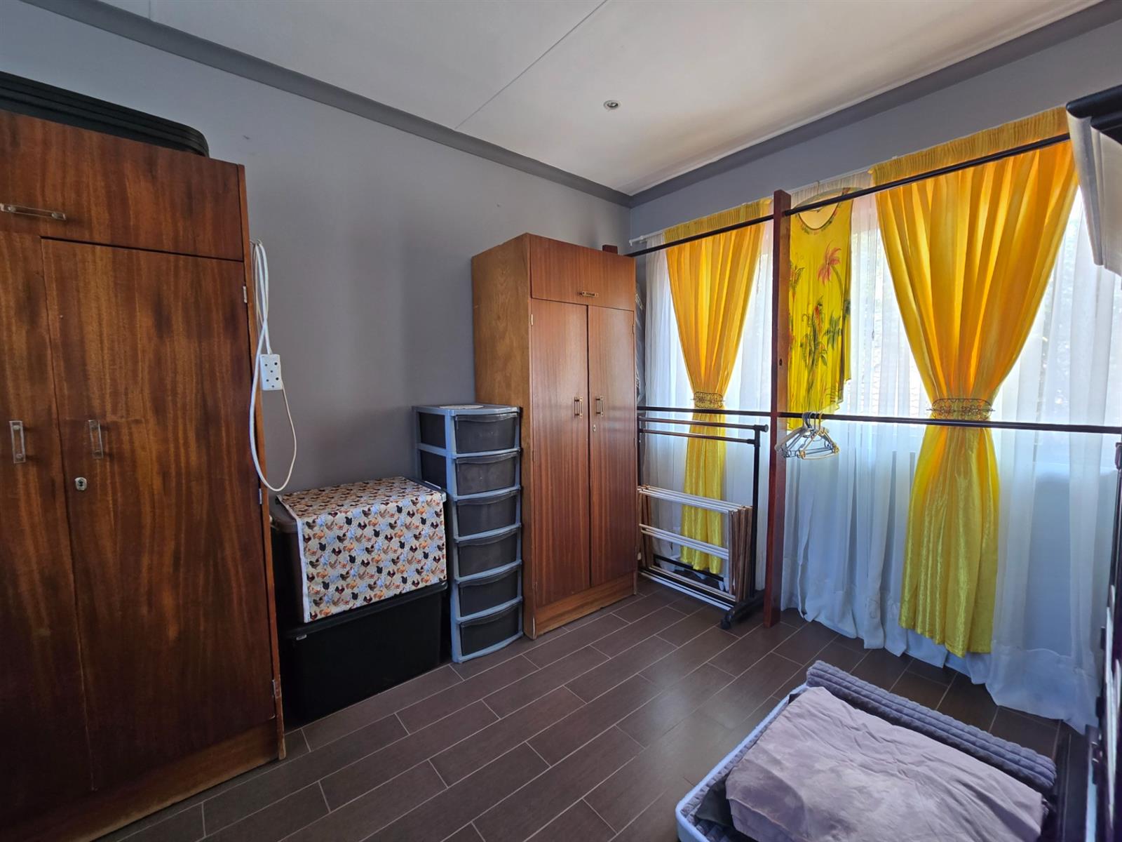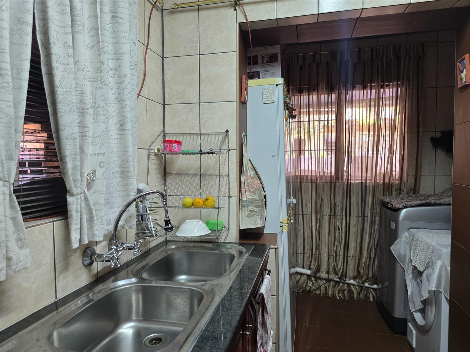 The kitchen is both functional and well-appointed, offering granite countertops, a four-plate electric hob, extractor fan, electric oven, prep bowl, and solid rosewood cupboards. The dining room is open plan to the kitchen, creating a natural flow for family meals and entertaining. A separate combined scullery and laundry room adds valuable practicality and keeps the main kitchen uncluttered. Laminated flooring throughout the living areas enhances continuity and warmth.