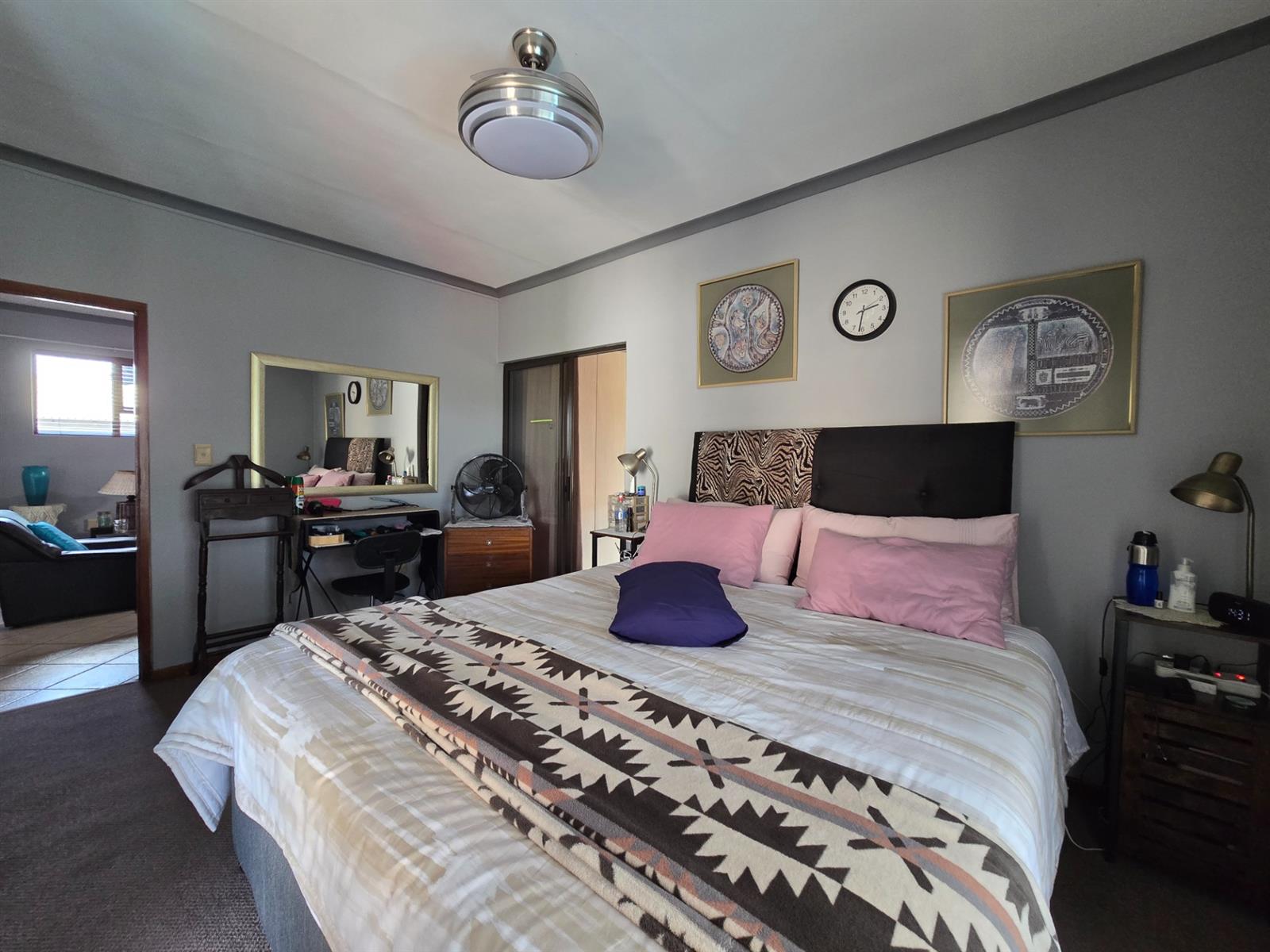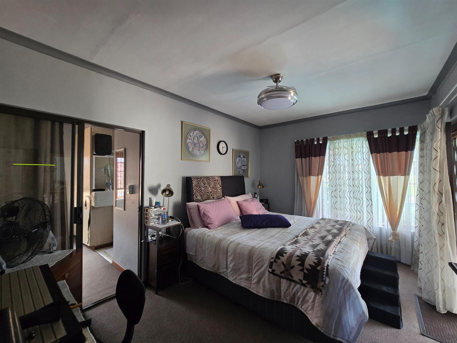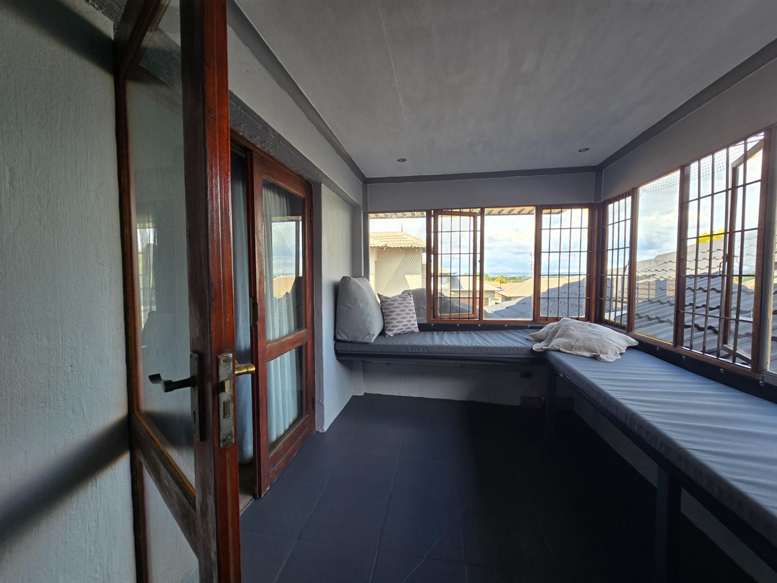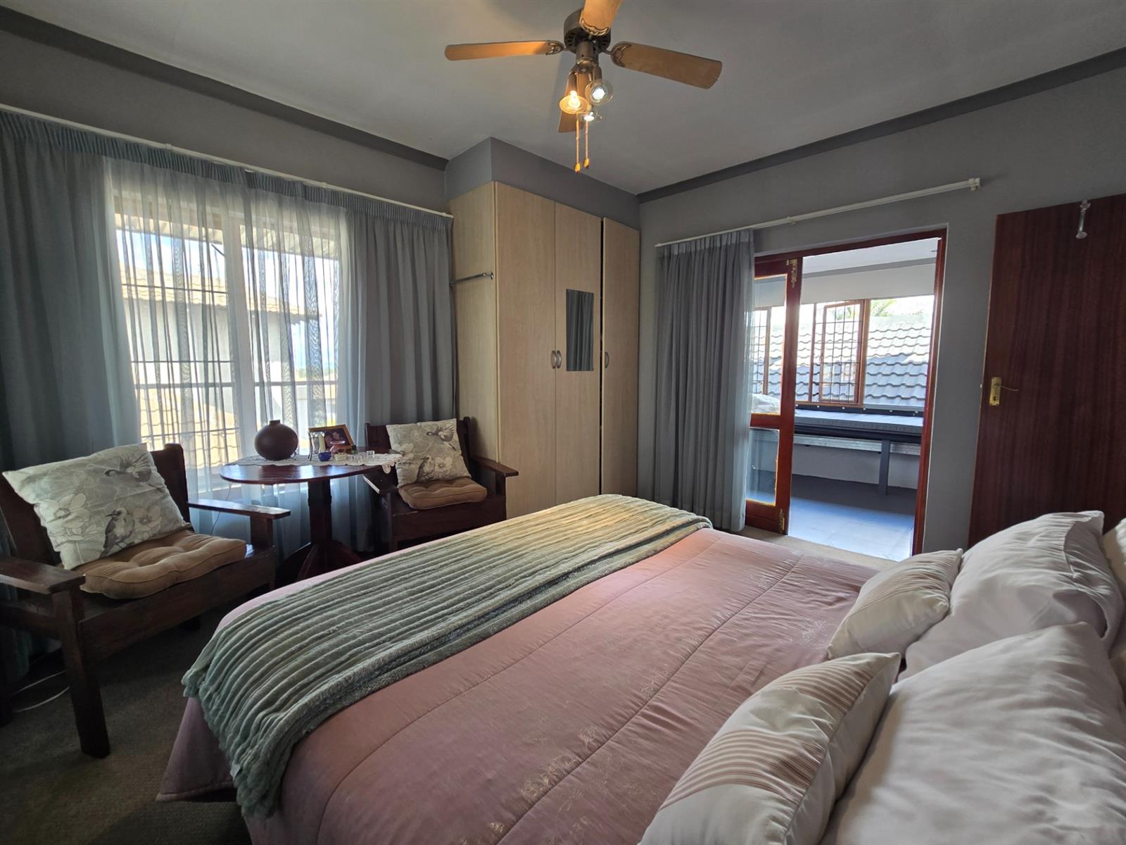 Upstairs, a comfortable pyjama lounge provides additional family living space. The main bedroom suite features carpeted flooring, a walk-in closet, and a sliding door with Trellidor security opening onto a balcony overlooking the pool. The en-suite bathroom includes double vanities with granite countertops, a toilet, and a shower. An additional upstairs bedroom offers built-in cupboards, a ceiling fan, and access to a sunroom with windows and entry to the PJ lounge. A further bathroom on this level includes a walk-in shower, granite-topped vanity, toilet, and basin.