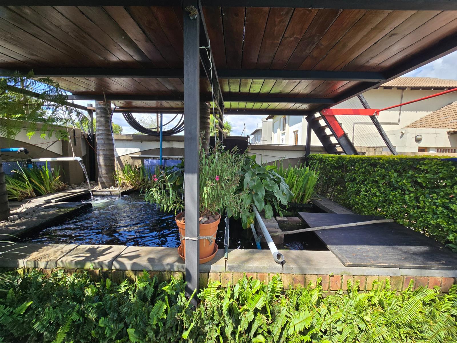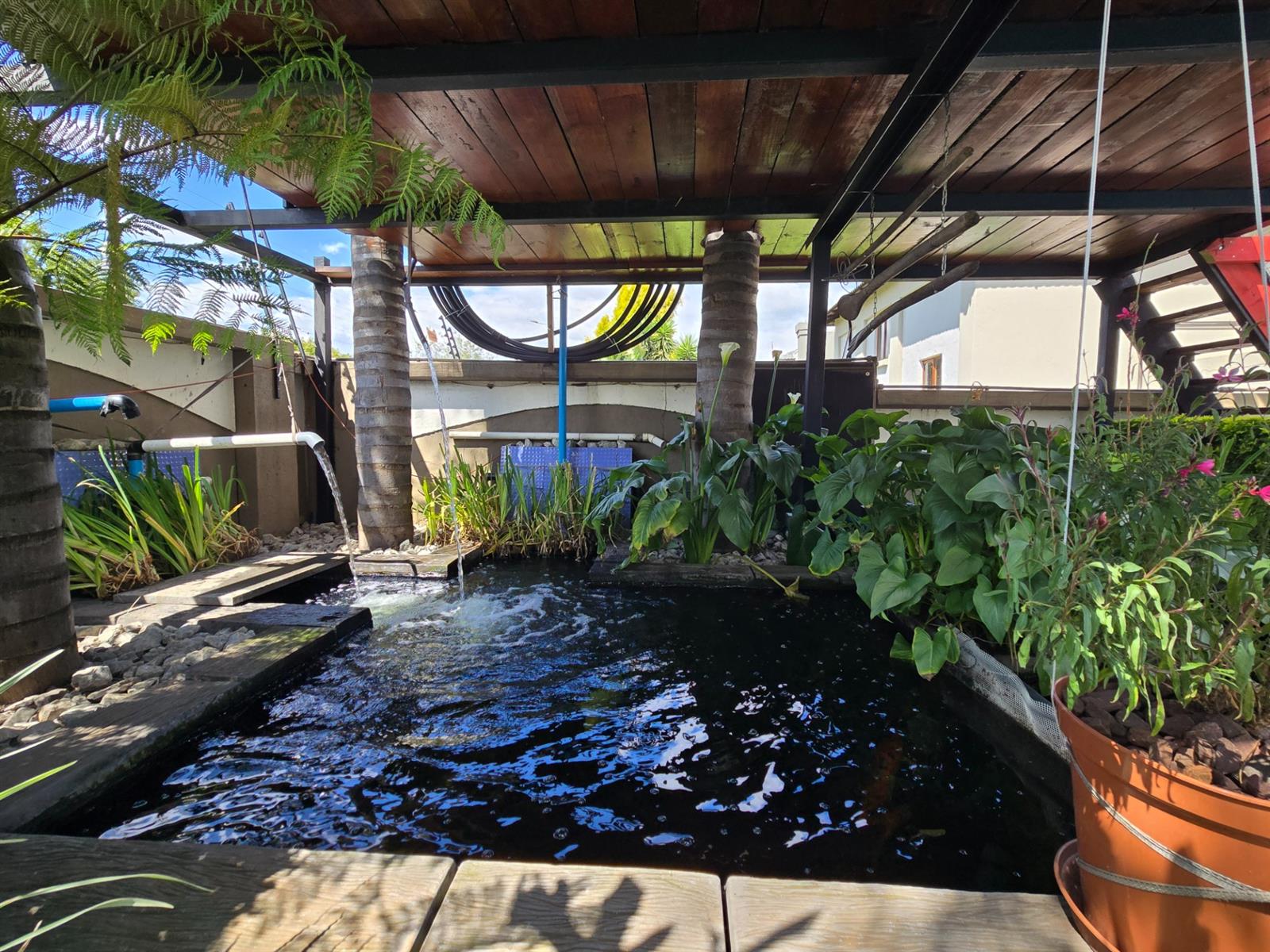 The sunroom flows seamlessly outside to a tranquil setting that includes a sparkling swimming pool, a beautifully established koi pond, and an elevated wooden deck positioned above the koi pond—an ideal space for entertaining, relaxing, or simply enjoying the peaceful surroundings.