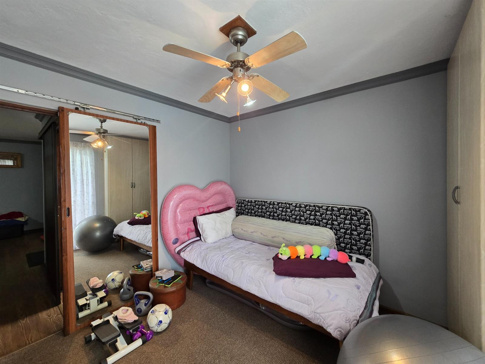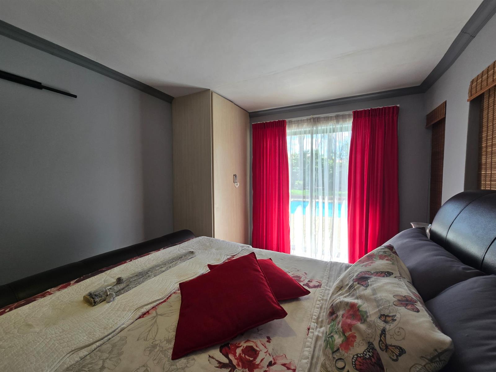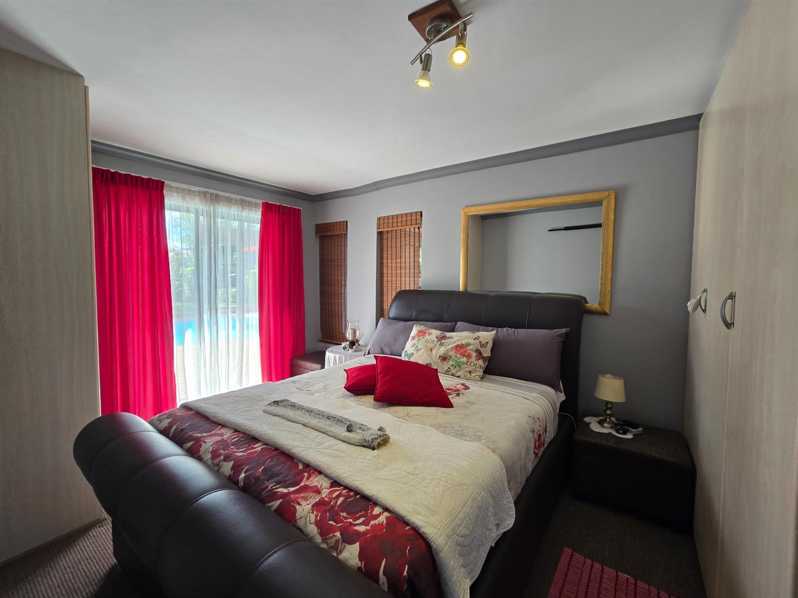 Downstairs accommodation includes two carpeted bedrooms, both fitted with built-in cupboards and sliding doors opening directly onto the pool area. These bedrooms are serviced by a full bathroom with bath, shower, basin, toilet, and mirrored sliding door.