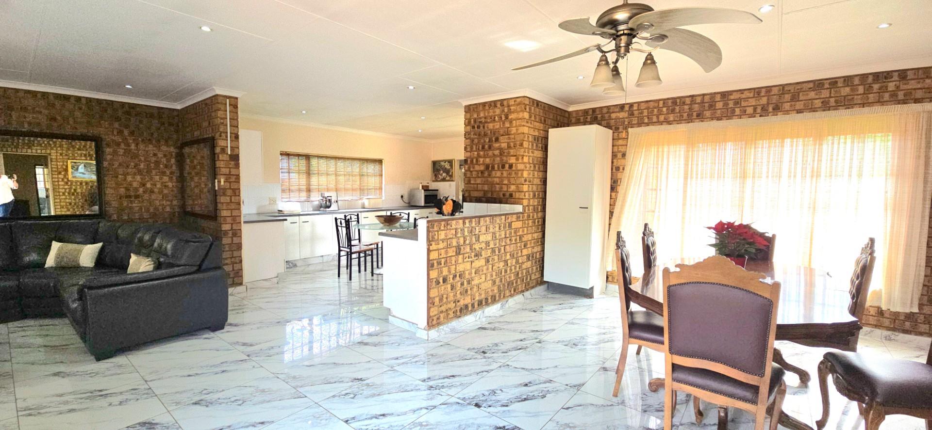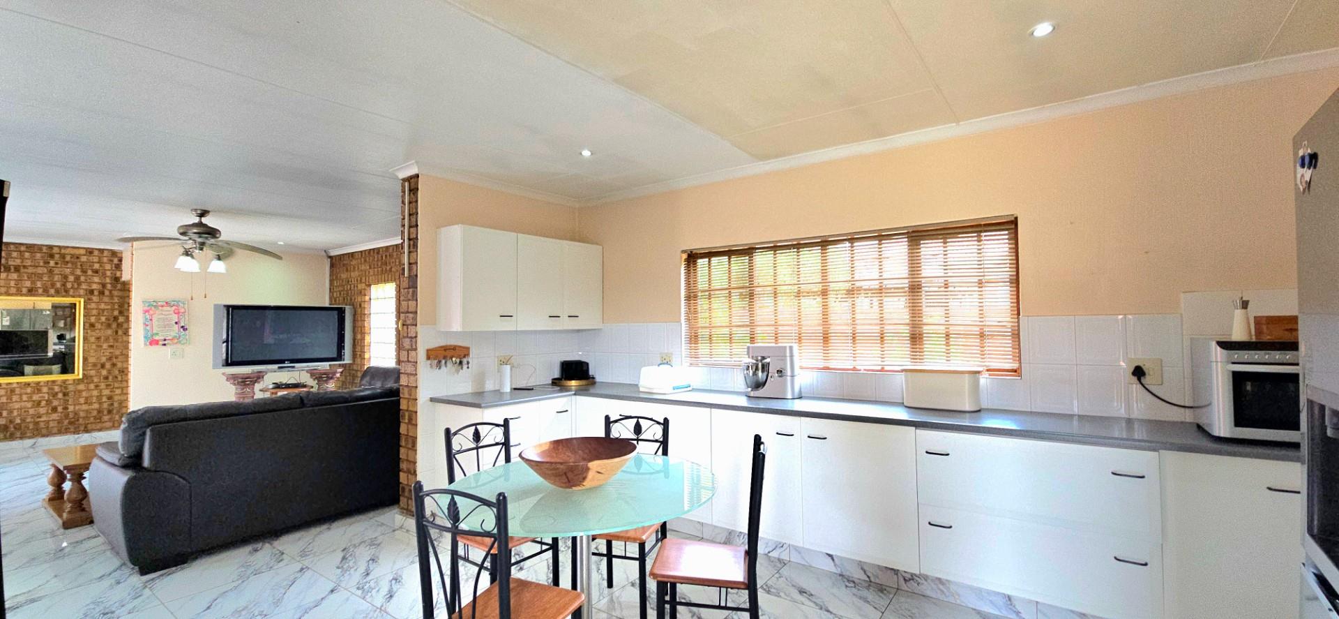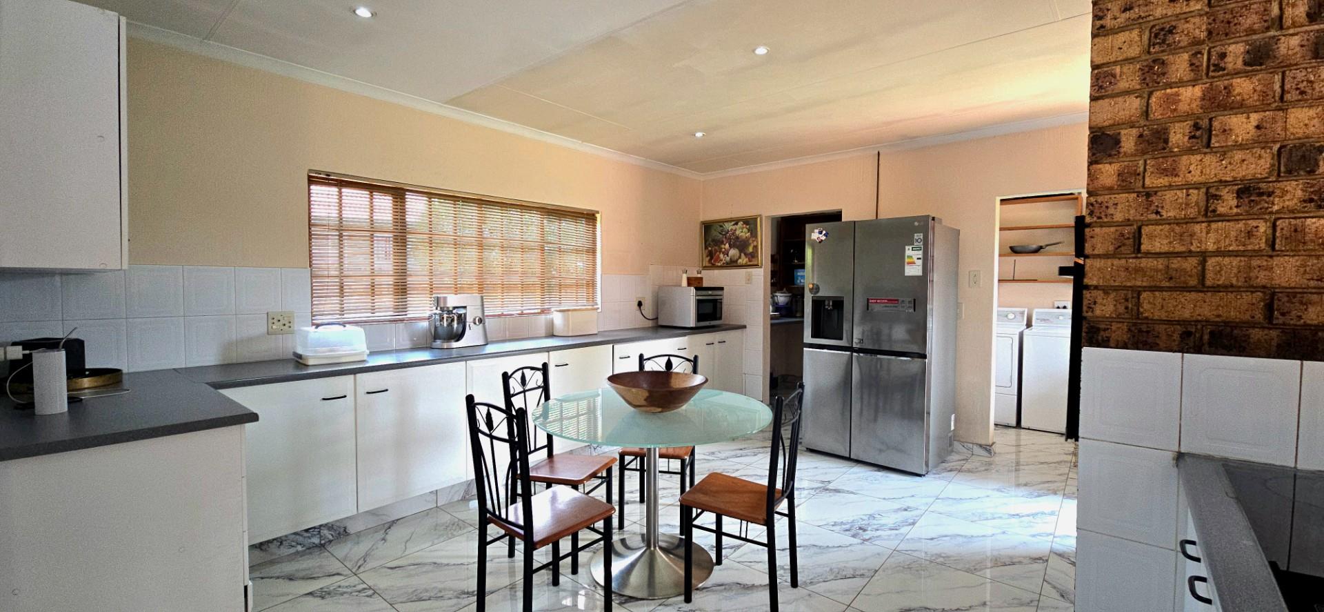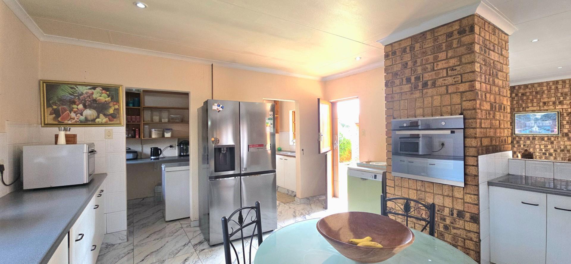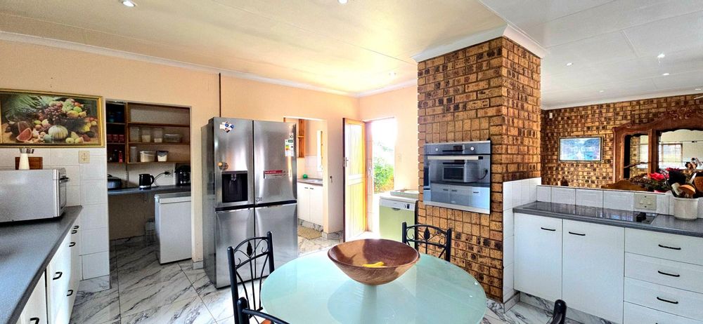 The kitchen is spacious and functional, offering white cupboards, polyform countertops, a glass-top hob, eye-level oven, ample cupboard space, a walk-in pantry, and a separate combined scullery and laundry area. The dining room opens via sliding doors to the patio, ideal for family meals and entertaining.