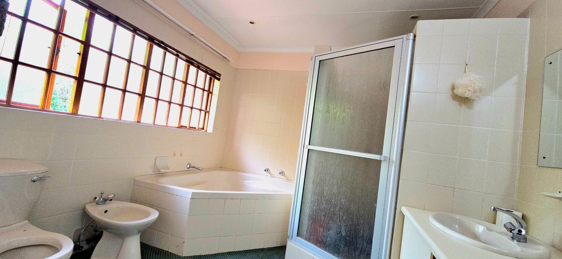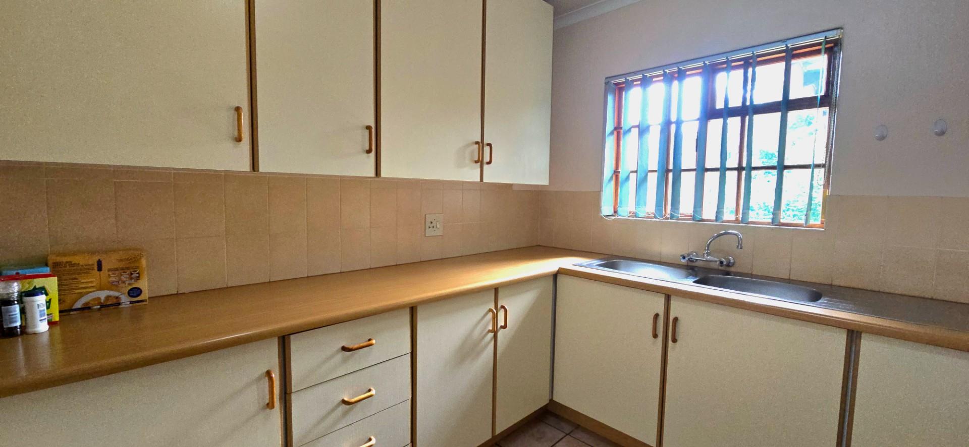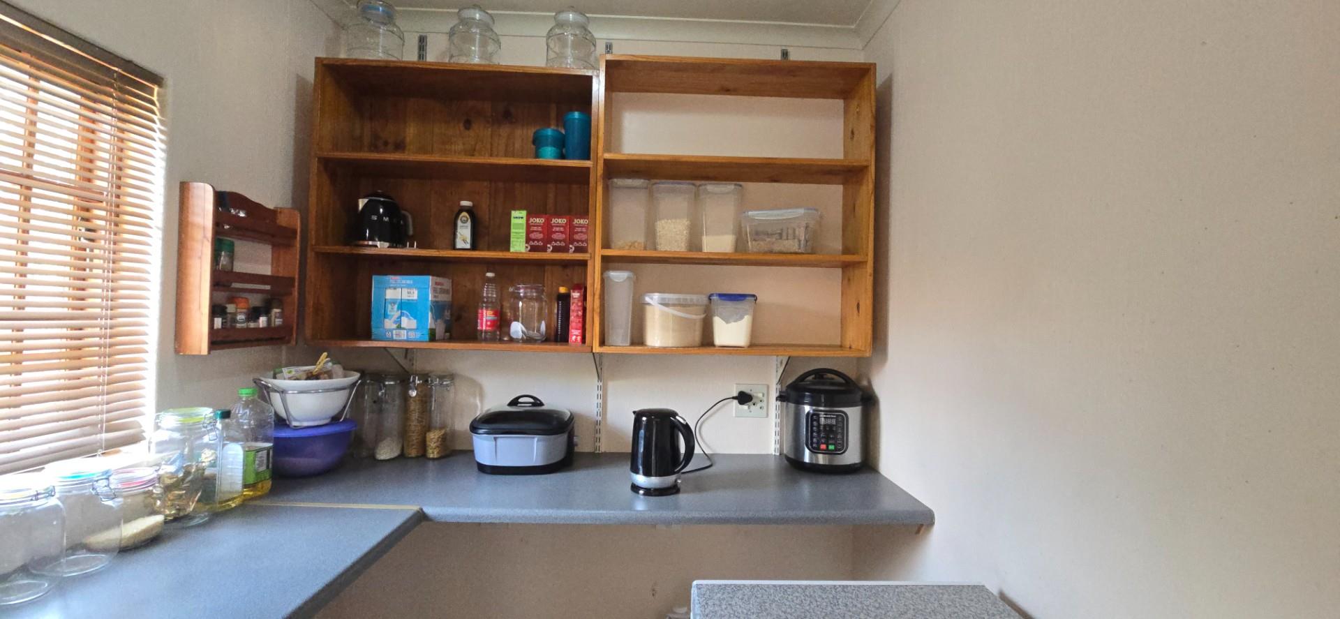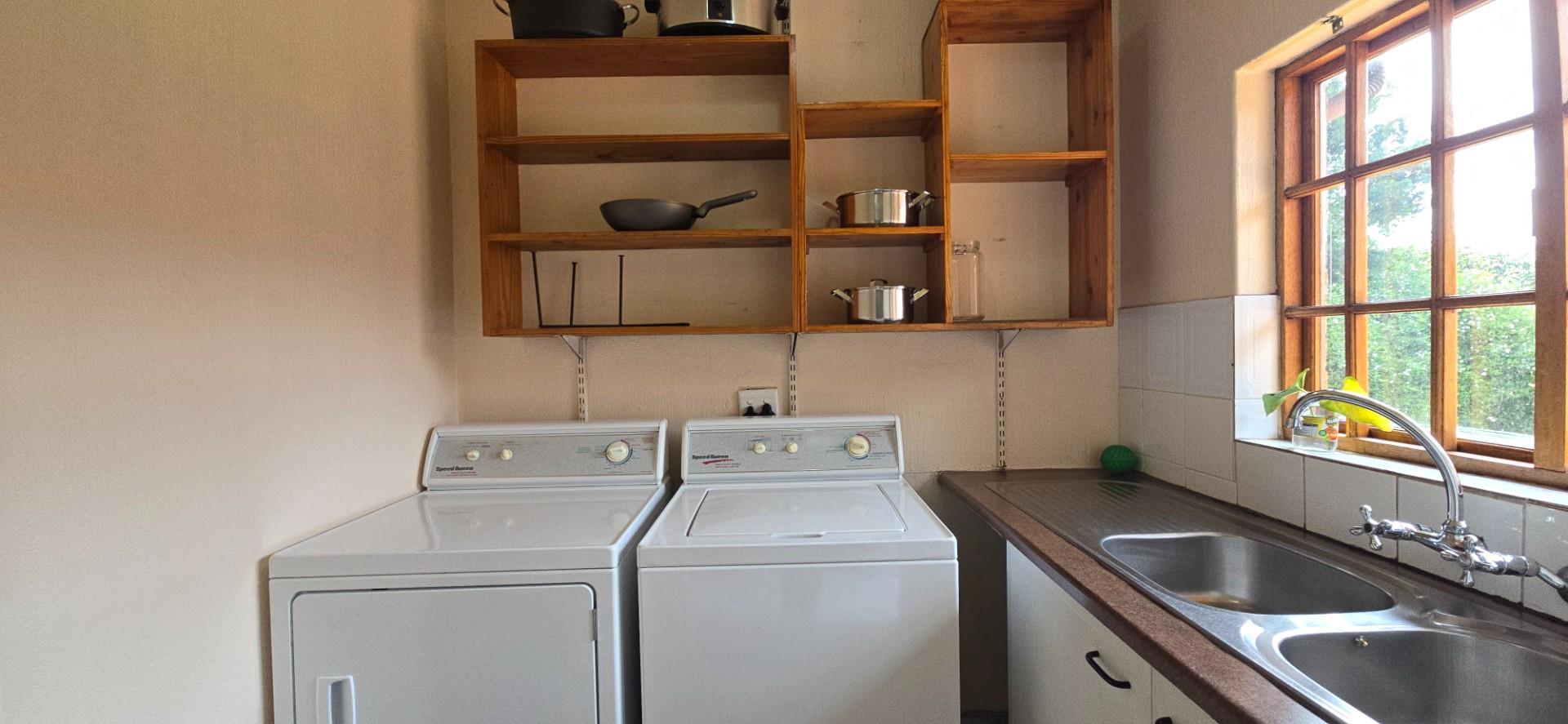 The kitchen is spacious and functional, offering white cupboards, polyform countertops, a glass-top hob, eye-level oven, ample cupboard space, a walk-in pantry, and a separate combined scullery and laundry area. The dining room opens via sliding doors to the patio, ideal for family meals and entertaining.