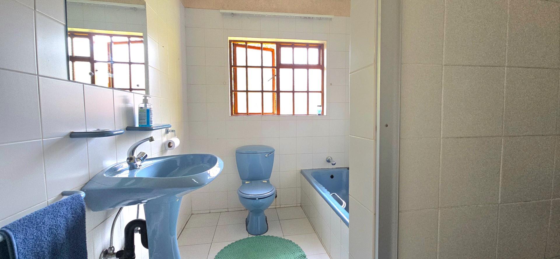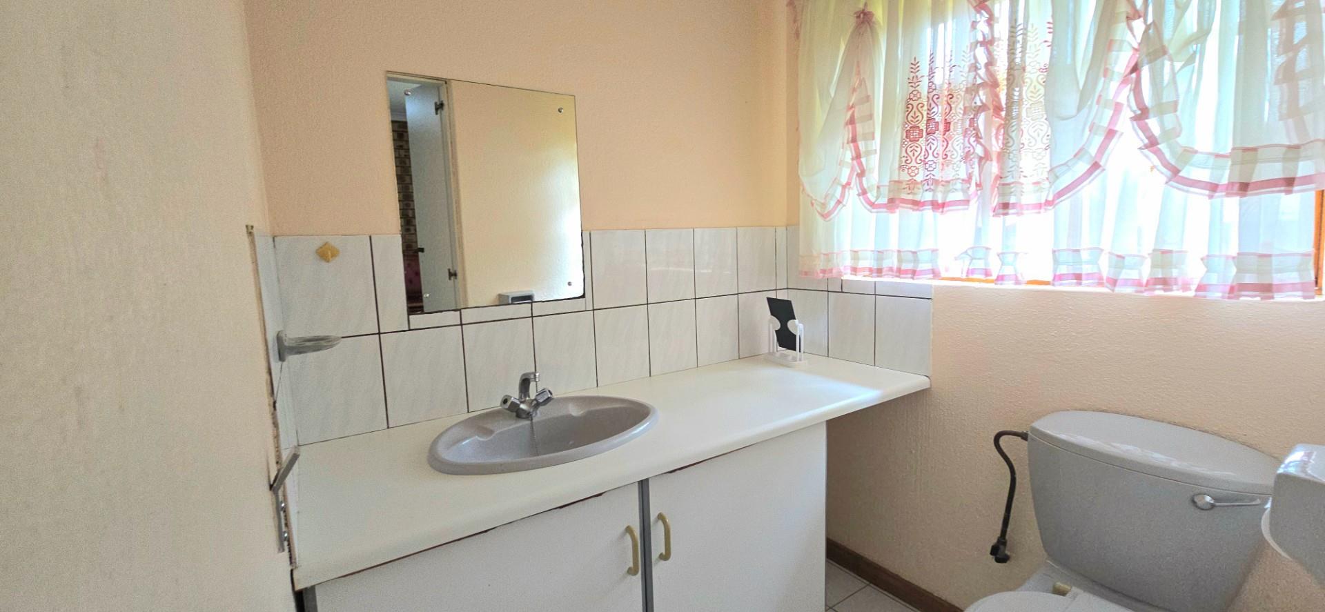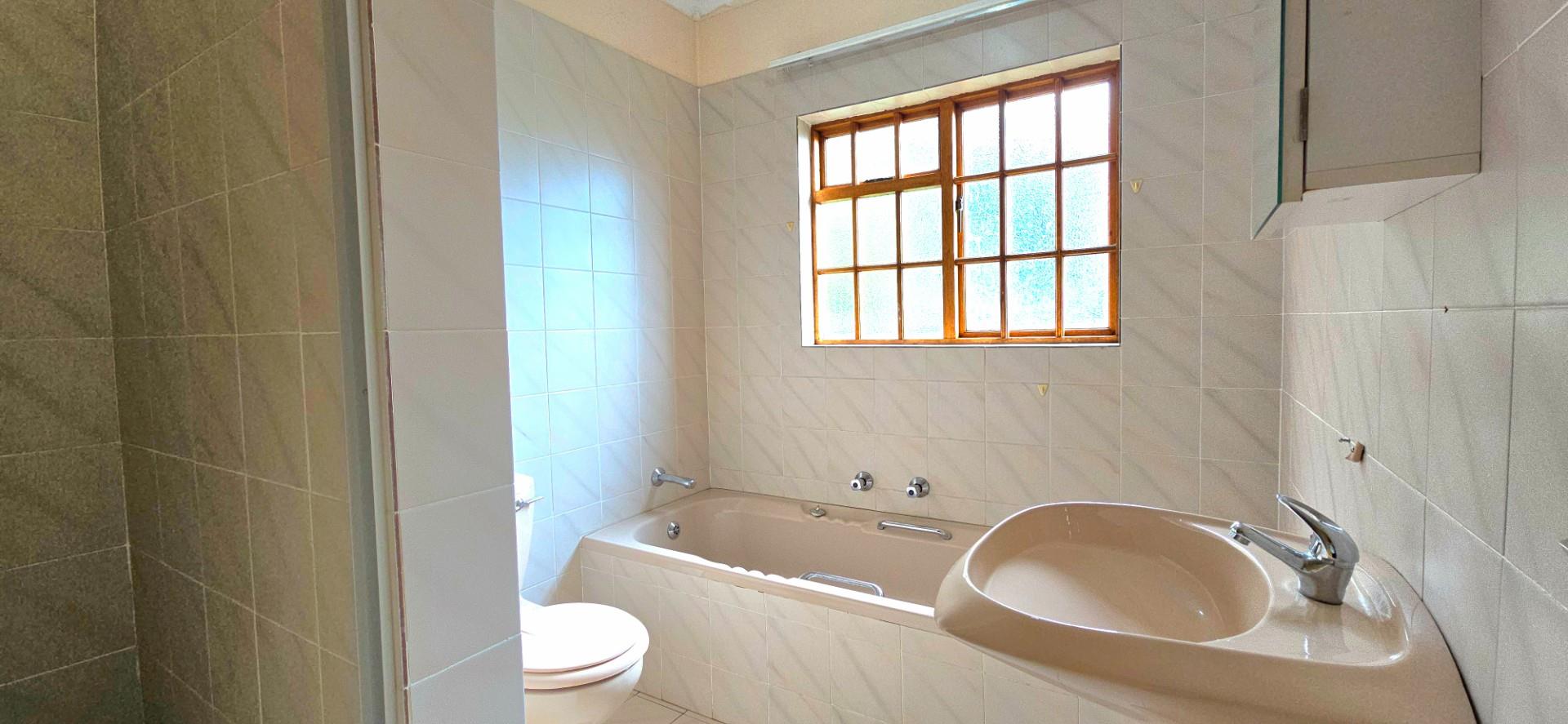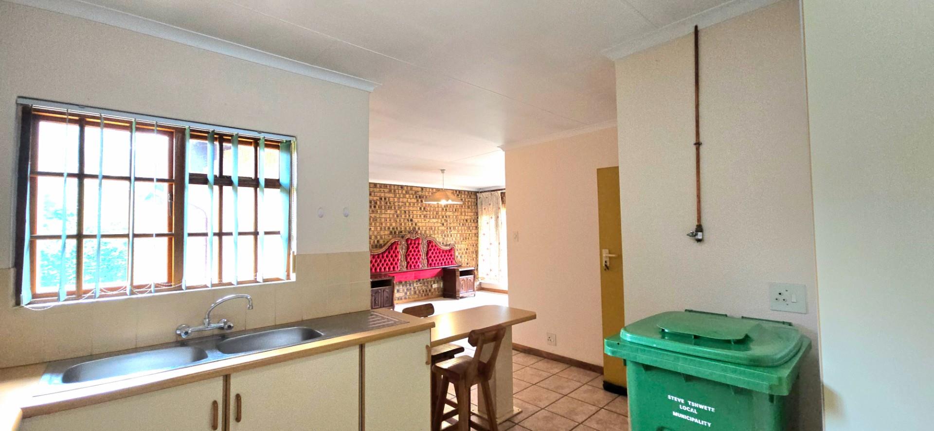 The kitchen is spacious and functional, offering white cupboards, polyform countertops, a glass-top hob, eye-level oven, ample cupboard space, a walk-in pantry, and a separate combined scullery and laundry area. The dining room opens via sliding doors to the patio, ideal for family meals and entertaining.
