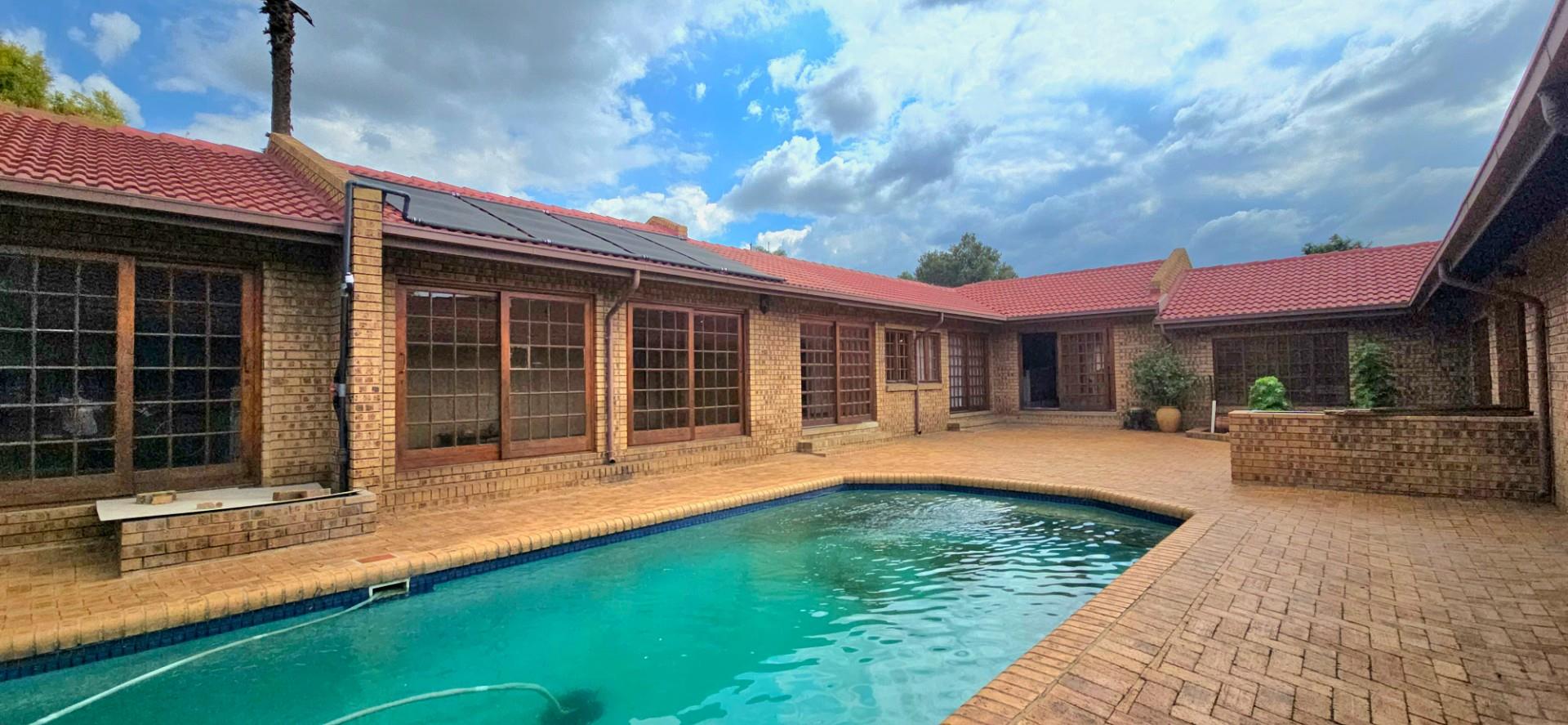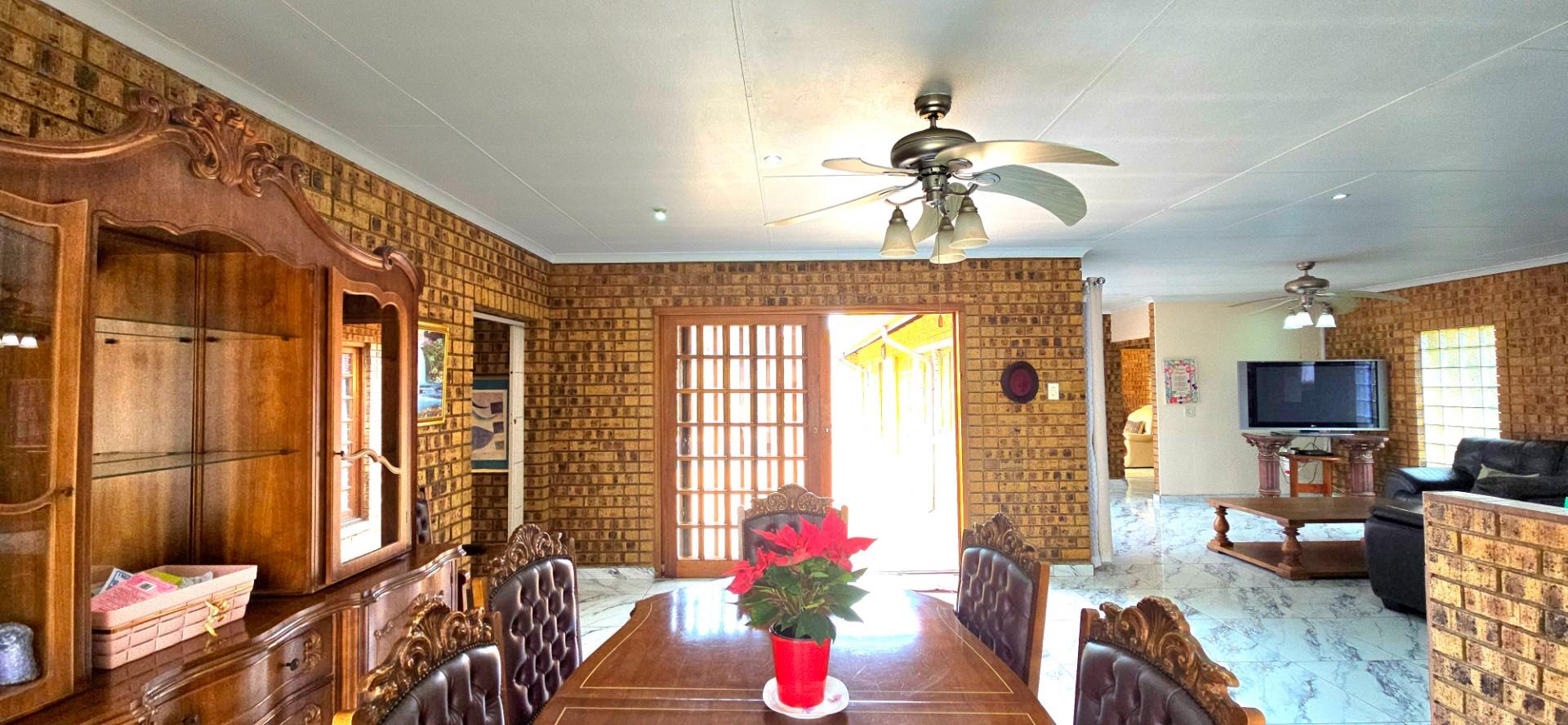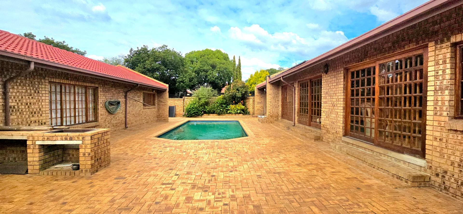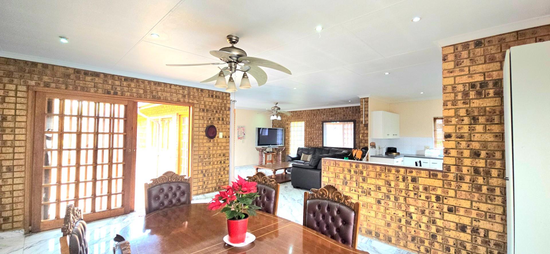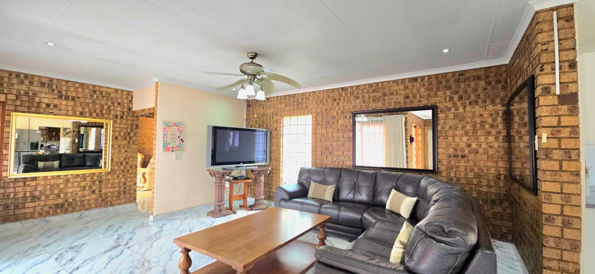 Inside, the home features multiple living areas designed for both everyday living and entertaining. The formal lounge and TV lounge are fitted with ceiling fans and boast sliding doors opening directly to the pool area, creating excellent indoor-outdoor flow. The swimming pool is solar-heated, fully paved, and complemented by a braai area, making it perfect for relaxed family time and hosting guests.