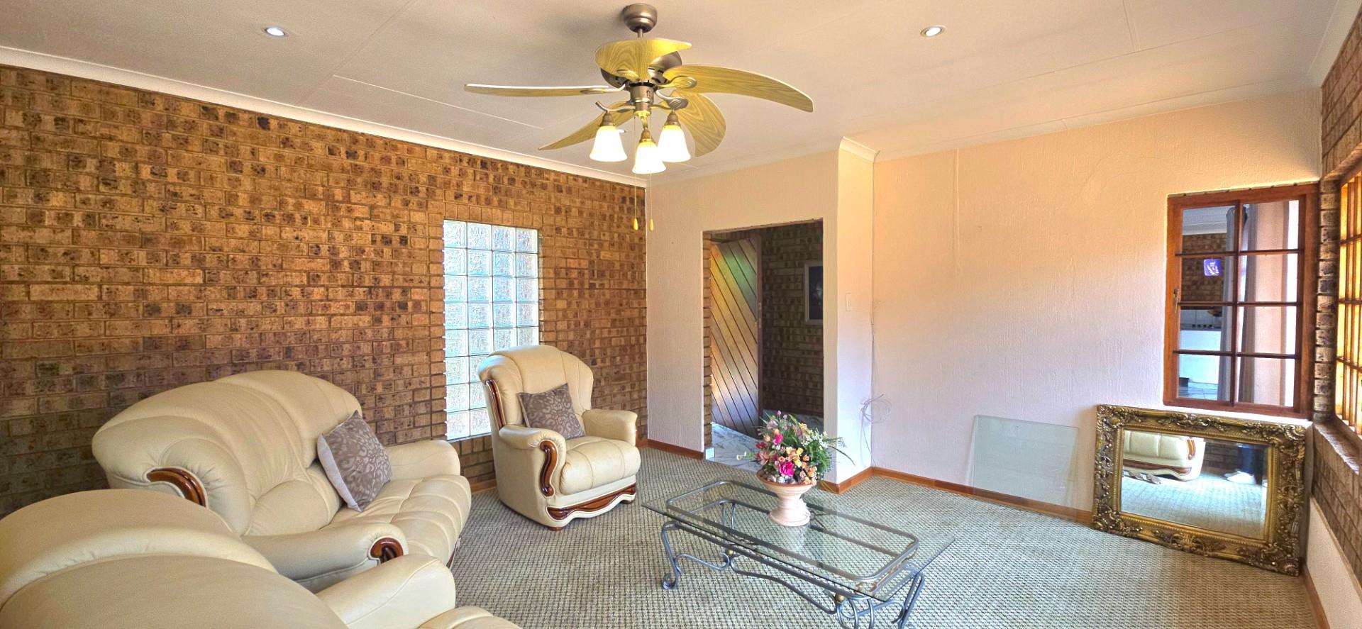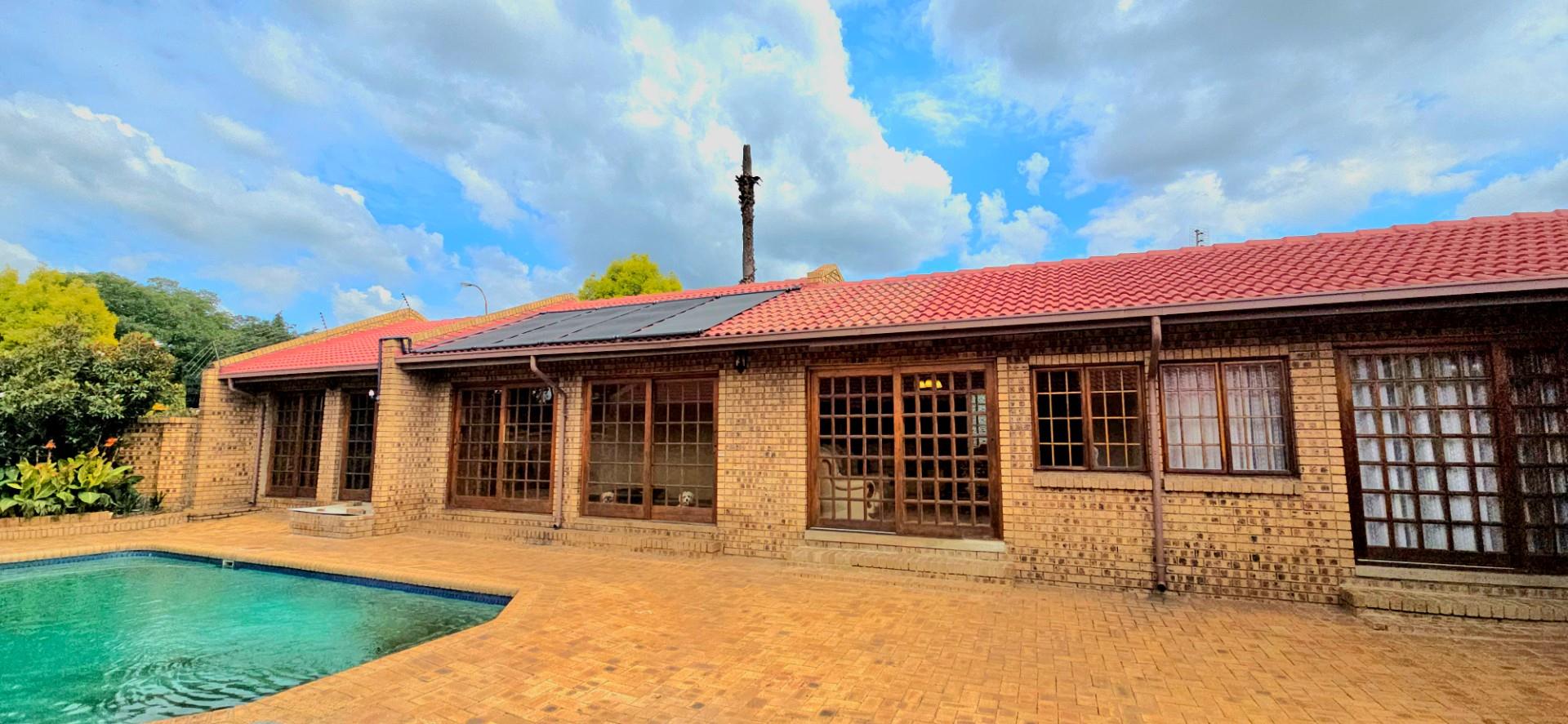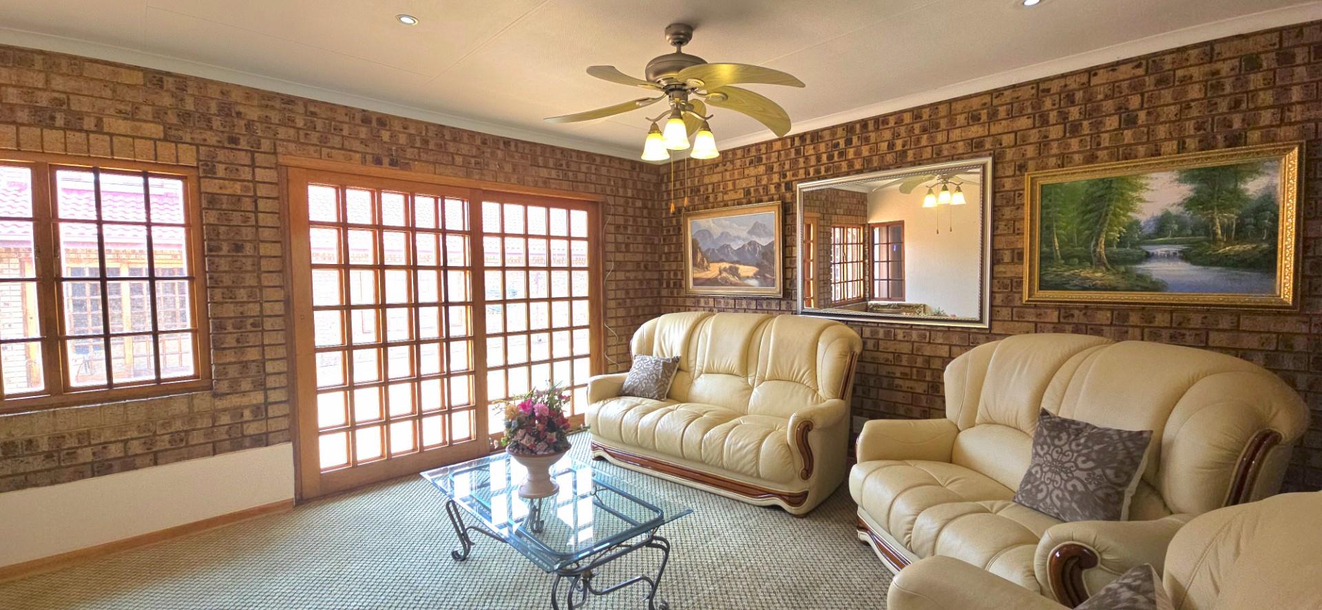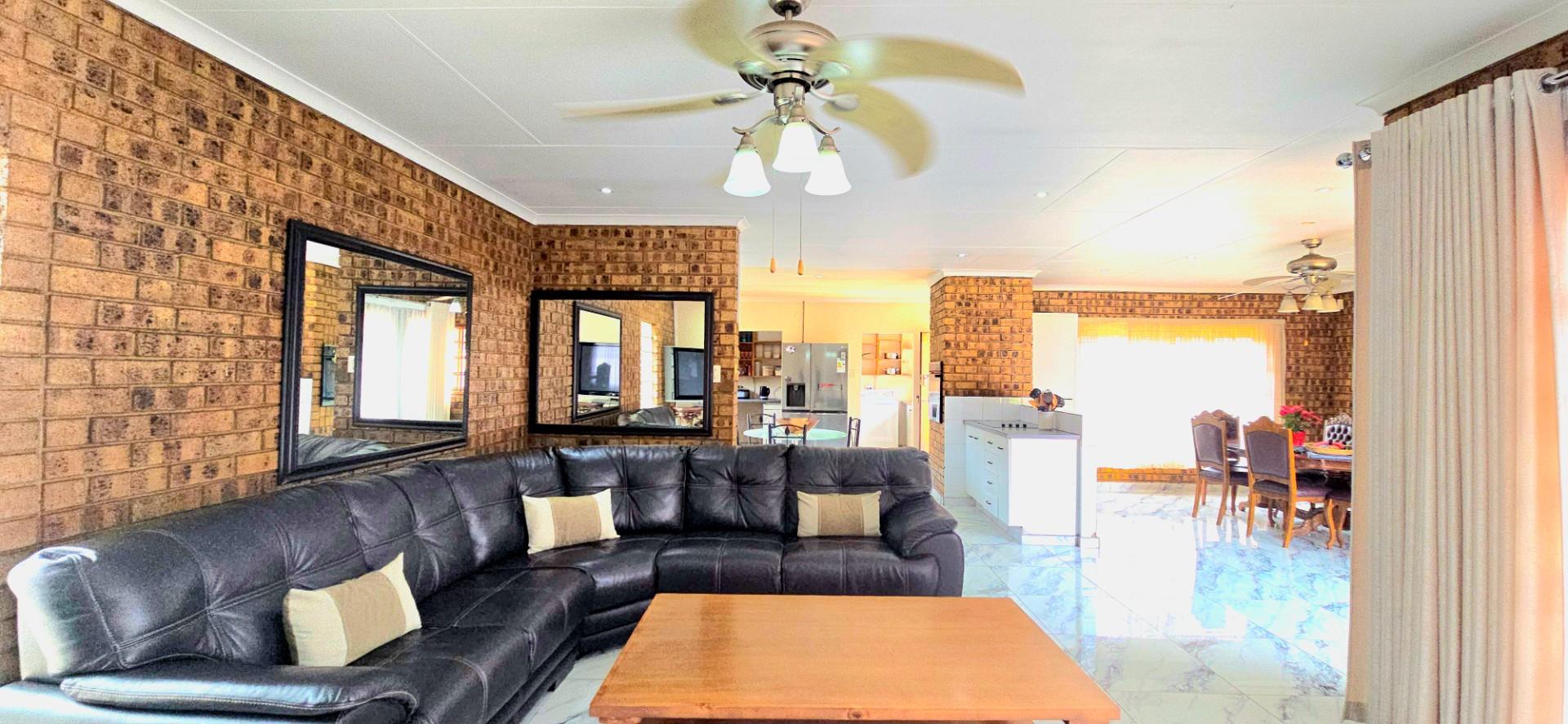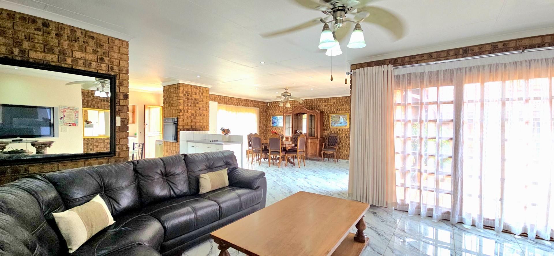 Inside, the home features multiple living areas designed for both everyday living and entertaining. The formal lounge and TV lounge are fitted with ceiling fans and boast sliding doors opening directly to the pool area, creating excellent indoor-outdoor flow. The swimming pool is solar-heated, fully paved, and complemented by a braai area, making it perfect for relaxed family time and hosting guests.