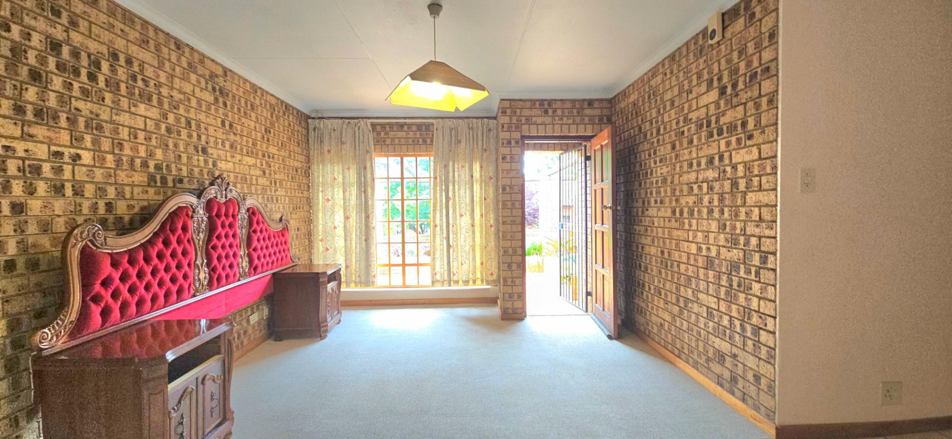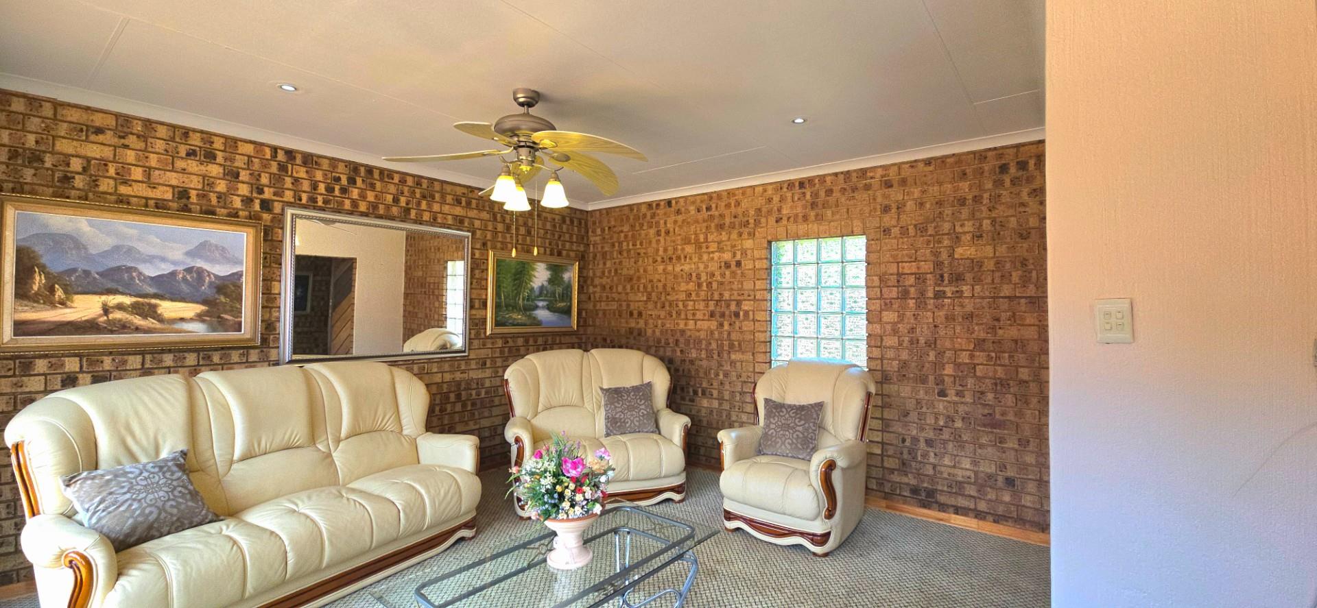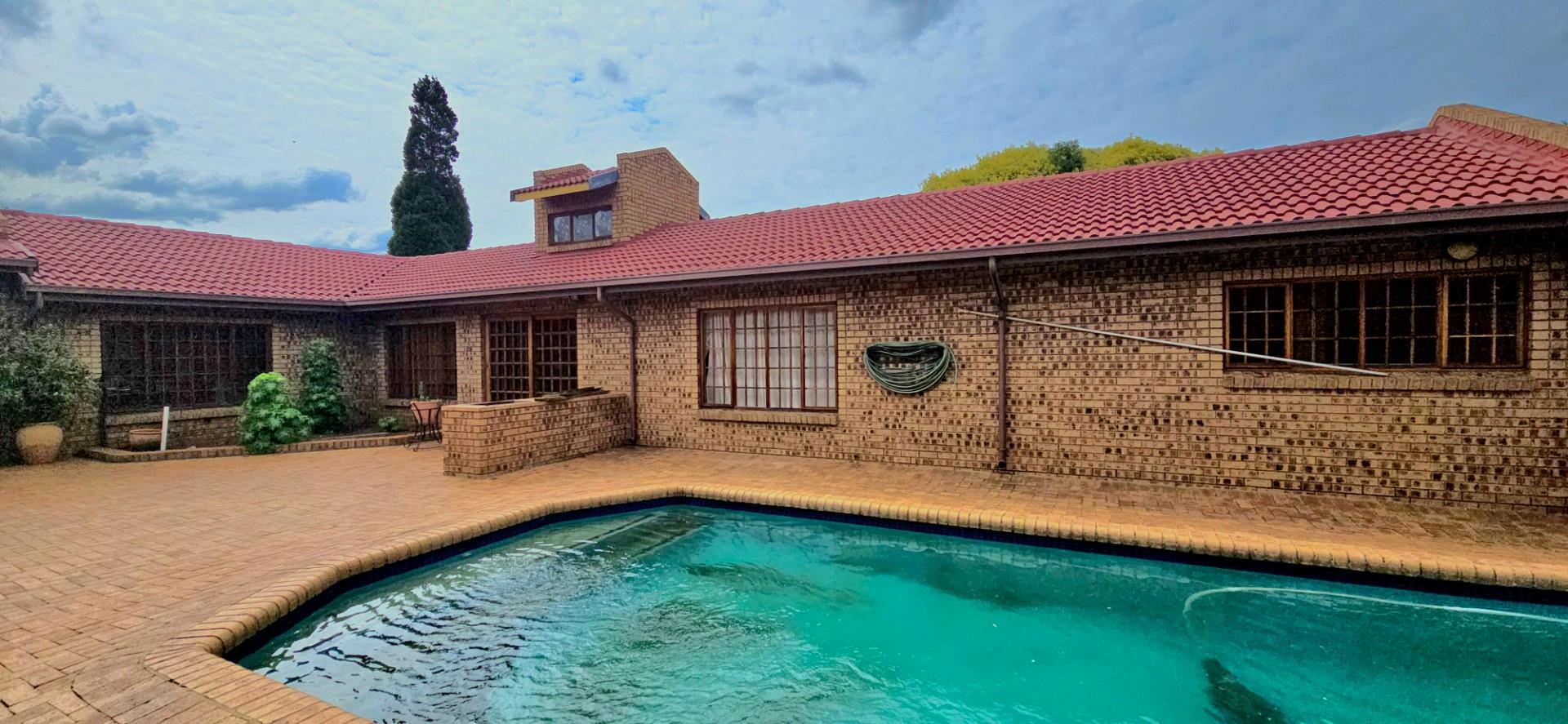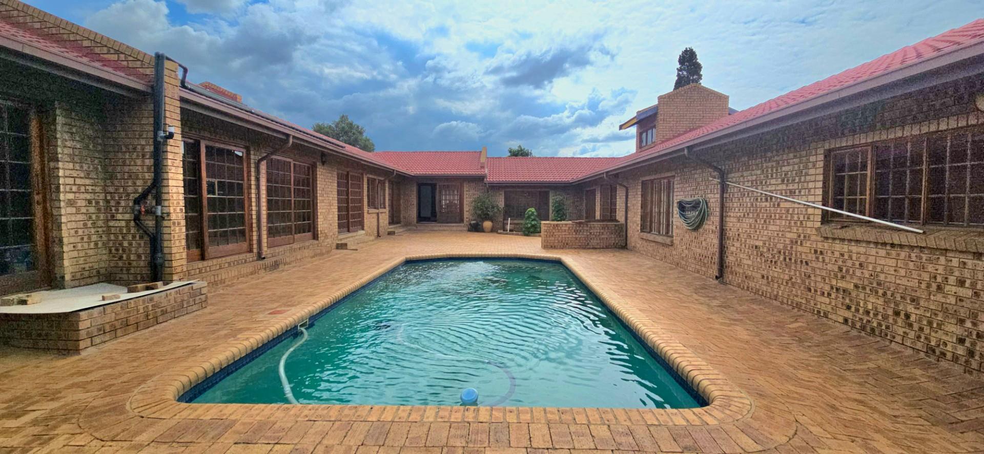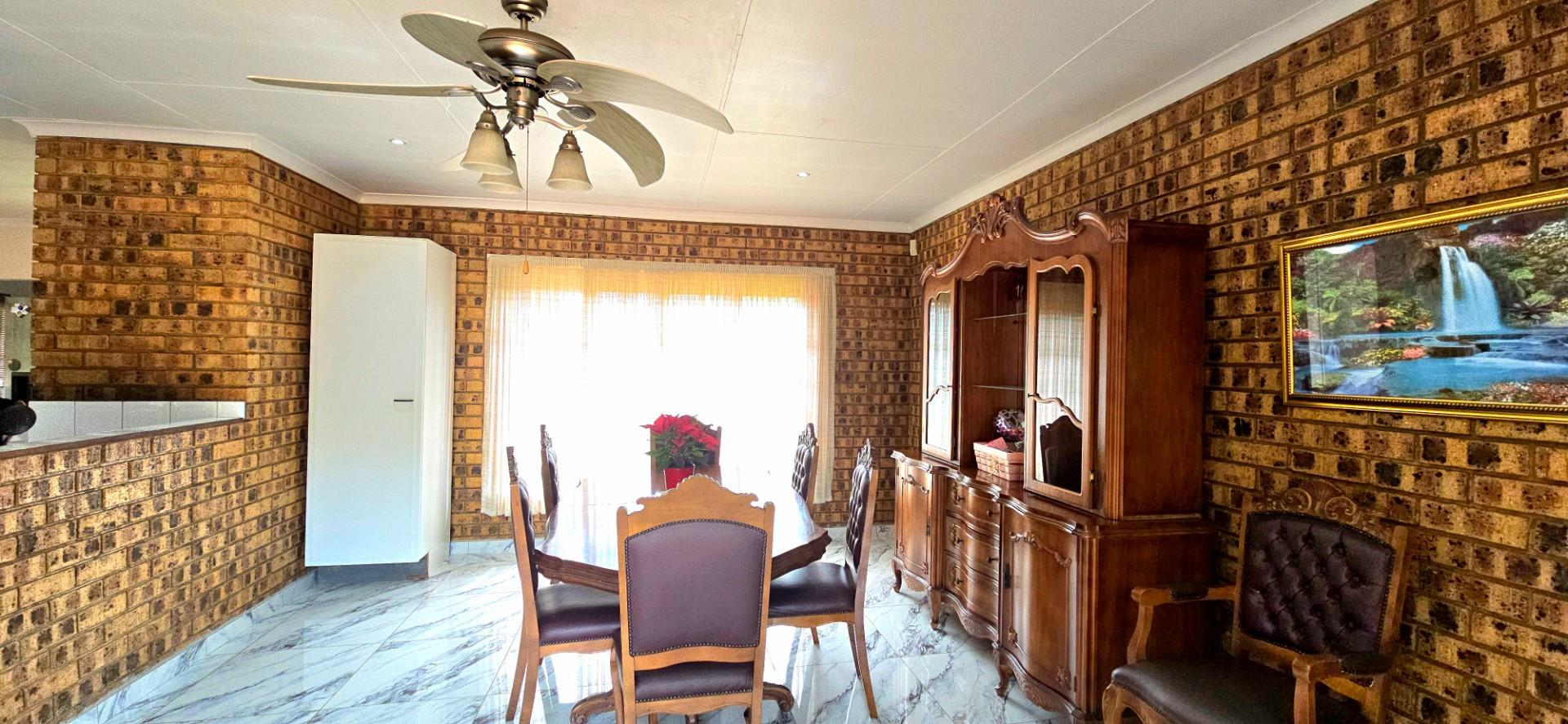 Inside, the home features multiple living areas designed for both everyday living and entertaining. The formal lounge and TV lounge are fitted with ceiling fans and boast sliding doors opening directly to the pool area, creating excellent indoor-outdoor flow. The swimming pool is solar-heated, fully paved, and complemented by a braai area, making it perfect for relaxed family time and hosting guests.