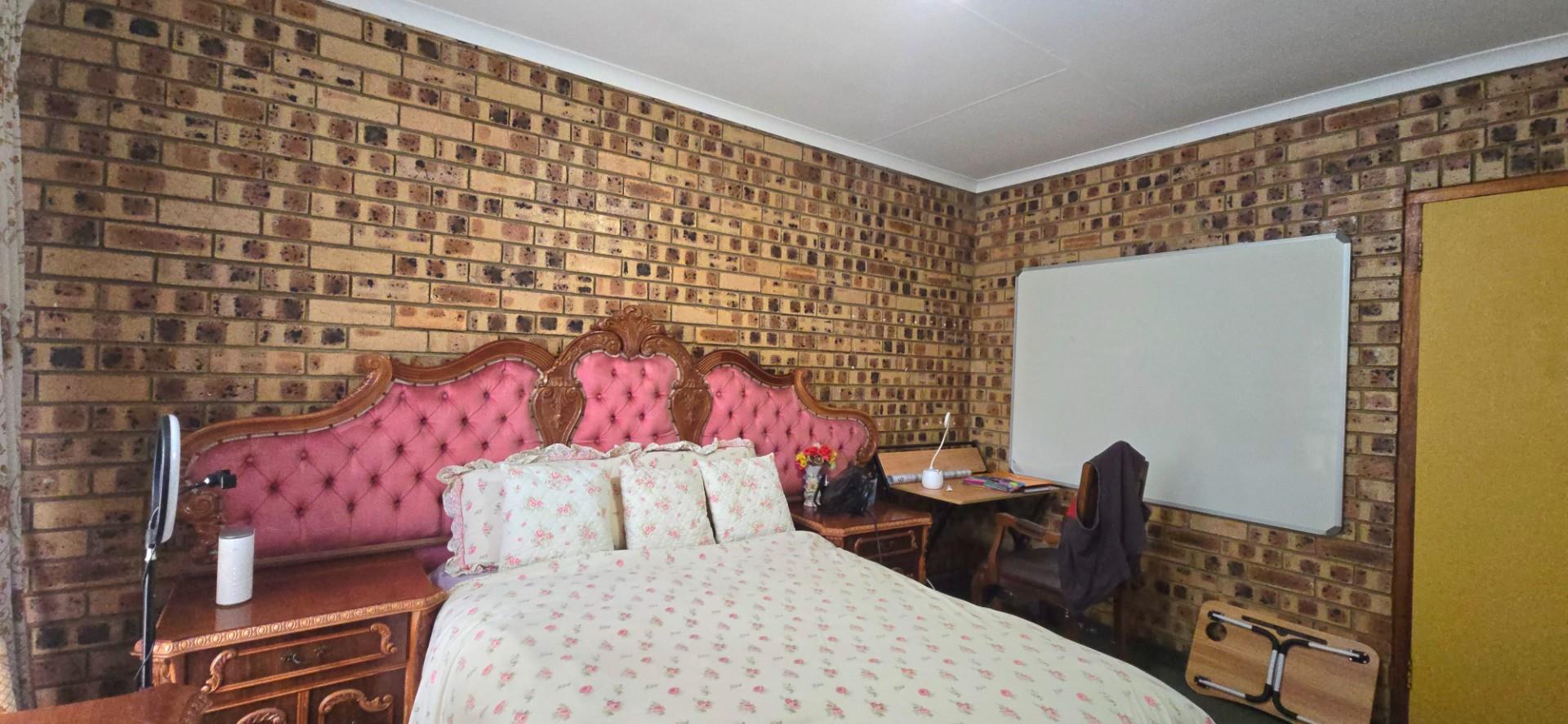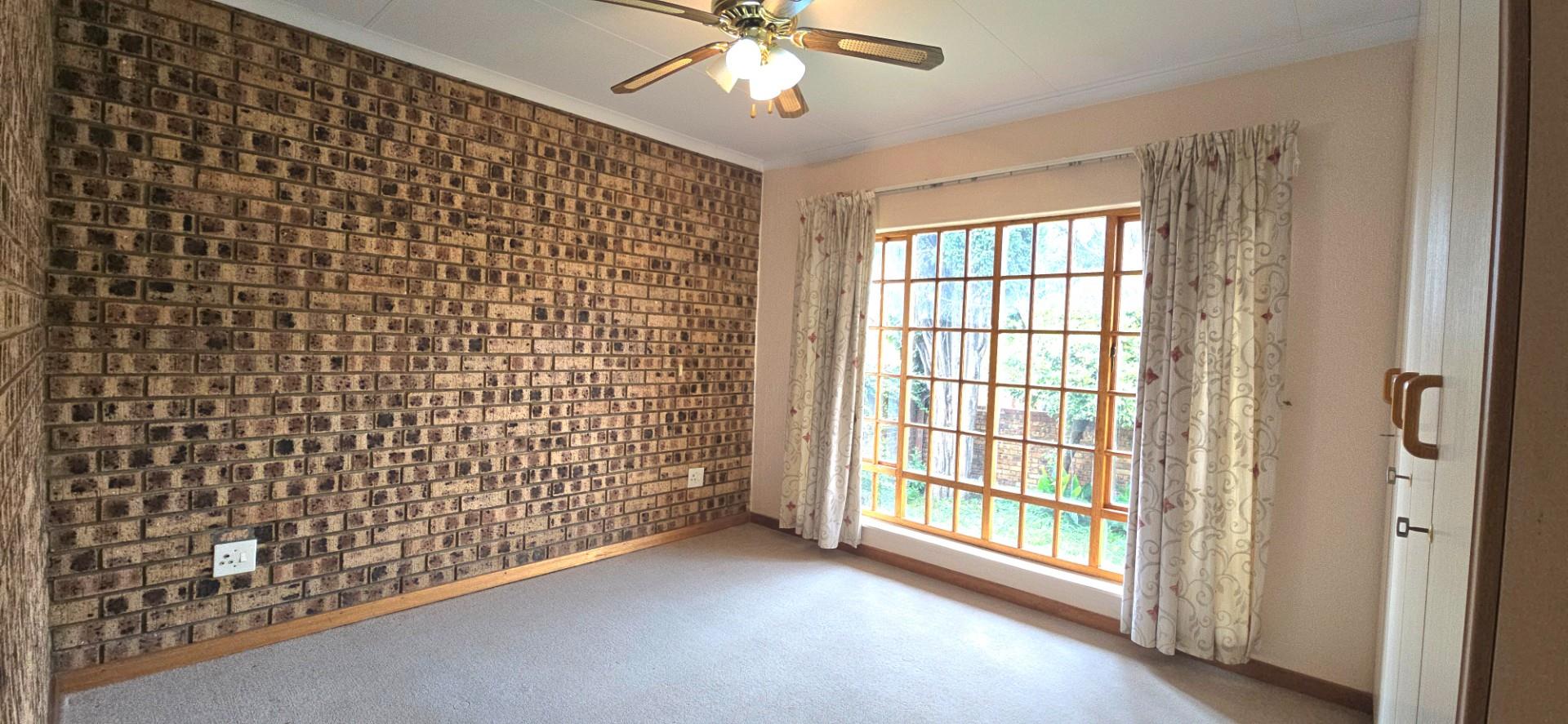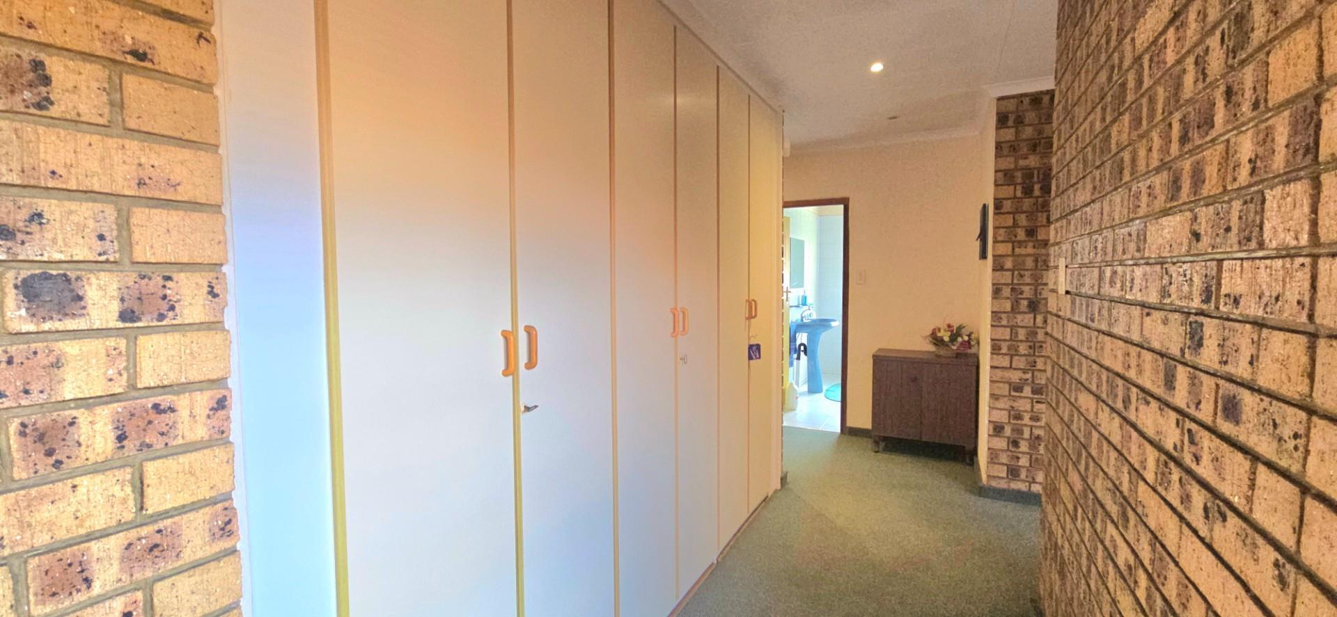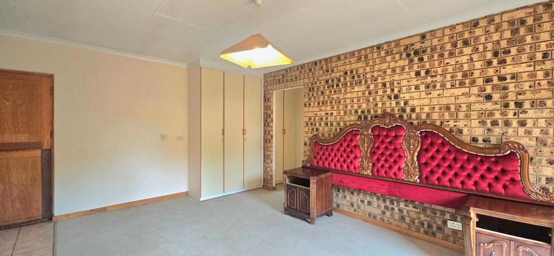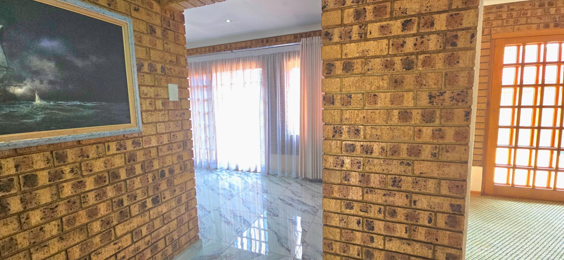 Inside, the home features multiple living areas designed for both everyday living and entertaining. The formal lounge and TV lounge are fitted with ceiling fans and boast sliding doors opening directly to the pool area, creating excellent indoor-outdoor flow. The swimming pool is solar-heated, fully paved, and complemented by a braai area, making it perfect for relaxed family time and hosting guests.
