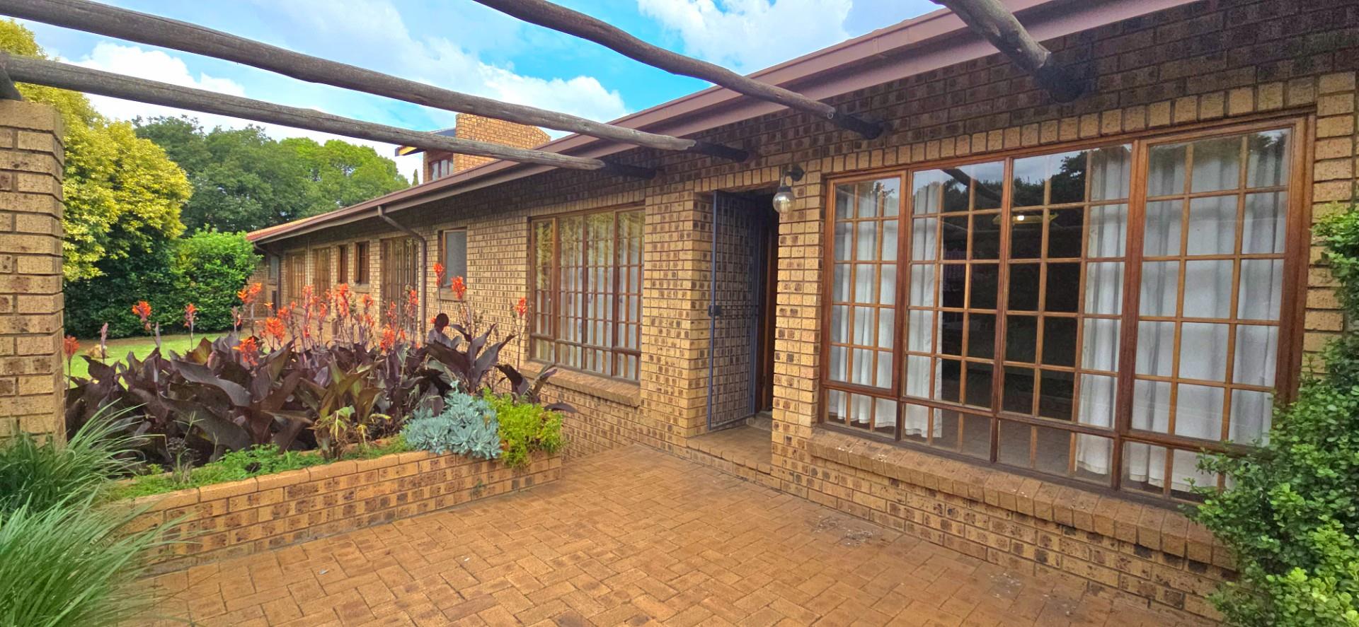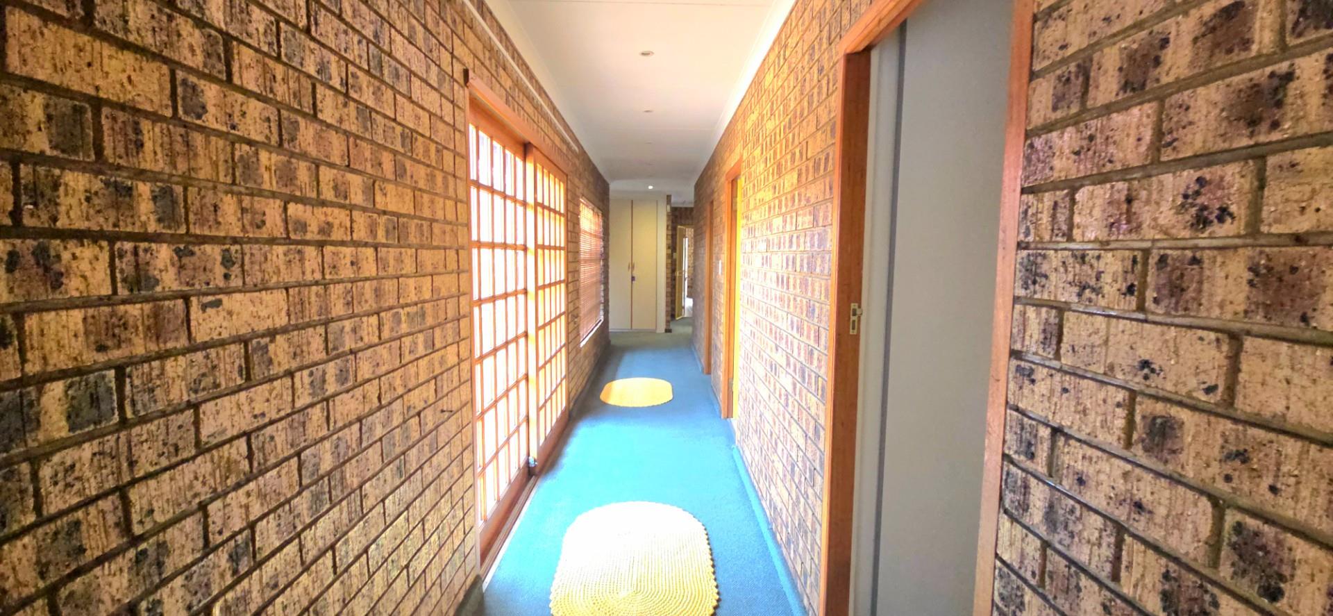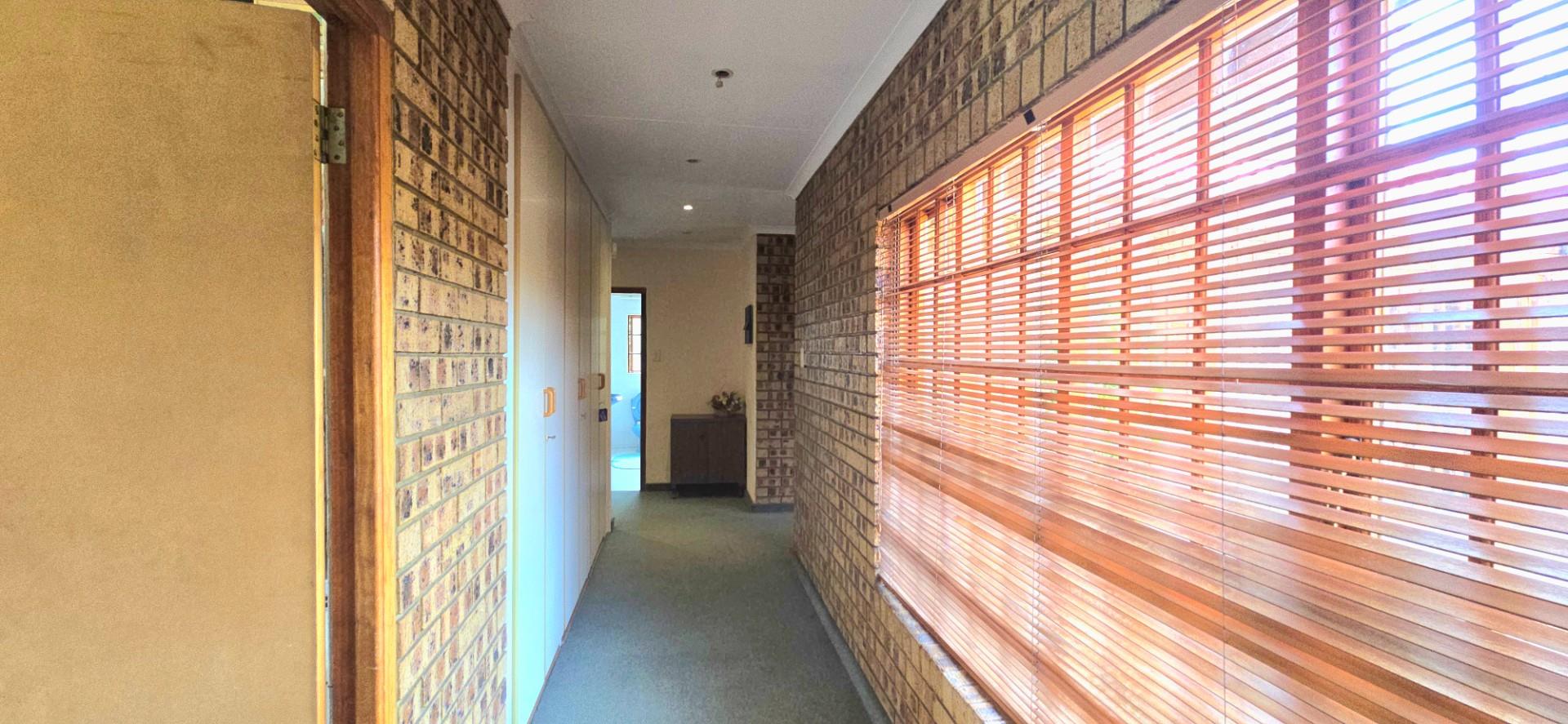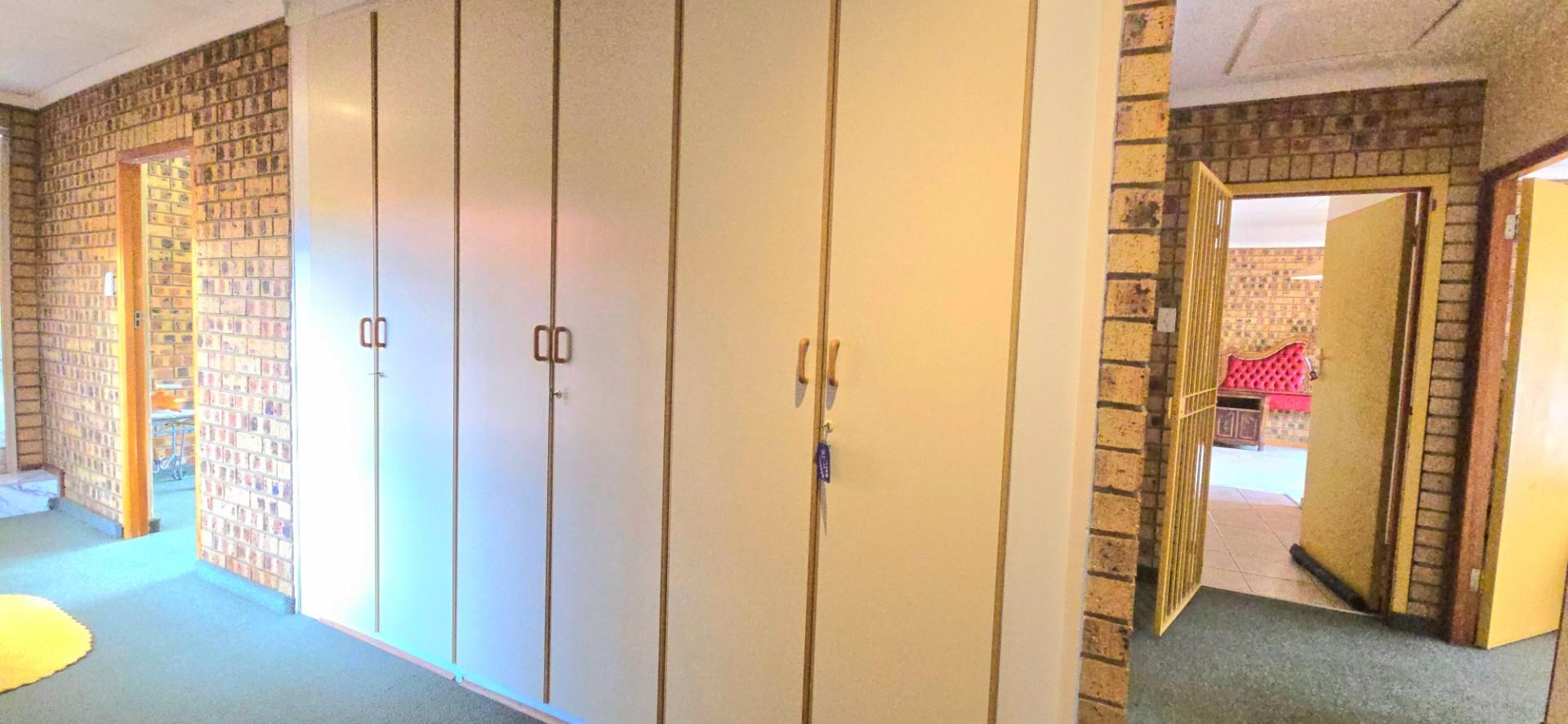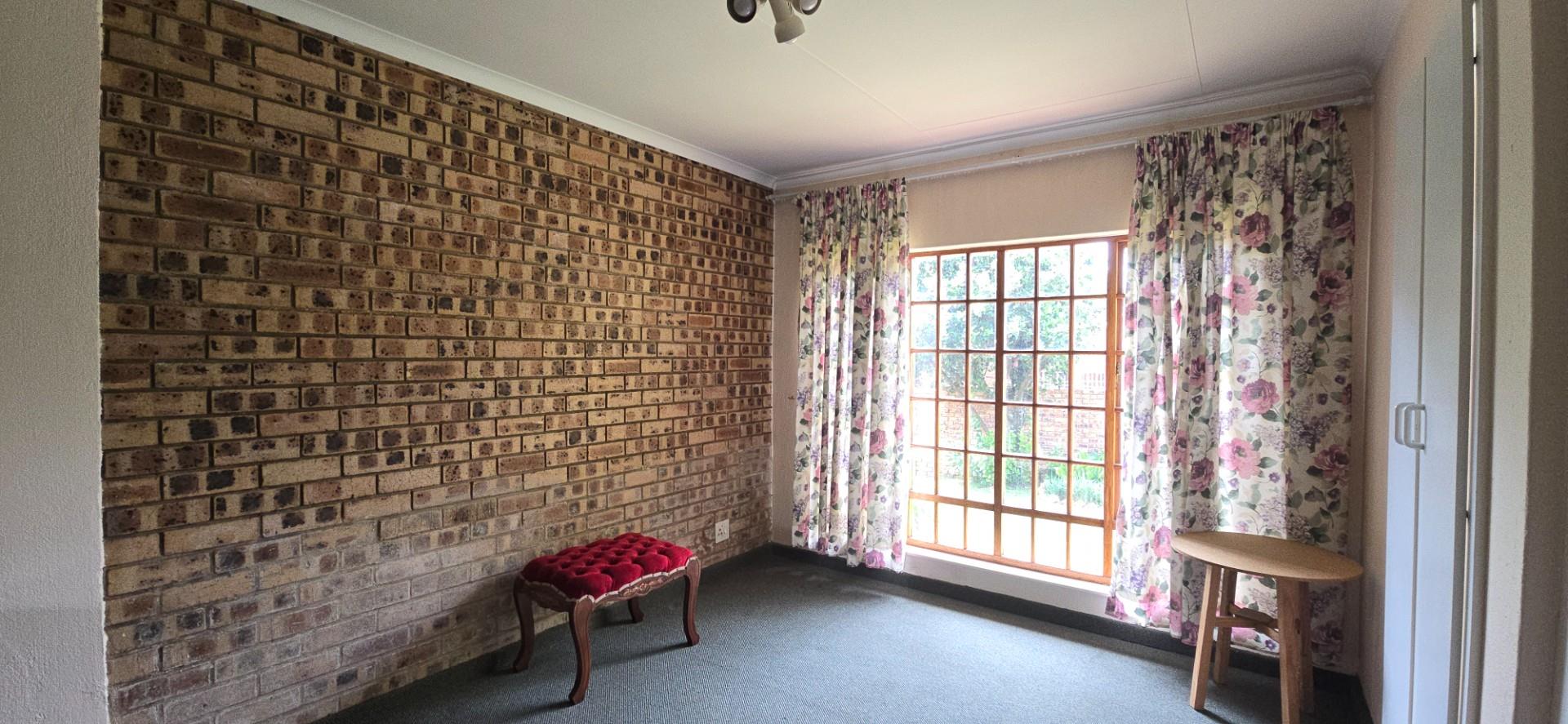 Inside, the home features multiple living areas designed for both everyday living and entertaining. The formal lounge and TV lounge are fitted with ceiling fans and boast sliding doors opening directly to the pool area, creating excellent indoor-outdoor flow. The swimming pool is solar-heated, fully paved, and complemented by a braai area, making it perfect for relaxed family time and hosting guests.
