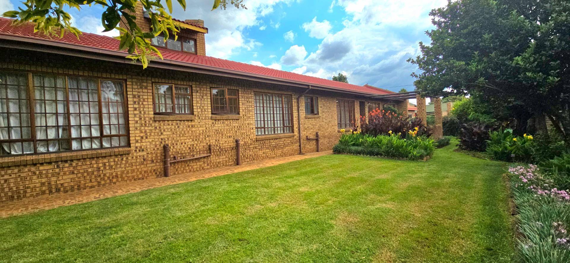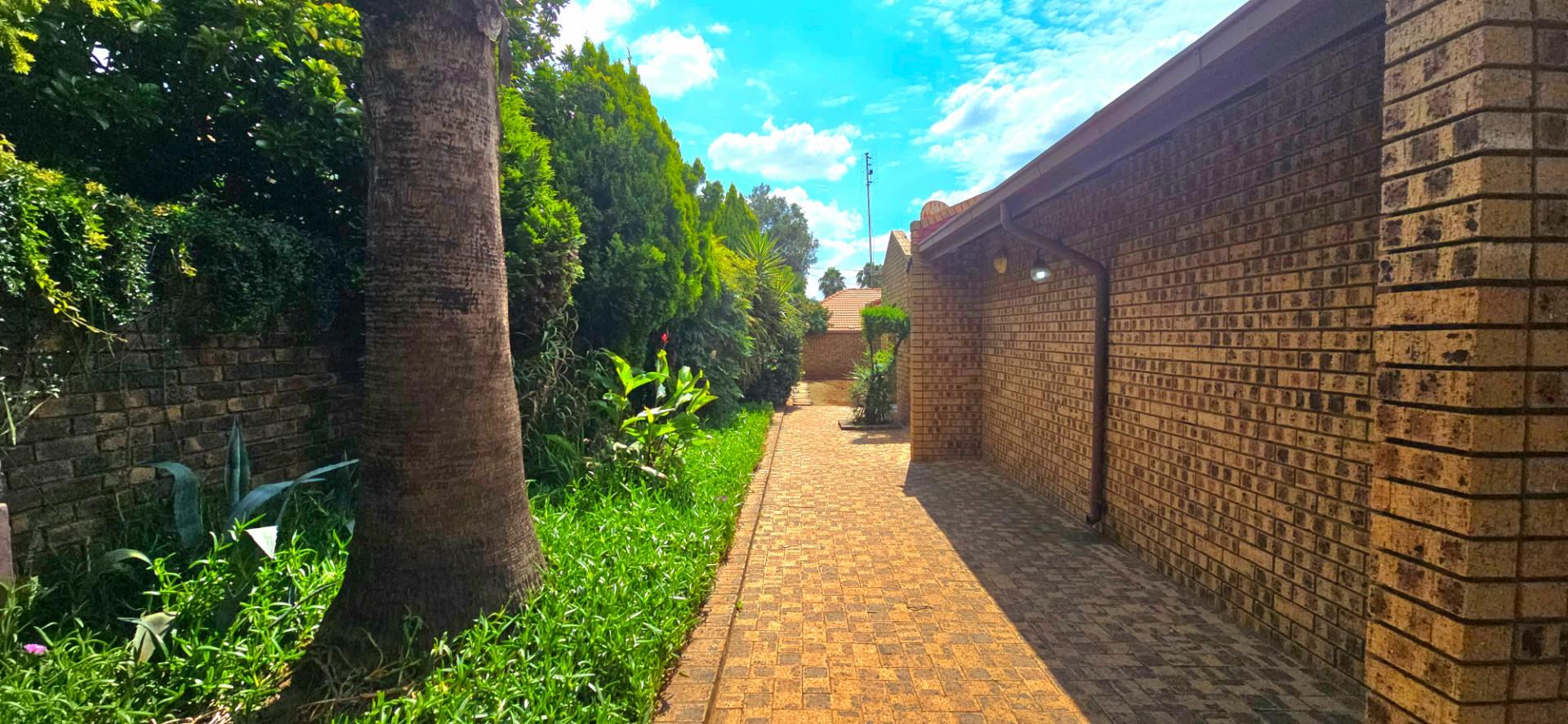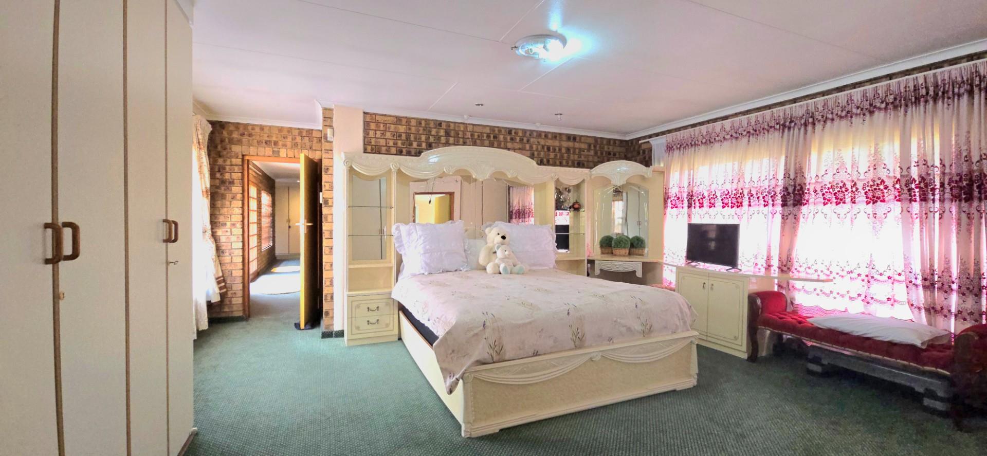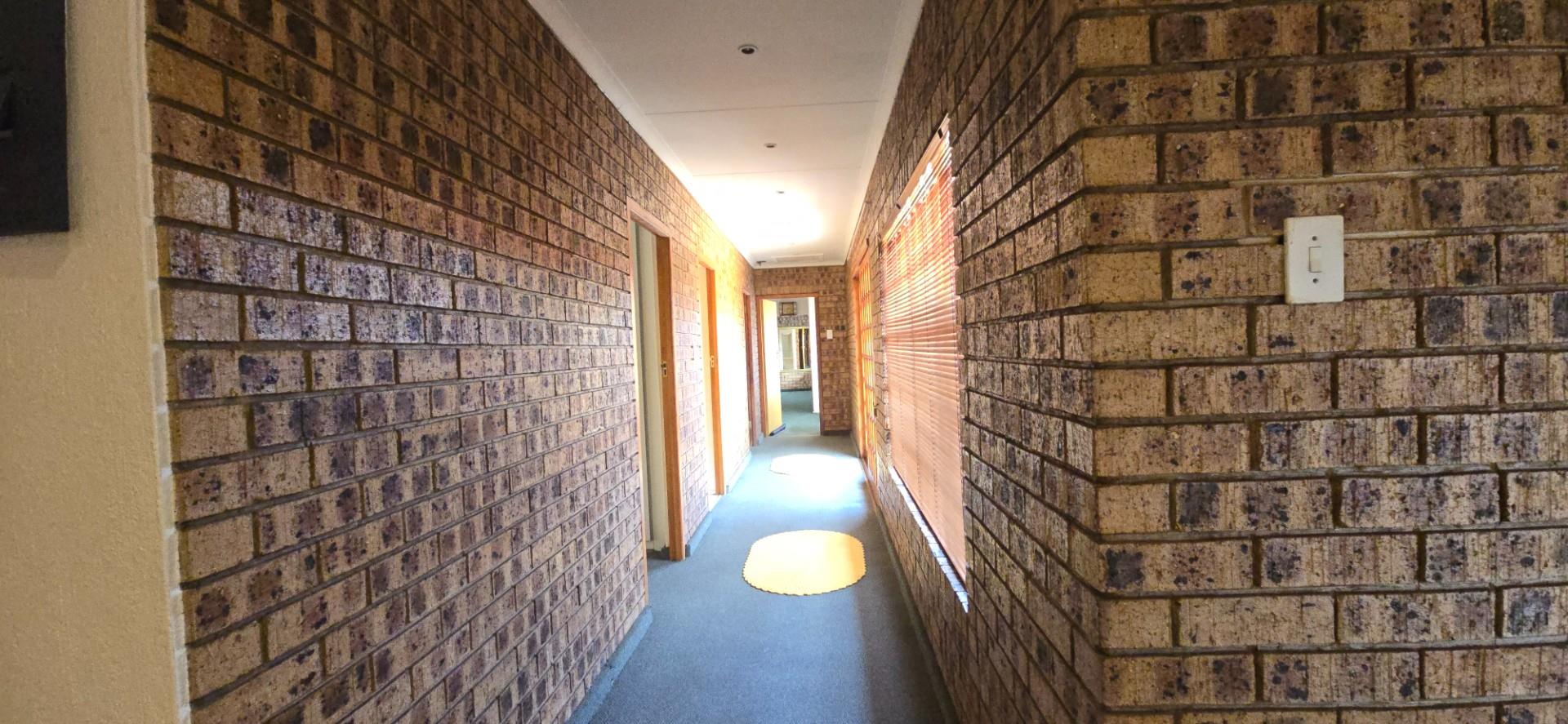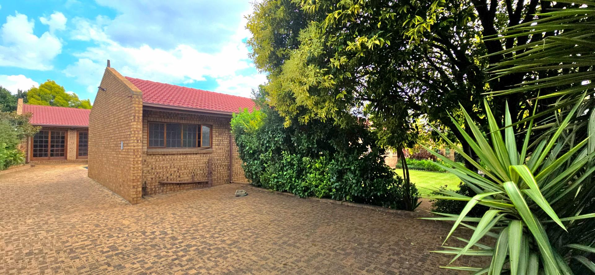 Inside, the home features multiple living areas designed for both everyday living and entertaining. The formal lounge and TV lounge are fitted with ceiling fans and boast sliding doors opening directly to the pool area, creating excellent indoor-outdoor flow. The swimming pool is solar-heated, fully paved, and complemented by a braai area, making it perfect for relaxed family time and hosting guests.