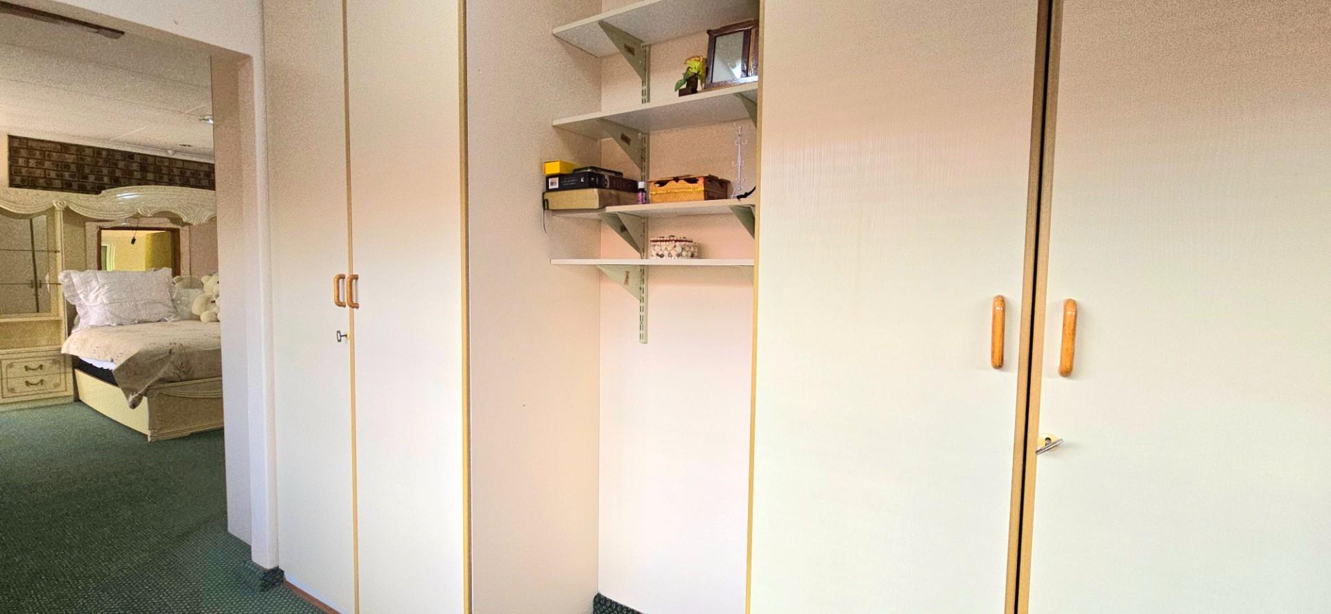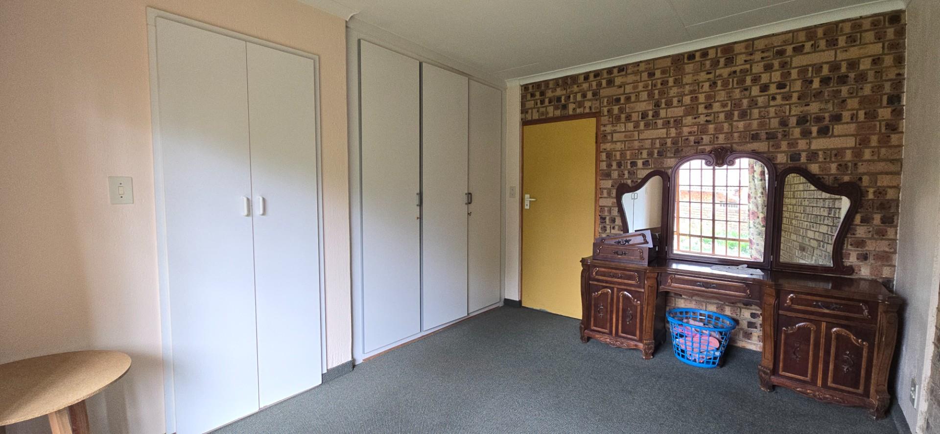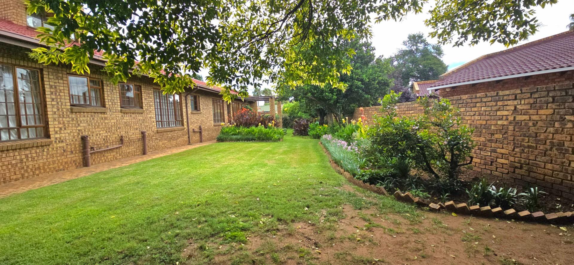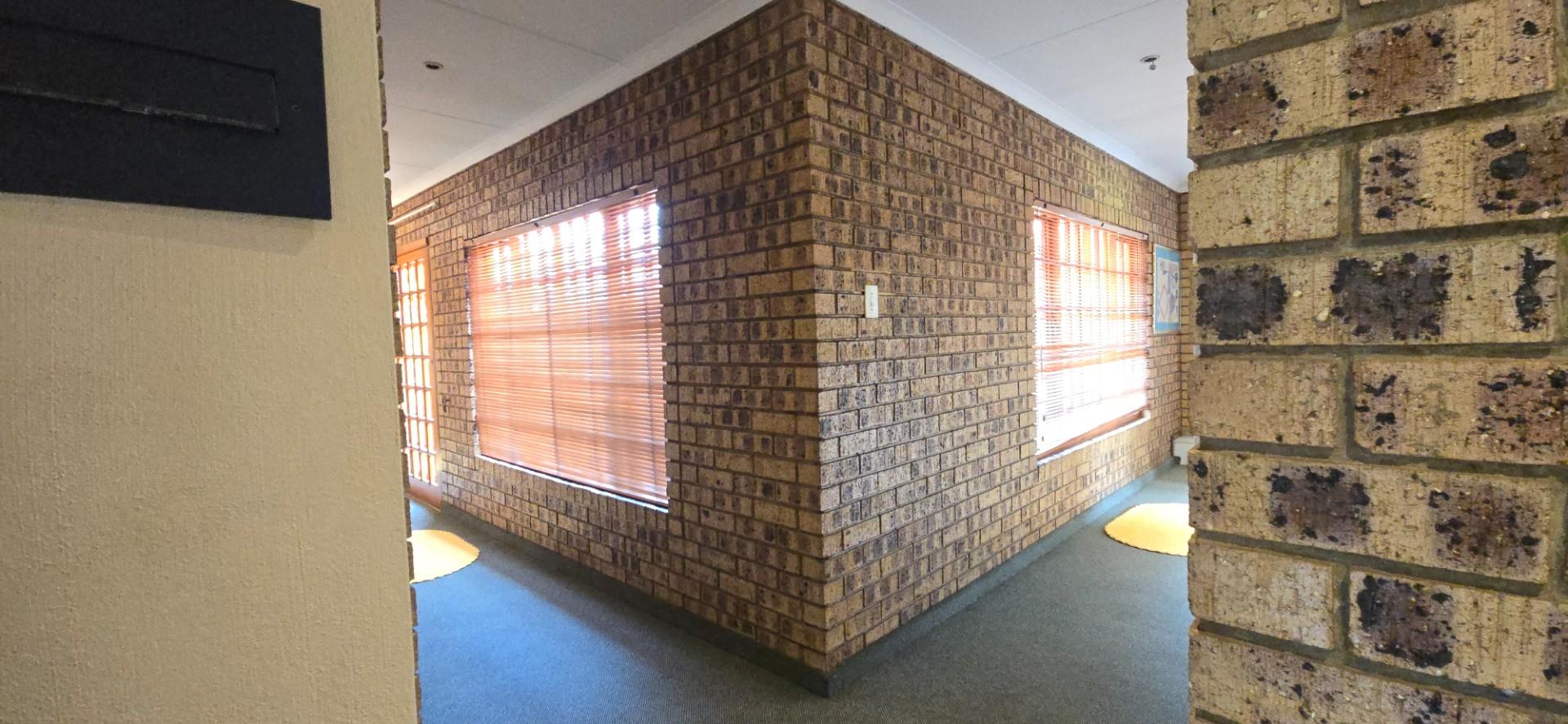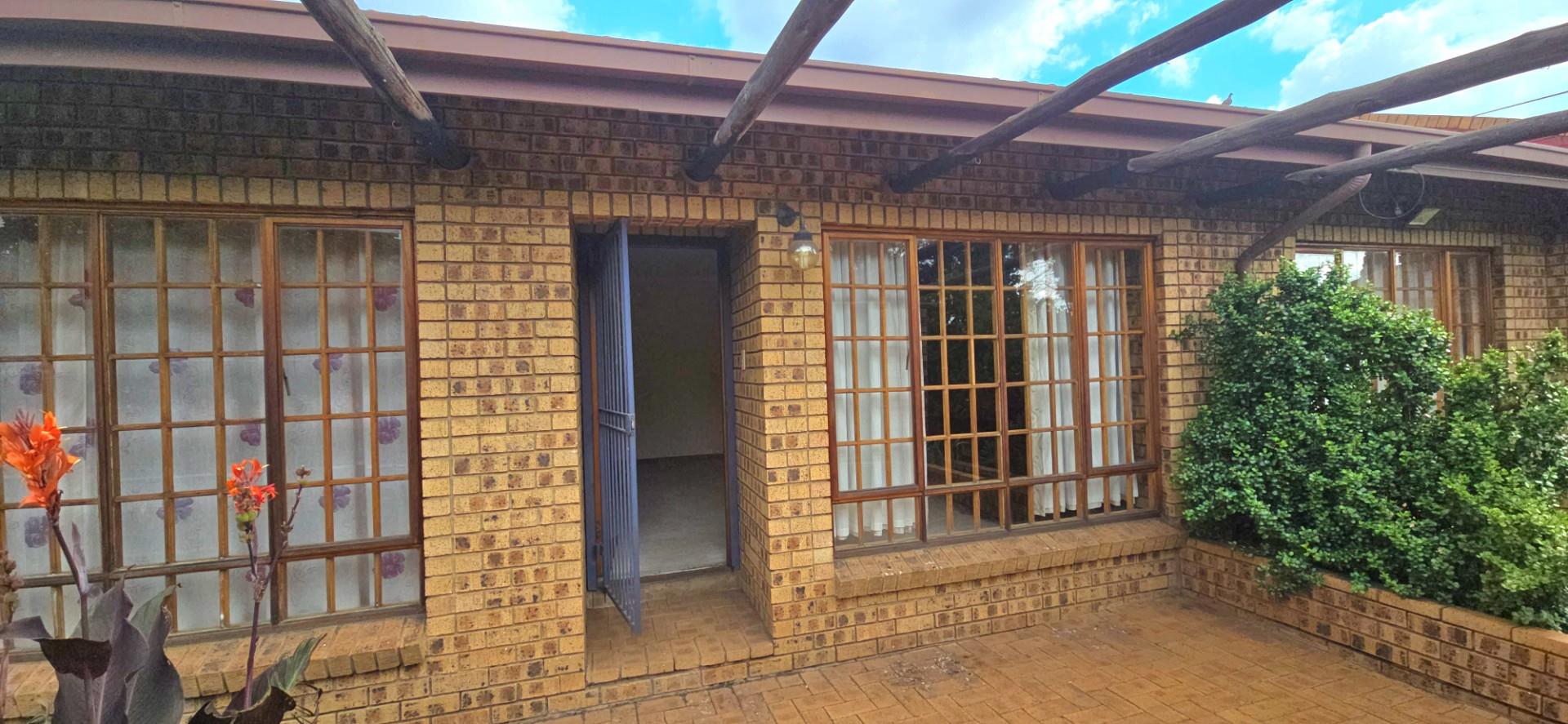 Inside, the home features multiple living areas designed for both everyday living and entertaining. The formal lounge and TV lounge are fitted with ceiling fans and boast sliding doors opening directly to the pool area, creating excellent indoor-outdoor flow. The swimming pool is solar-heated, fully paved, and complemented by a braai area, making it perfect for relaxed family time and hosting guests.