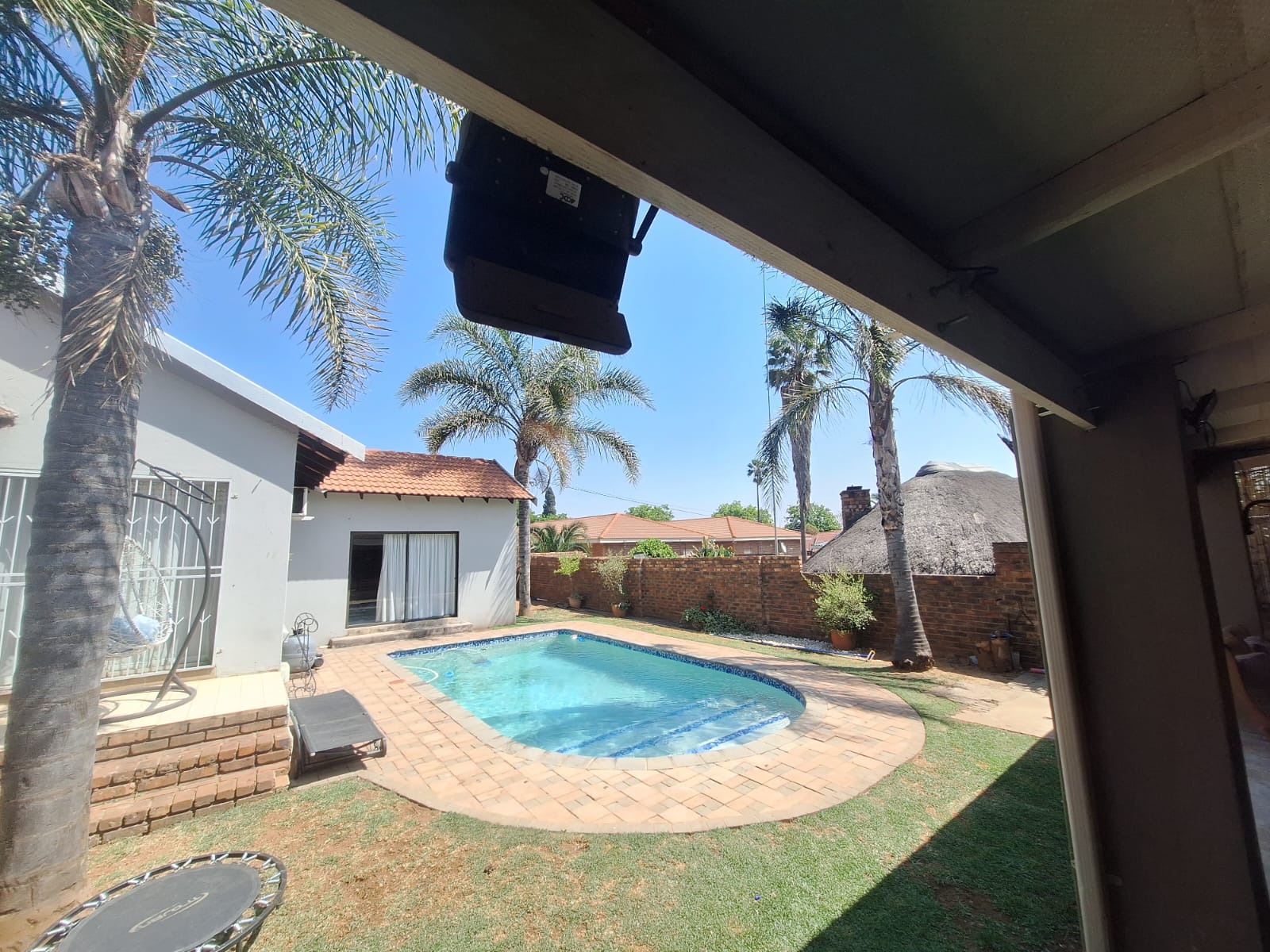 The modern kitchen features granite tops, gas stove, walk-in pantry, scullery, and ample storage. Four bedrooms with built-ins are serviced by two full bathrooms, while the master suite includes a pajama lounge and sliding doors to the pool. The en-suite is unfinished, giving buyers the chance to add their own style.