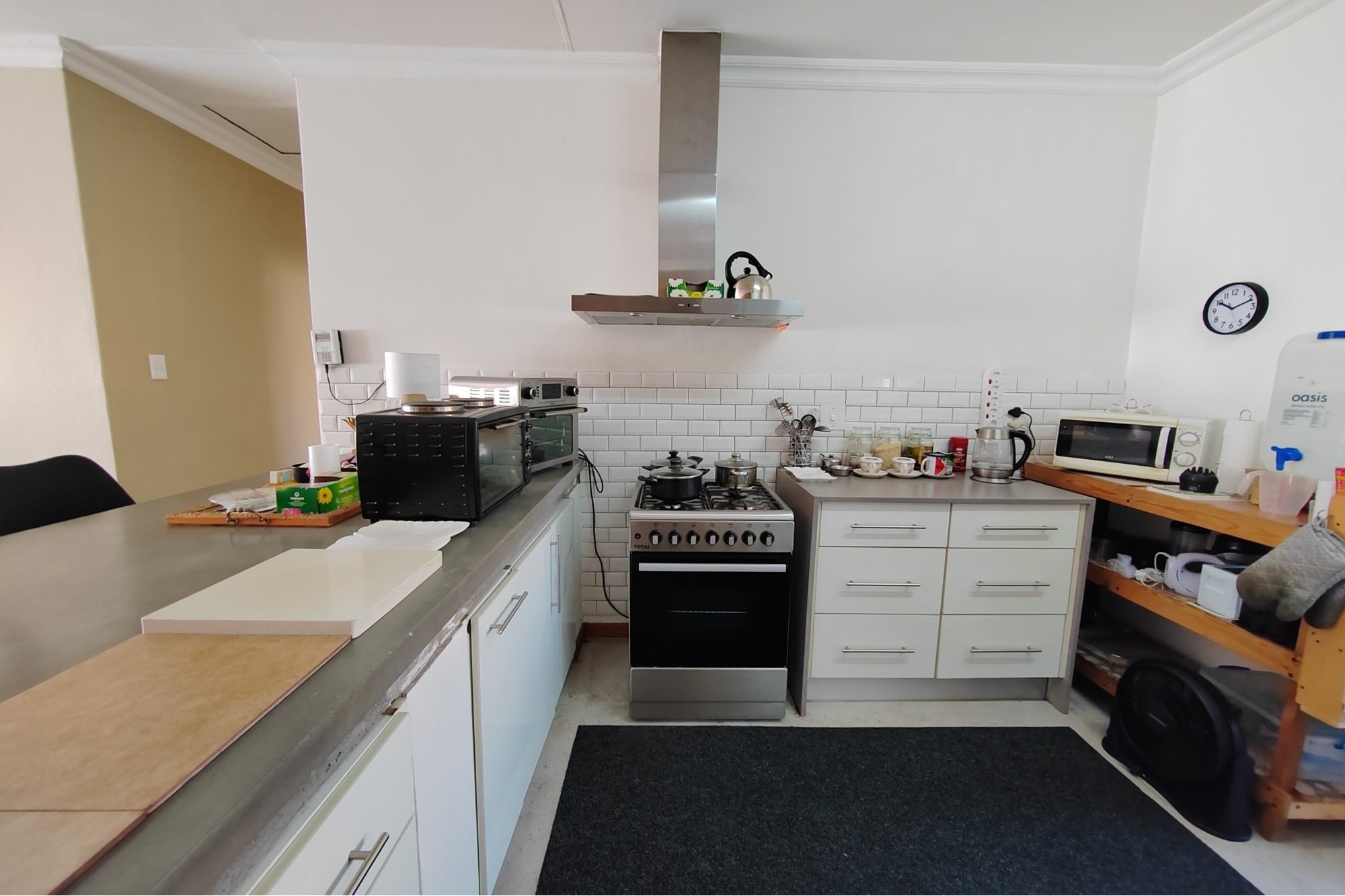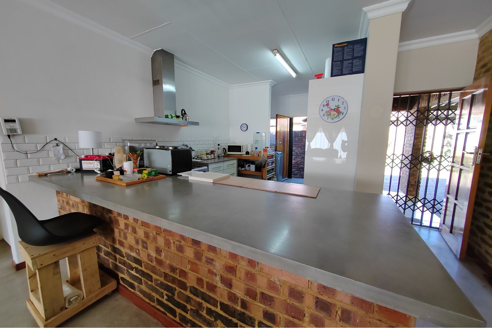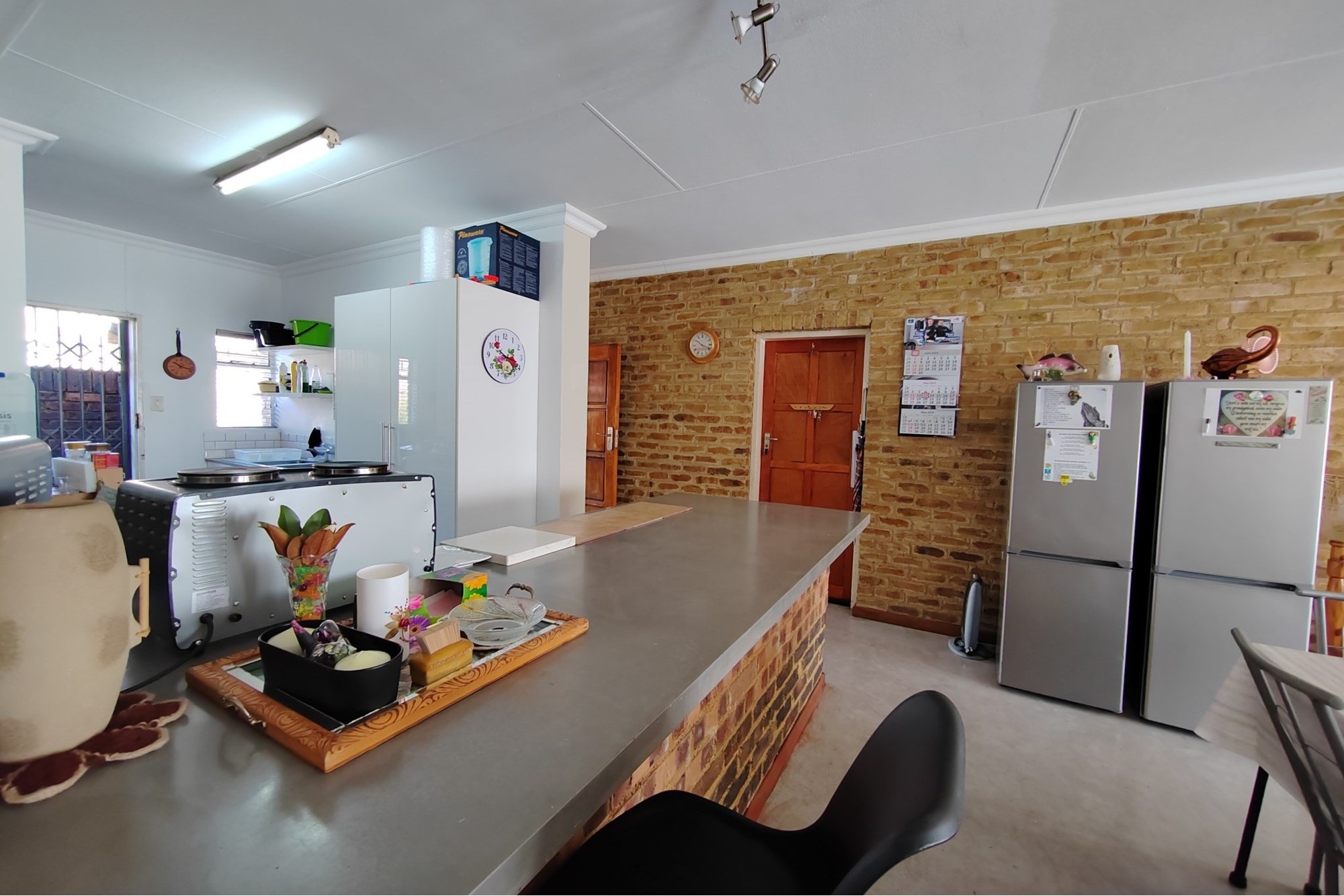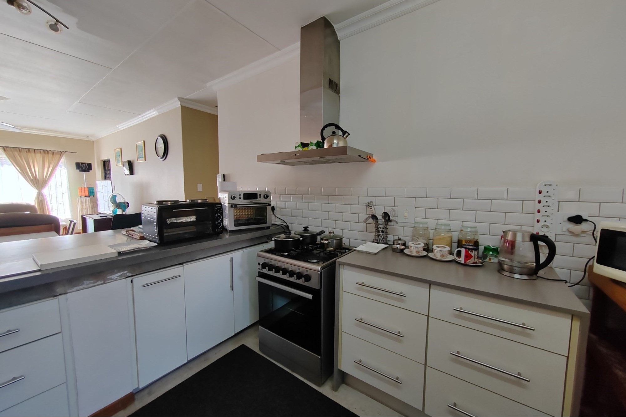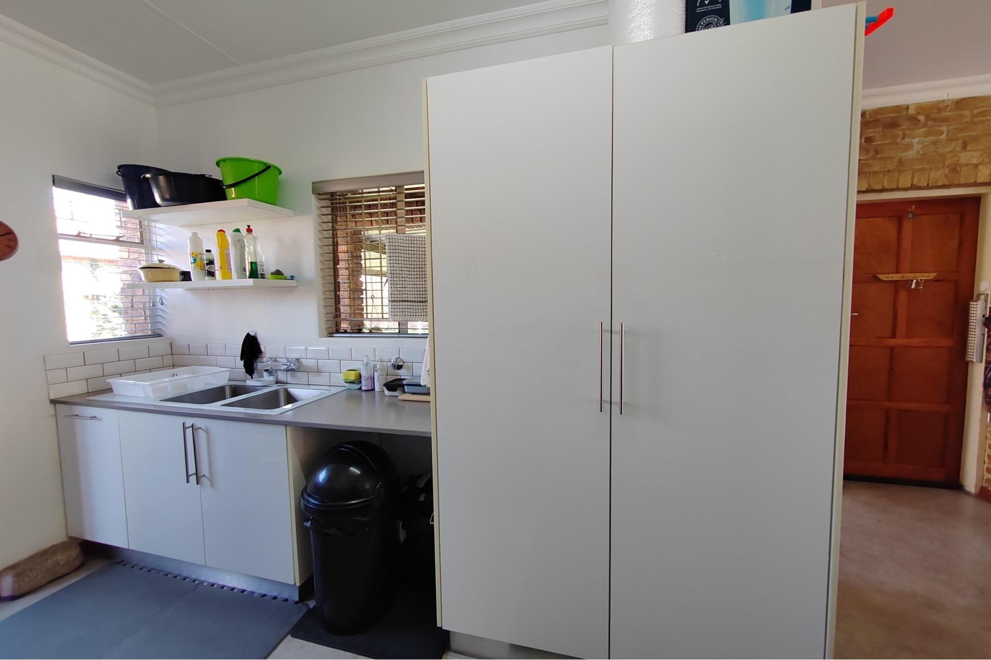 The kitchen has modern white cupboards with a gas stove, scullery and laundry that leads to a court yard. The living area is open plan with a breakfast nook and leads to an open patio where you can have a braai. The double garage has manual garage doors with covered parking in front of the garage.