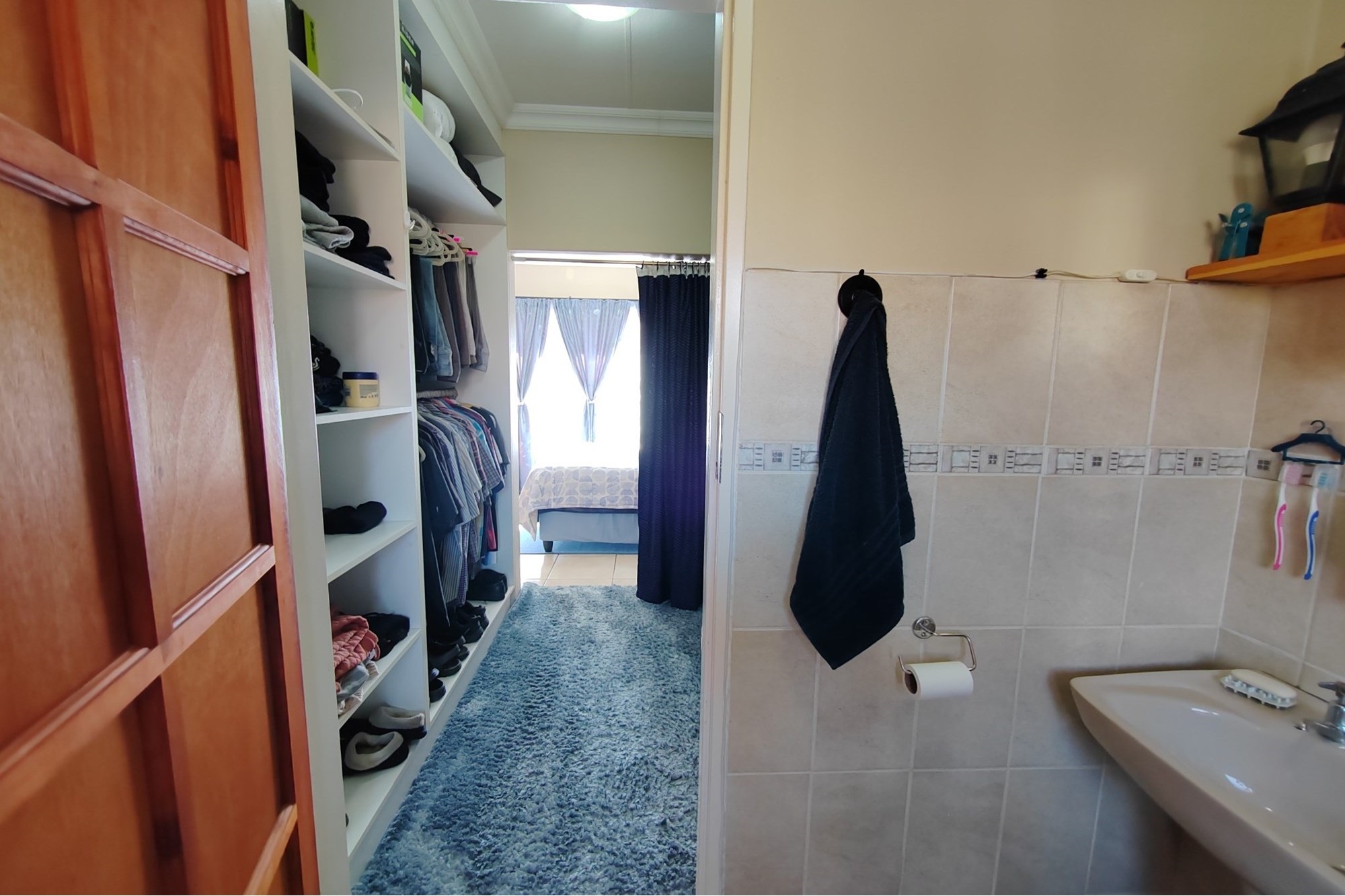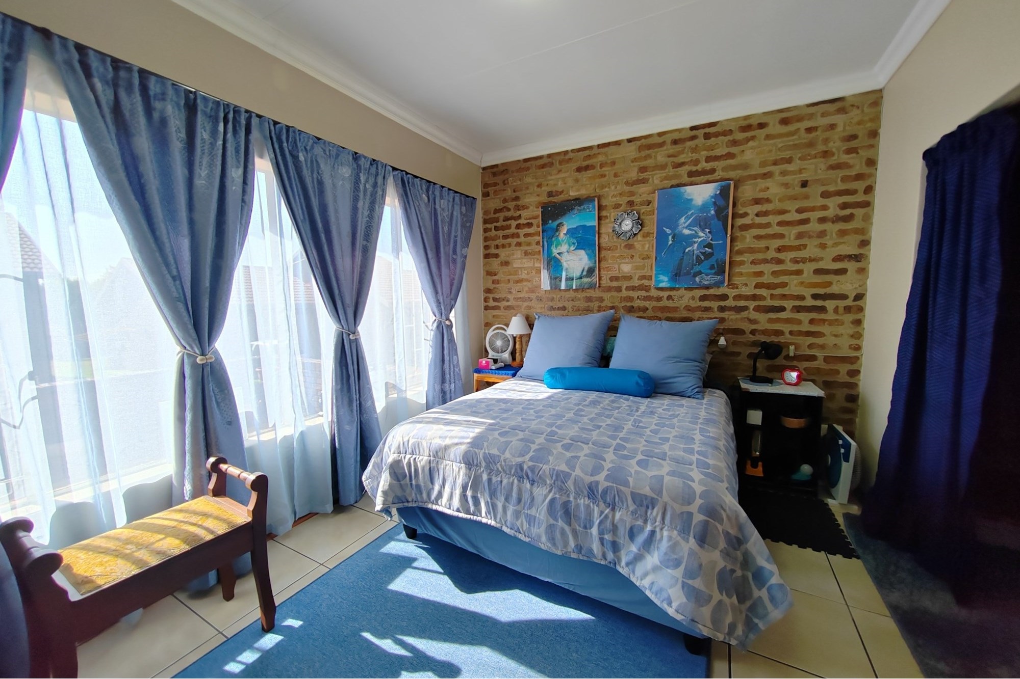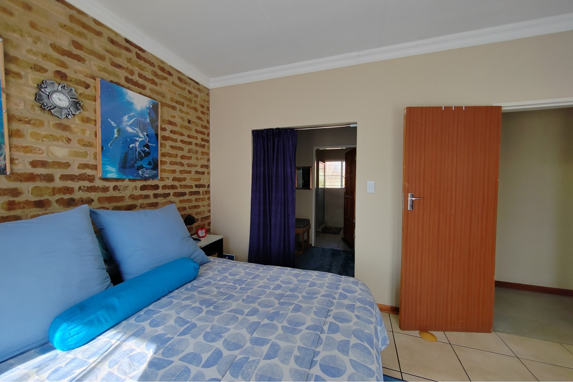 The facebrick townhouse has been remodeled and features 3 bedrooms with built in closets and tiles. The main bedroom has walk-through closets that leads to a bathroom with a shower. There is also a second bathroom in the passage with a bath