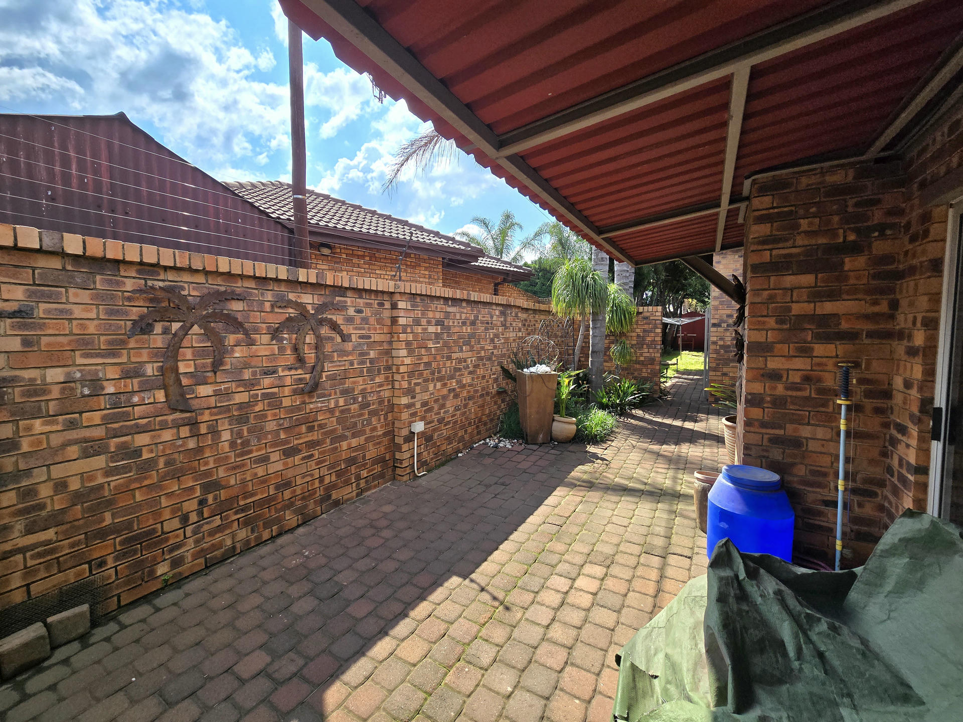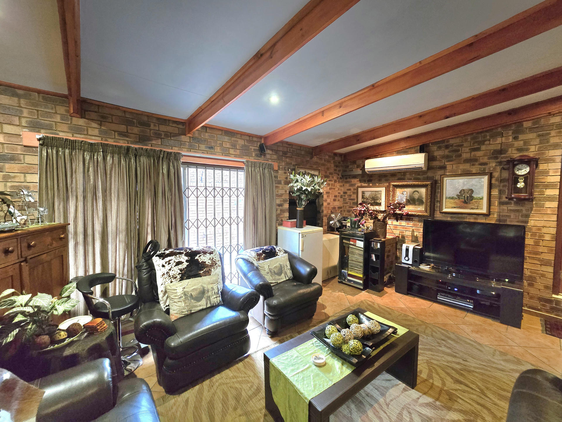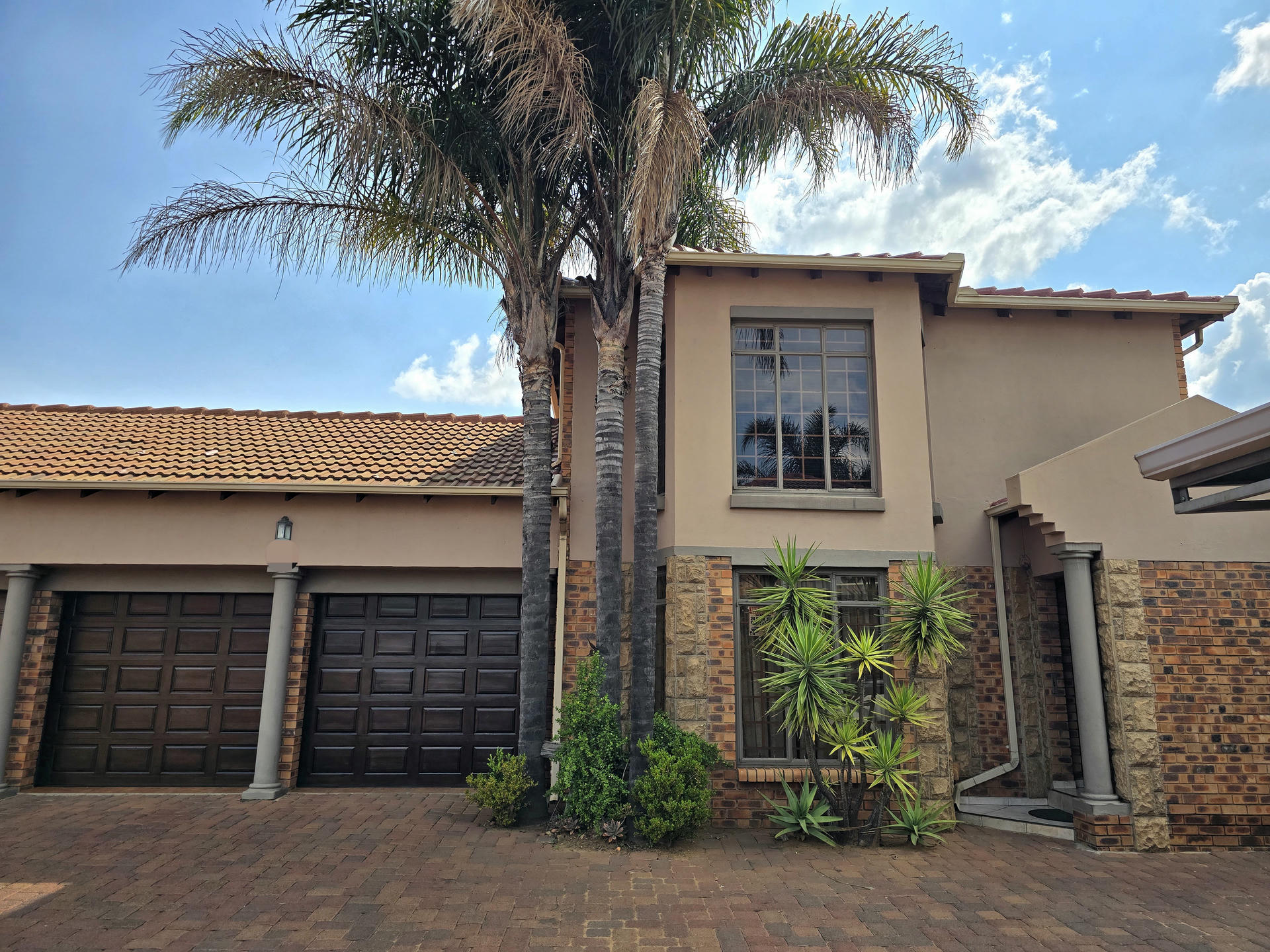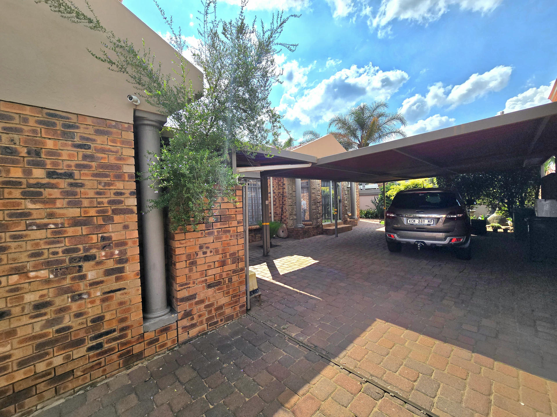 .This beautifully presented duet offers spacious open plan living with impressive double volume ceilings and an inviting flow throughout. The main lounge and dining area are bright and airy, complemented by an additional room that can serve as either a second lounge or a dedicated entertainment space with an indoor braai. The well designed kitchen includes quartz countertops, a walk in pantry, and a separate scullery and laundry combination, making daily living both practical and convenient. All three bedrooms are generously sized, with the main bedroom featuring air conditioning, a walk in closet, and a full en suite bathroom. The remaining bedrooms are well appointed and share a full bathroom, while a separate guest toilet adds extra convenience. The home also includes a private study for those who work from home, strong security features such as electric fencing, automated gates, burglar bars, trelligates, CCTV, and an outside toilet for added practicality. The low maintenance garden is neatly kept and fitted with irrigation. Energy efficiency is a standout feature thanks to a powerful solar setup that includes an inverter, lithium batteries, and an array of solar panels, ensuring uninterrupted comfort. Parking is plentiful with a double automated garage, an enclosed double steel carport, and additional paved parking. Positioned in a quiet four unit complex with no levies, only a small maintenance fund when needed, this property offers secure, comfortable, and modern living in one of Aerorand’s most desirable areas.
