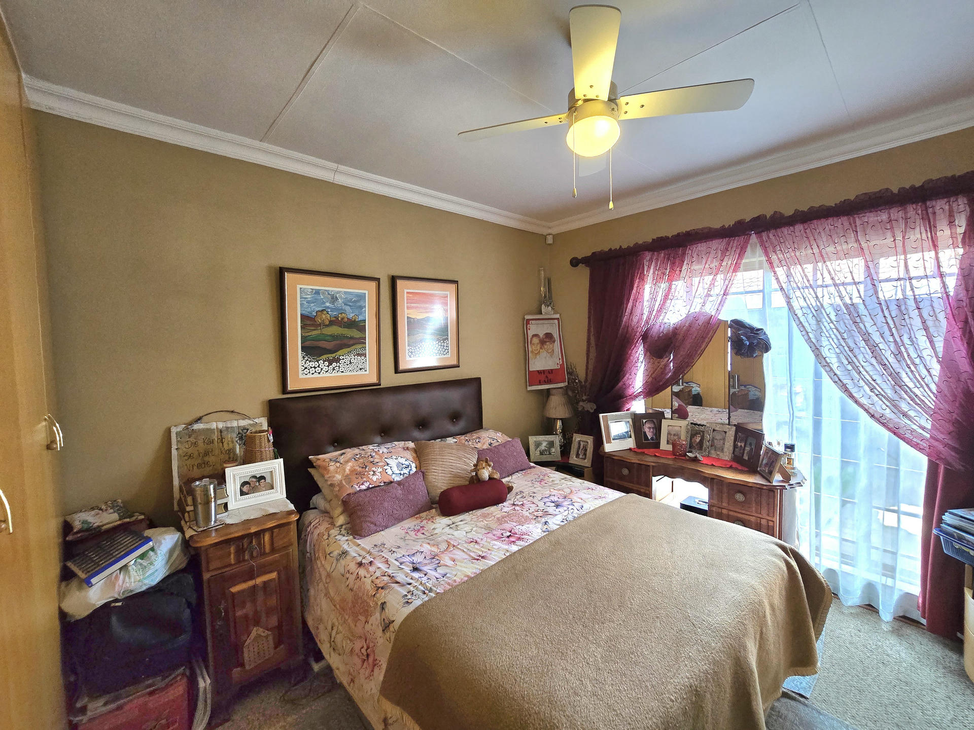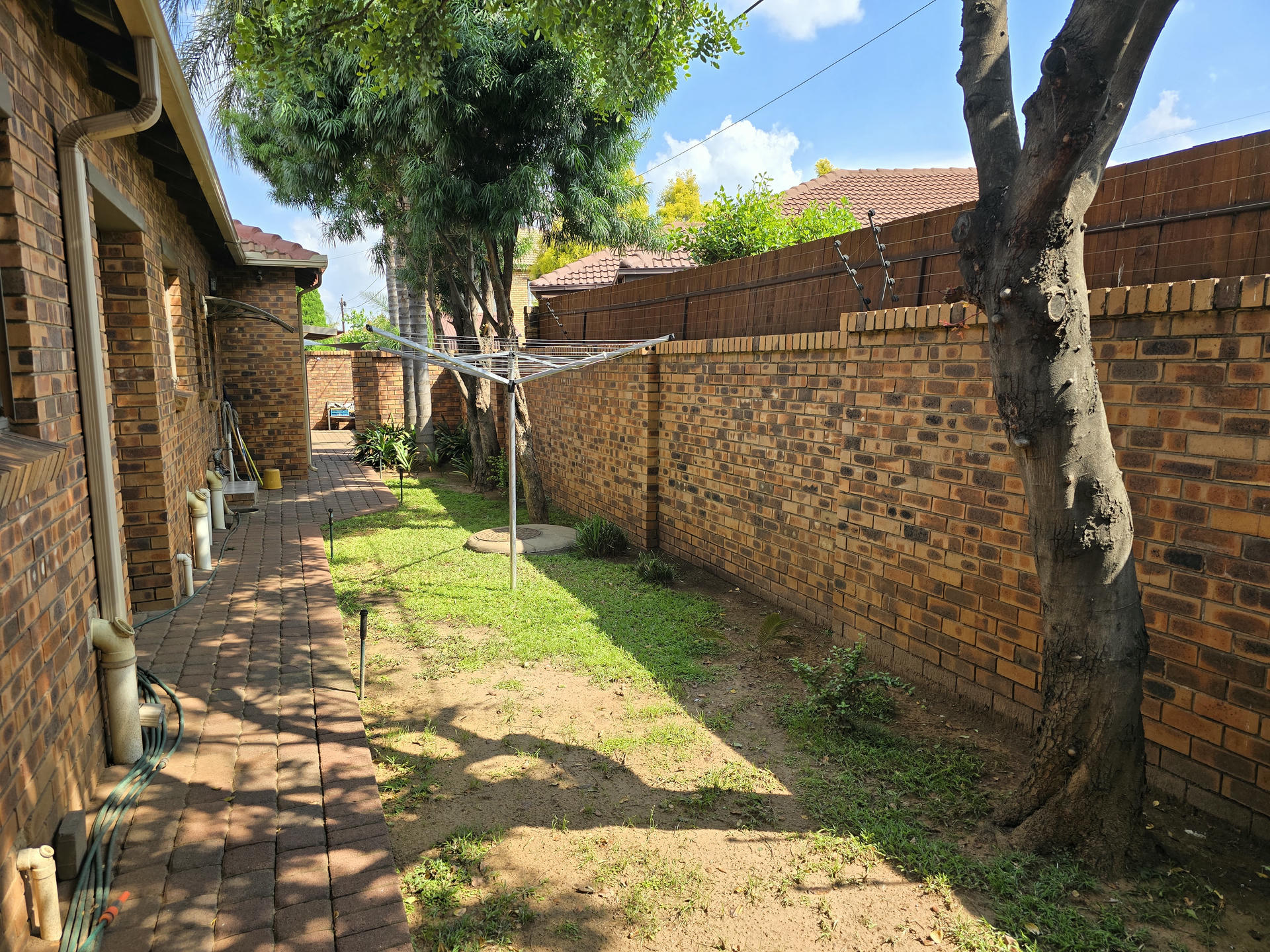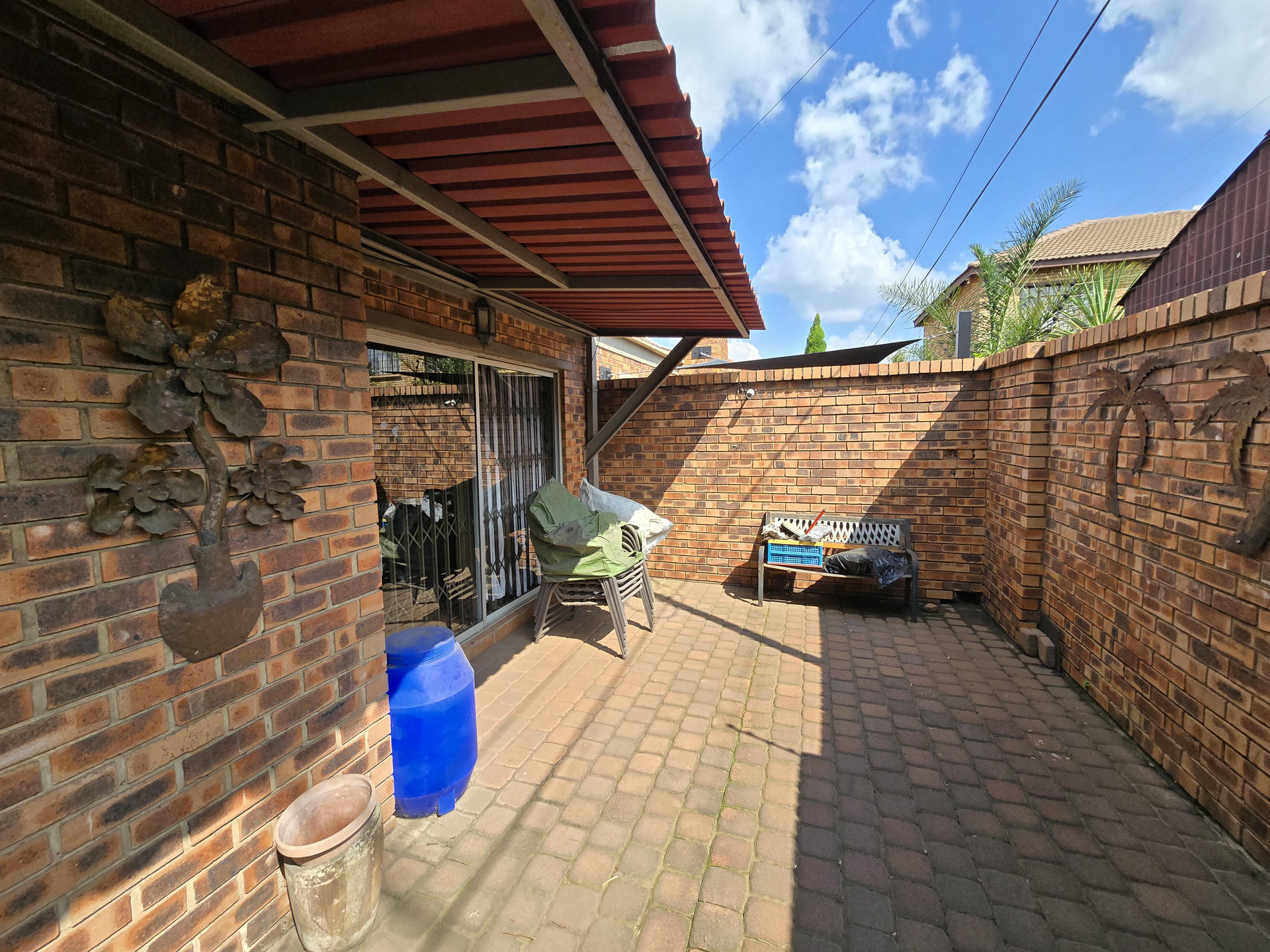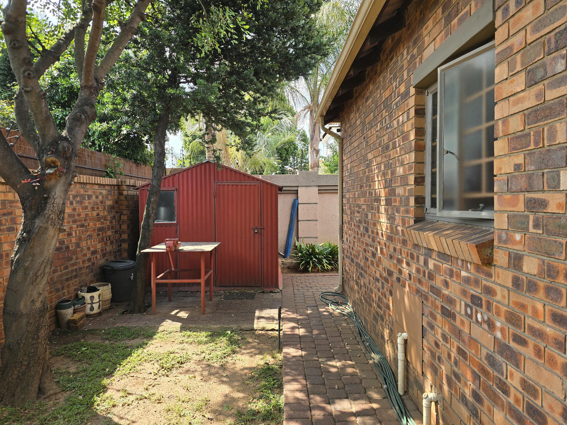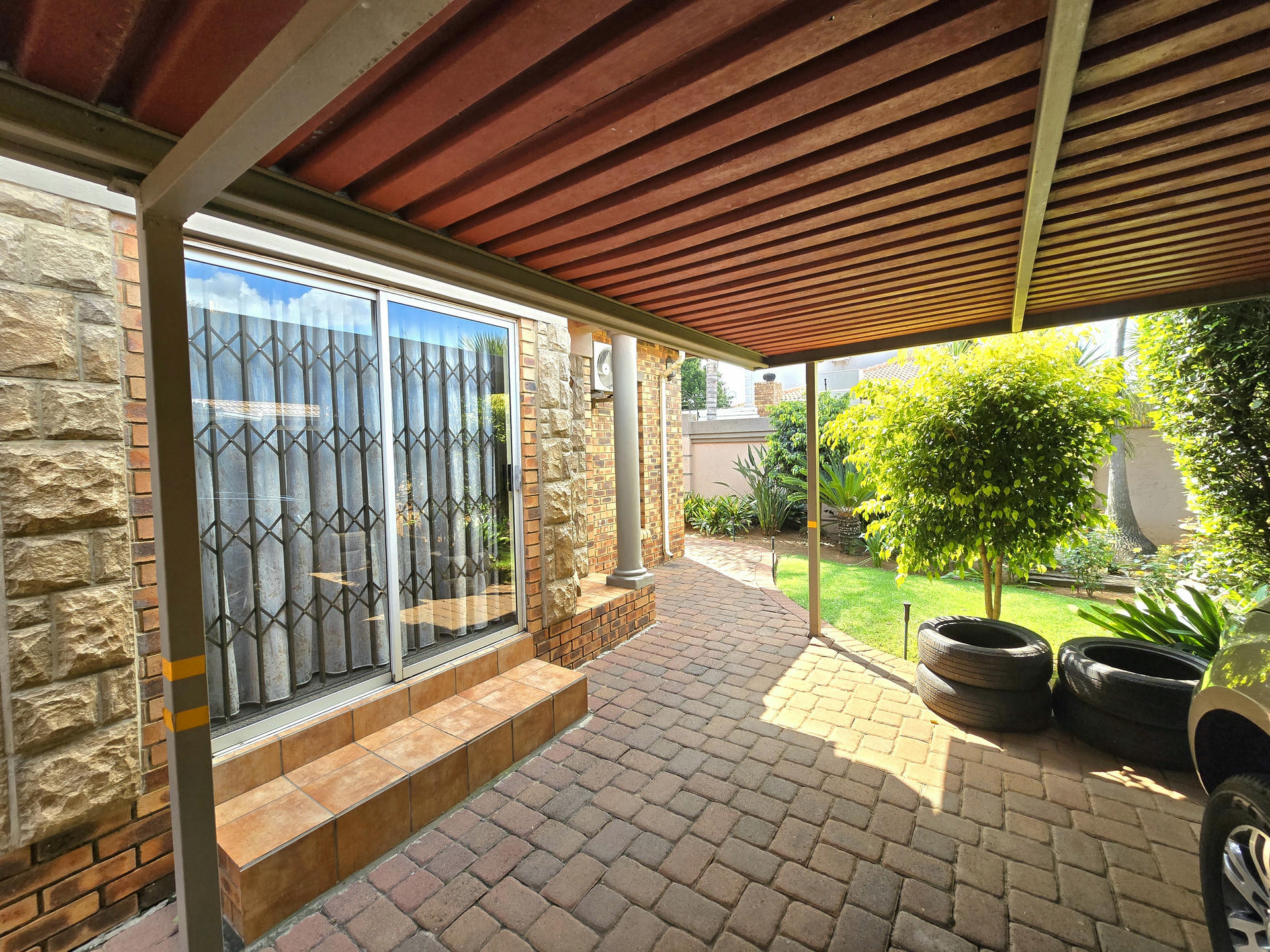 .This beautifully presented duet offers spacious open plan living with impressive double volume ceilings and an inviting flow throughout. The main lounge and dining area are bright and airy, complemented by an additional room that can serve as either a second lounge or a dedicated entertainment space with an indoor braai. The well designed kitchen includes quartz countertops, a walk in pantry, and a separate scullery and laundry combination, making daily living both practical and convenient. All three bedrooms are generously sized, with the main bedroom featuring air conditioning, a walk in closet, and a full en suite bathroom. The remaining bedrooms are well appointed and share a full bathroom, while a separate guest toilet adds extra convenience. The home also includes a private study for those who work from home, strong security features such as electric fencing, automated gates, burglar bars, trelligates, CCTV, and an outside toilet for added practicality. The low maintenance garden is neatly kept and fitted with irrigation. Energy efficiency is a standout feature thanks to a powerful solar setup that includes an inverter, lithium batteries, and an array of solar panels, ensuring uninterrupted comfort. Parking is plentiful with a double automated garage, an enclosed double steel carport, and additional paved parking. Positioned in a quiet four unit complex with no levies, only a small maintenance fund when needed, this property offers secure, comfortable, and modern living in one of Aerorand’s most desirable areas.
