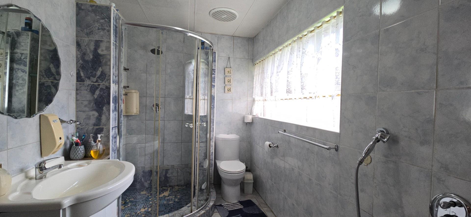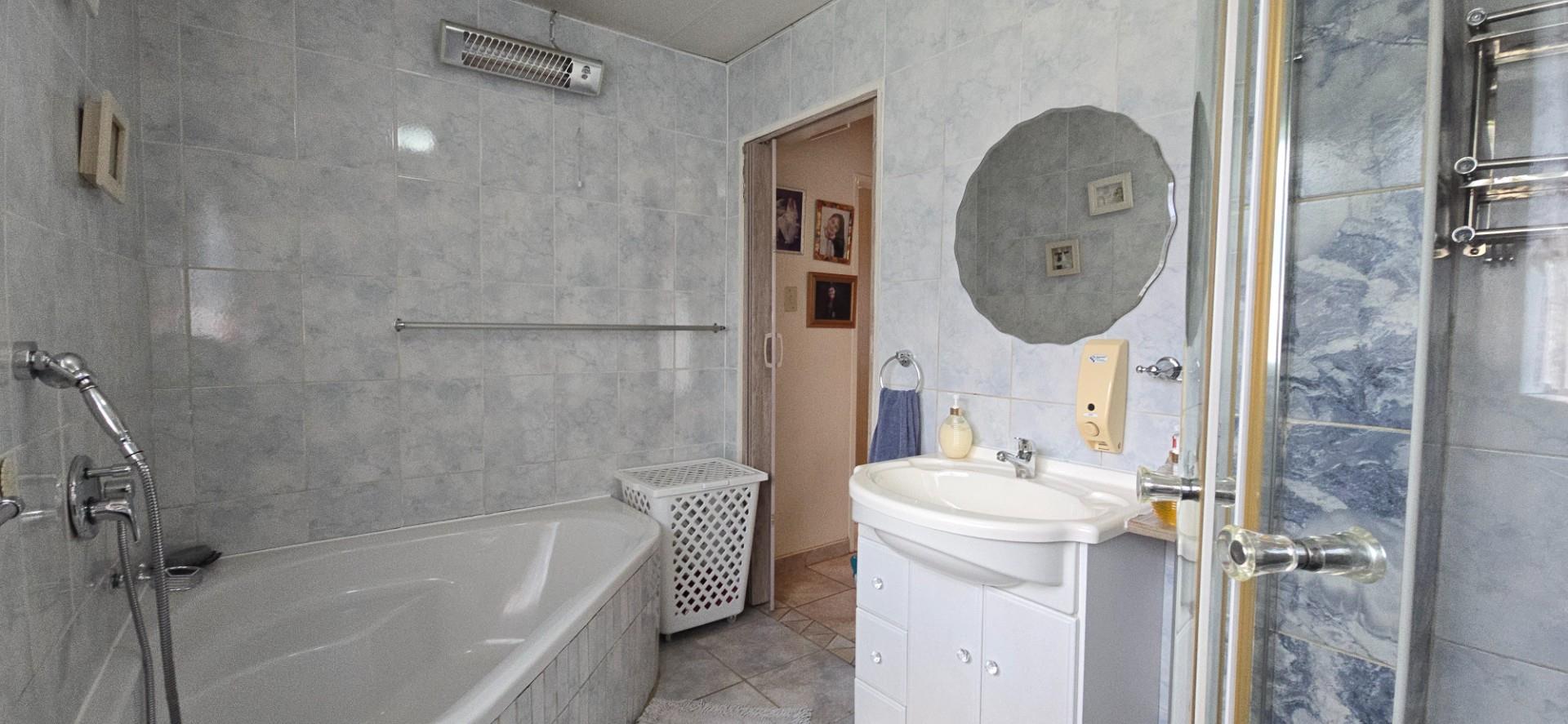 The full bathroom is spacious and neatly finished, featuring a corner bath, corner shower, basin with cabinet, toilet, and heater.