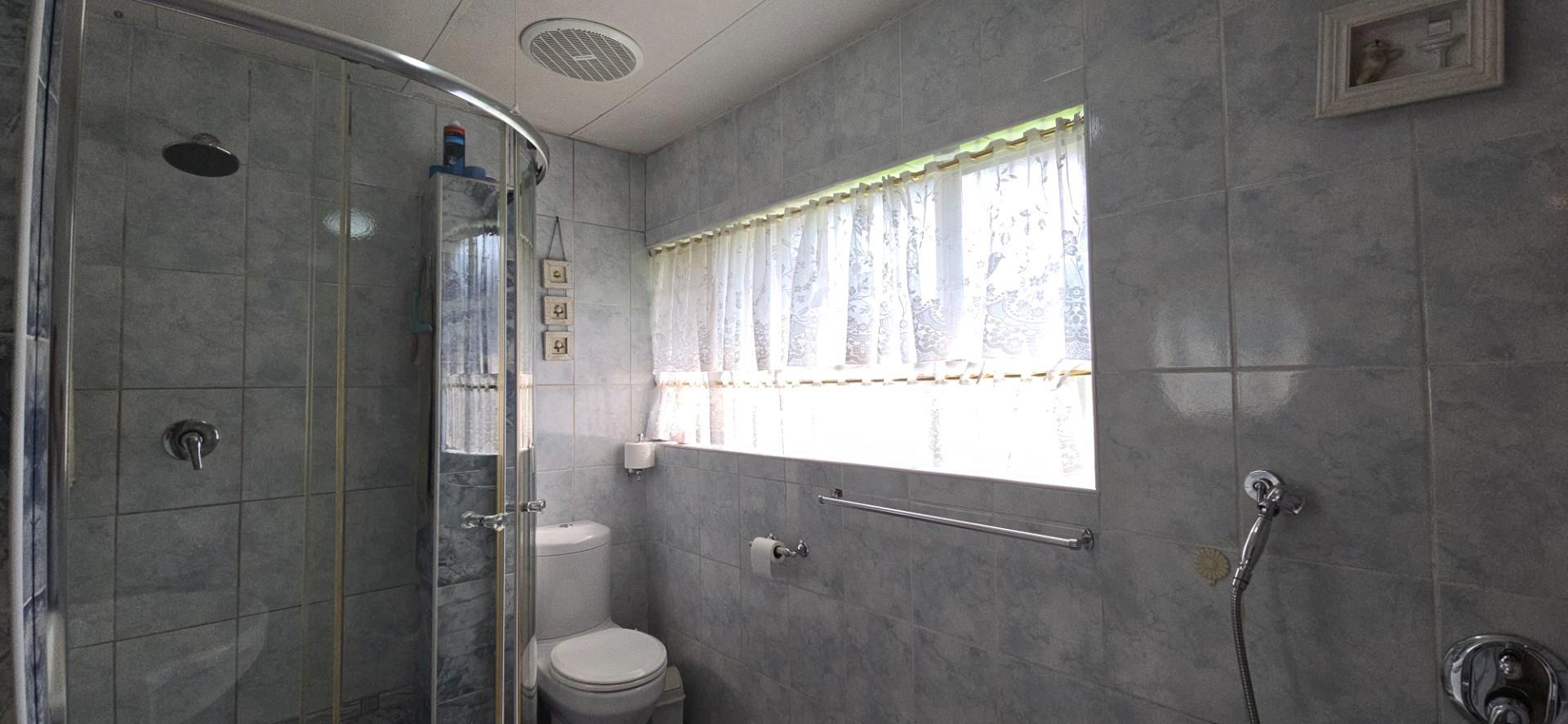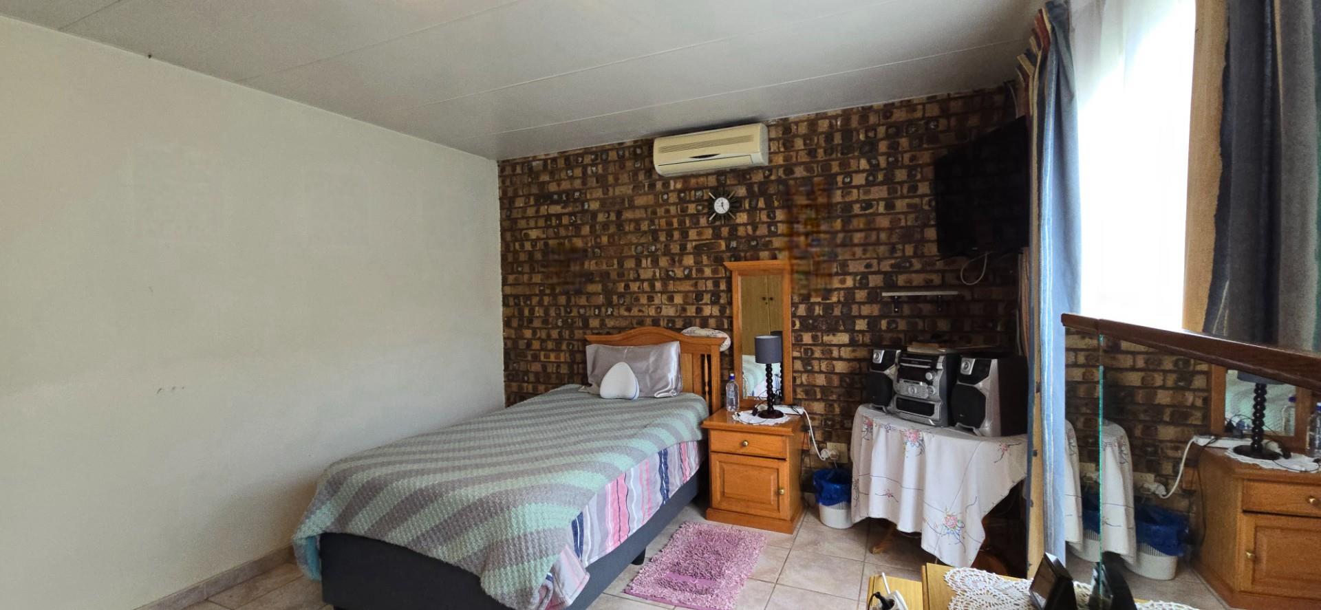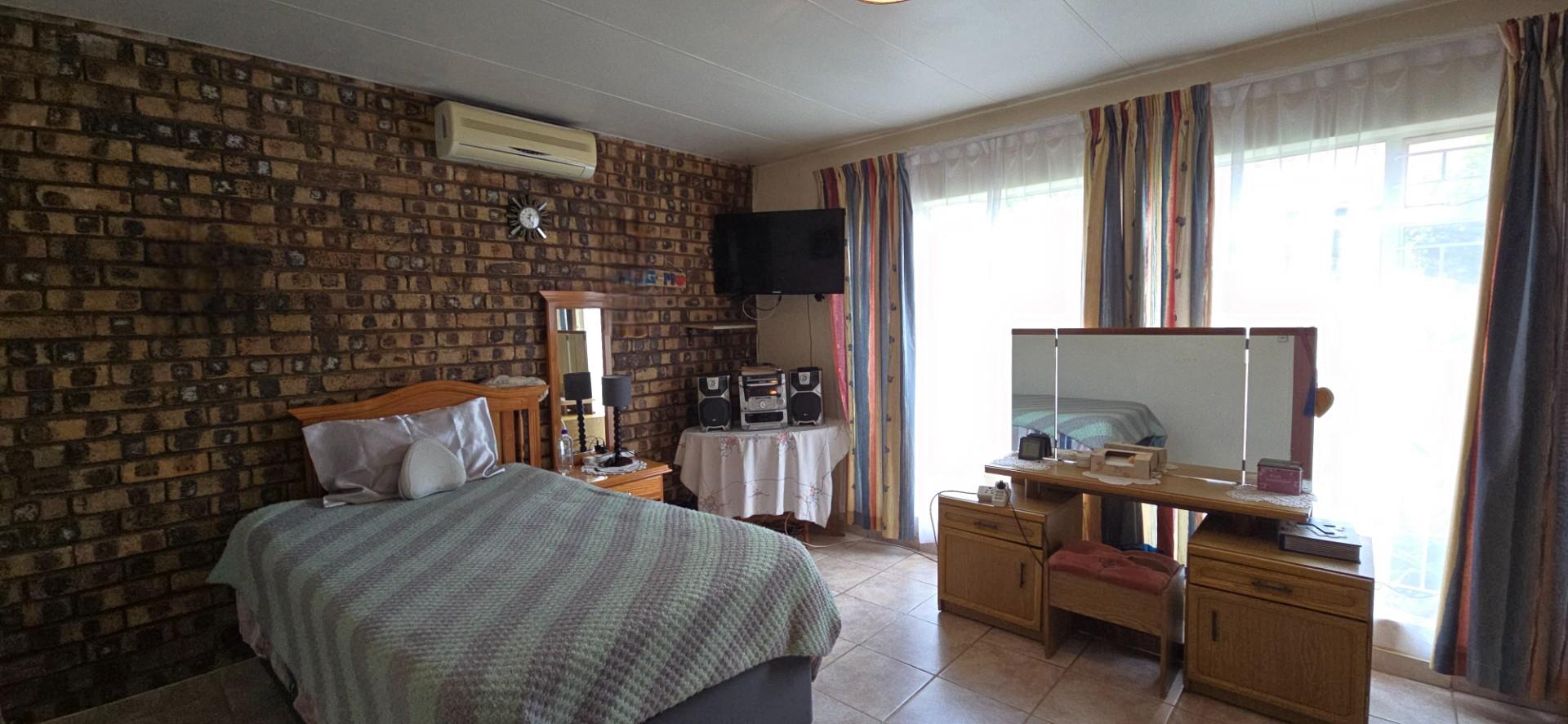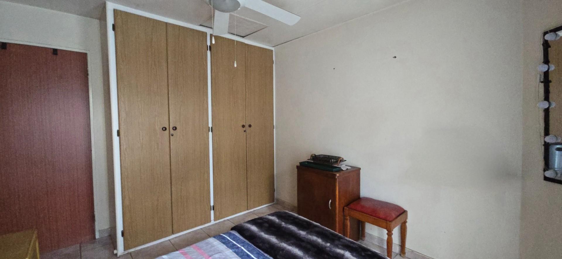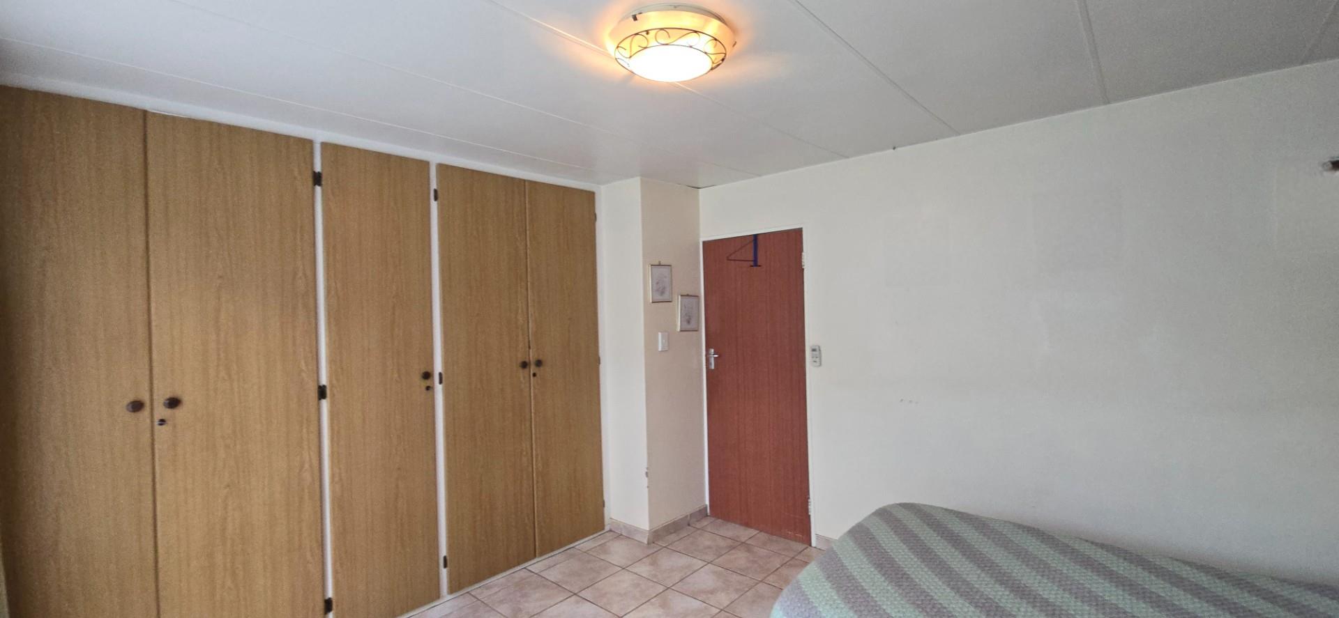 The home offers two well-sized bedrooms, both with full wall built-in cupboards. The main bedroom is air-conditioned, while the second bedroom is fitted with a ceiling fan. A linen cupboard in the passage provides additional storage.
