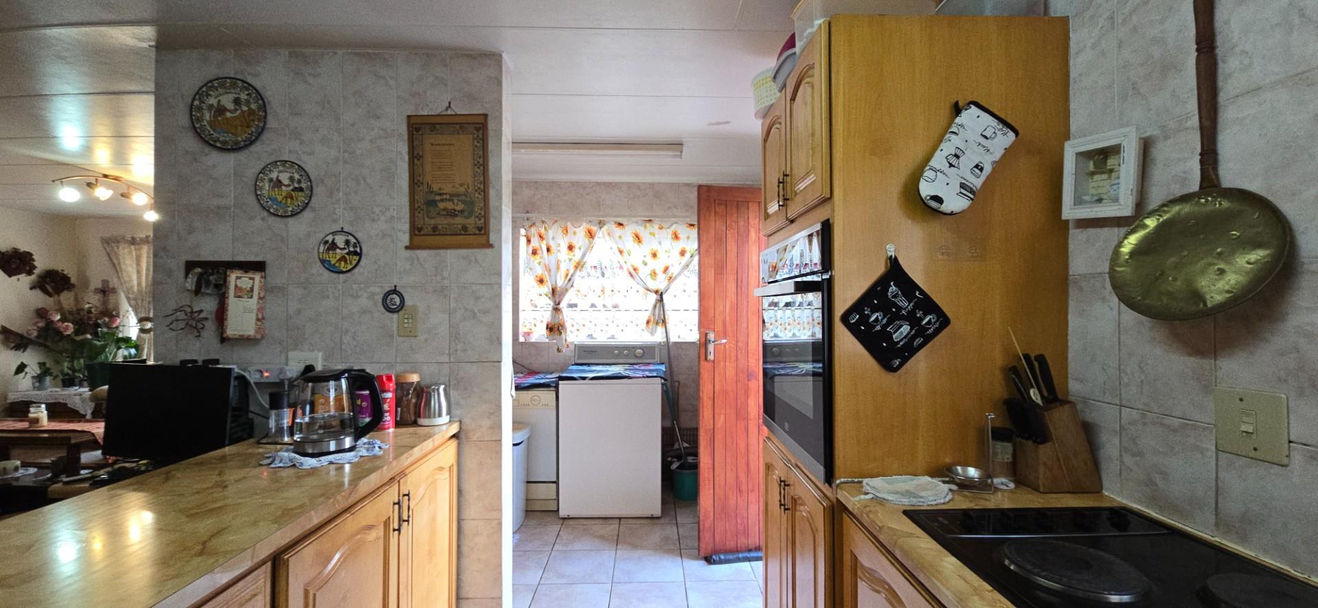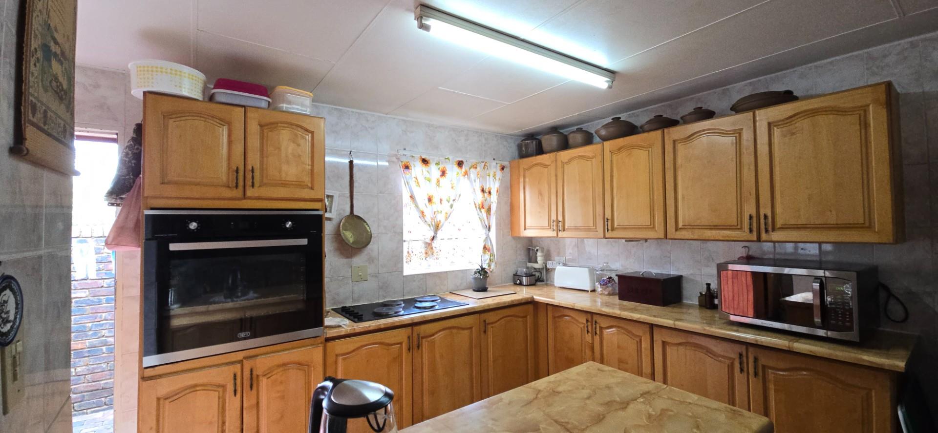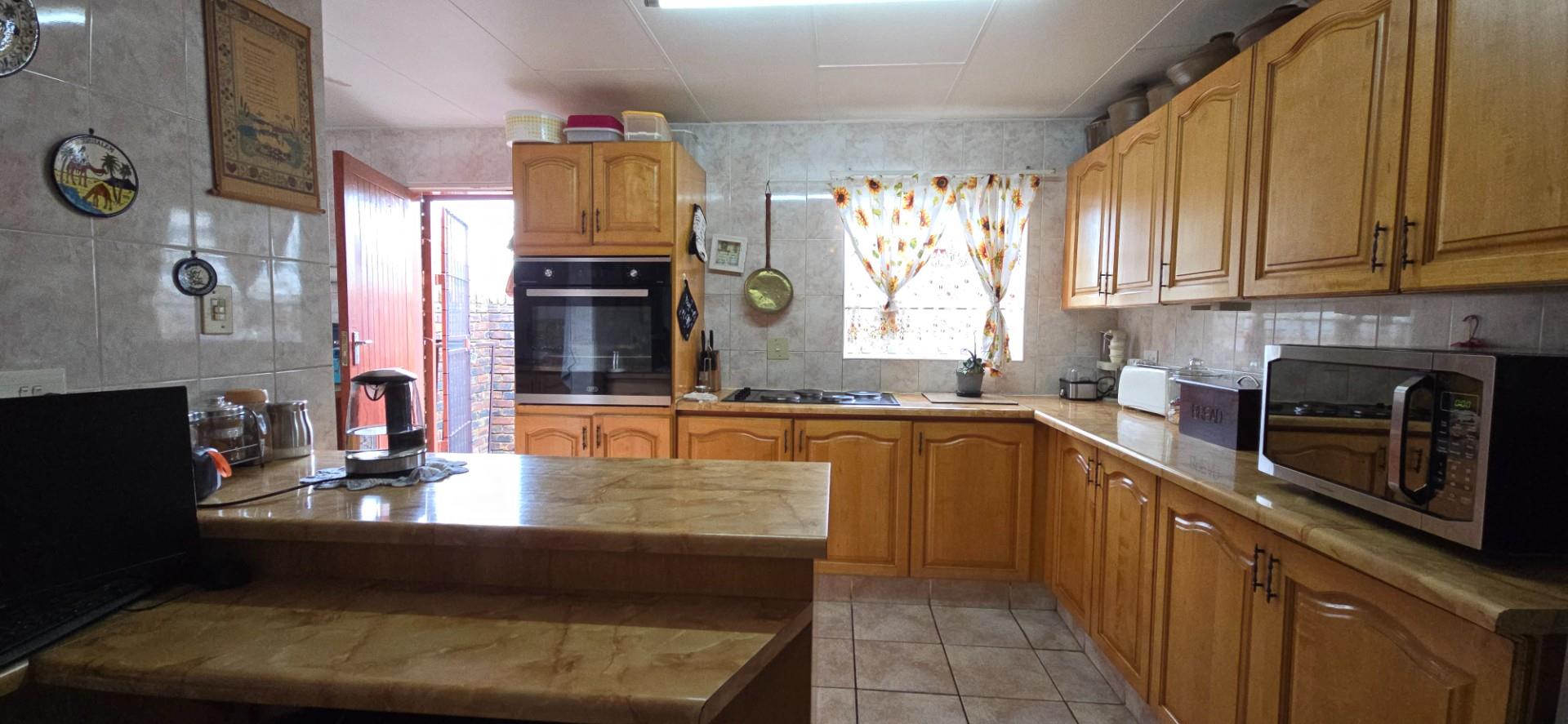 Inside, the home offers a spacious open-plan living area, fully air-conditioned, combining the lounge, dining room, and kitchen into a functional and welcoming space. The kitchen is fitted with solid wood cupboards, a four-plate hob, eye-level oven, and a breakfast nook, making it ideal for everyday living.