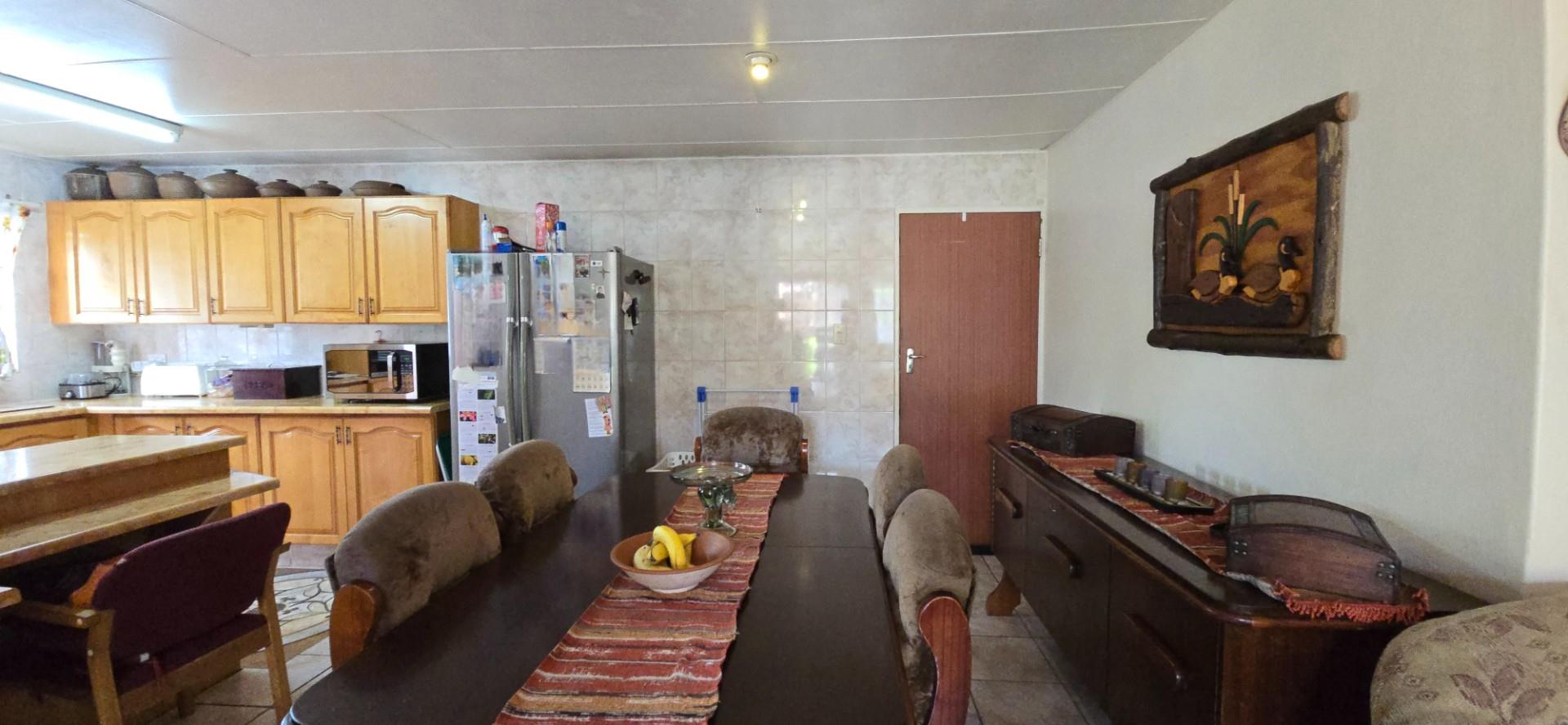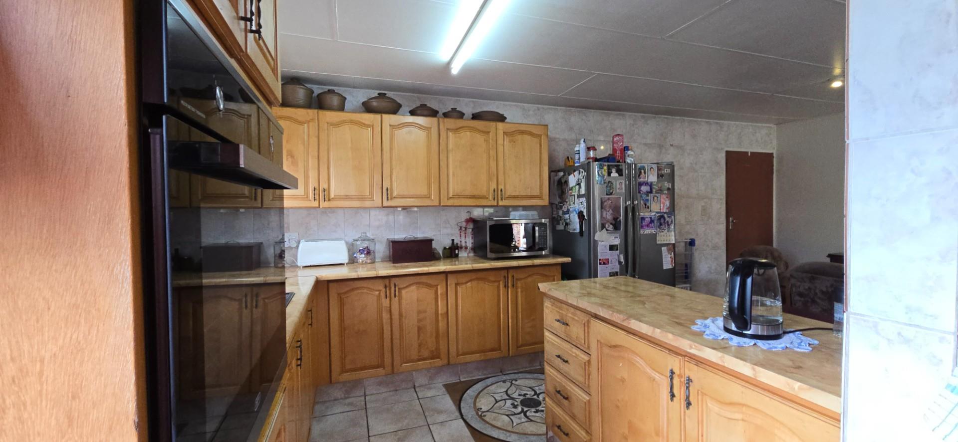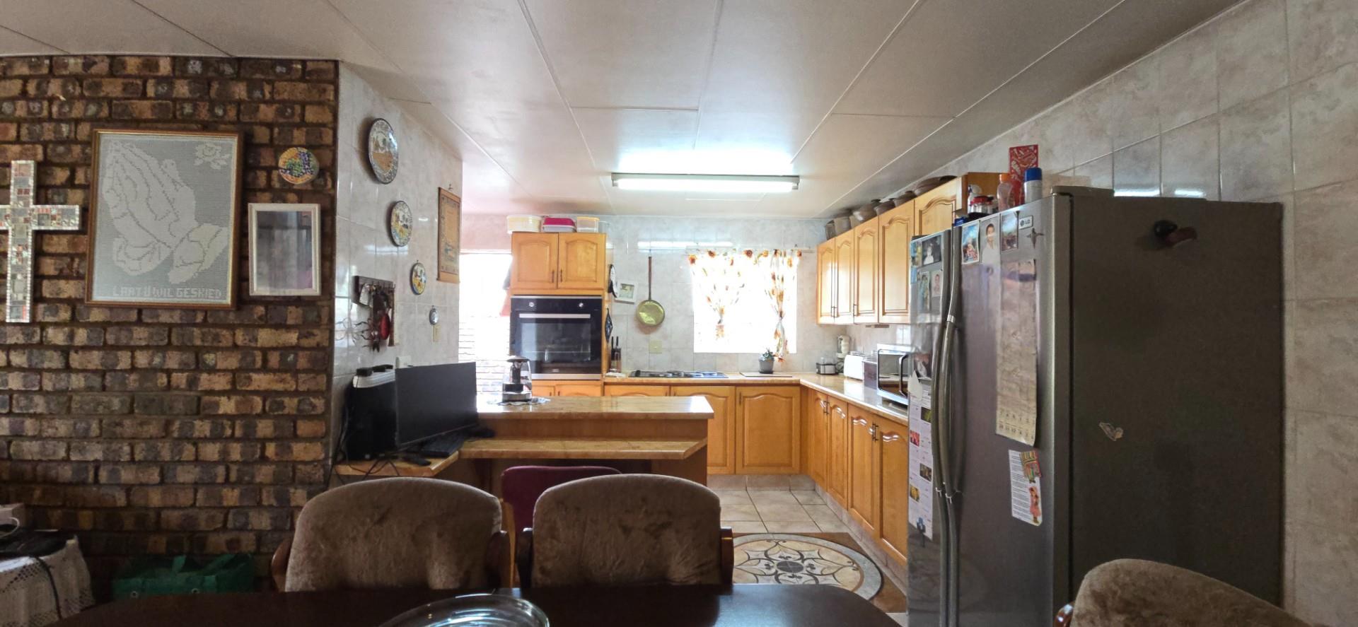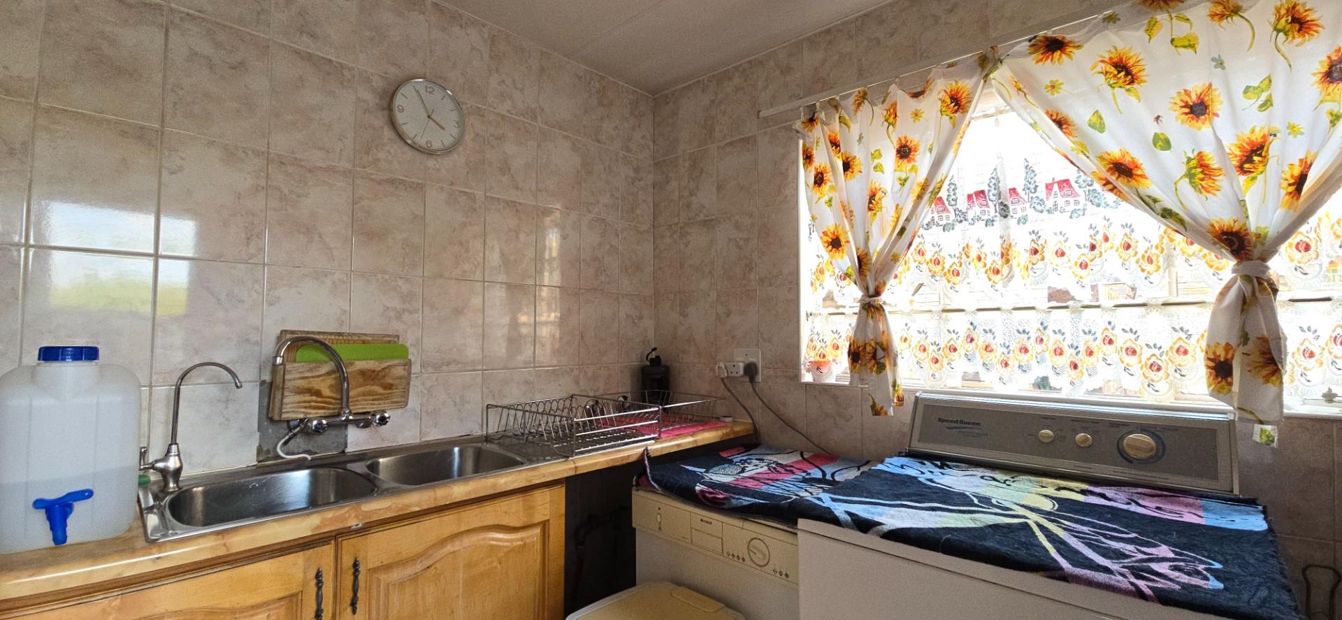Inside, the home offers a spacious open-plan living area, fully air-conditioned, combining the lounge, dining room, and kitchen into a functional and welcoming space. The kitchen is fitted with solid wood cupboards, a four-plate hob, eye-level oven, and a breakfast nook, making it ideal for everyday living.