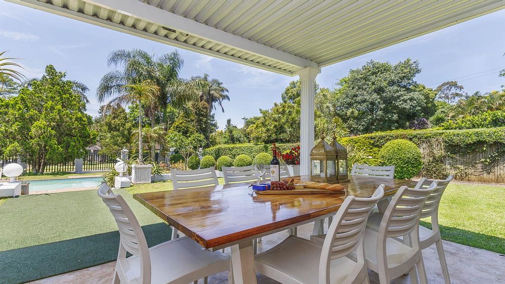 French doors extend the living spaces onto an expansive covered patio, an inviting setting for leisurely mornings, alfresco dining, and relaxed entertaining while overlooking the manicured, mature garden. The sparkling swimming pool and lush lawns create a serene outdoor sanctuary, ideal for children, pets, and hosting guests in style.