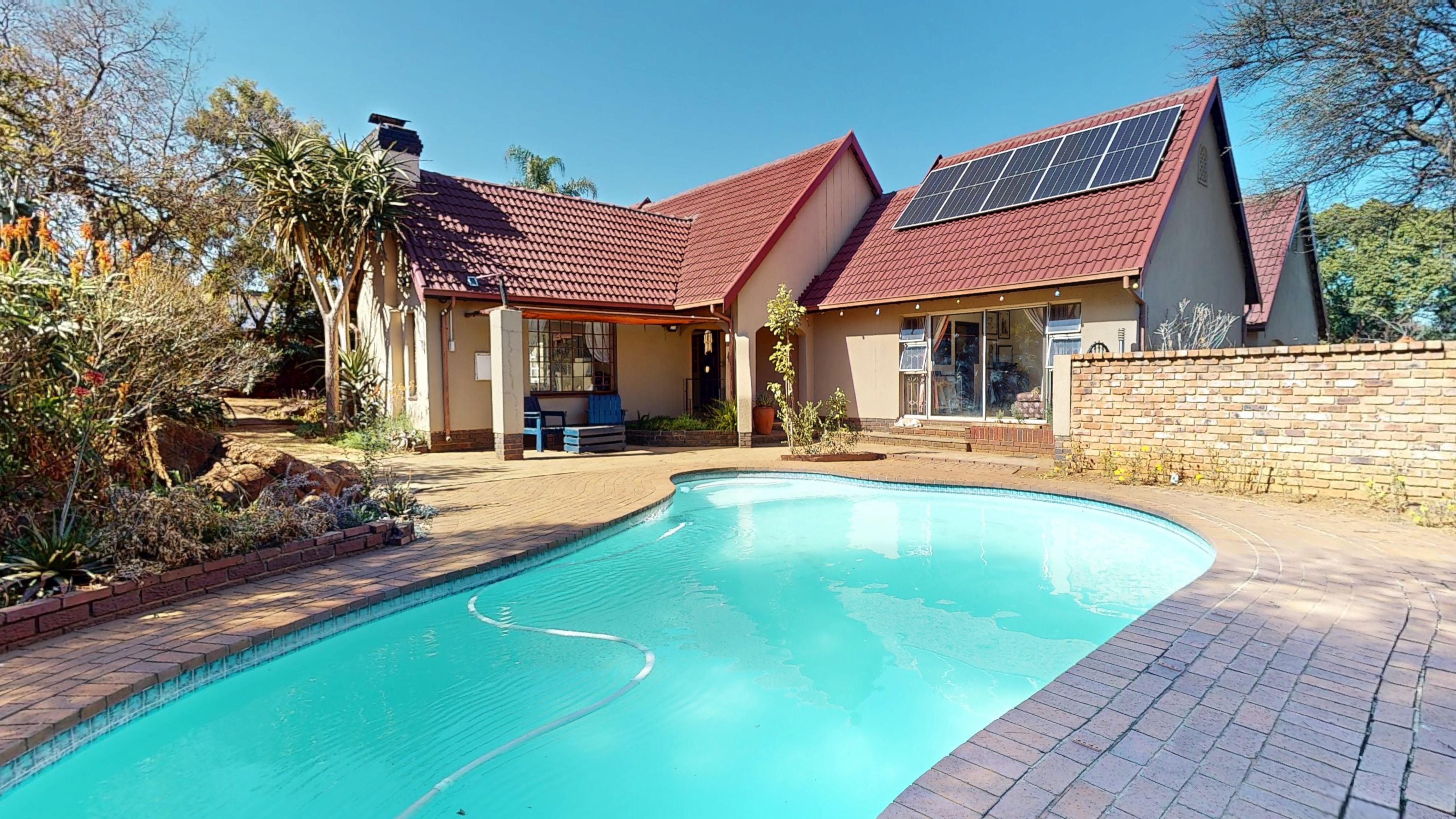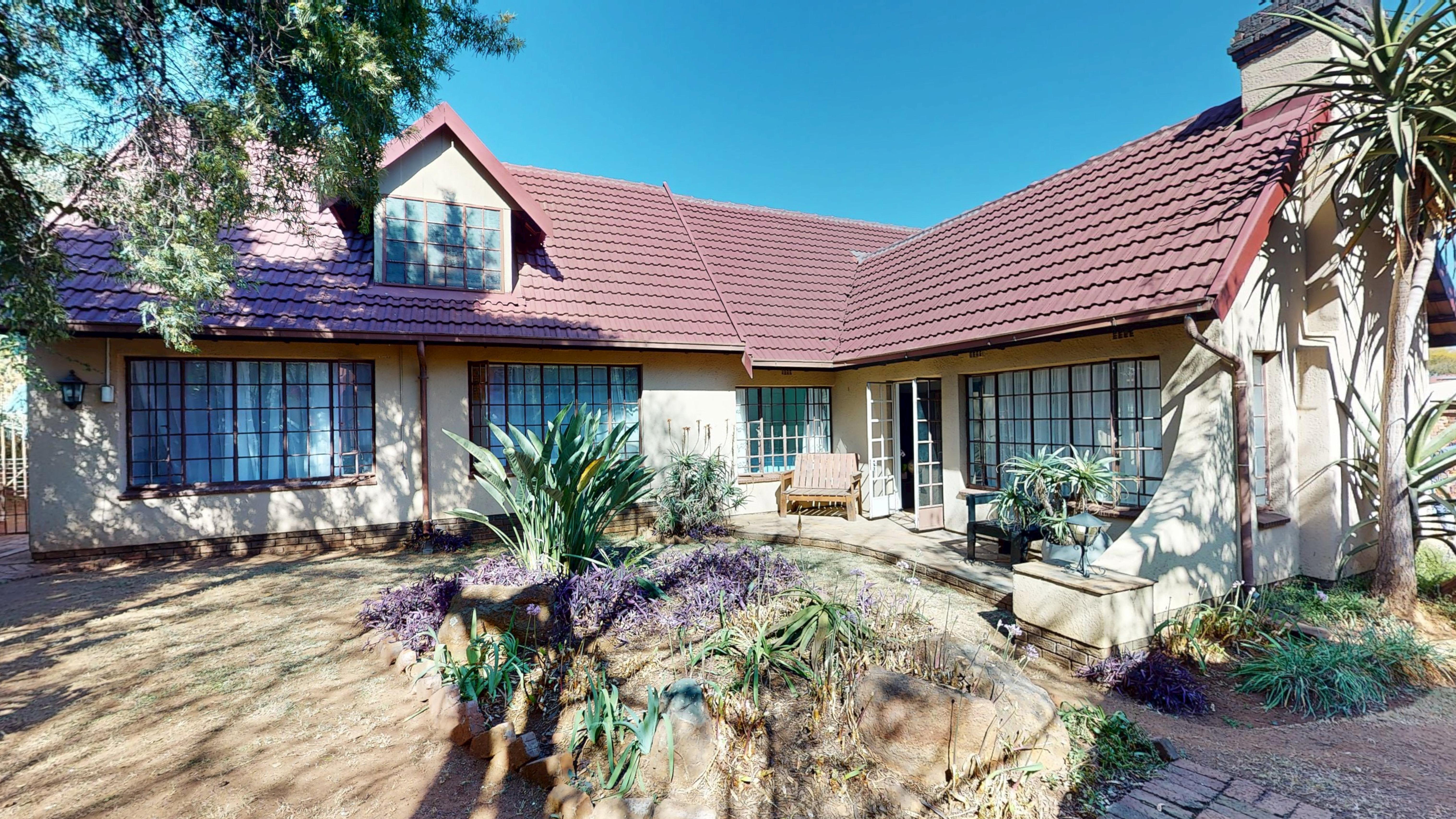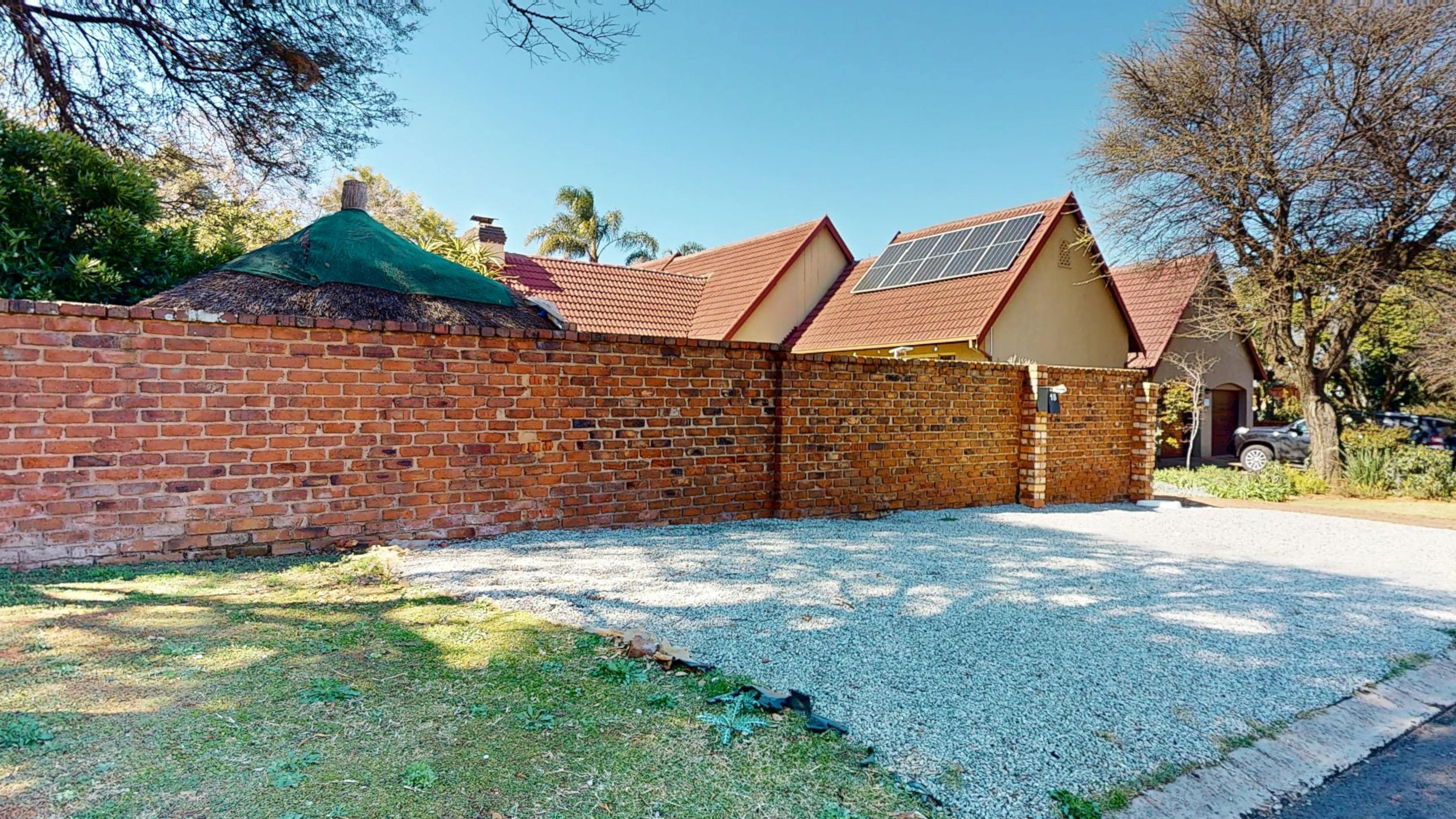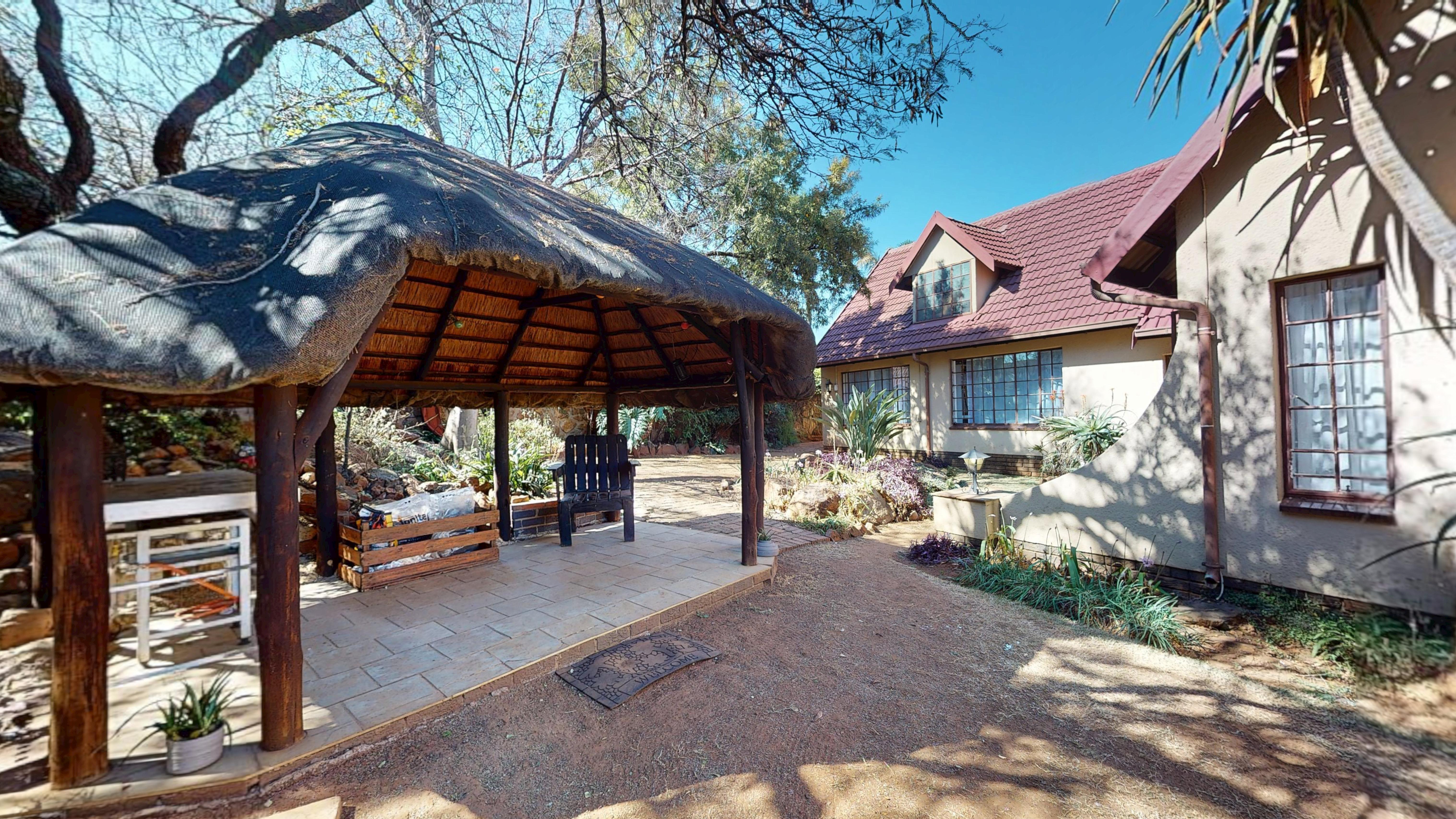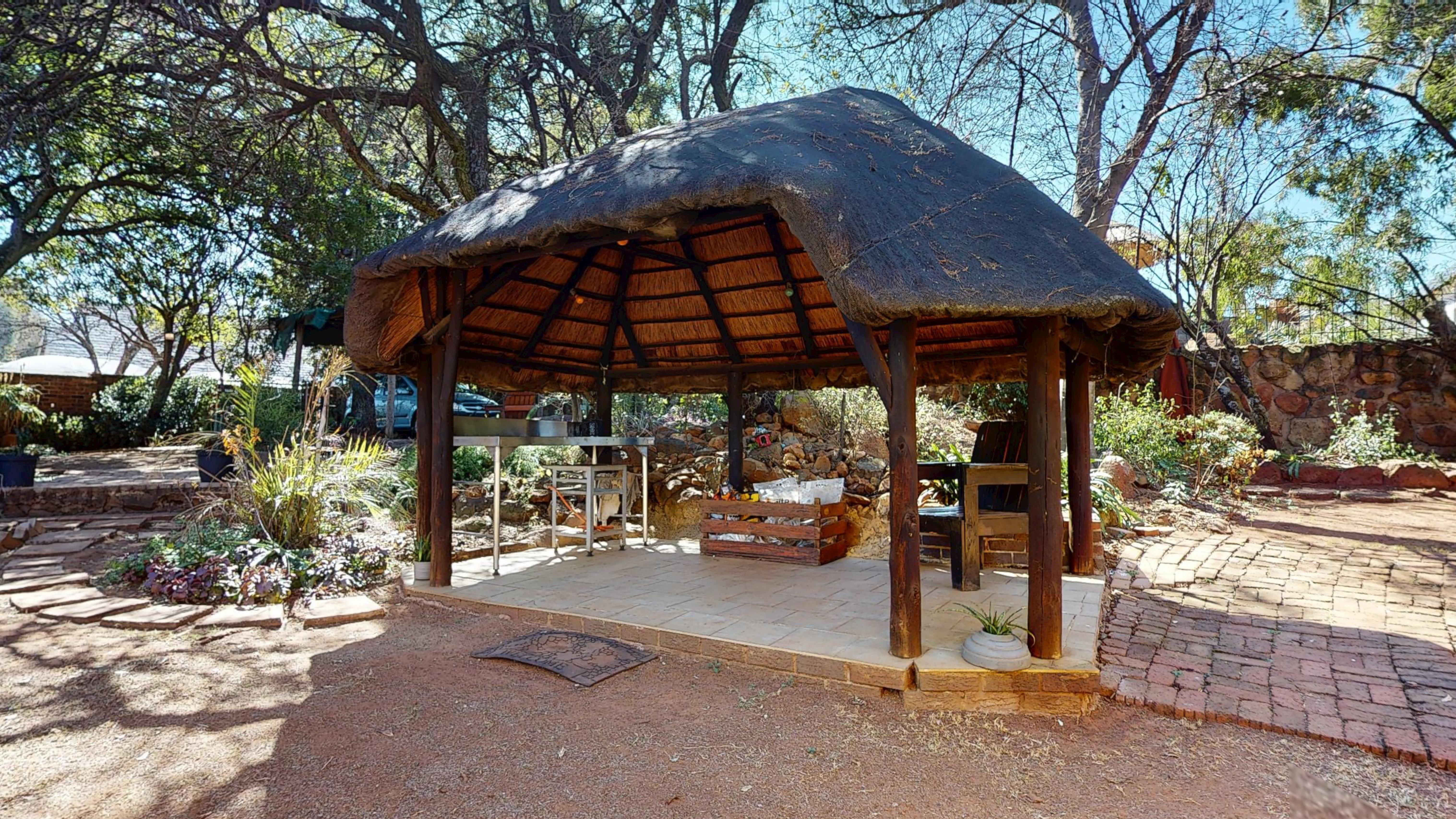 The entertainment area includes a built-in braai under a thatched Lapa — ideal for weekend gatherings or relaxed evenings at home.