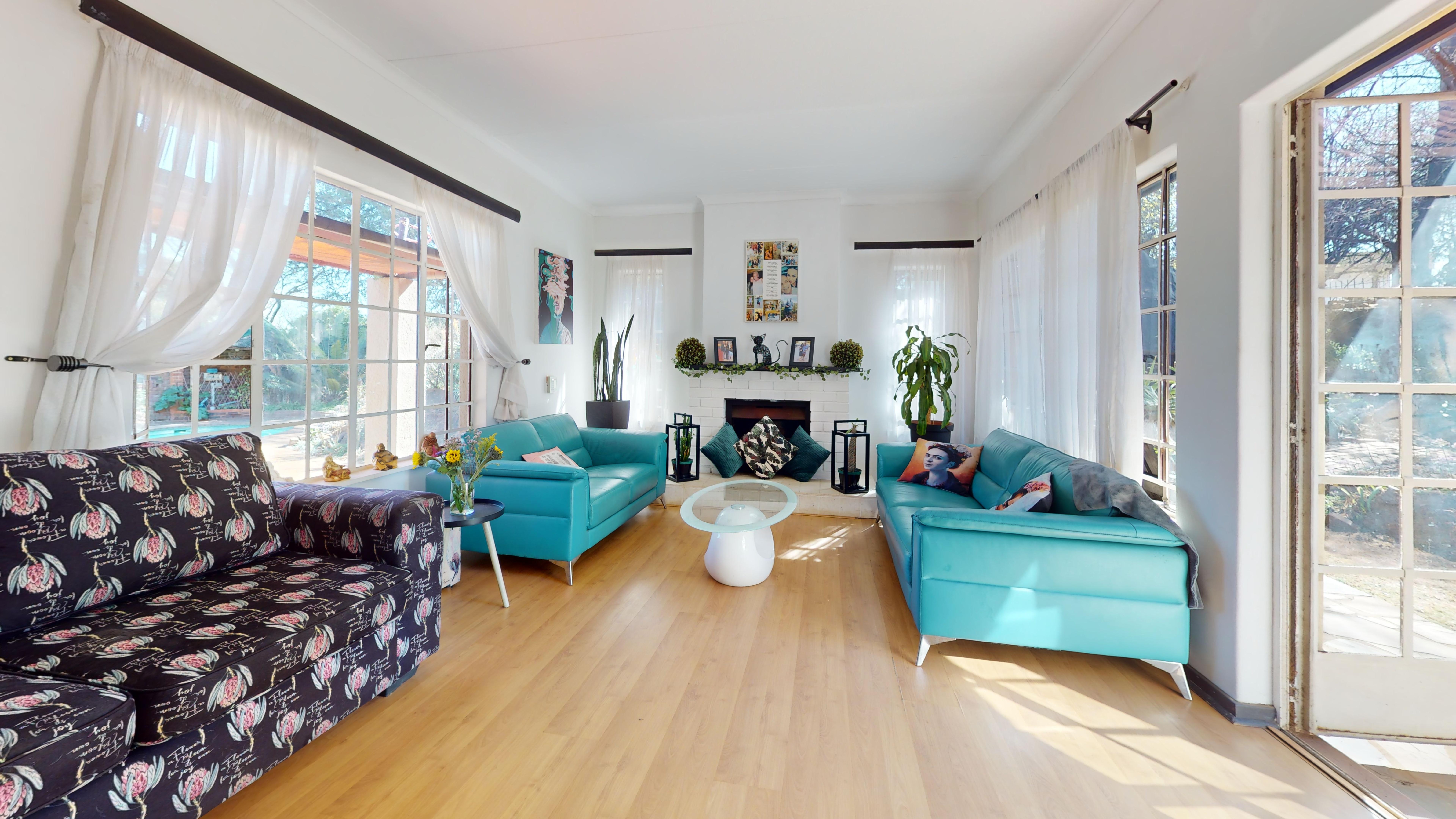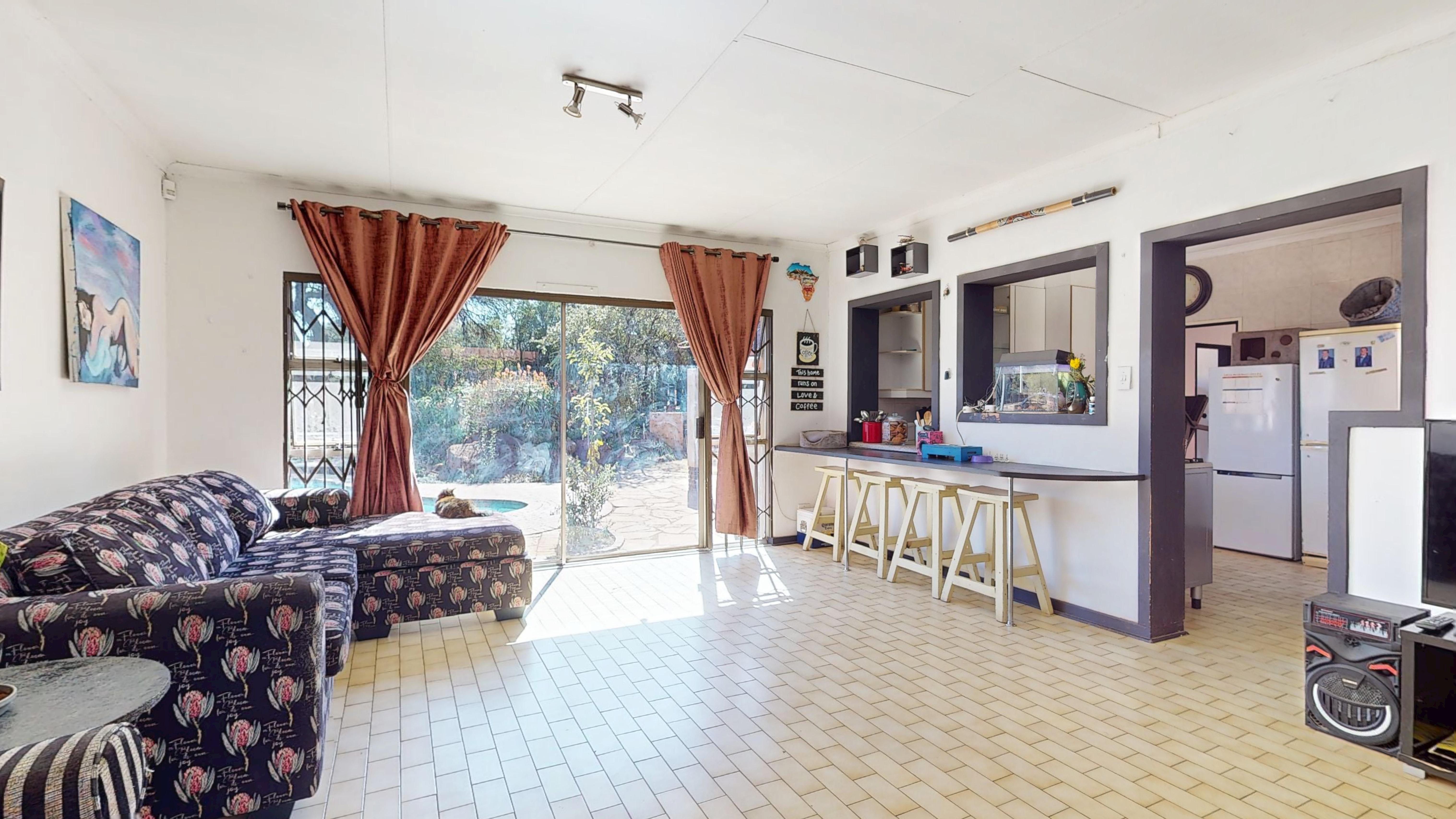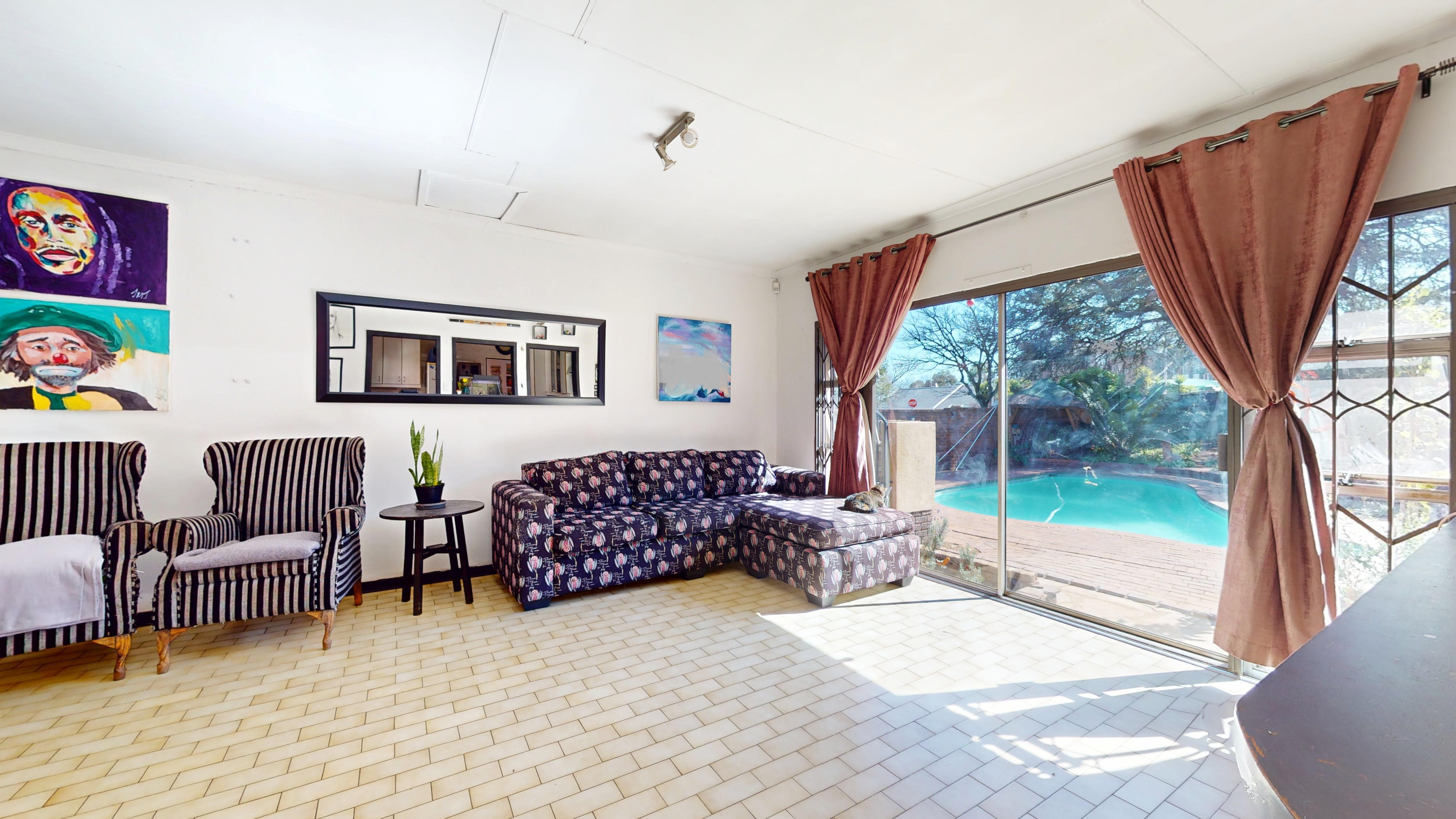 A sunny, open-plan lounge flows seamlessly into a well-established garden and sparkling pool, creating the perfect indoor-outdoor living experience.