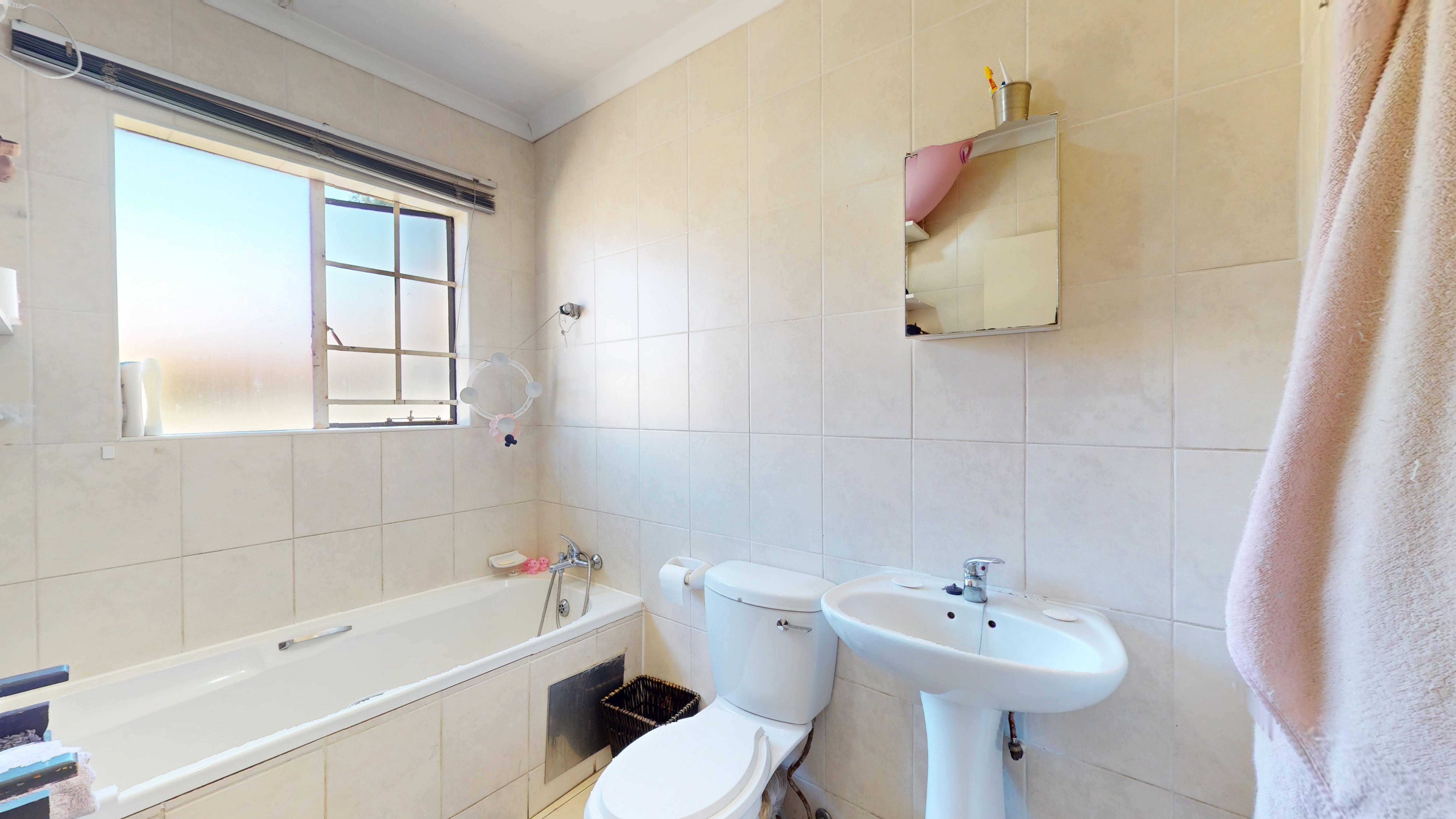 A second full bathroom with a bathtub, basin, and toilet caters to the rest of the household.