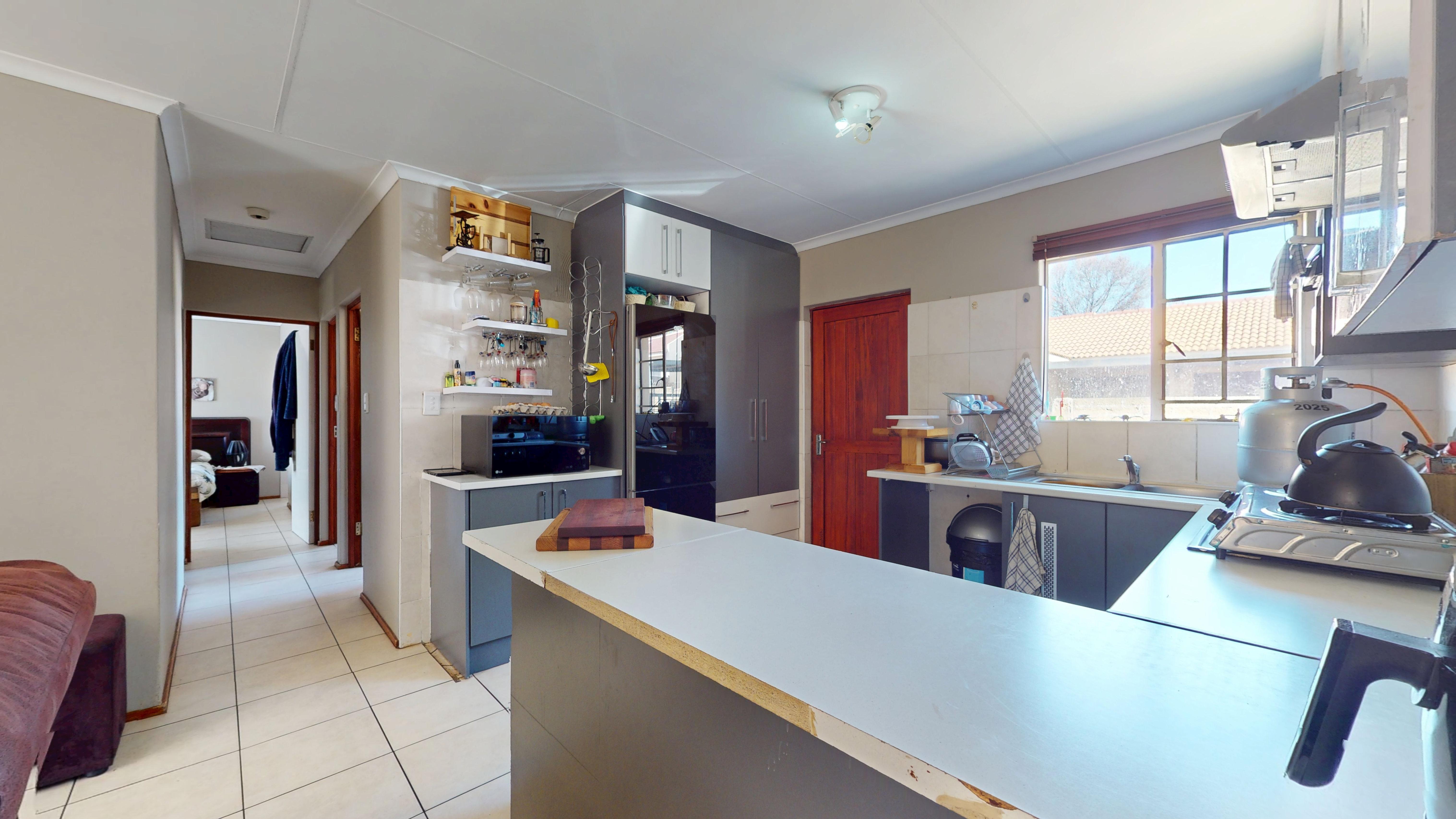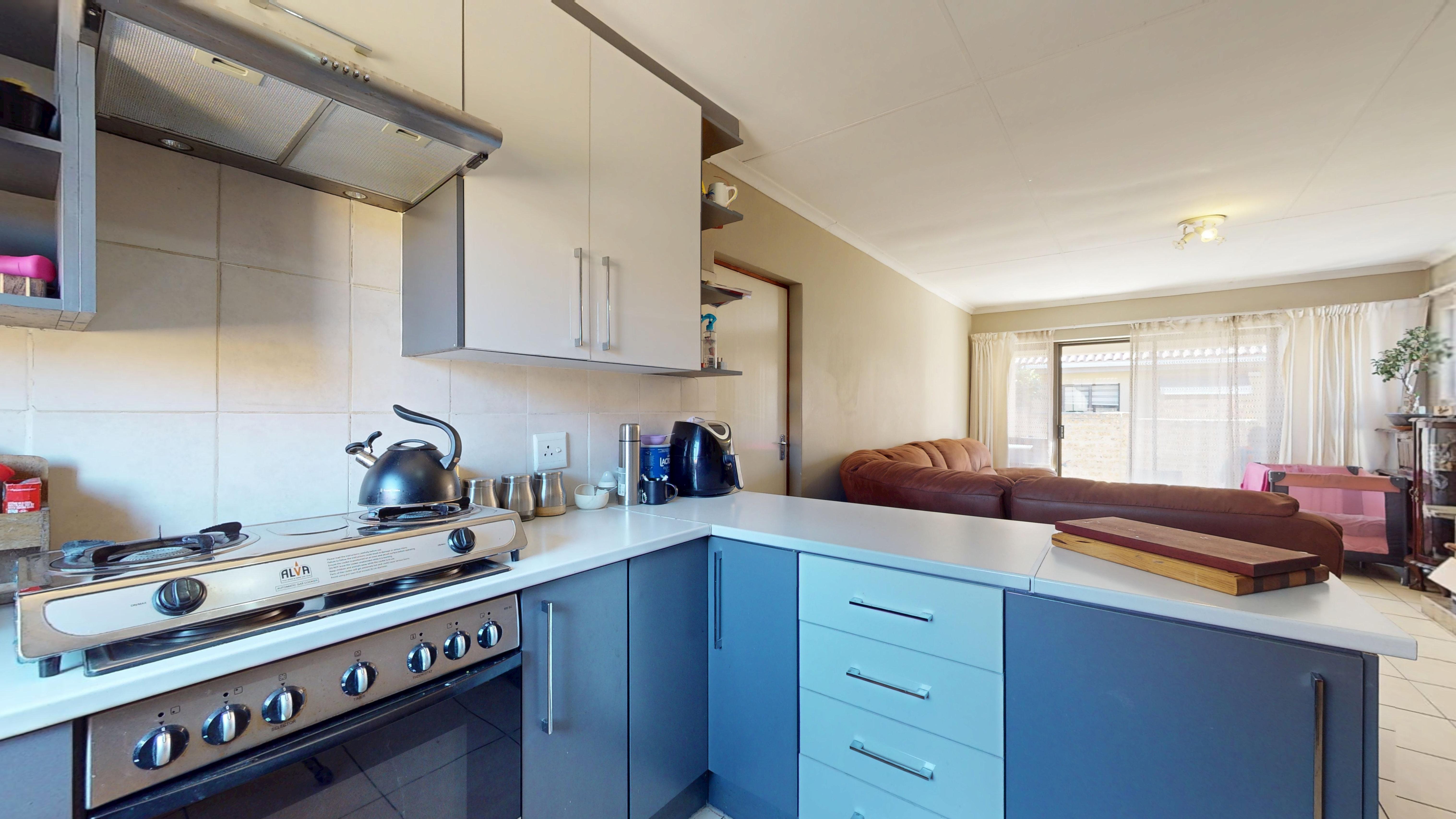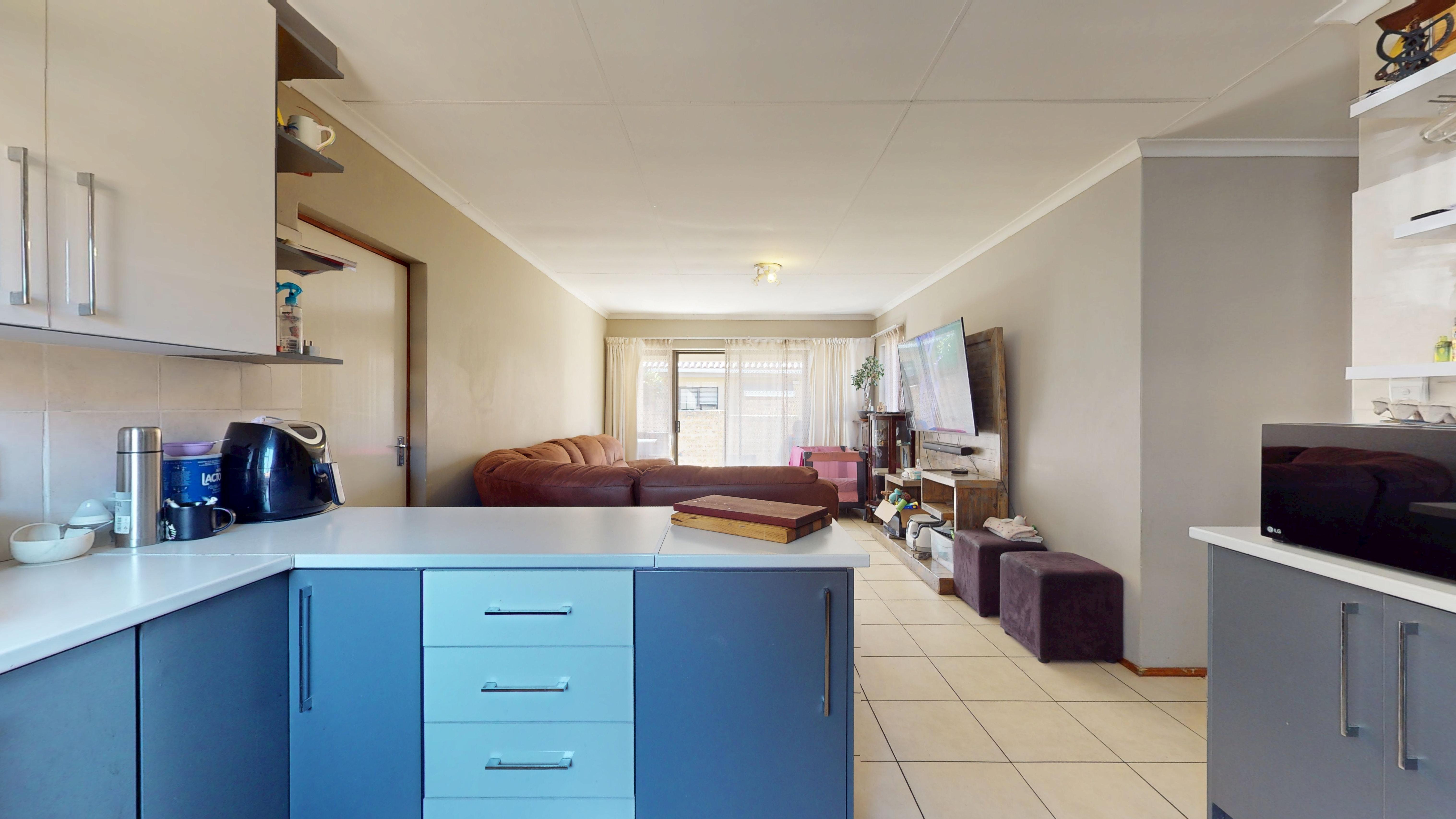 The open-plan kitchen boasts modern built-in cupboards and tiled floors, flowing seamlessly into the living area that opens onto a covered patio and a generous wrap-around garden—perfect for entertaining or relaxing outdoors.