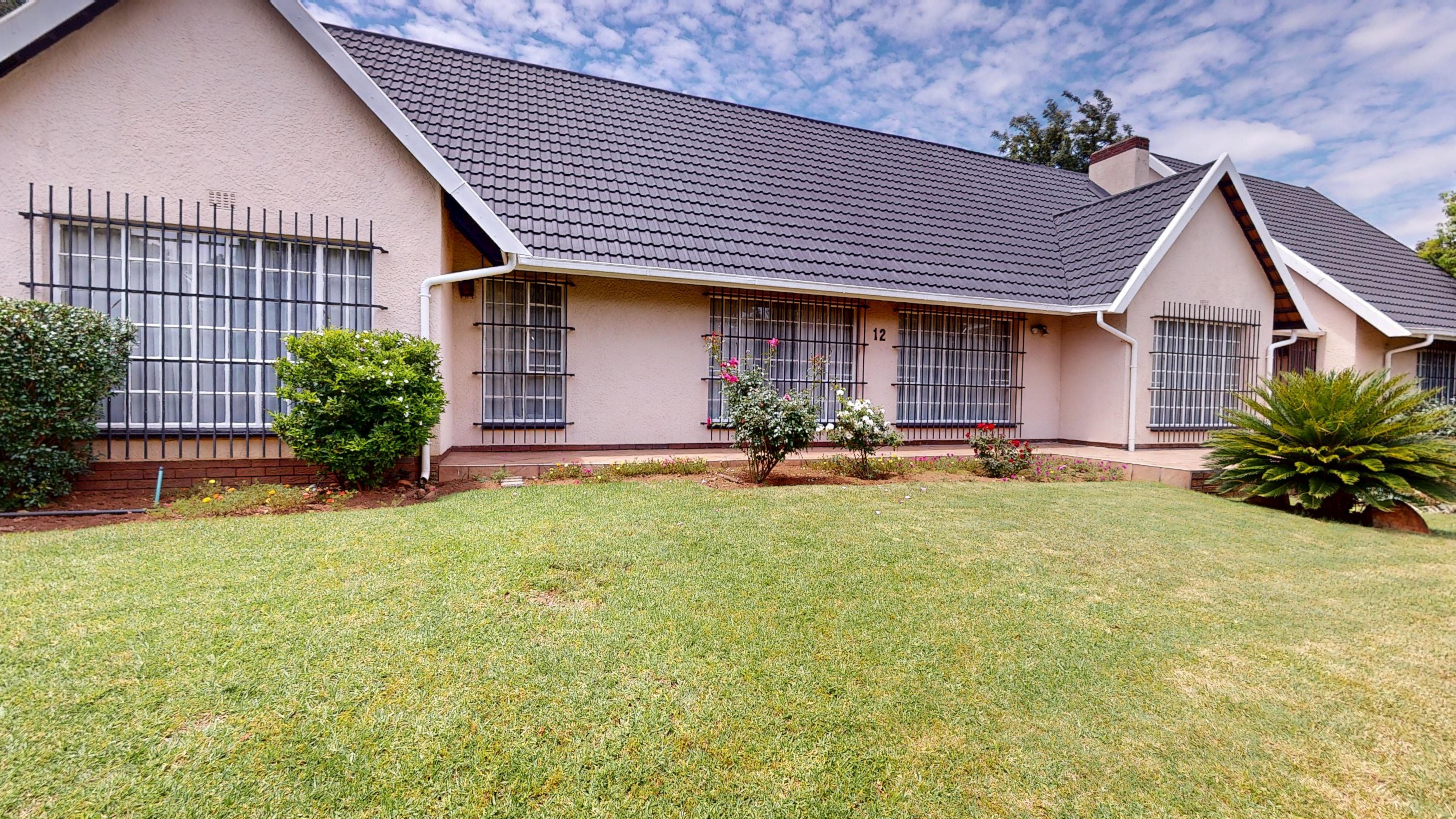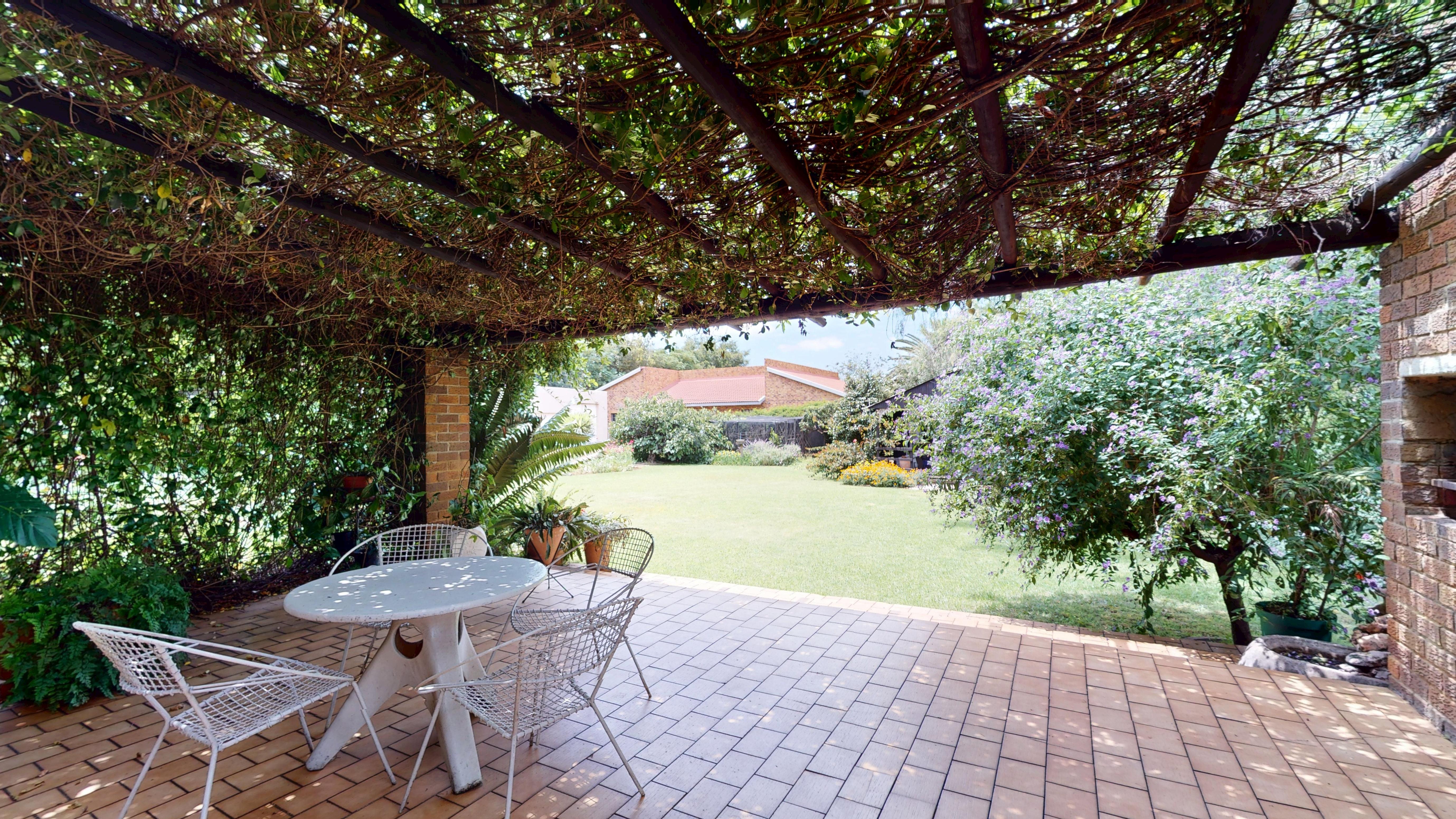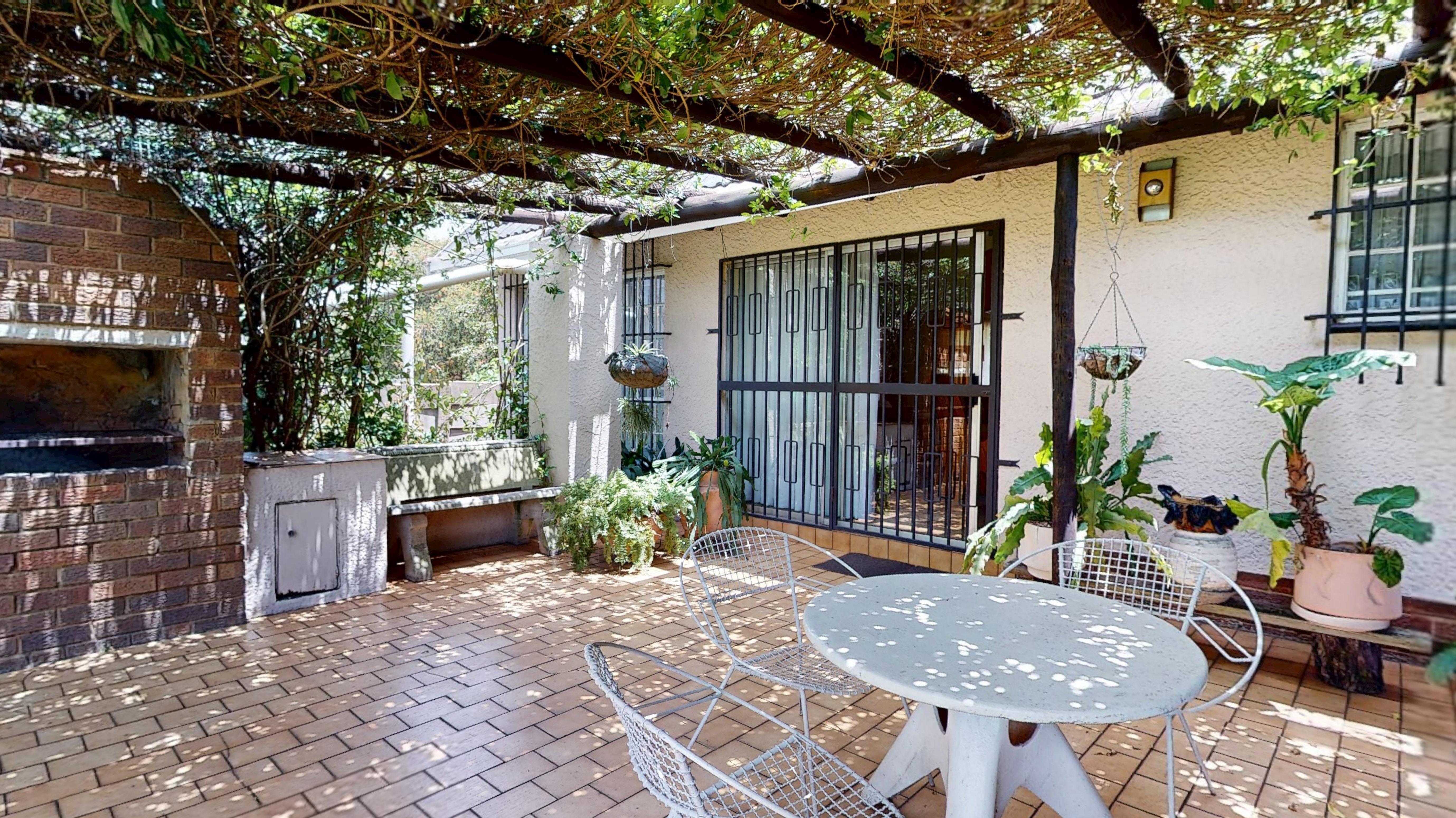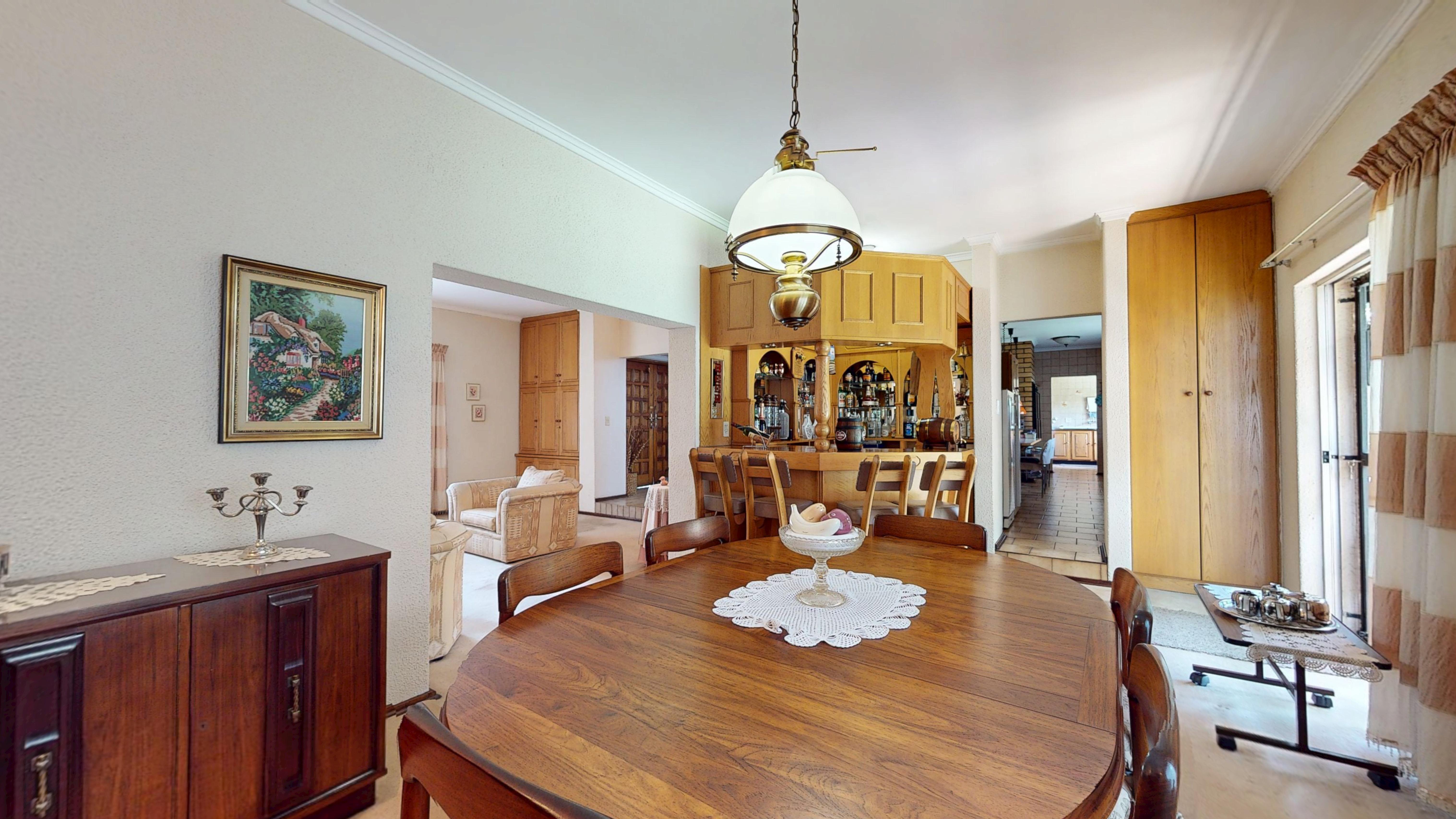 An expansive dining room flows seamlessly onto a patio with built-in braai, overlooking a beautifully manicured garden—an ideal setting for entertaining or relaxed family time throughout the year.