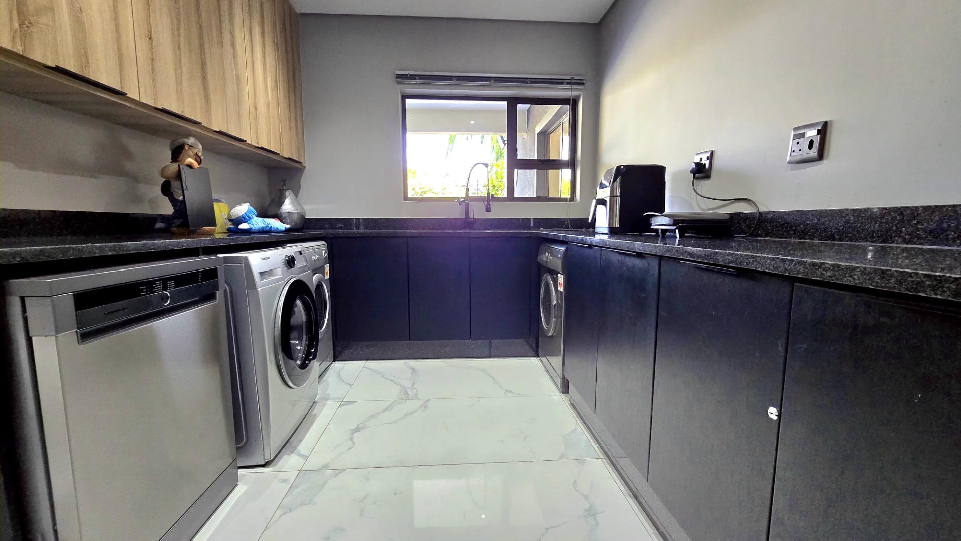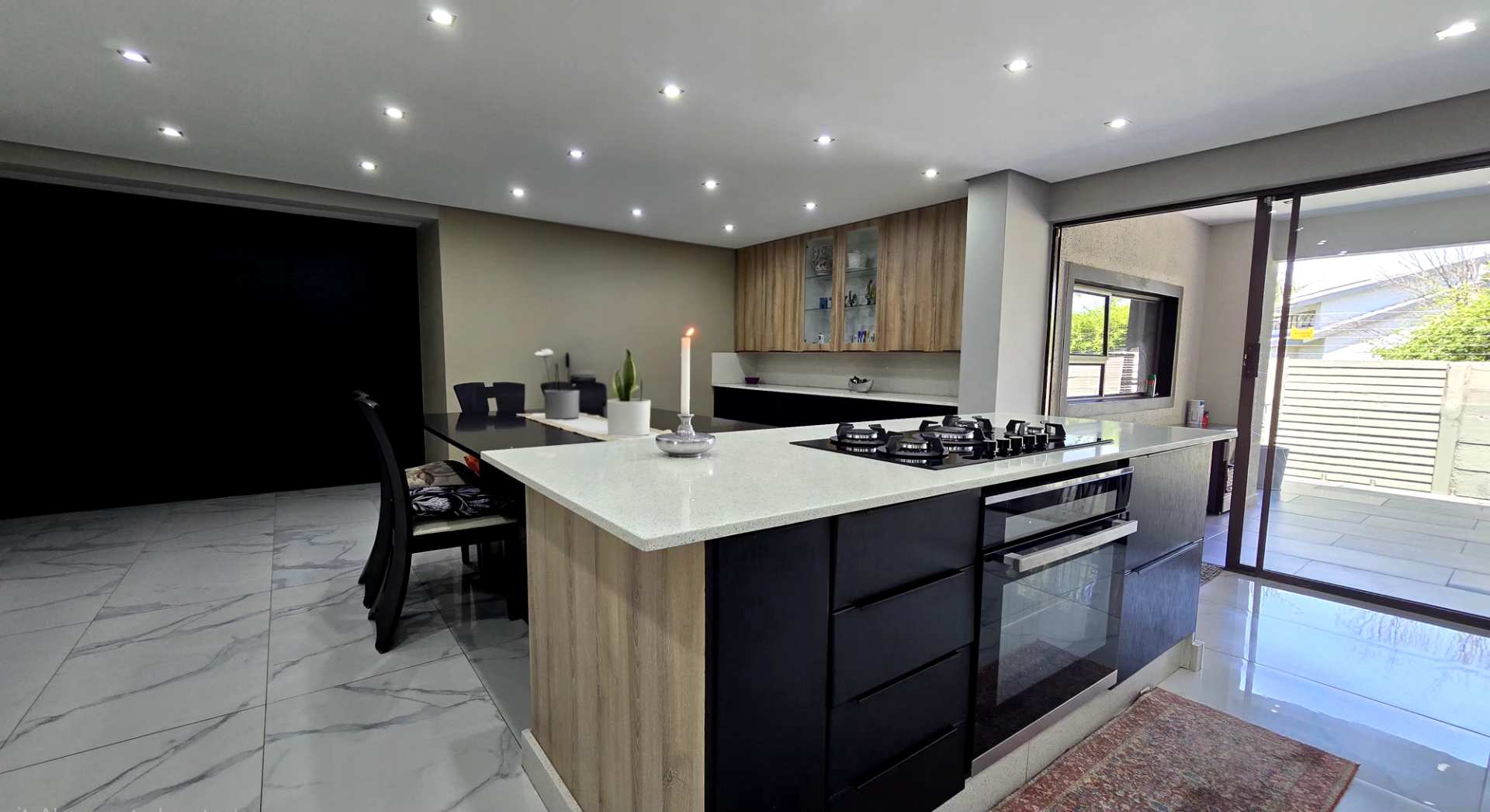 Upon entering, the ground floor welcomes you with a spacious lounge, complemented by a convenient guest toilet. Adjacent, you'll find a generous dining area and a cozy chill lounge, all leading to an undercover patio that opens into the lush garden. The heart of this home is the expansive kitchen, featuring abundant storage, a walk-in pantry, and a scullery designed for two washing machines, a tumble dryer, and a dishwasher—all adorned with granite countertops. The kitchen also boasts Caesarstone and granite surfaces, a gas stove, and a large breakfast nook. A charming coffee station with a prep basin makes this kitchen a chef’s dream. Directly accessible from the kitchen is a second undercover patio perfect for enjoying summer mornings.