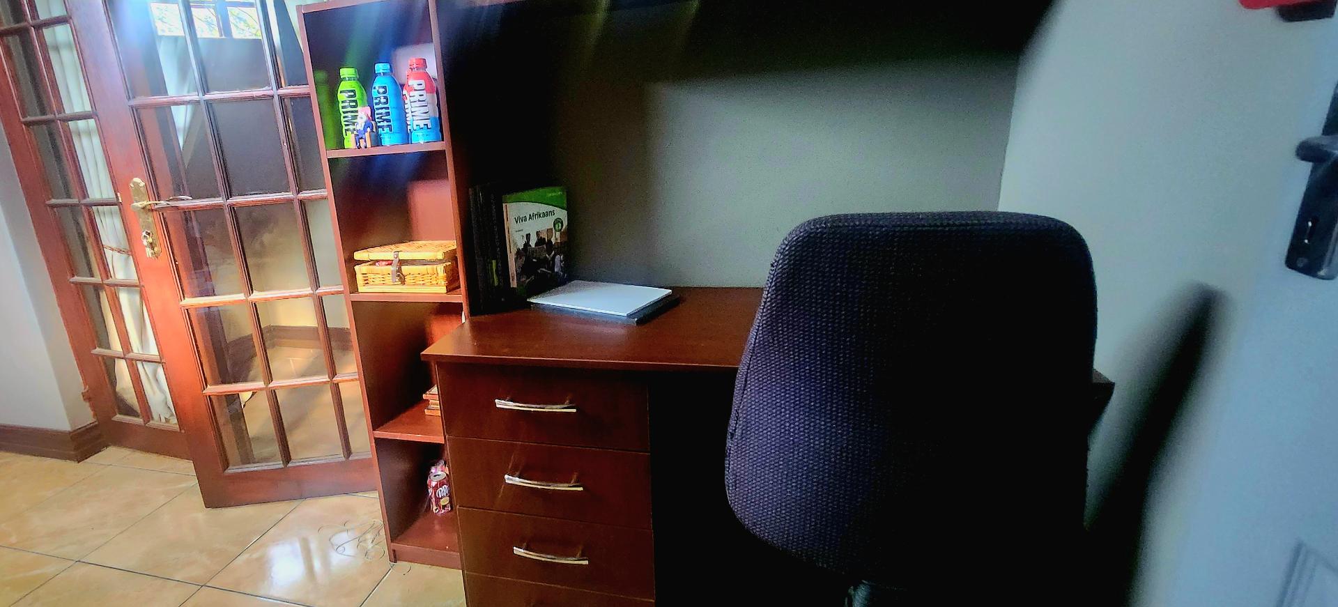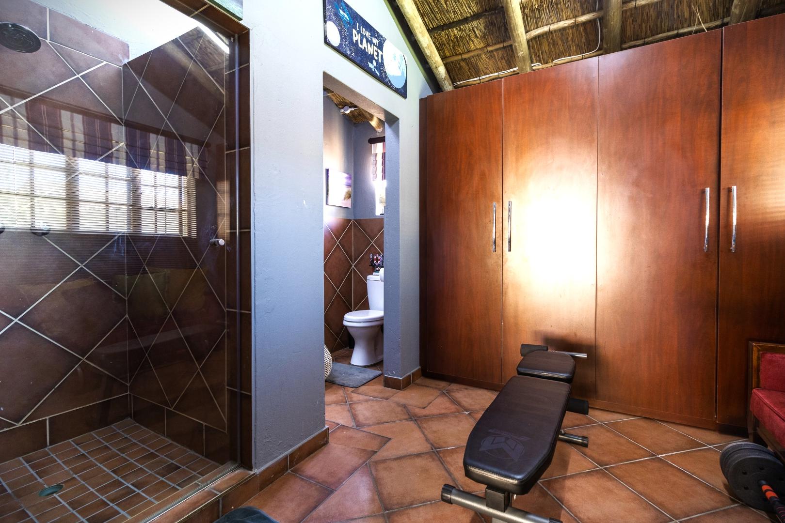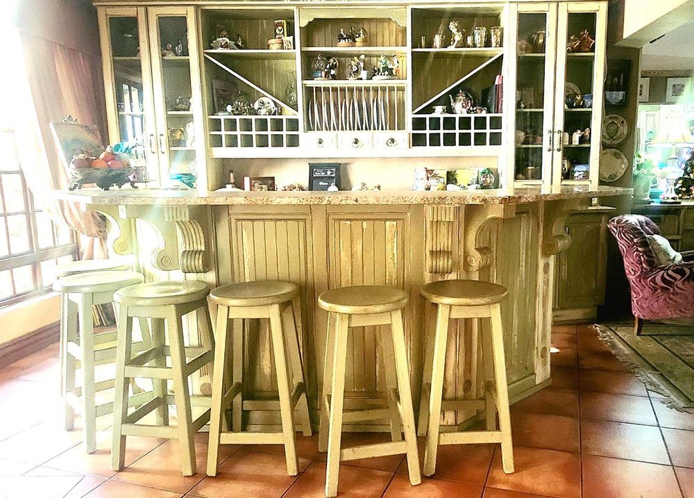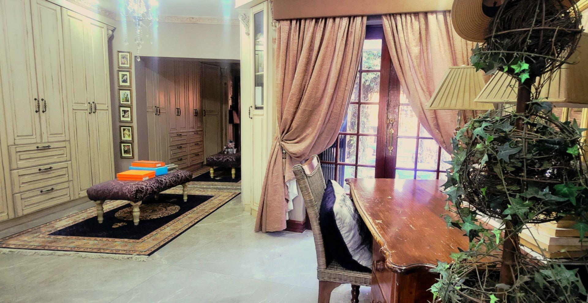 The country-style kitchen will delight keen cooks and entertainers alike, featuring granite countertops, Smeg appliances, a separate scullery, and extensive bespoke cabinetry—designed and stained in Kuruman and installed in Alberton. Display niches are perfect for showcasing your Carrol Boyes pieces or Royal Albert tea set, while abundant storage keeps everything beautifully organized.