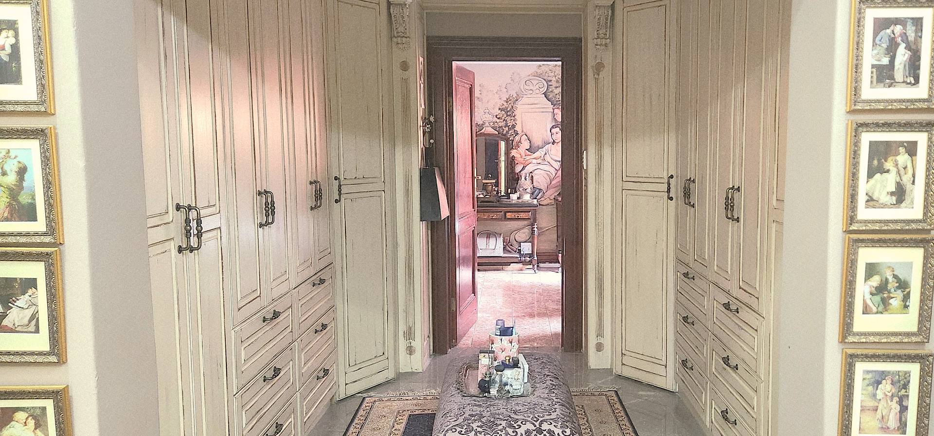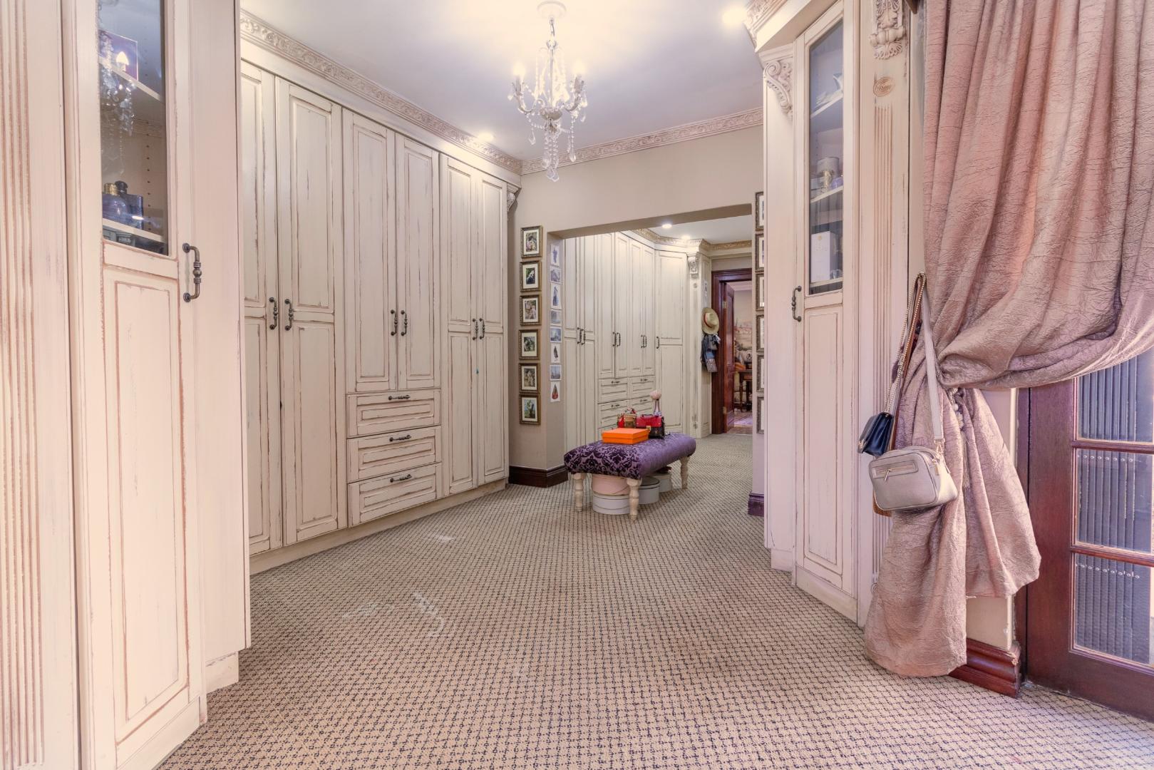 The main suite is a sanctuary with sliding doors to the pool terrace and ample room for a king-size bed, lounge area, and study desk. It adjoins a versatile private room with a gas fireplace and direct access to the large, covered patio with a built-in braai—perfect as a library, study, private dining room, or a nursery. The walk-in cupboards are truly fit for a queen, and the en-suite bathroom blends history and elegance with a bath sourced from the original Gold Reef City Hotel, plus a shower and separate toilet for privacy.
