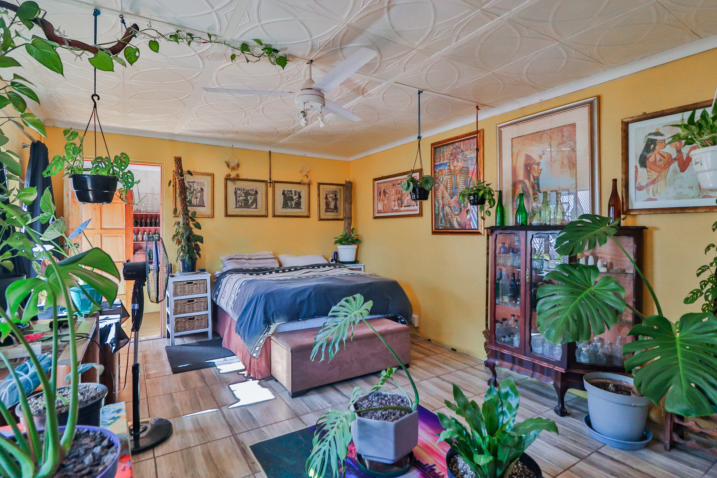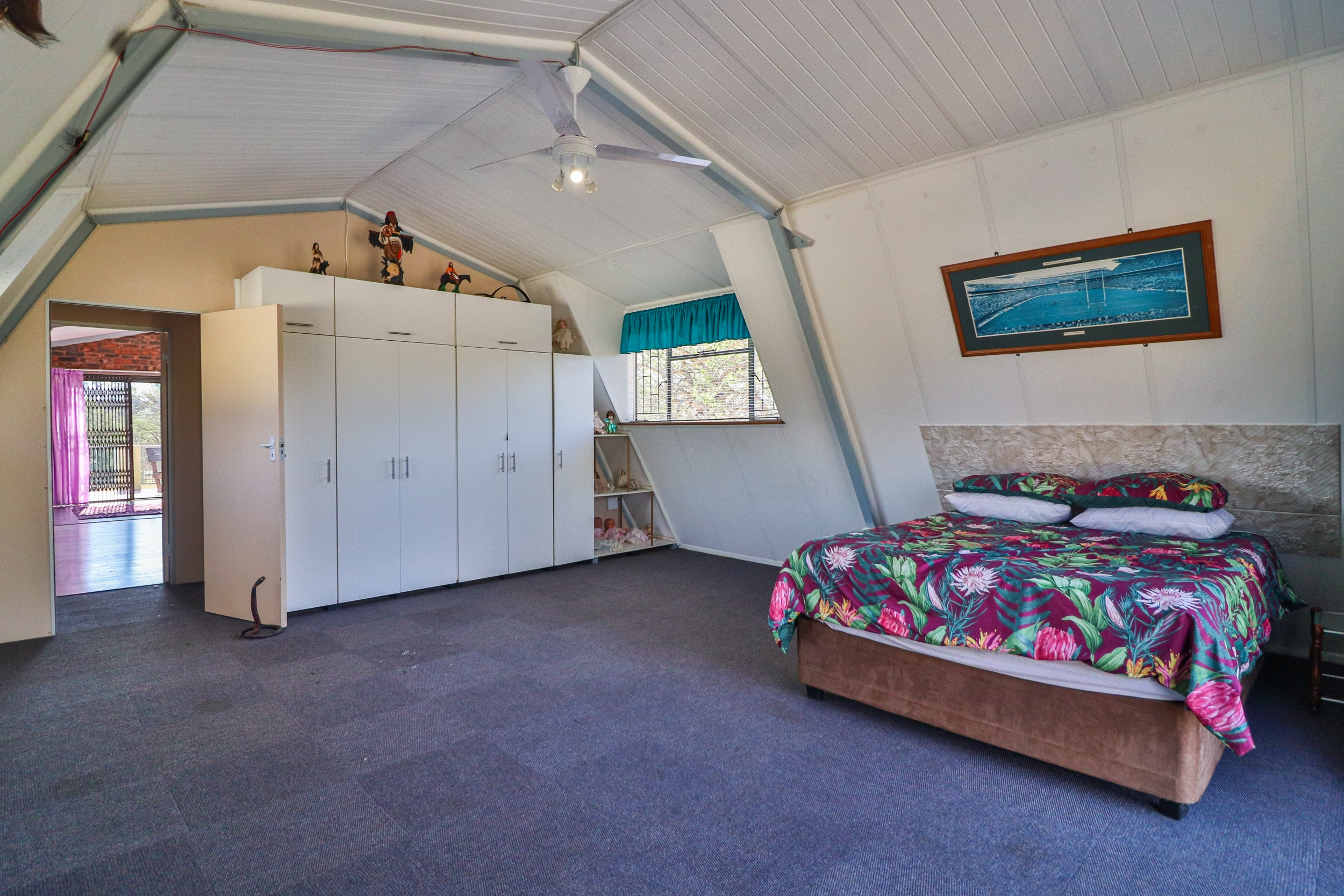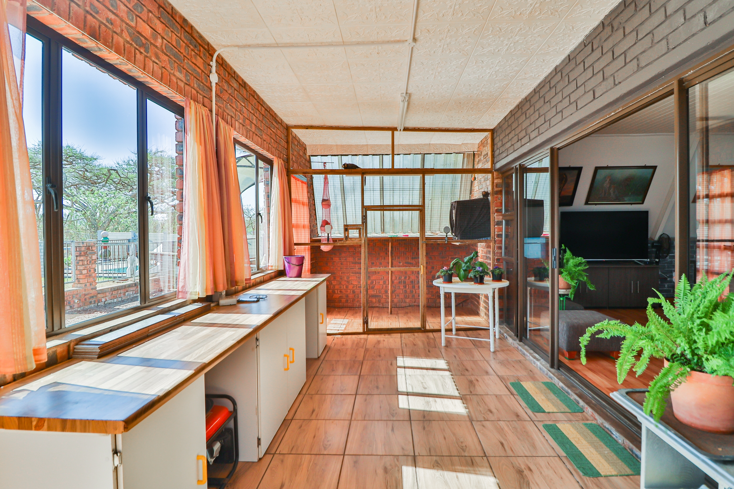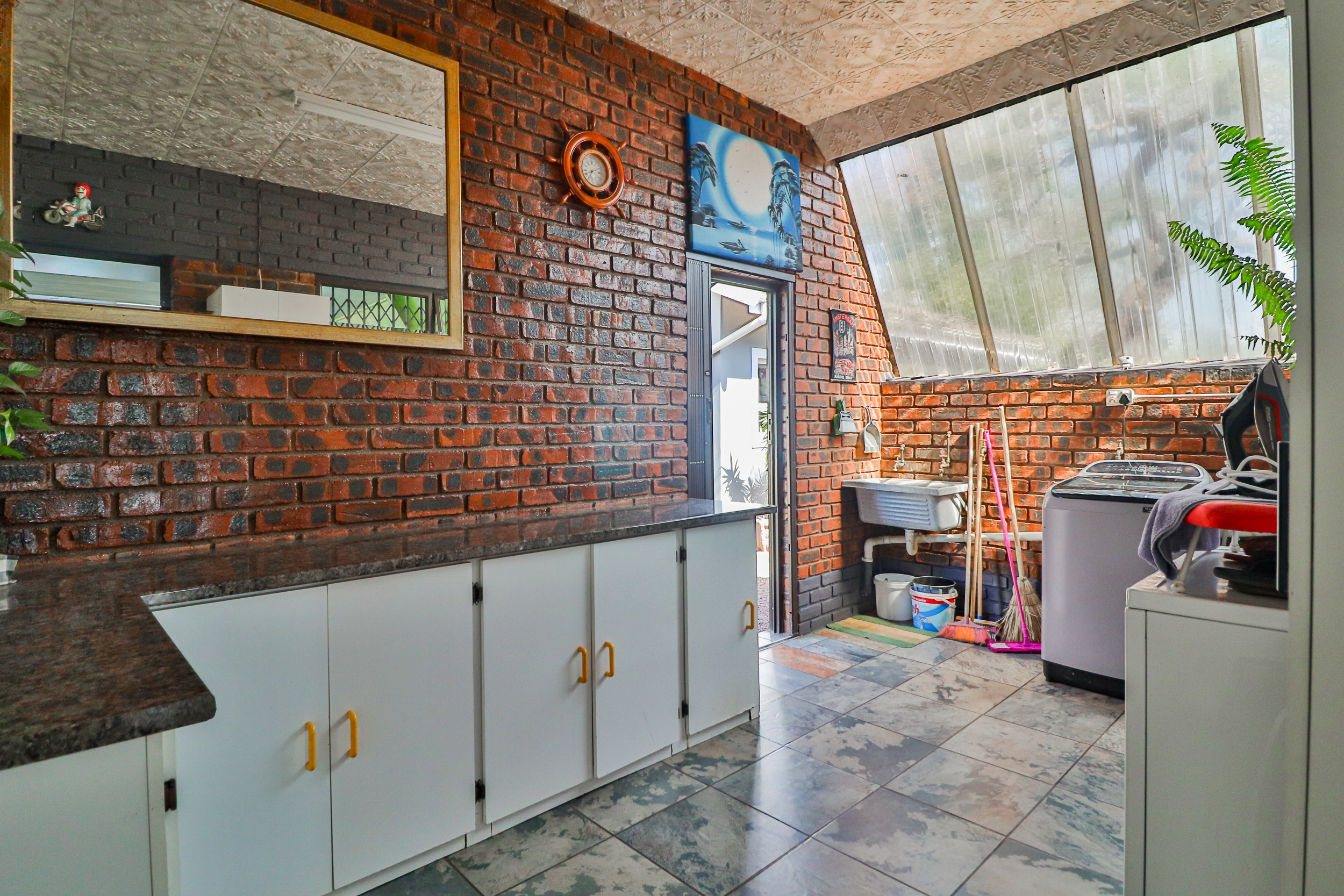 In addition, there is a 100 sqm separate building with a spacious sewing room, a bedroom, a bathroom, and numerous built-in cupboards and air conditioning. This area is fully carpeted and could be converted into additional bedrooms.