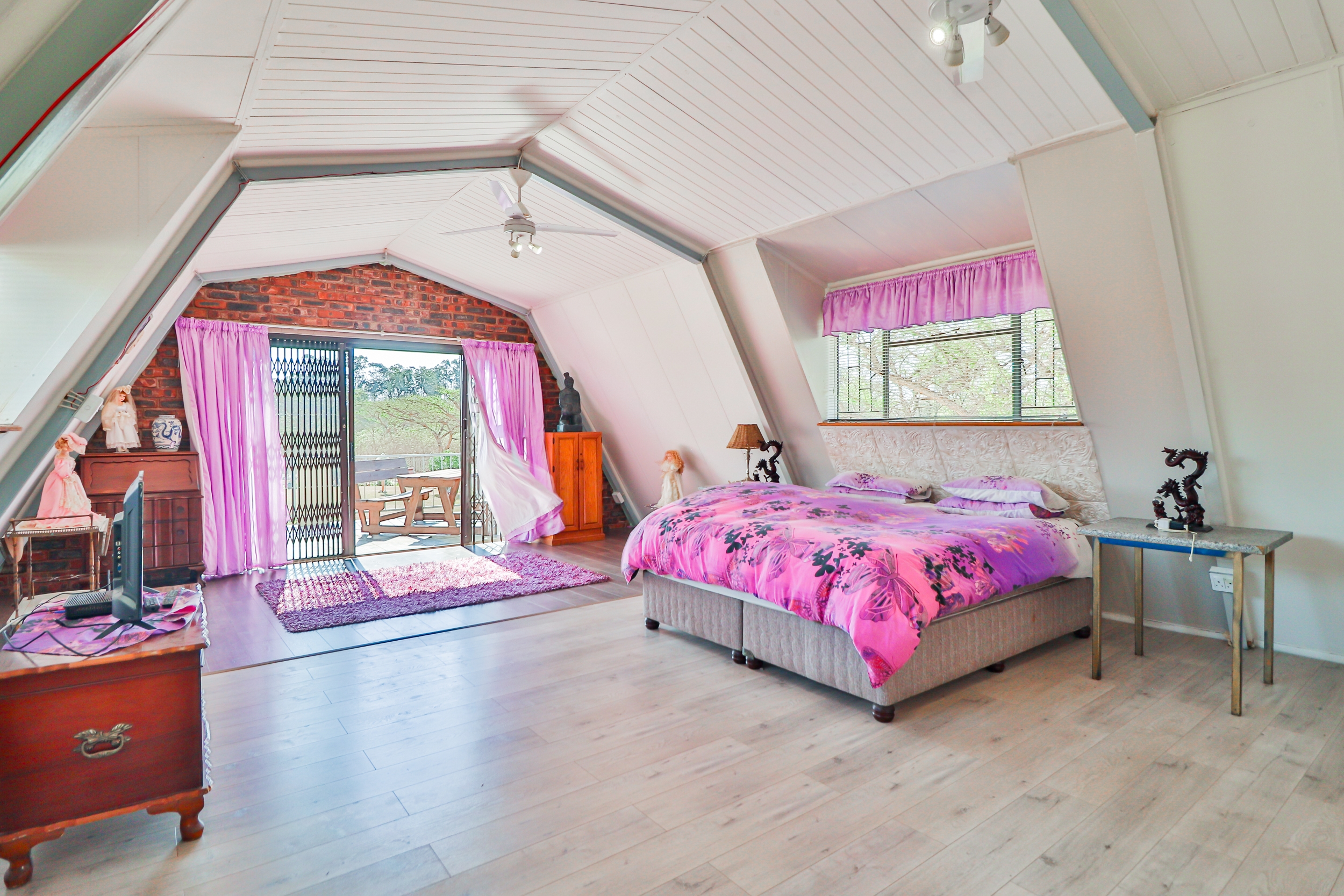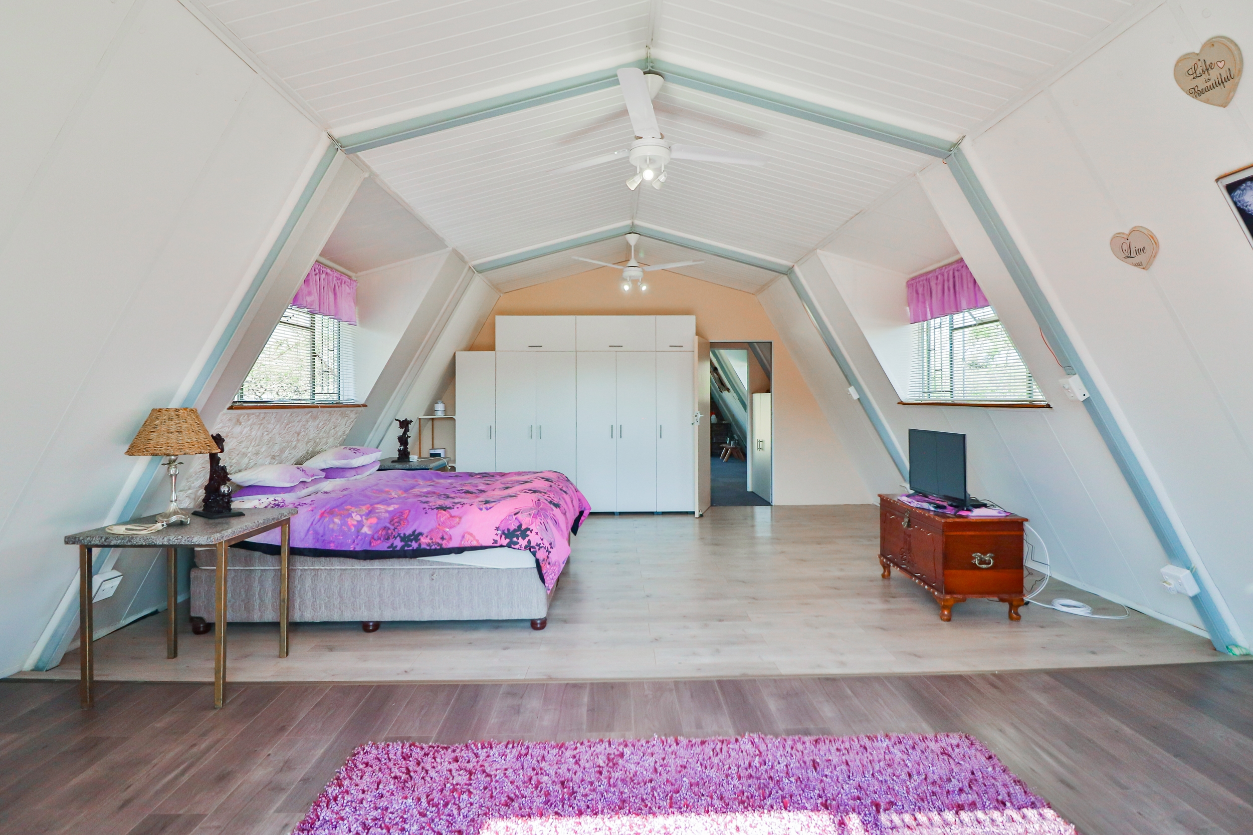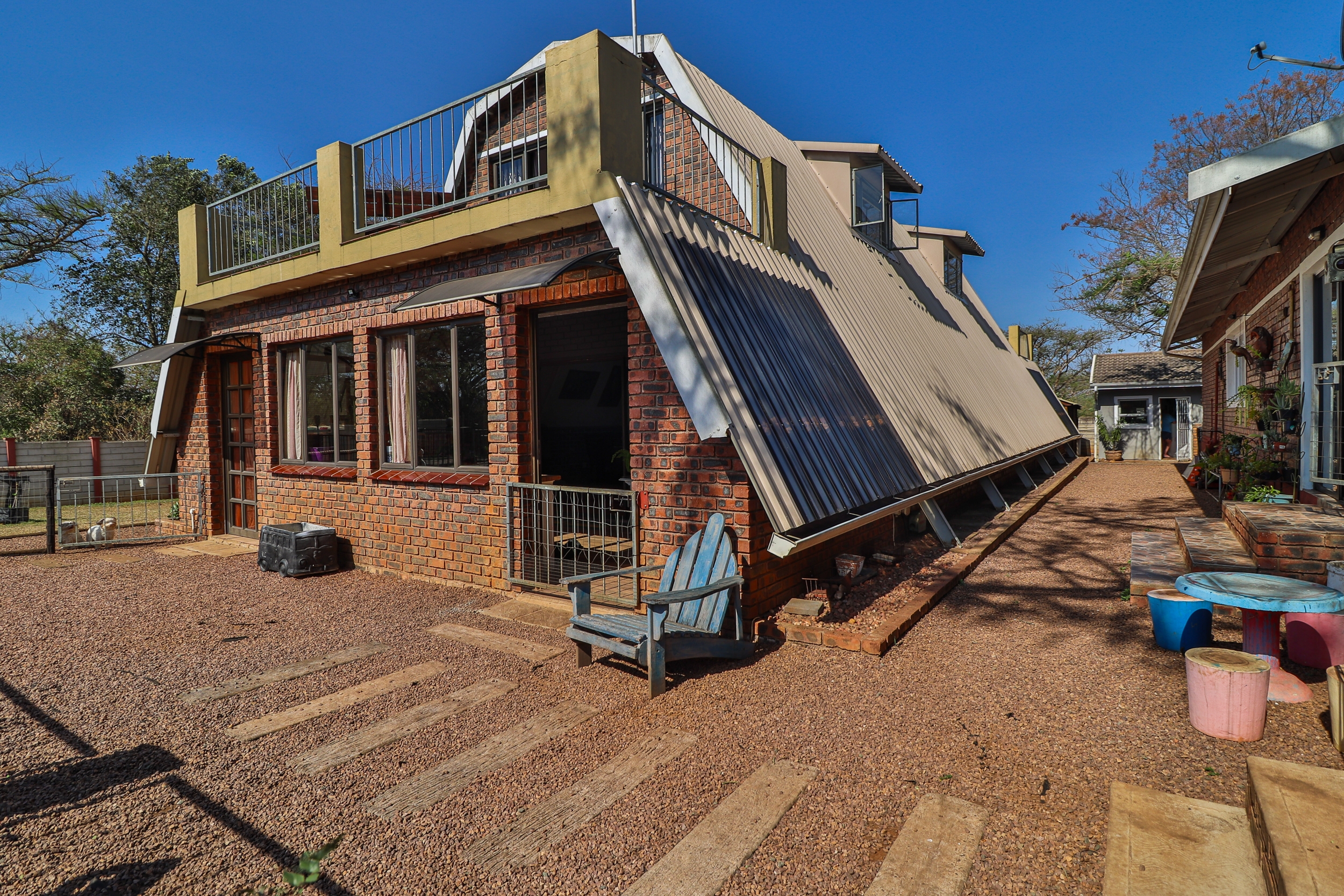 This charming A-Frame house, spanning 250 sqm, features two expansive bedrooms with balconies upstairs. The ground floor offers a generous open-plan layout, including a modern, fully-equipped kitchen, a sunroom, a laundry room, and a neat full bathroom. The home is designed with ample built-in cupboards, vinyl and tile flooring, granite countertops, two ovens, two hobs, and an 8-seater granite island.