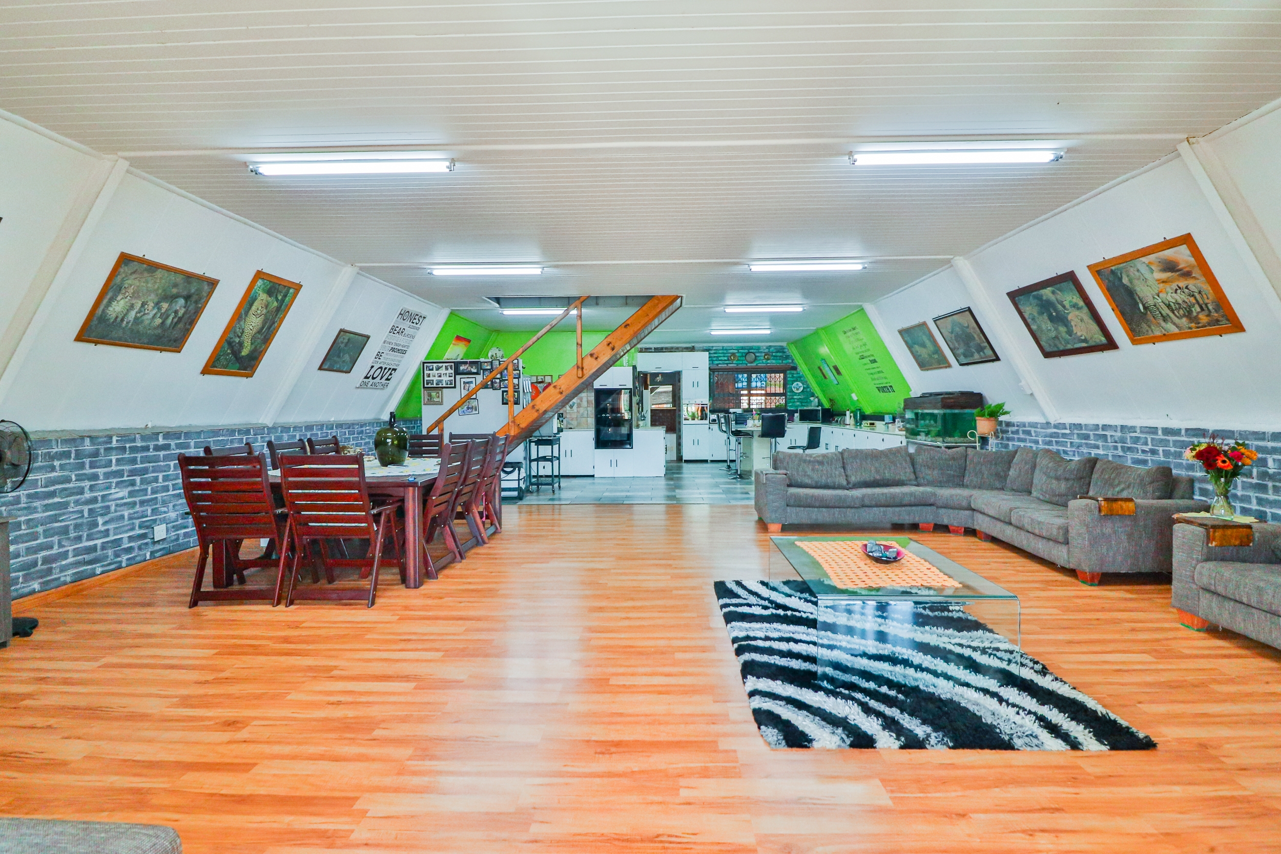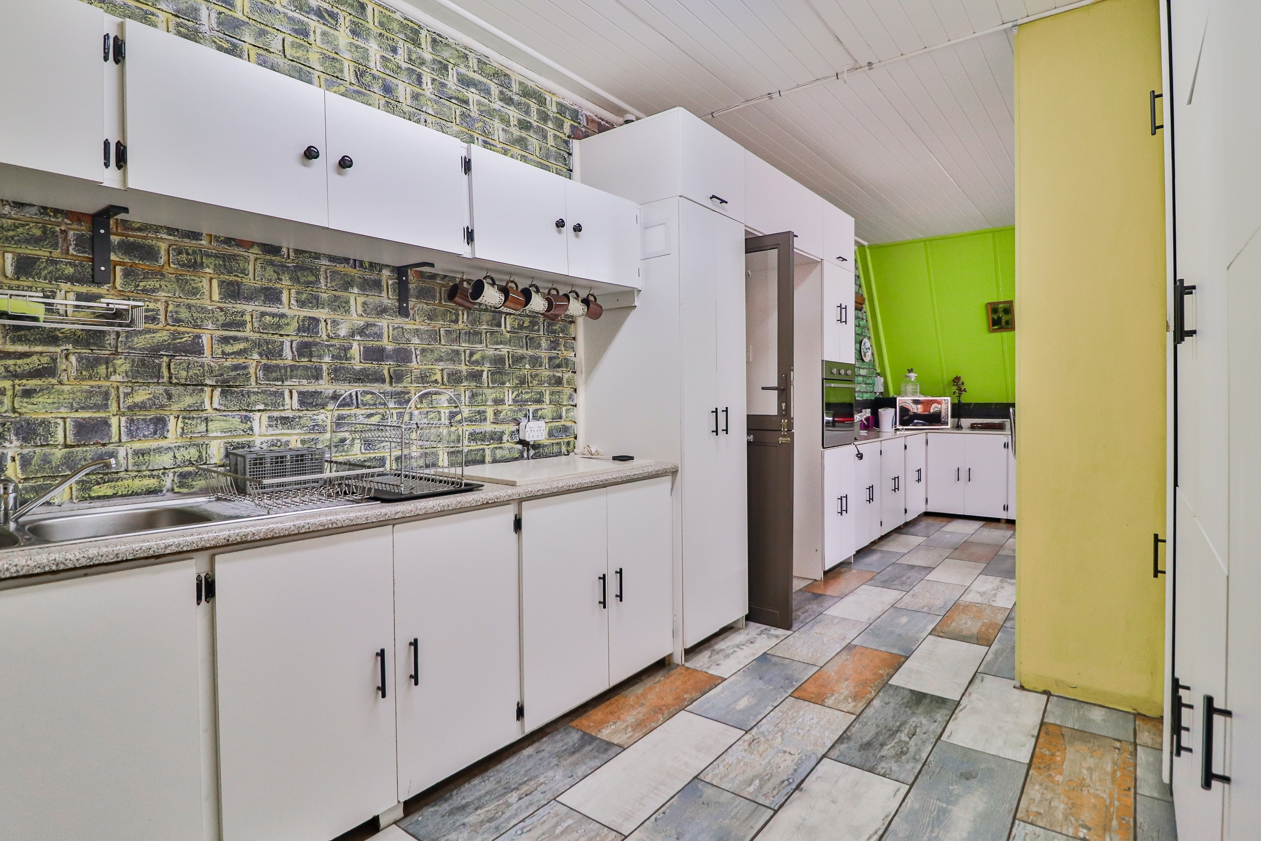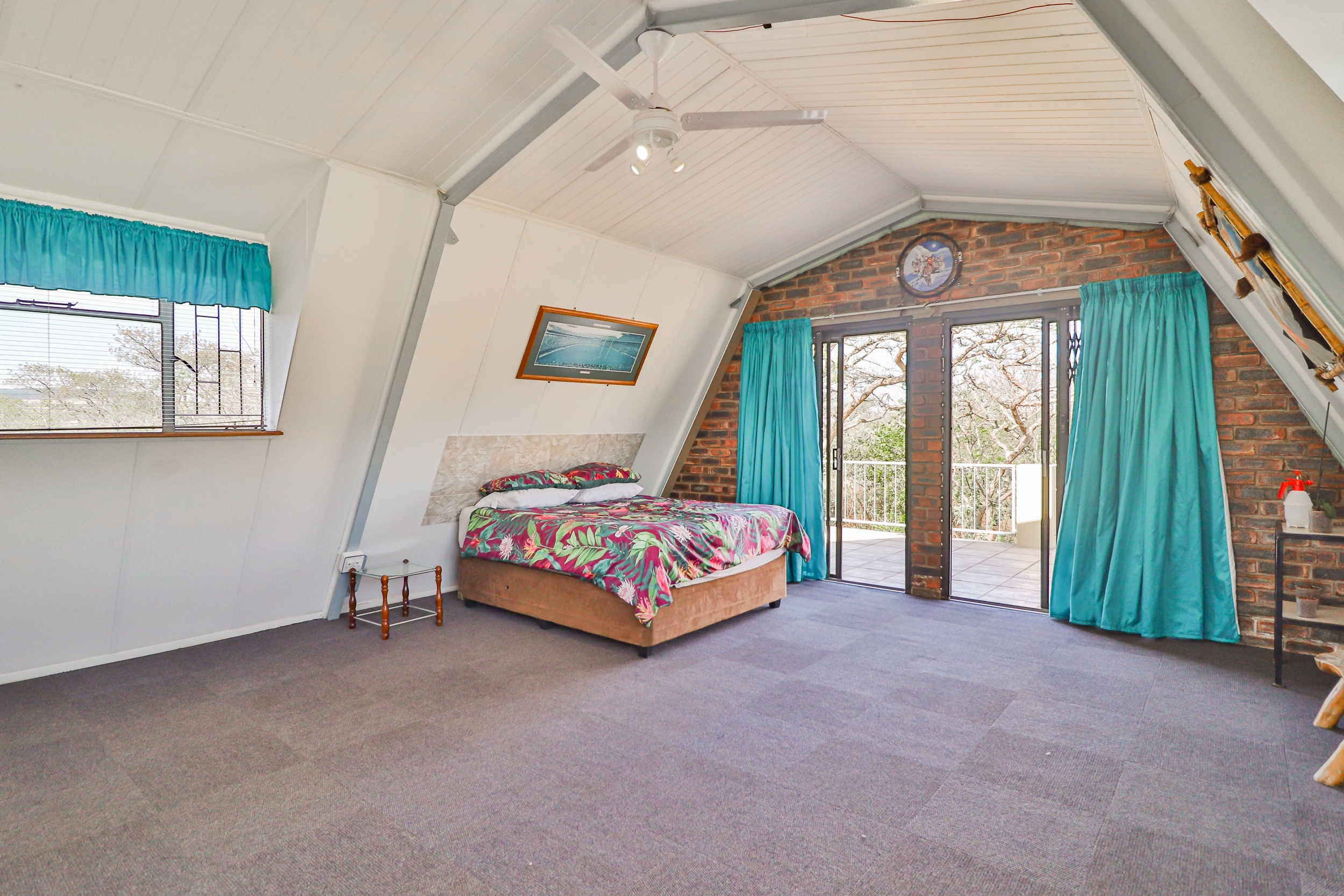 This charming A-Frame house, spanning 250 sqm, features two expansive bedrooms with balconies upstairs. The ground floor offers a generous open-plan layout, including a modern, fully-equipped kitchen, a sunroom, a laundry room, and a neat full bathroom. The home is designed with ample built-in cupboards, vinyl and tile flooring, granite countertops, two ovens, two hobs, and an 8-seater granite island.