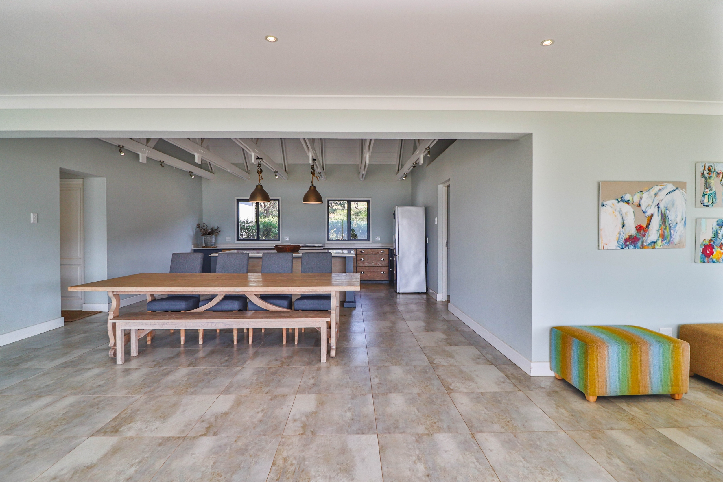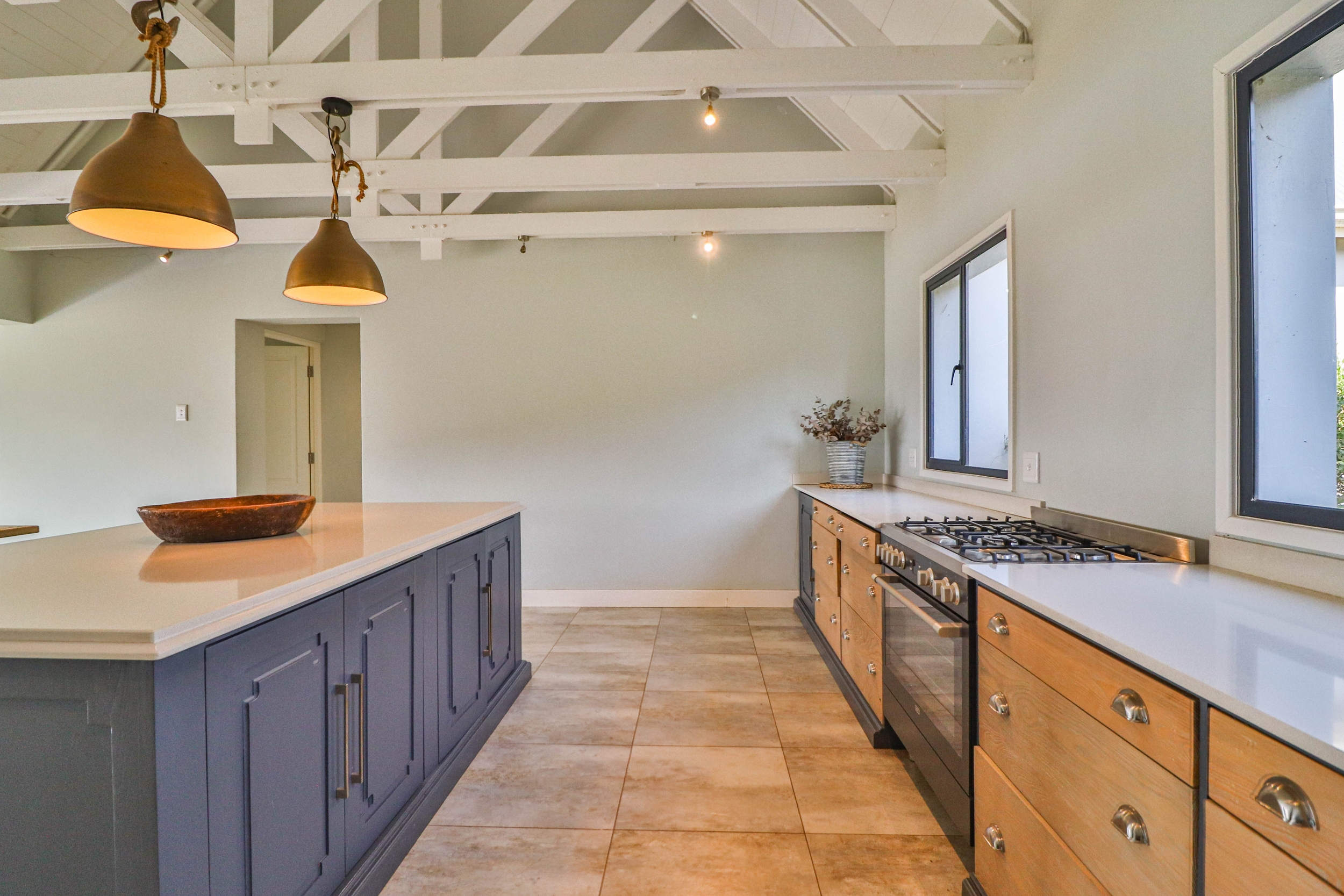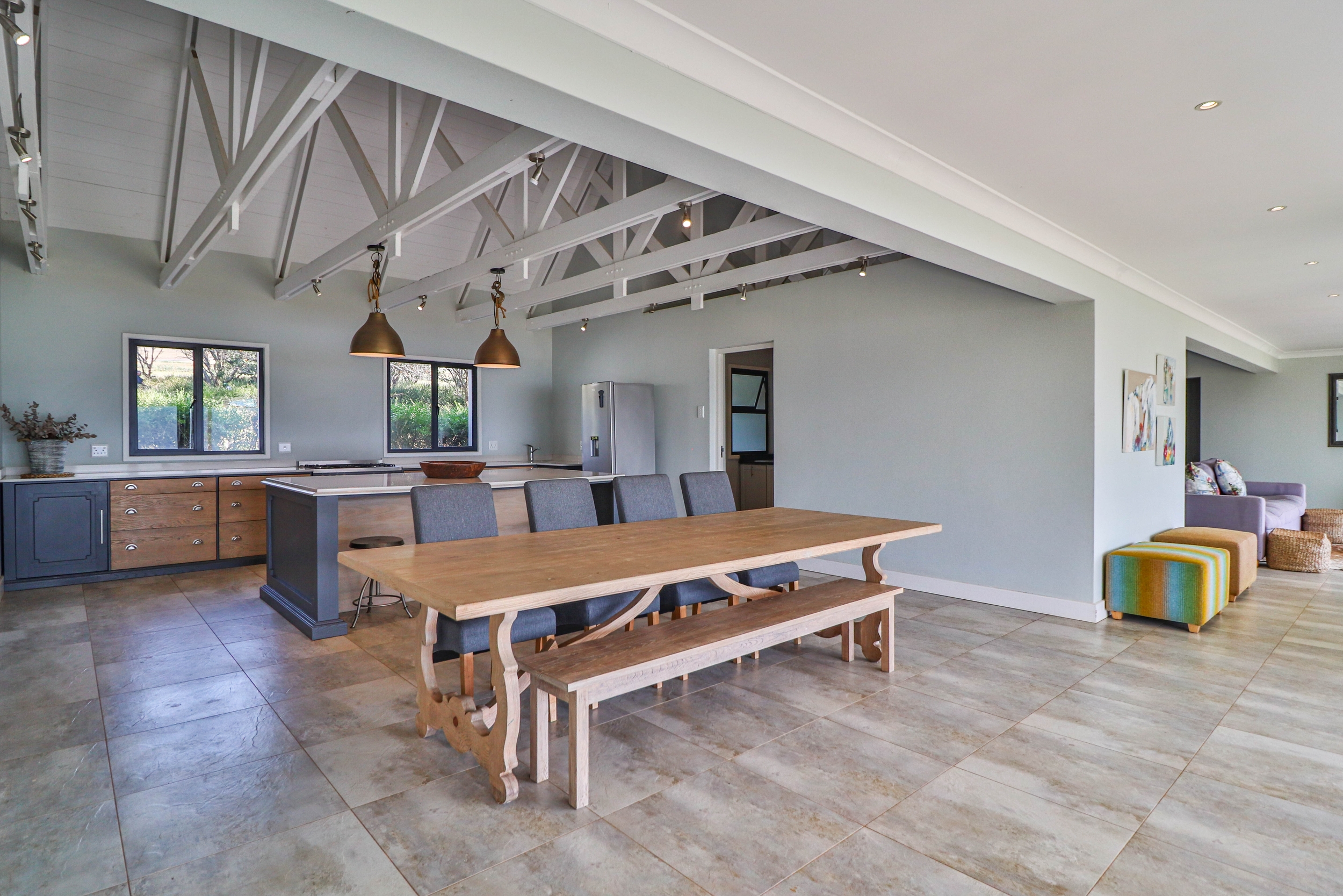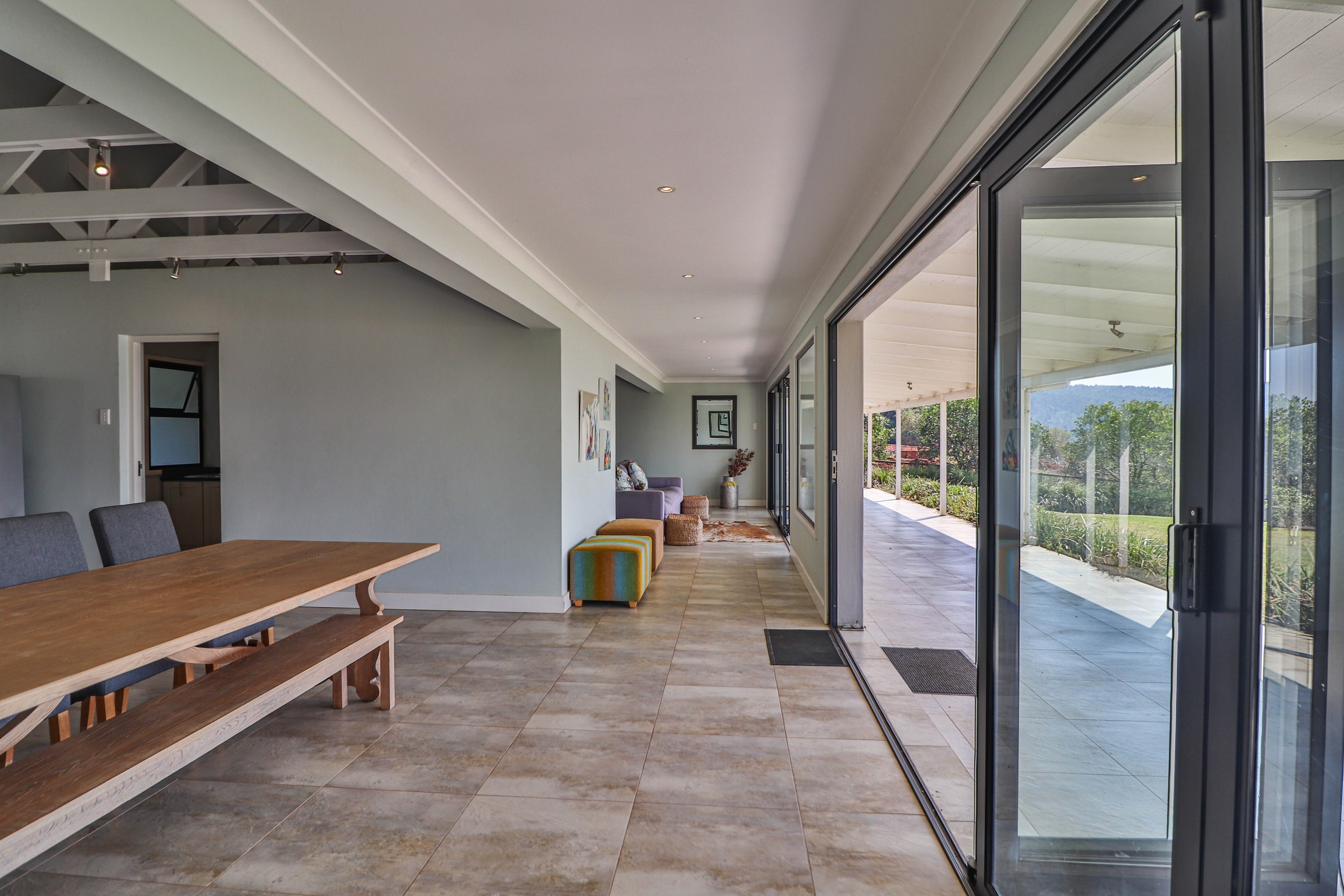 The open-plan kitchen, dining, and living areas seamlessly flow onto a covered verandah, ideal for entertaining guests or enjoying quiet moments outdoors.